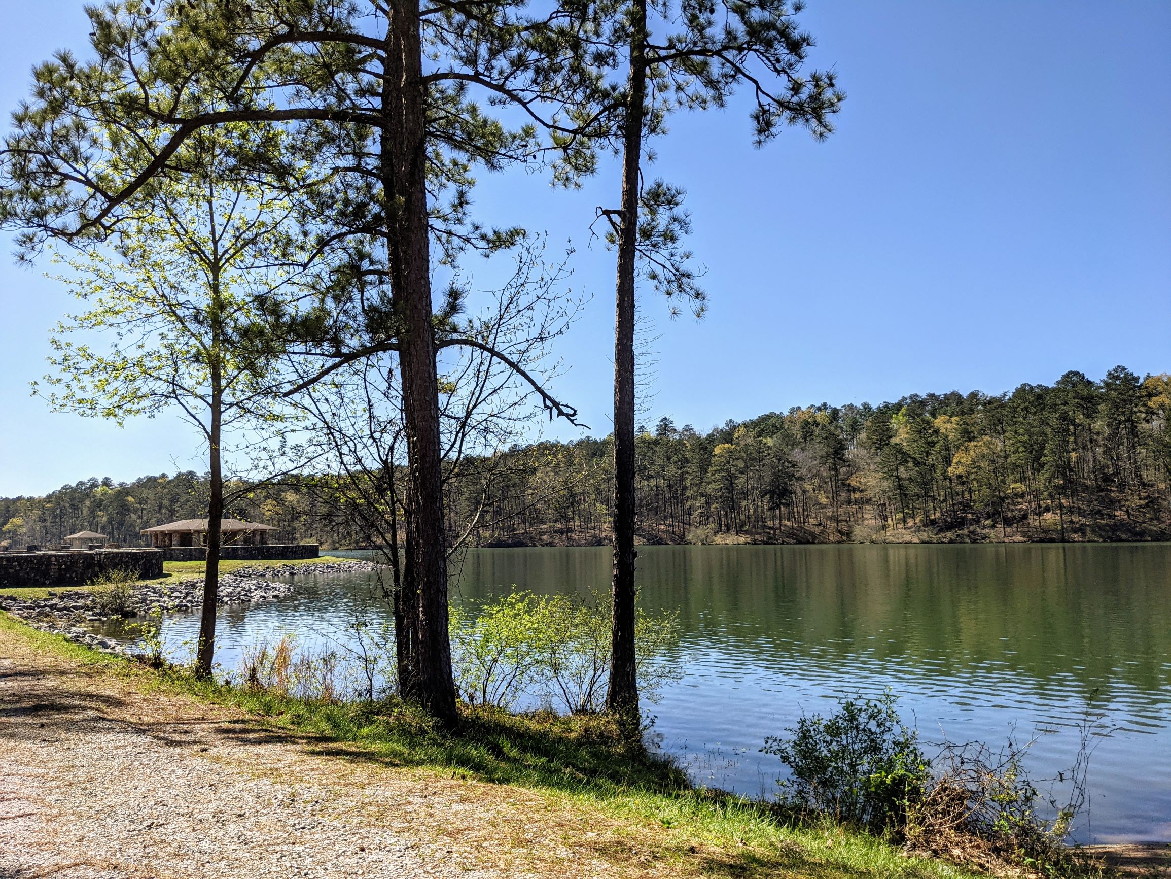 These are the foothills of the Appalachian Mountains, not as lush as you see further east but you still get the dogwoods and rhododendron so Spring is definitely an ideal time to go. Oak Mountain is only 20 miles south of Birmingham and besides the 50 miles of trails, this park includes a golf course, archery range, BMX course, horseback riding, boat rentals and more. The trails are a mixture of easy and flat or steep and rocky, so there’s something for everyone. We hiked two portions of the park: Kings Chair Loop (North Trailhead, south on Blue trail, return north on Red trail via Red-Blue connector south) and Peavine Loop (Peavine Falls Trailhead, White and Blue trails via White-Blue connector). The north route was a good workout, with lots of roots and rocks and elevation changes. There’s an overlook area just before Kings Chair that had good rocks for sitting and shade — ideal picnic spot. The Peavine route was fairly easy except for the spur trails. We tried the Falls Overlook trail but turned around once we glimpsed how steep it was — would NOT attempt it unless you have very strong knees and hiking poles.