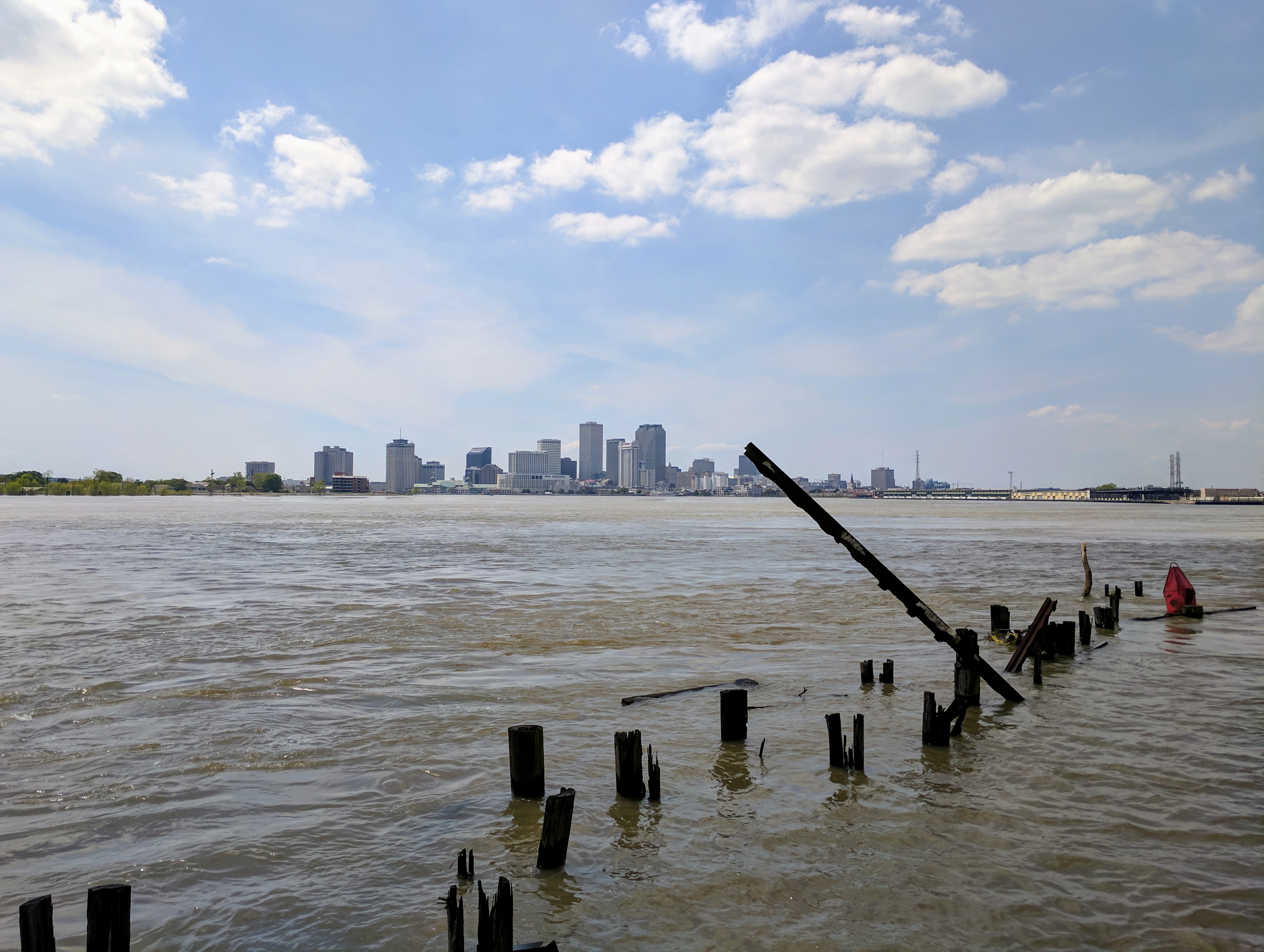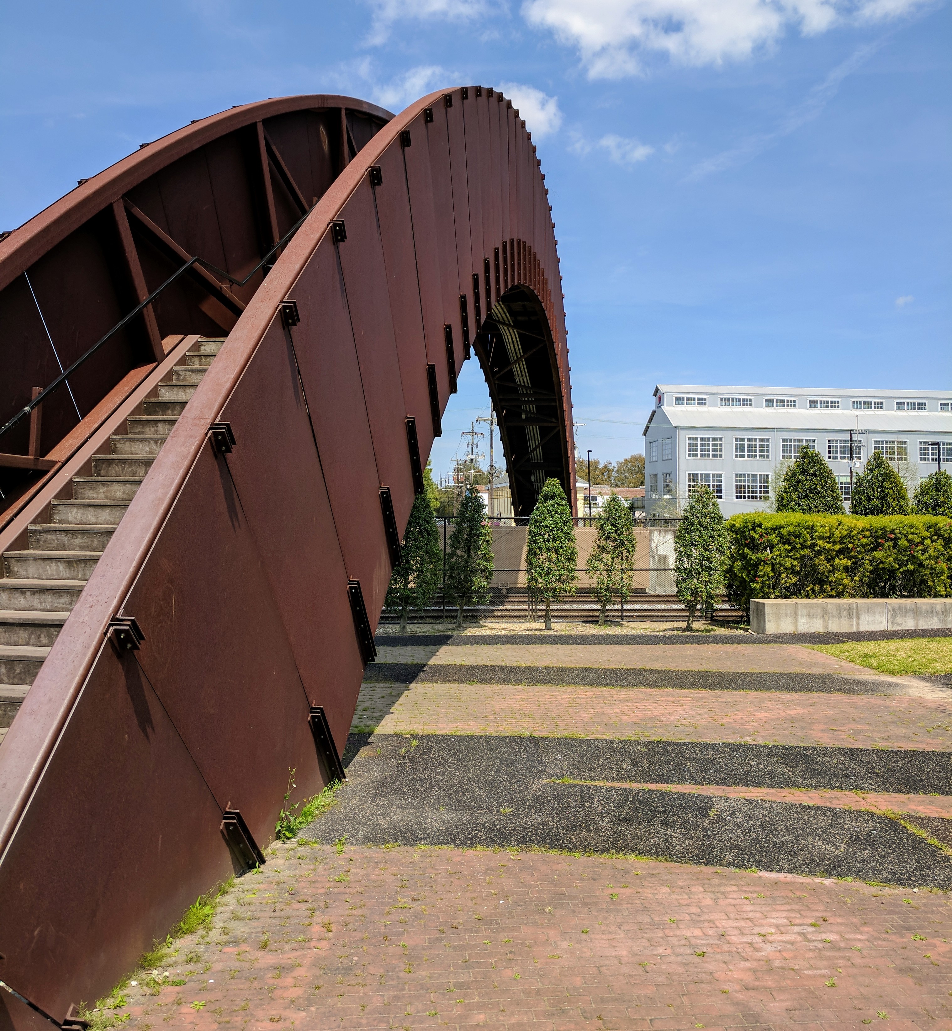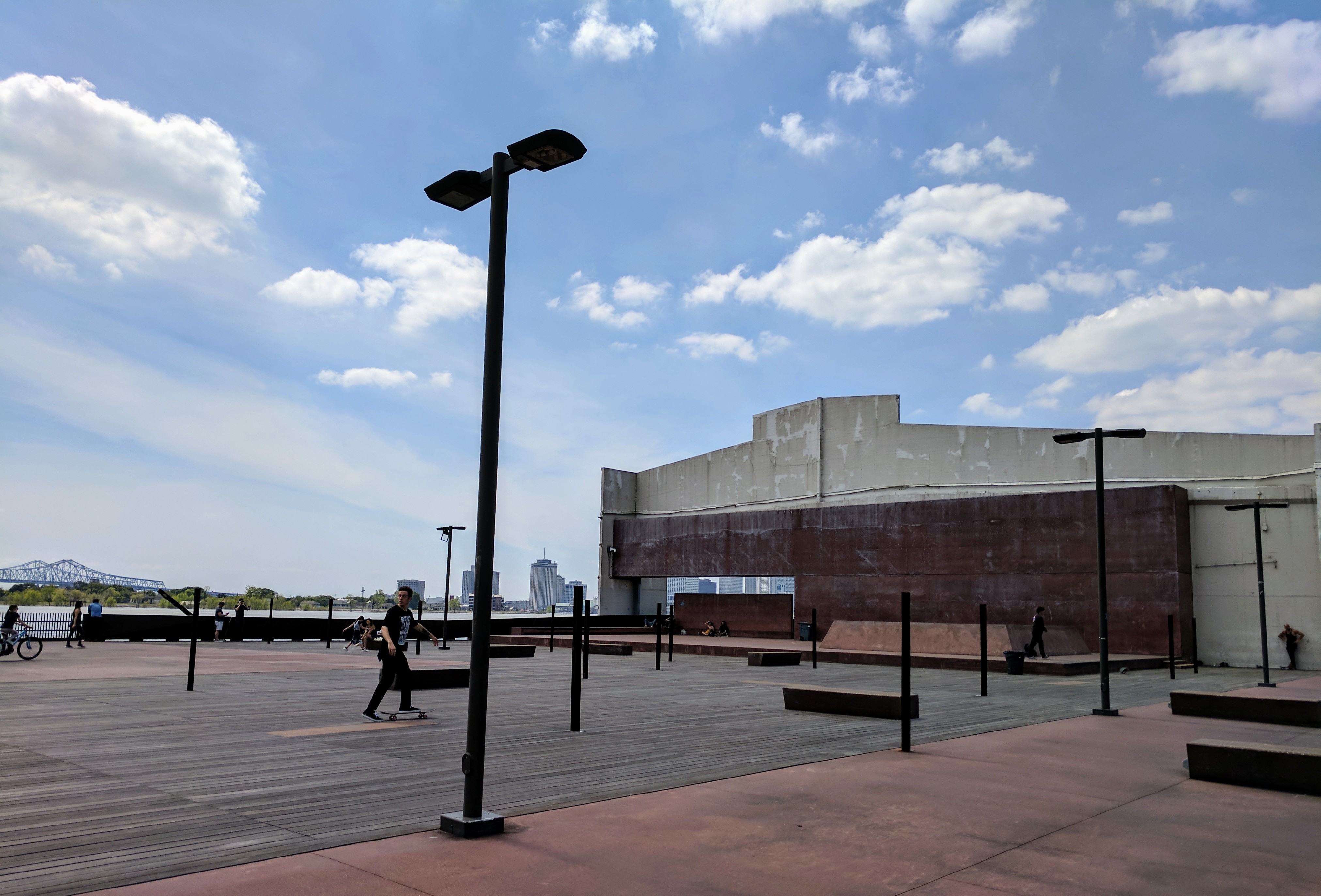 On a recent trip with my husband and sister, we discovered this hidden gem.Ā Located in the Marigny and Bywater neighborhoods east of the French Quarter, this 20-acre park follows along the Mississippi River and offers amazing views of the city skyline.Ā Crescent Park is only a few years old but it pays homage to its historical ground.Ā Imagine a narrow strip of land, sandwiched between railroads and a river lined with abandoned wharves.Ā Add native plants, industrial architecture, and young families on bikes and skateboards and you have an excellent picture of this park.