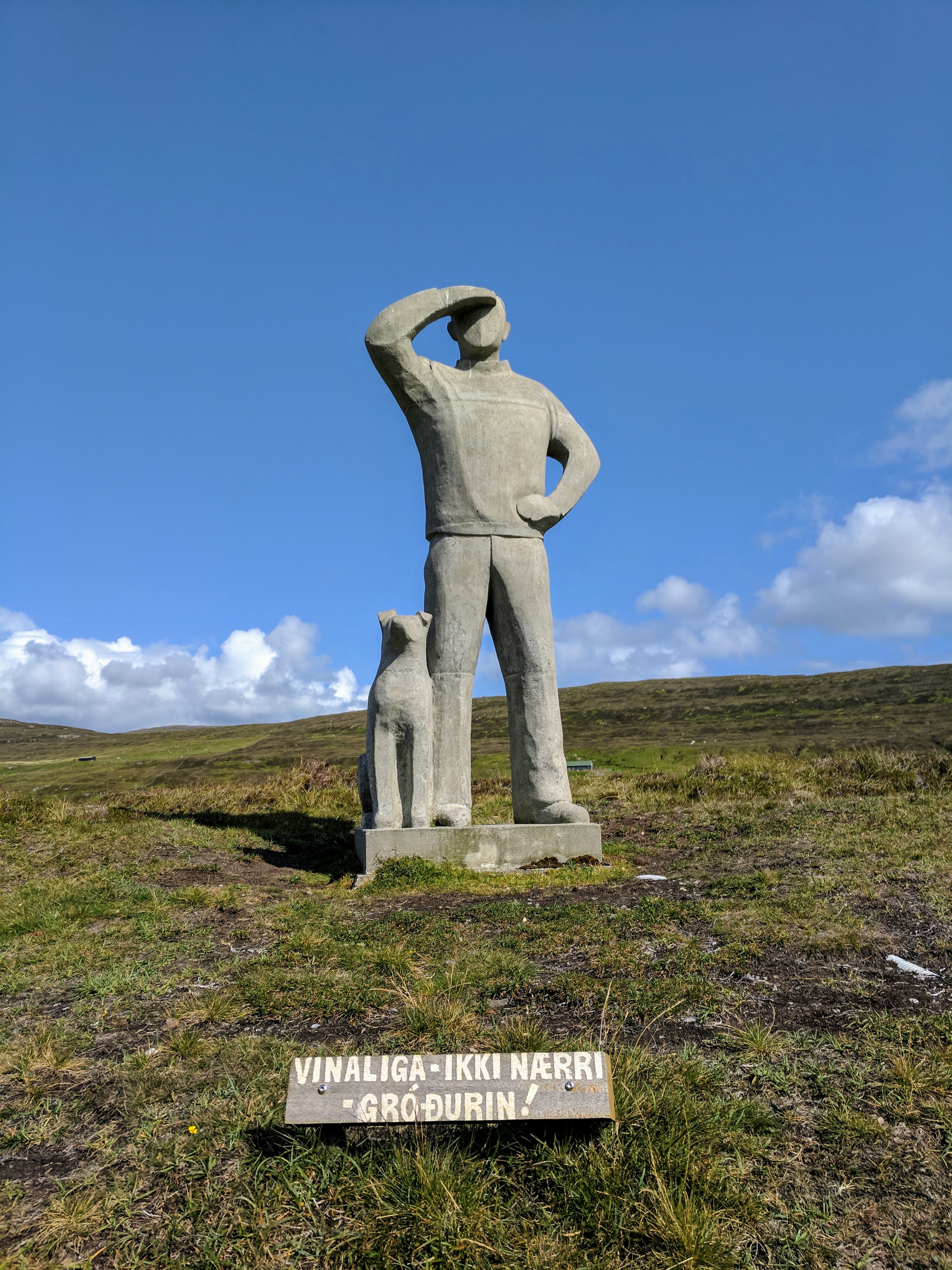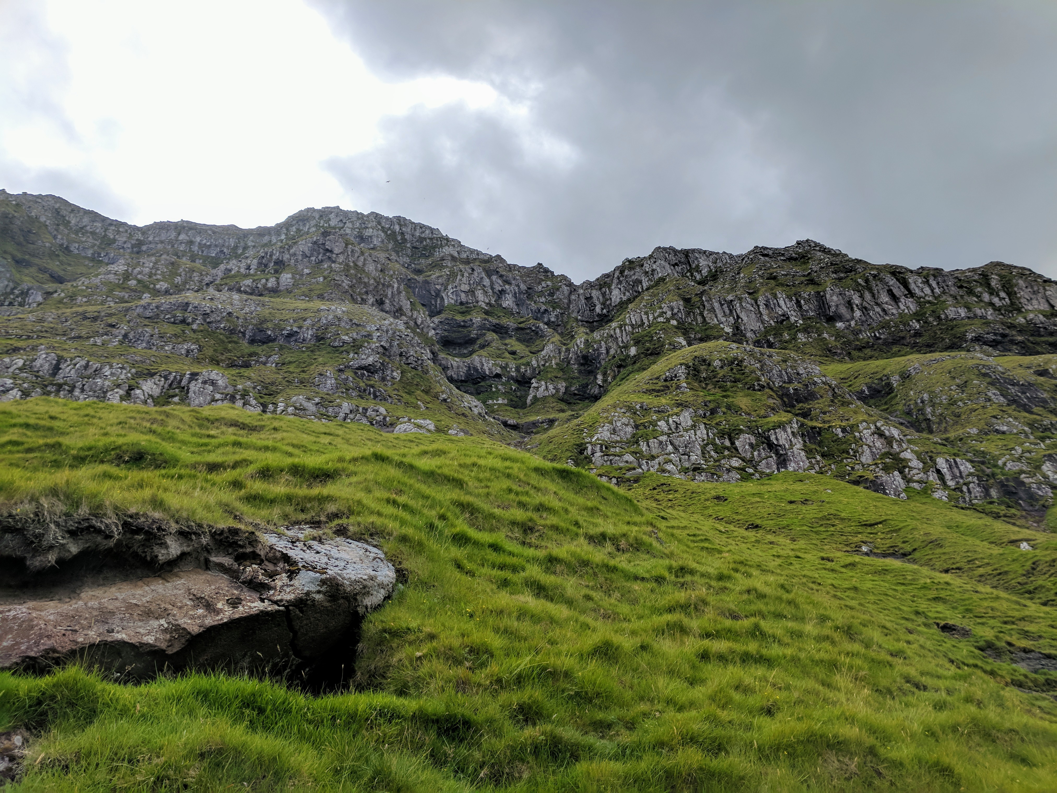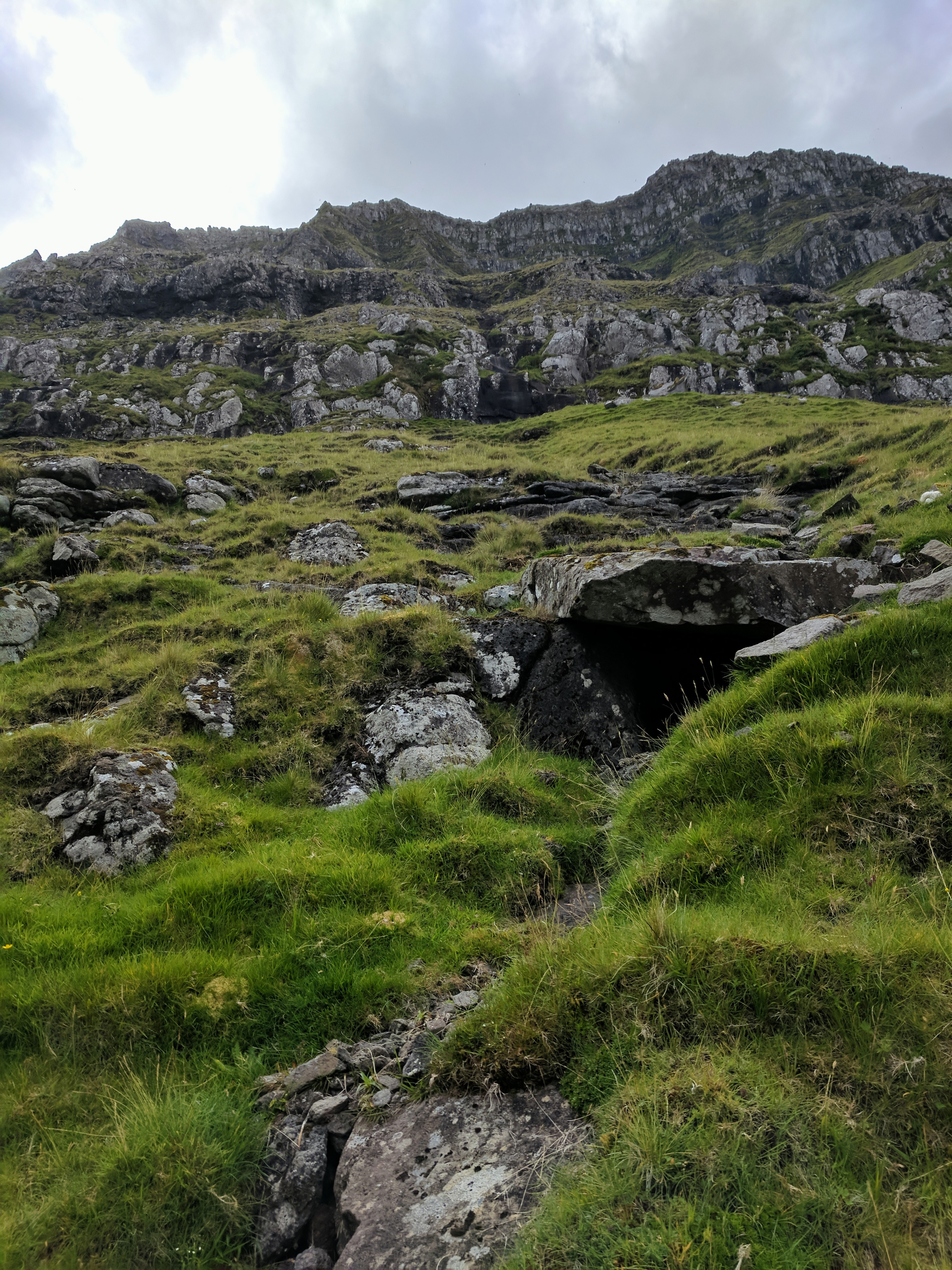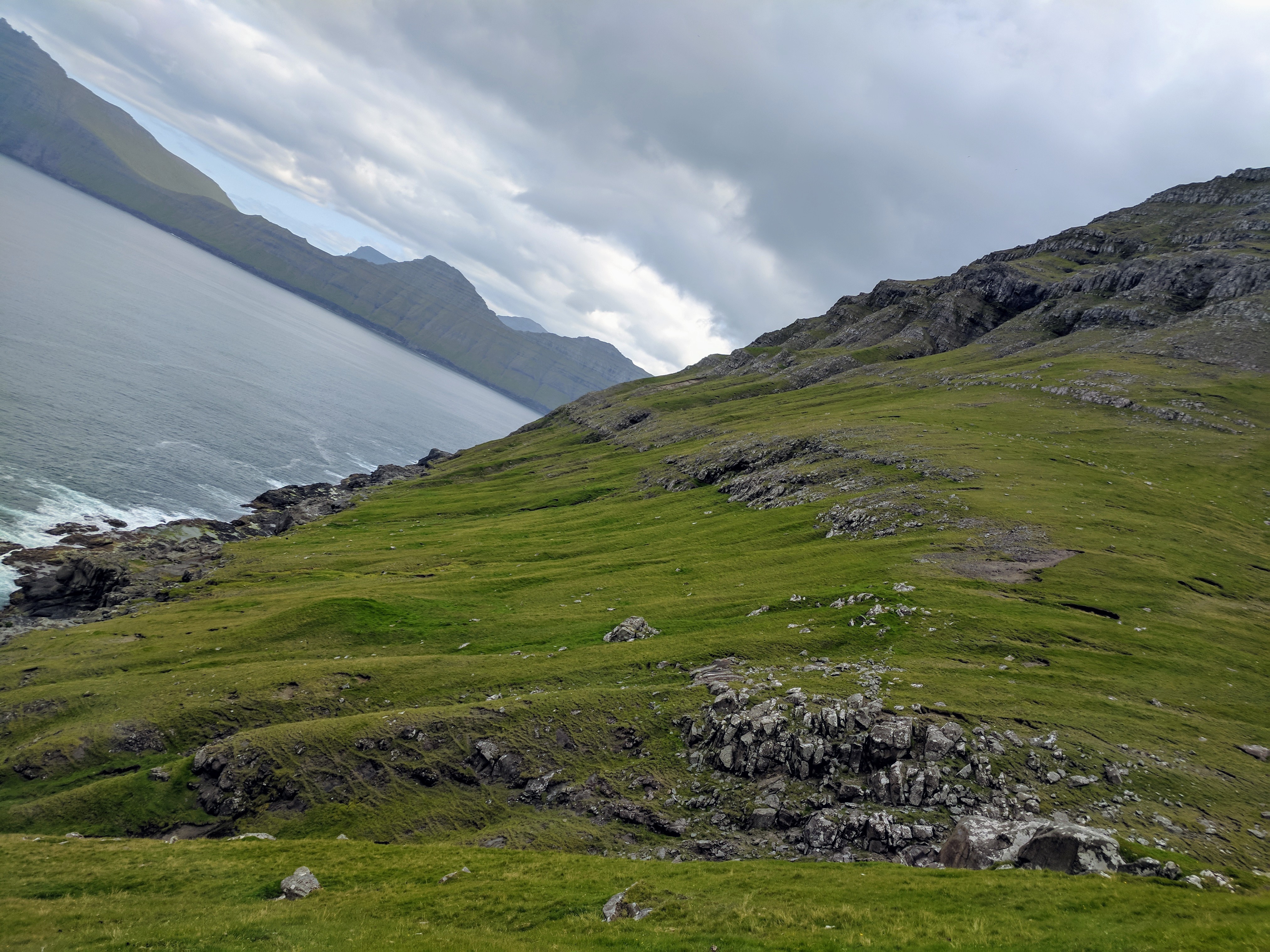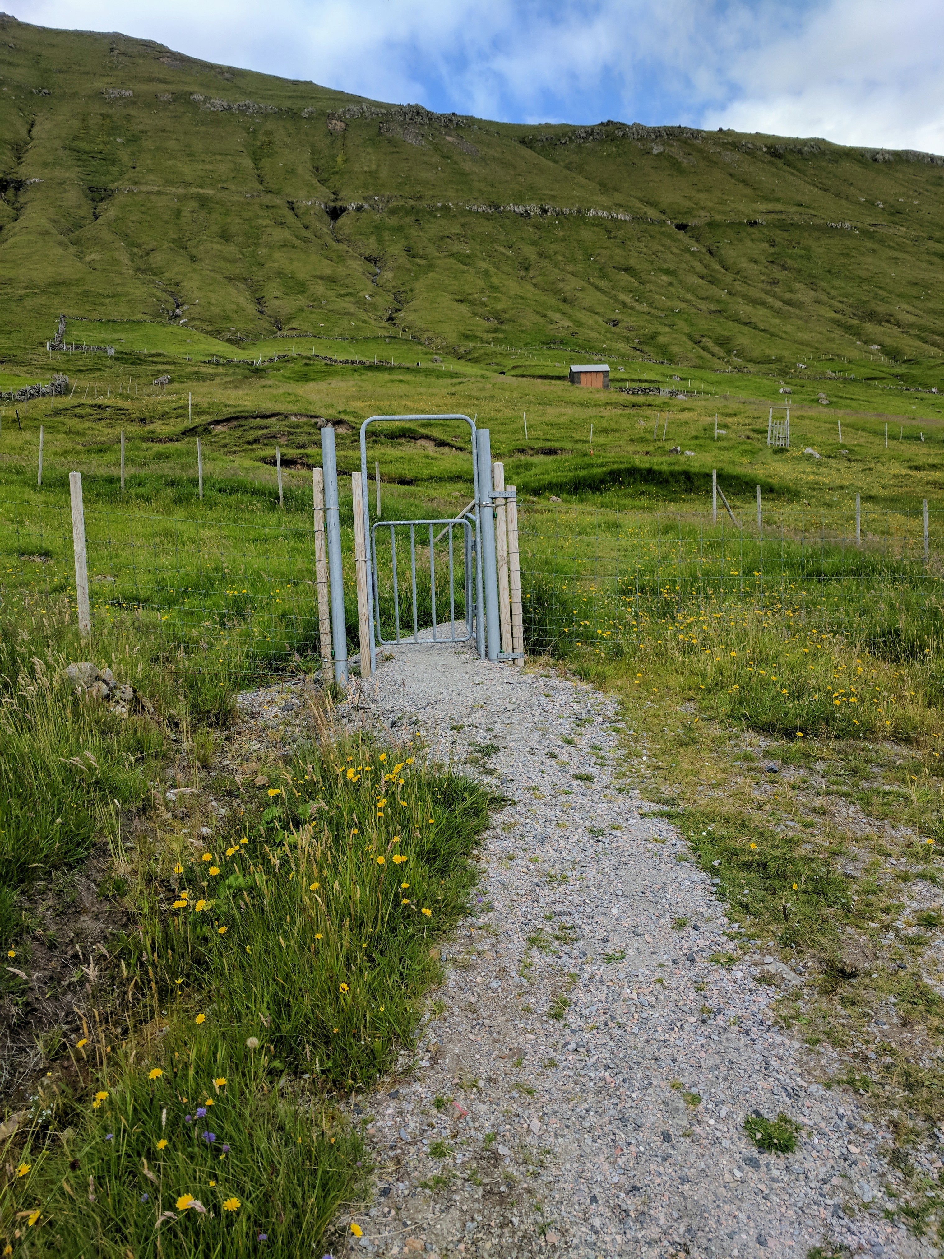 Having missed the two hikes we planned to do in the Northern Isles, we decided we’d better get back to our original itinerary while on Eysturoy. We chose the hike from Oyndarfjørður to Elduvík. In Oyndarfjørður, we parked at the little store just before the school. We followed instructions perfectly but could not find the gate to begin the trail. There were multiple gates and all looked like they went on private property. After much deliberation and feeling desperate we went through a gate that was definitely questionable, then got really desperate and climbed over a gate that was heavily roped off. We knew it couldn’t be the path, so we turned back. A nearby farmer very graciously offered to assist but his vague instructions to head “up the hill” really weren’t any help. The hill in question was at least 180 degrees of directional choices, so we began to trek up still confused.