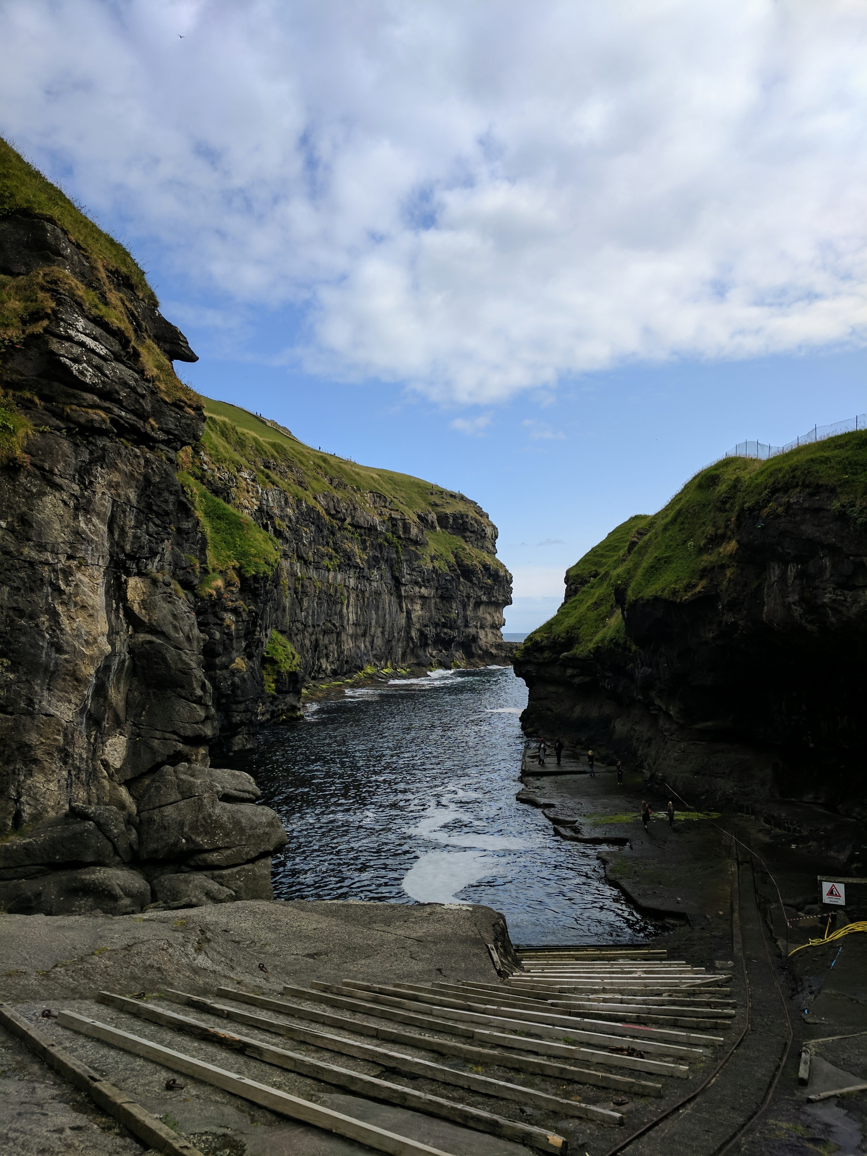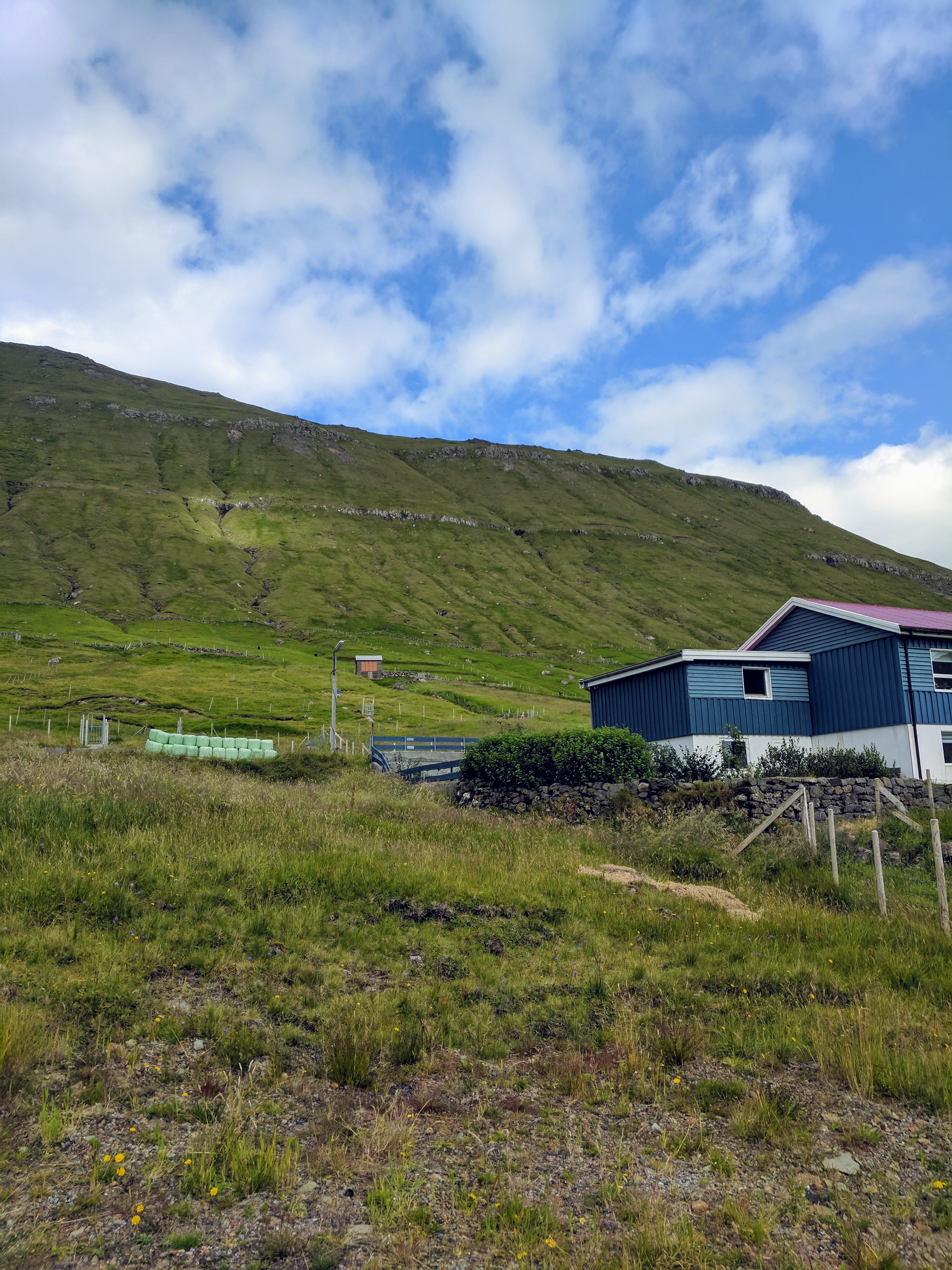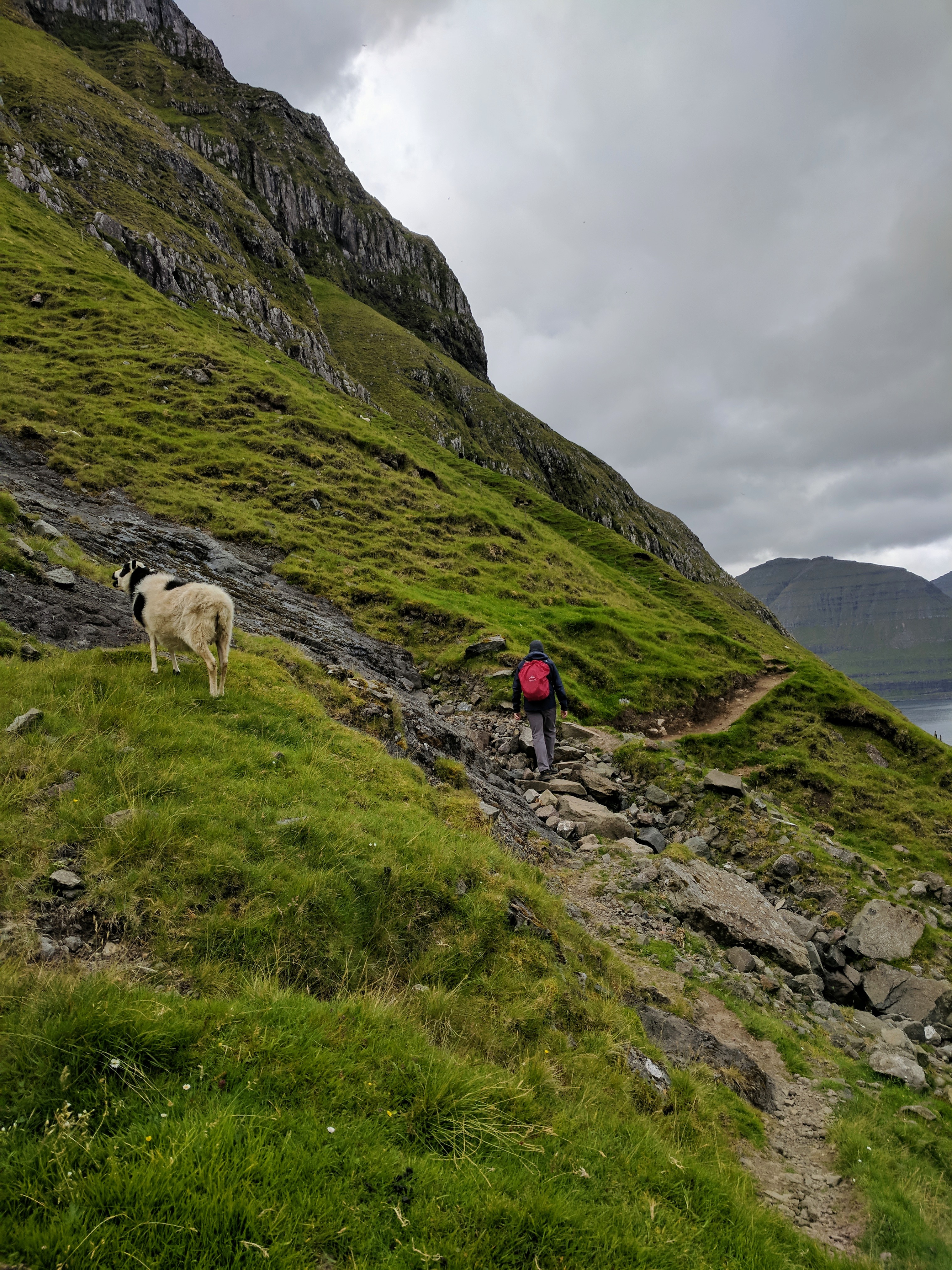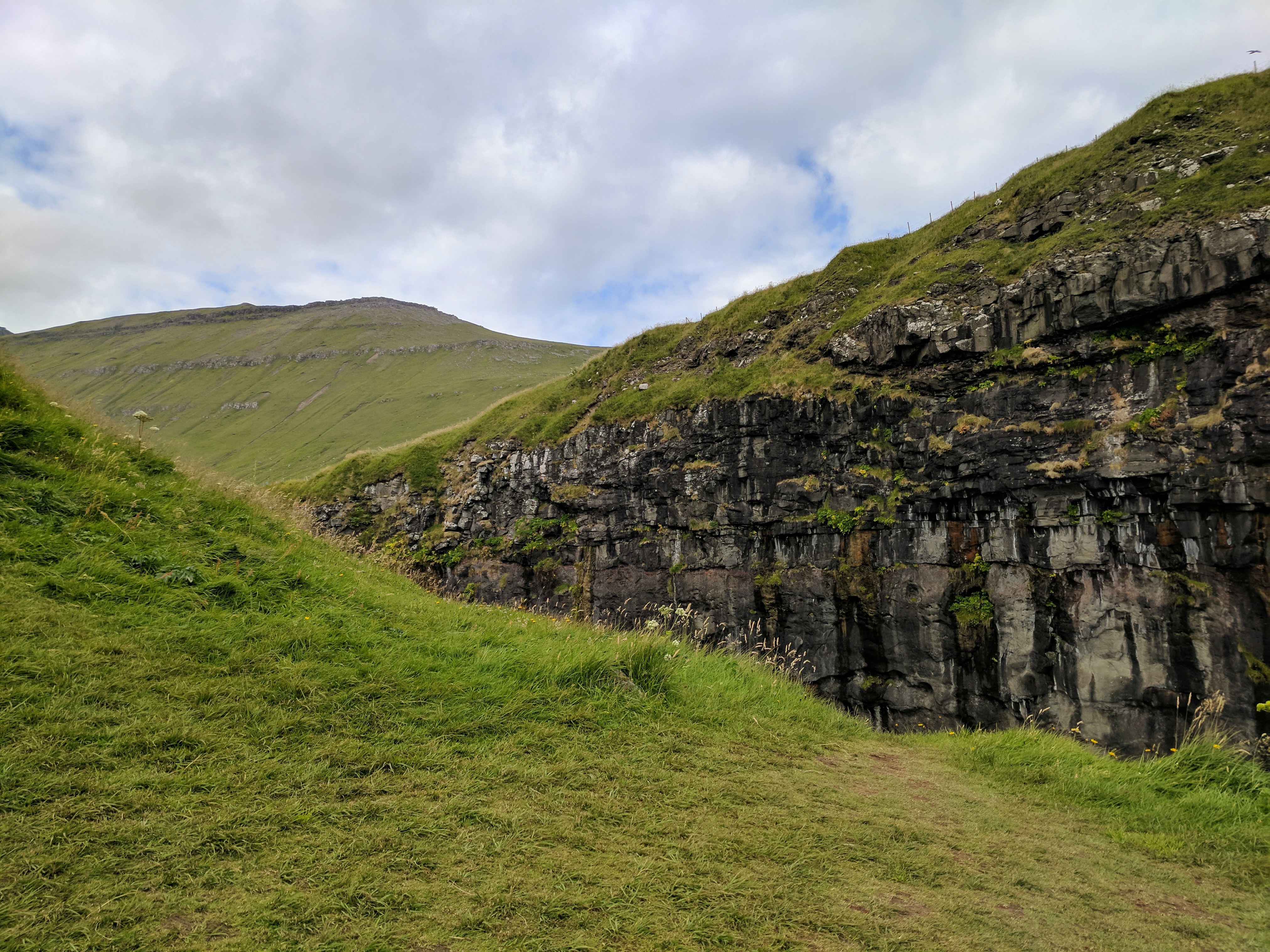 Once atop the hill, the trail narrowly hugged the cliffs with steep vertical drops below. We had to stop a few times for resident sheep to move. When we reached Elduvík we had a picnic lunch by the wharf with views of the Elduvík gorge. There has been a settlement here since the 14th century, so even though it was tiny and there was no food, it was well worth the stop. Retracing our steps back, we finally found the true trailhead when we returned to Oyndarfjørður. The orange trail markers were shorter than the grass around them, and the gate was tucked behind a blue house so we assumed it was private property (which it was).