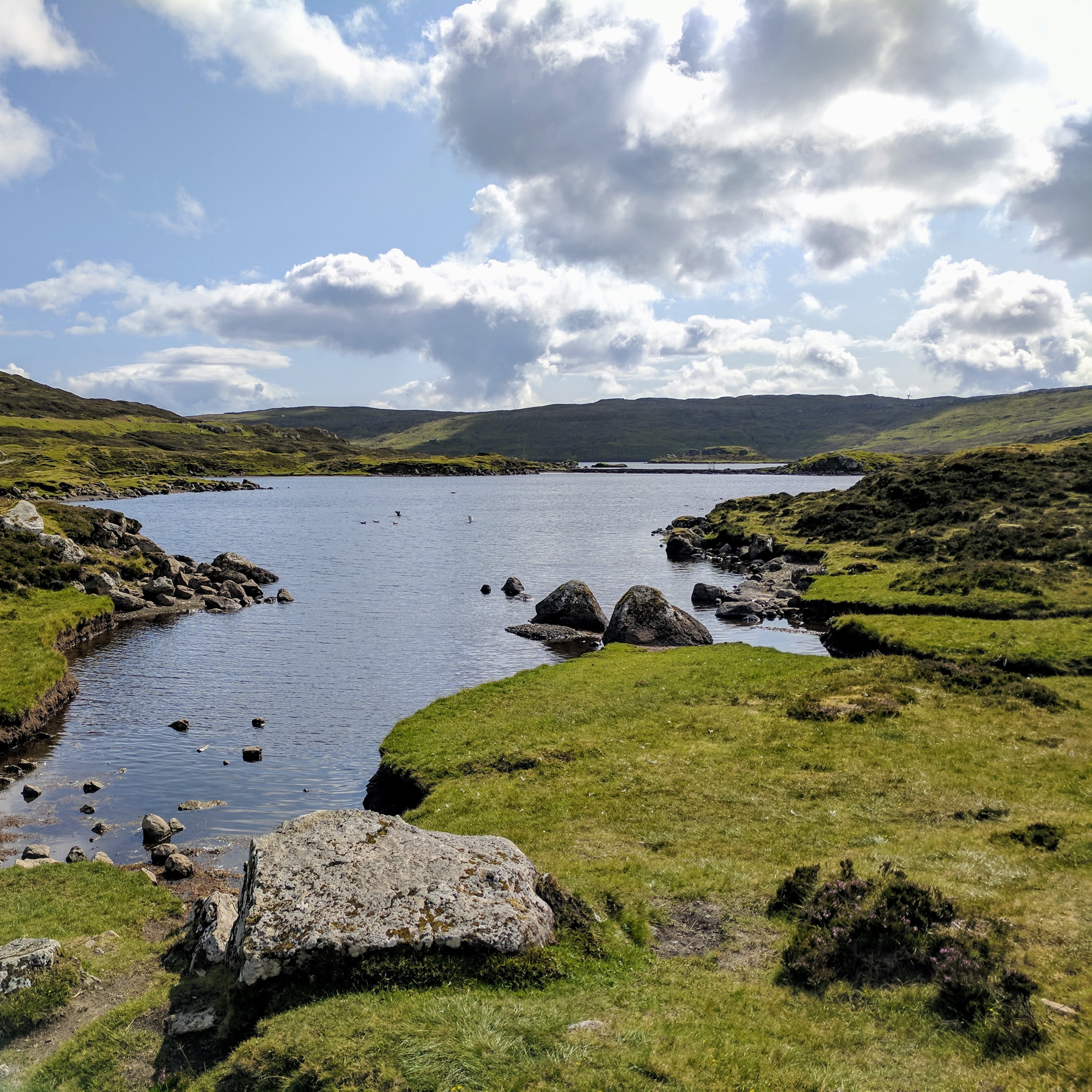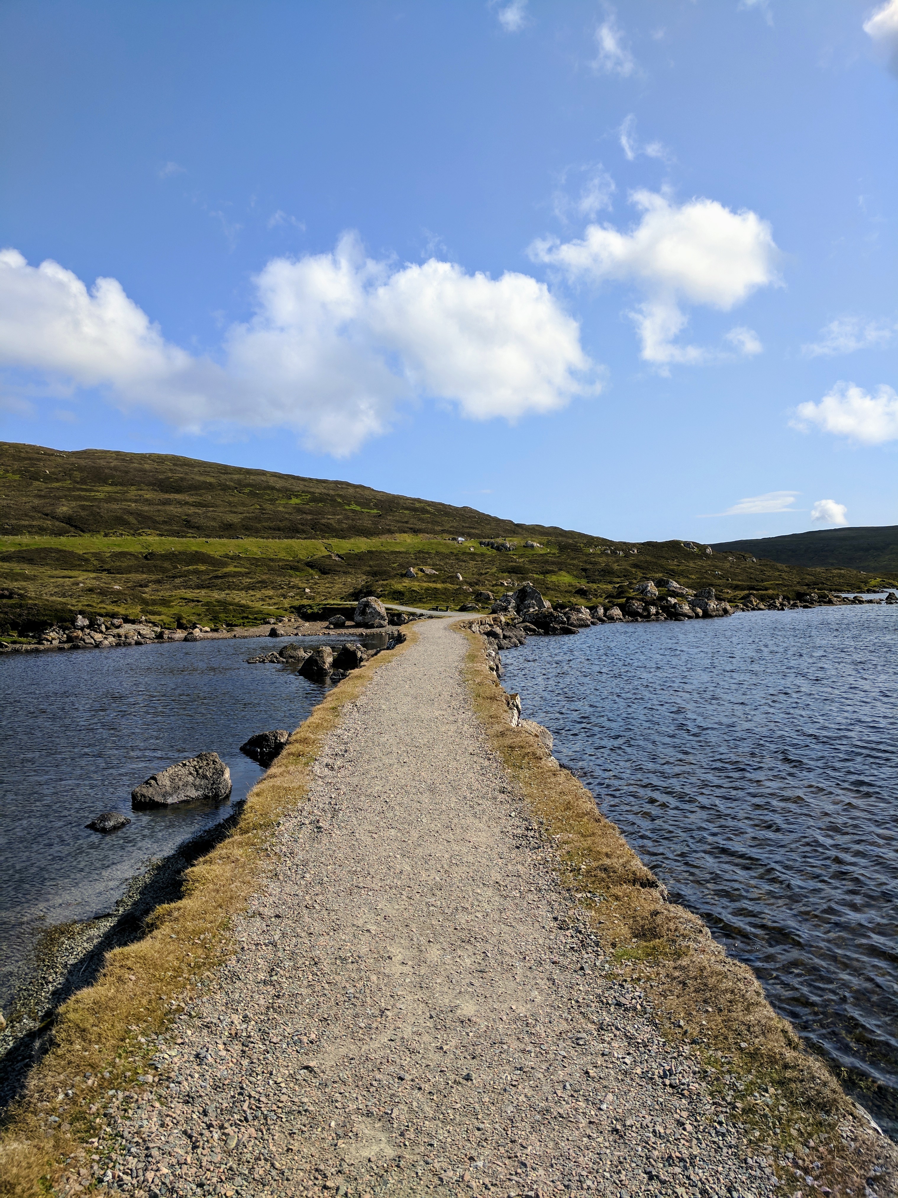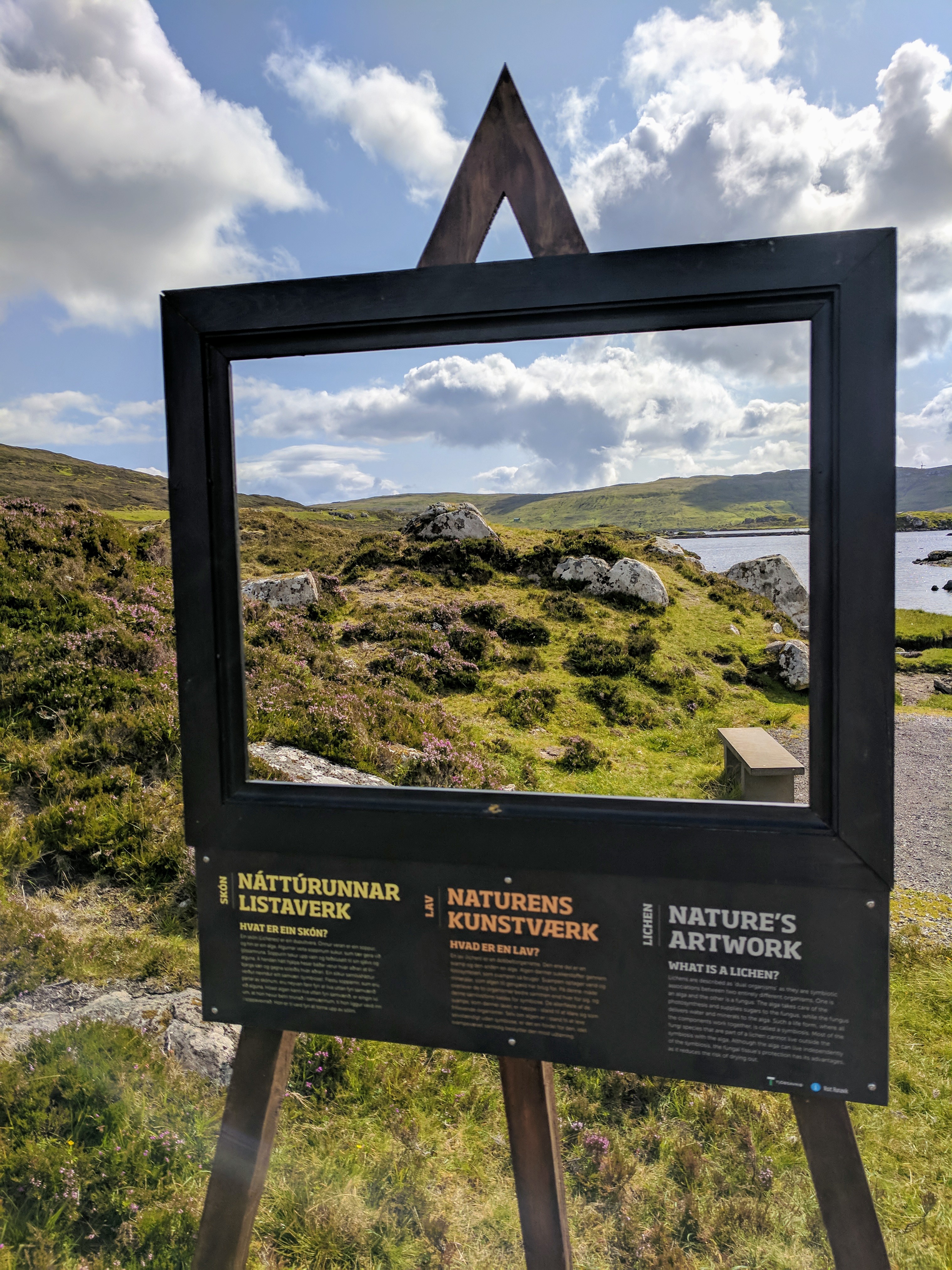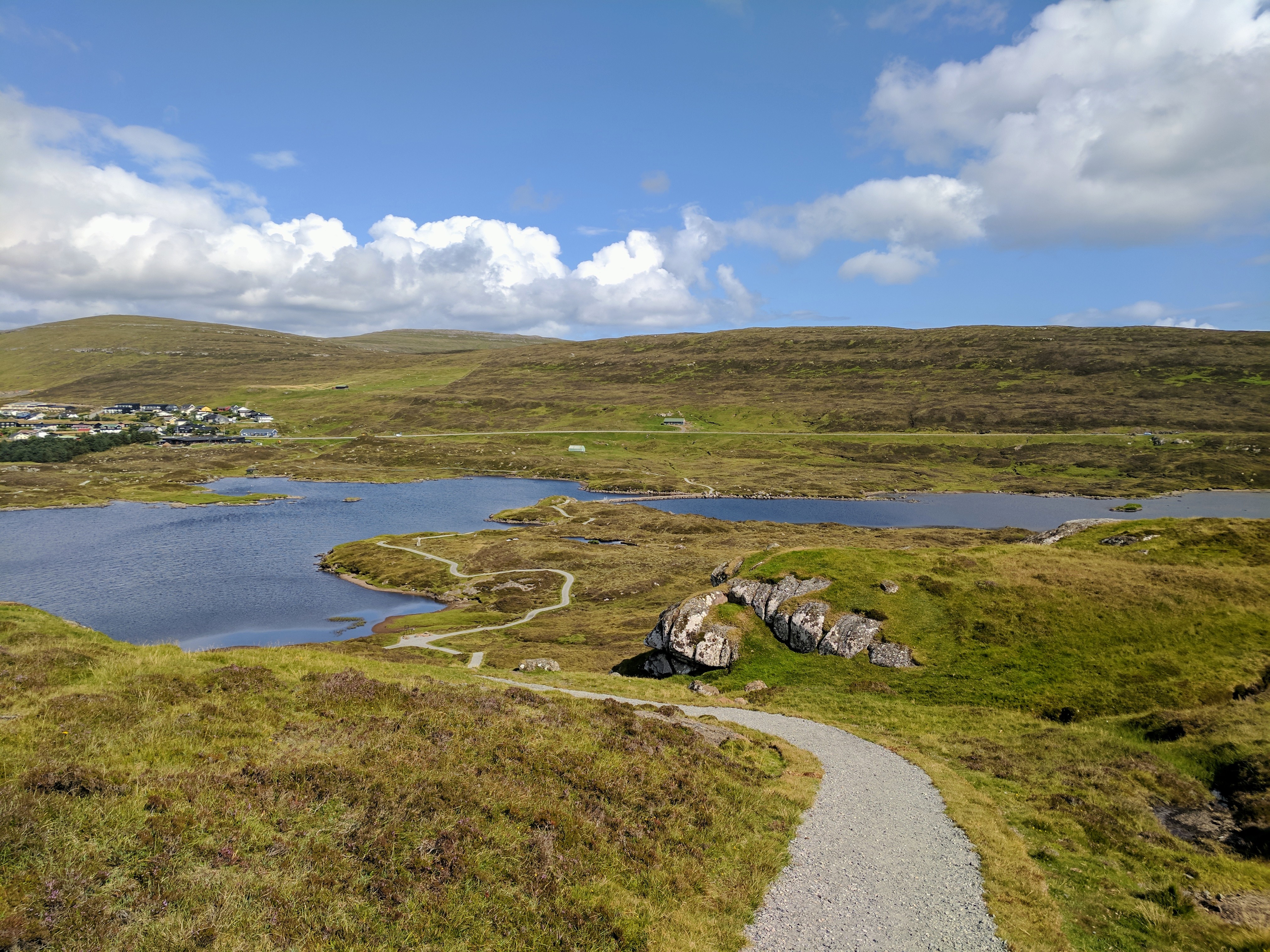 After just a few feet the path met up with a dirt path going left and right but there was nothing going straight (as our directions clearly stated). As with the day before, there was simply no trail and no footsteps going up. We walked along the side path in both directions, thinking maybe we’d see something, but all we saw were some really funny looking sheep. We found out later that the orange buoy around its neck meant the sheep was a trouble-maker, probably one that repeatedly tried to jump the fence. The fact that he was half-sheared really didn’t help his image.Having failed to locate the trail (because THERE WASN’T ONE), we opted to walk a nature preserve in Runavík instead. The nature preserve was called Vistarheimið on Google Maps, and the only place we could see to park was at a sports complex on the main road. Like Kunoy Park, this was a hidden gem that seemed to be completely off the tourist radar. We loved it! It was an easy flat path around Lake Toftavatn, with an alternate option to trek up a hill to see the pride of the Faroese — their new international football stadium.