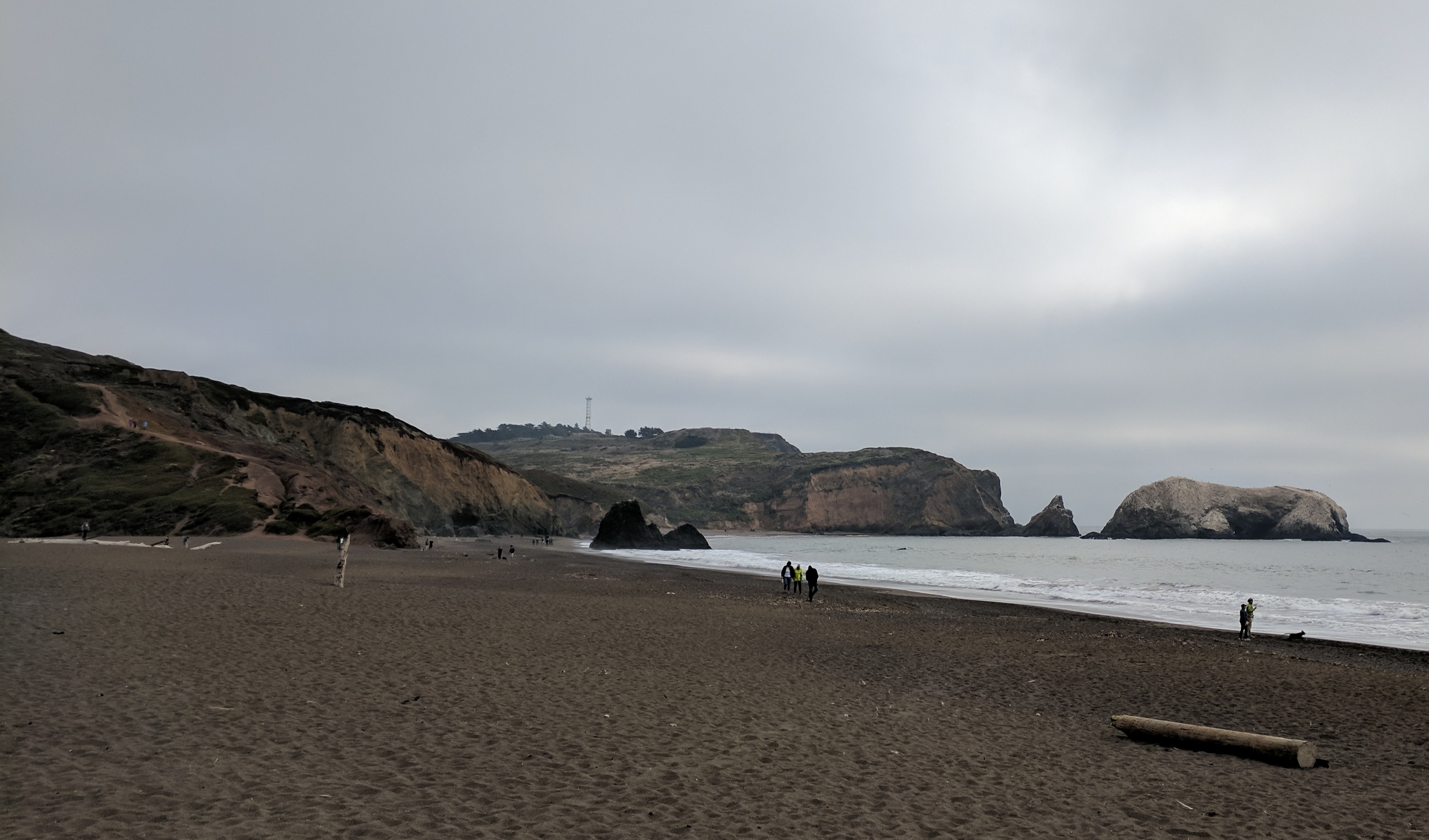 Rodeo Beach was less than a mile from the hostel, so we walked the Lagoon Trail Loop which took us past a freshwater lagoon. A large flock of pelicans flapped their wings on the lagoon surface, creating a sound like a didgeridoo. The beach was small with black sand, fog, and red dirt cliffs rising on both sides that made for beautiful images. It was windy, barren and wild and I absolutely loved it!
