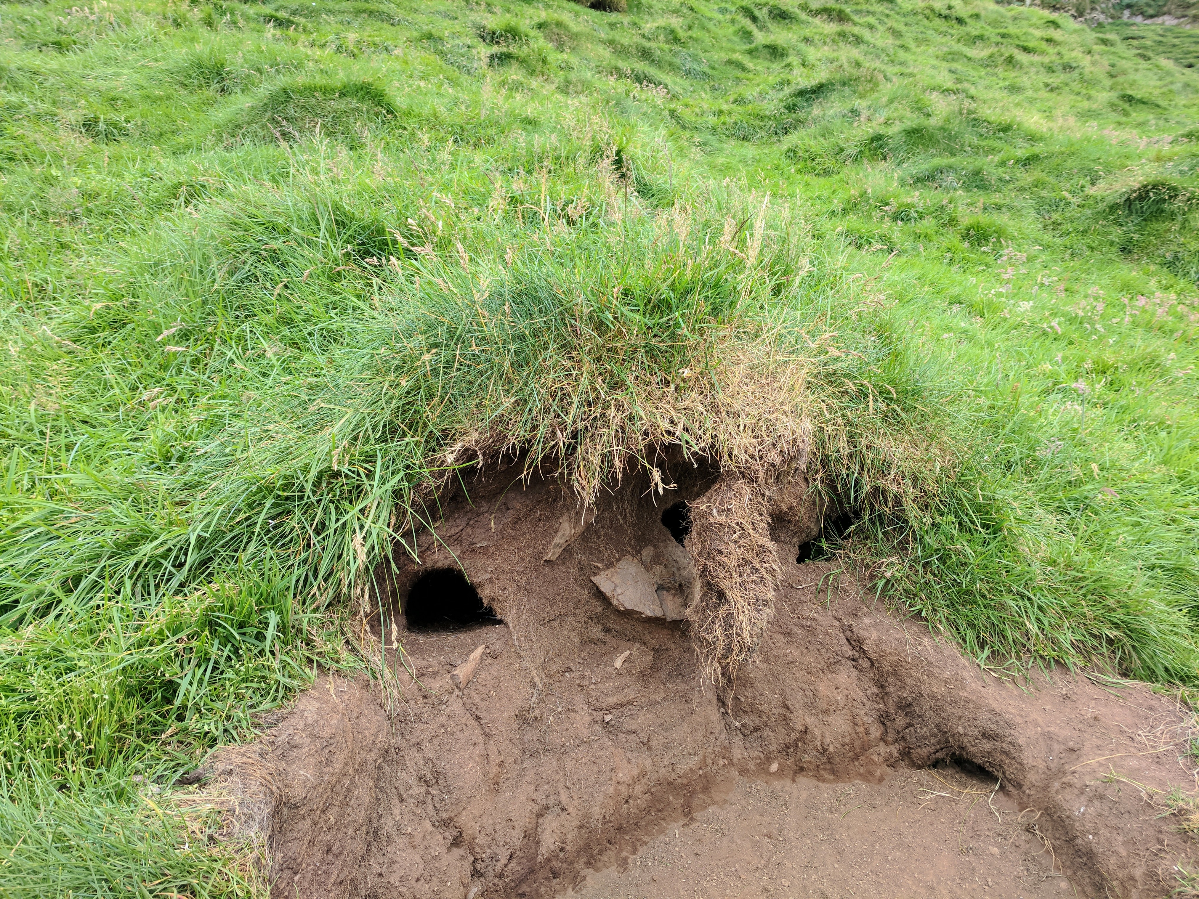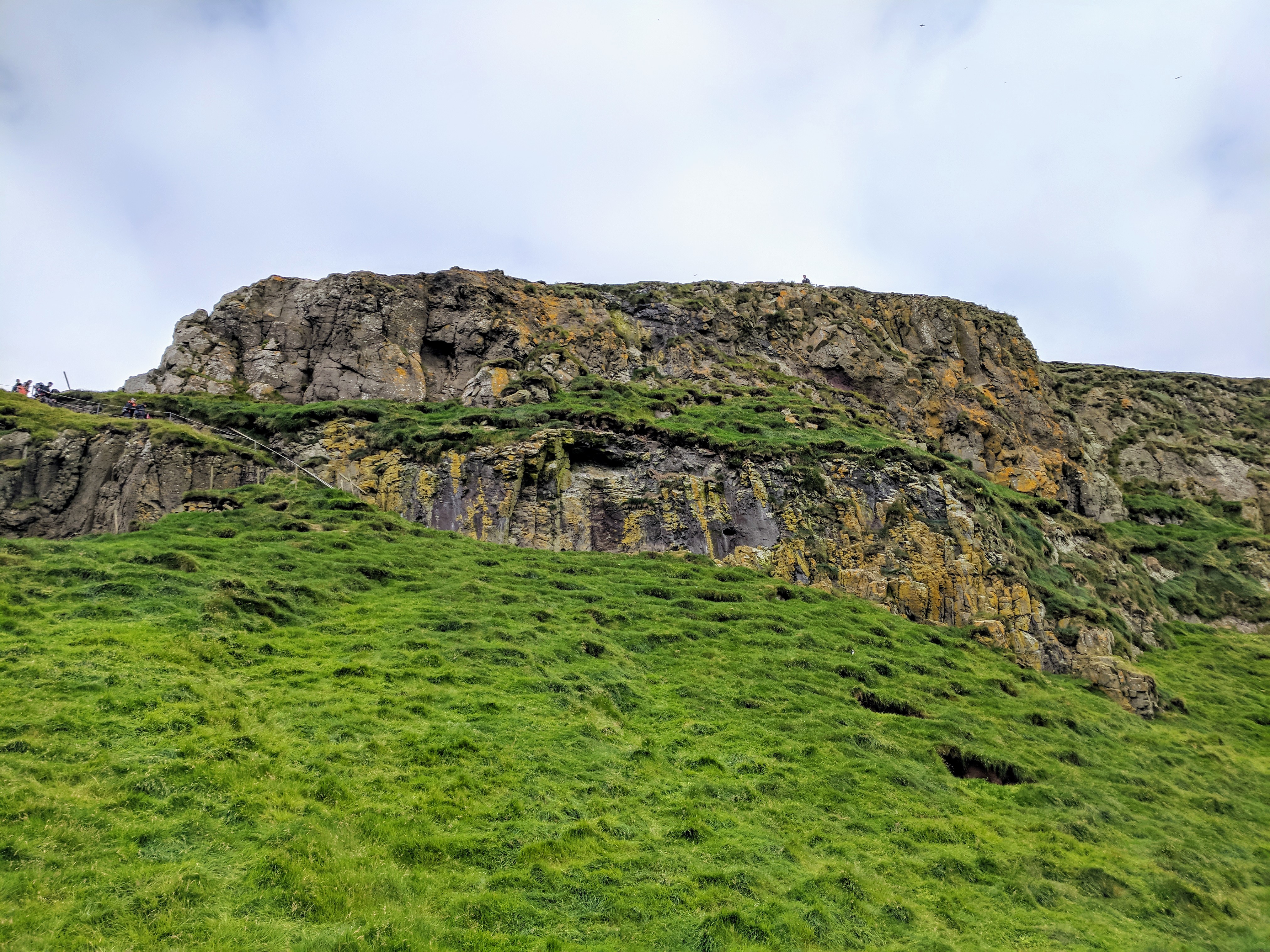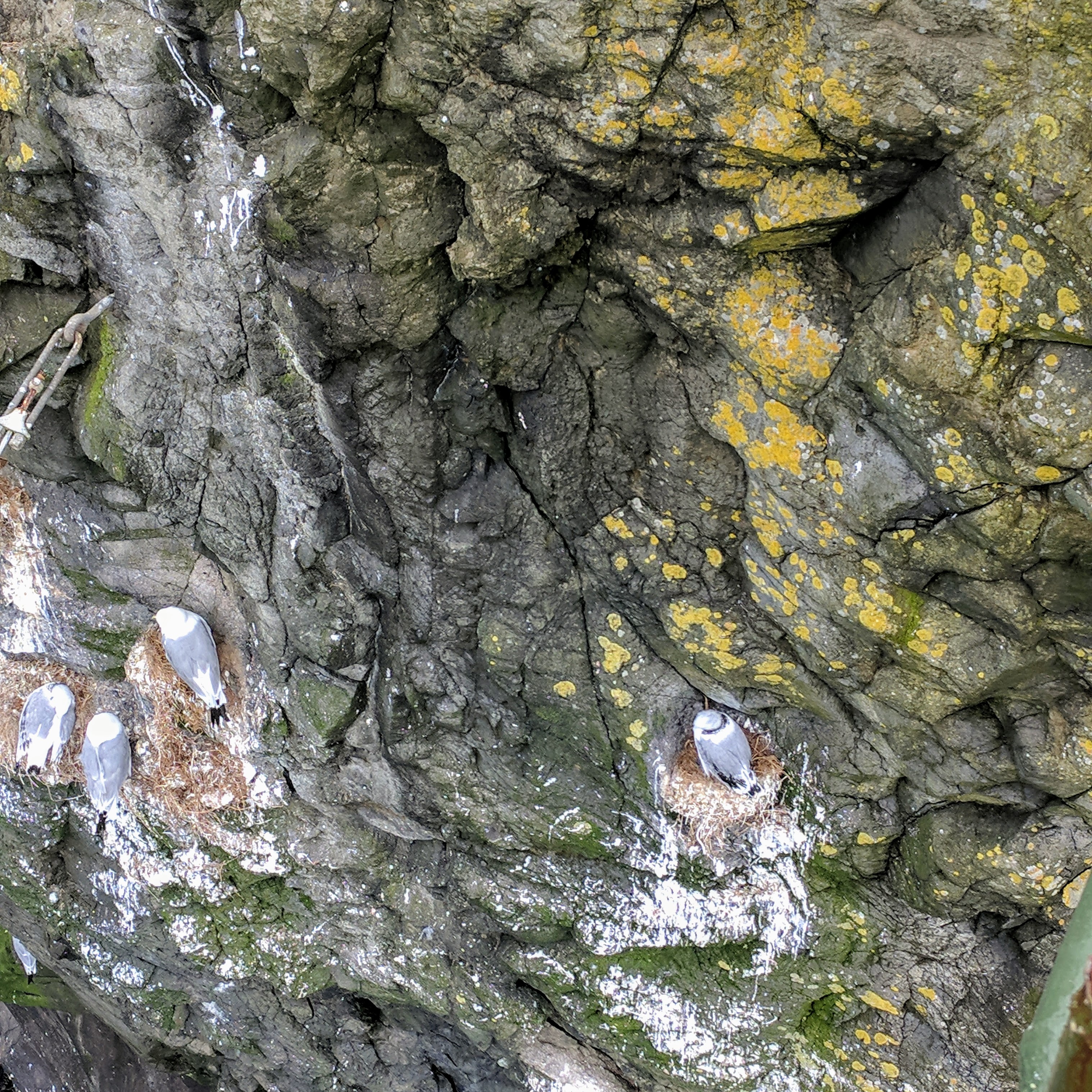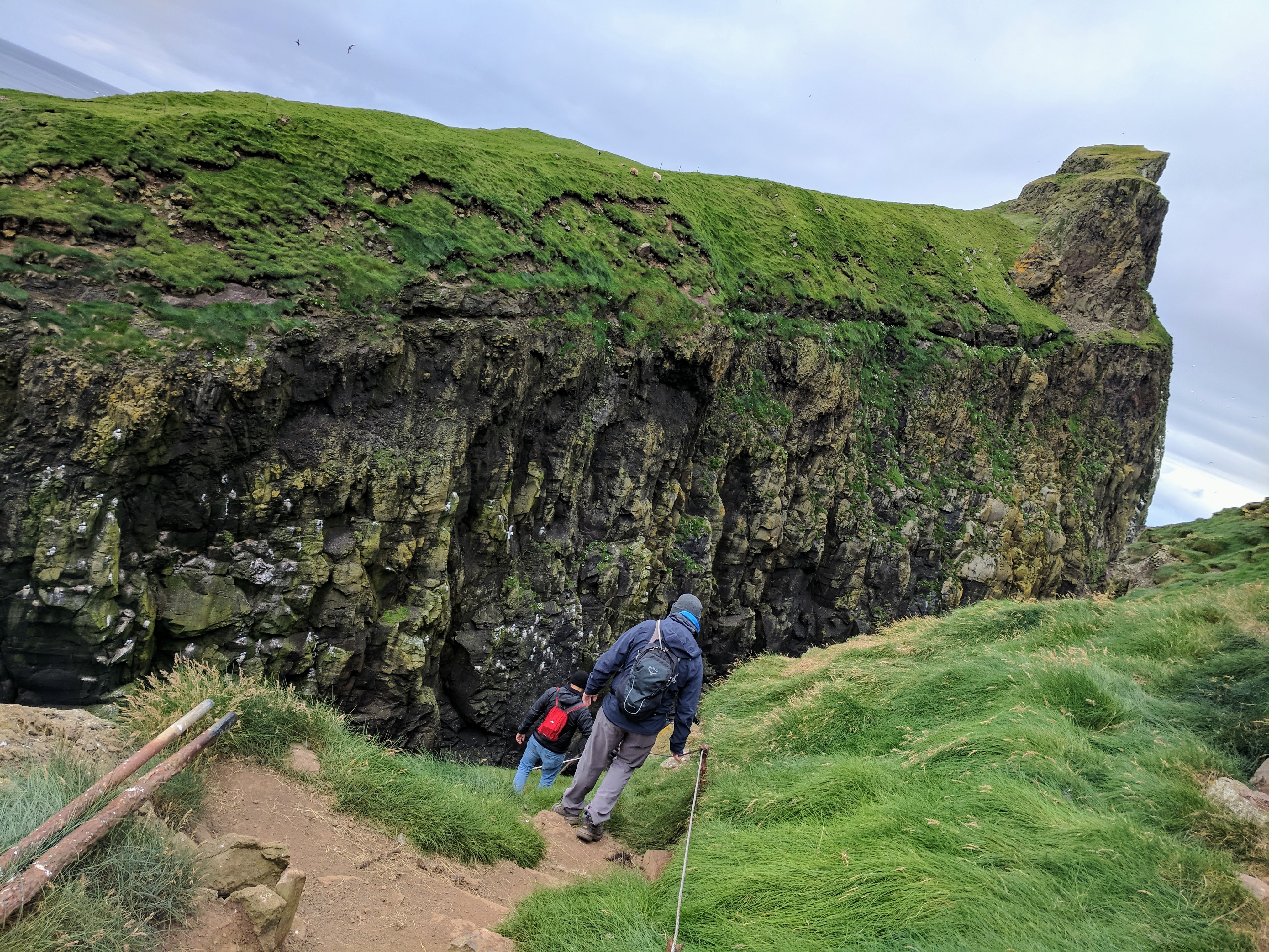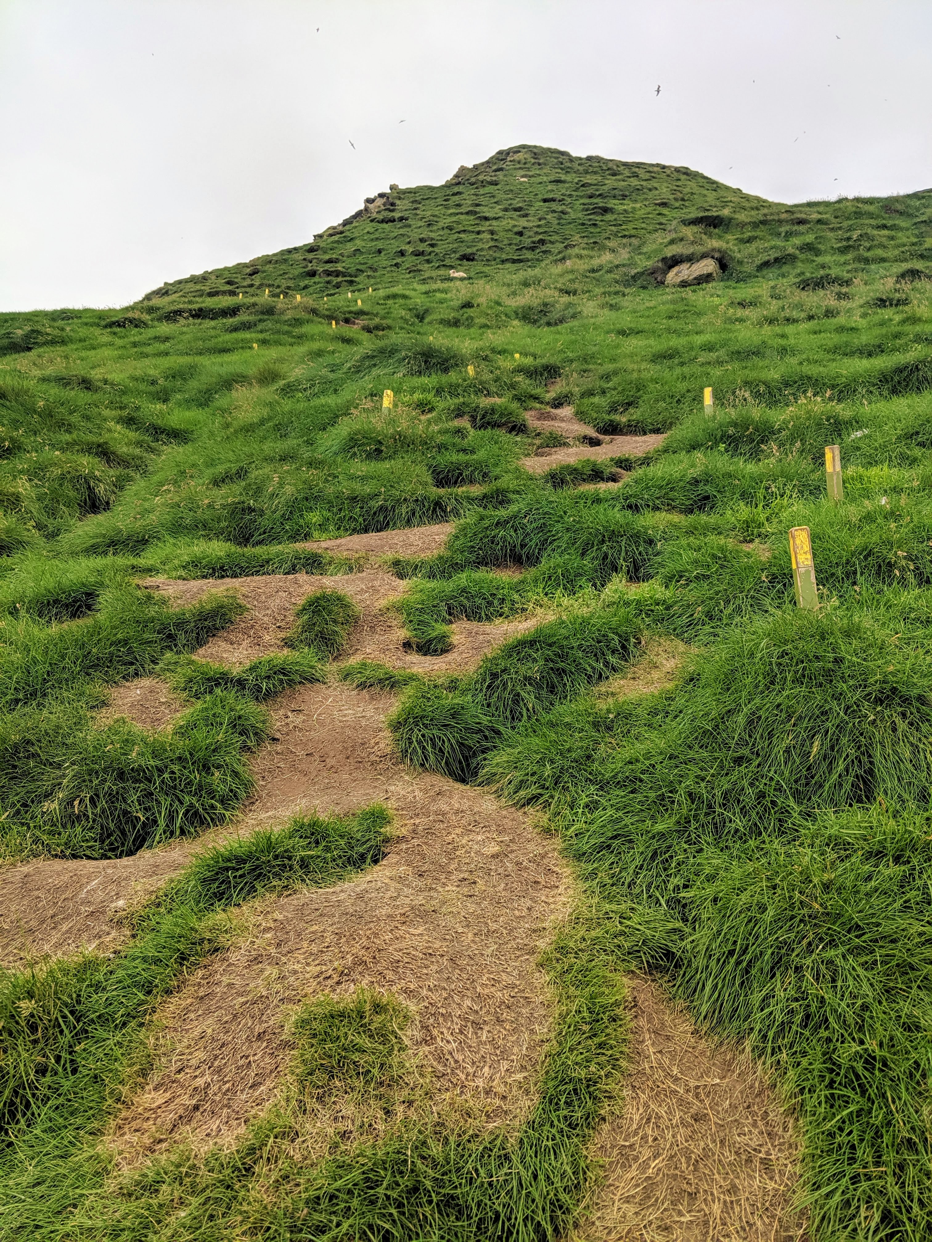 We learned that puffins live in burrows, similar to gophers. The walking path took us directly through these burrows and we could see puffins darting out. They might be small, but they are super fast! Before entering this part of the trail, someone asked to see our hiking pass and told us not to stop or slow down from that point forward. I was happy to see that everyone was being respectful of the space and trying to stay on trail as much as possible. One wrong step could destroy a burrow. We did see one couple stop, but that was so he could remove his fancy raincoat which had just been shat on — that was one VERY unhappy Russian tourist!