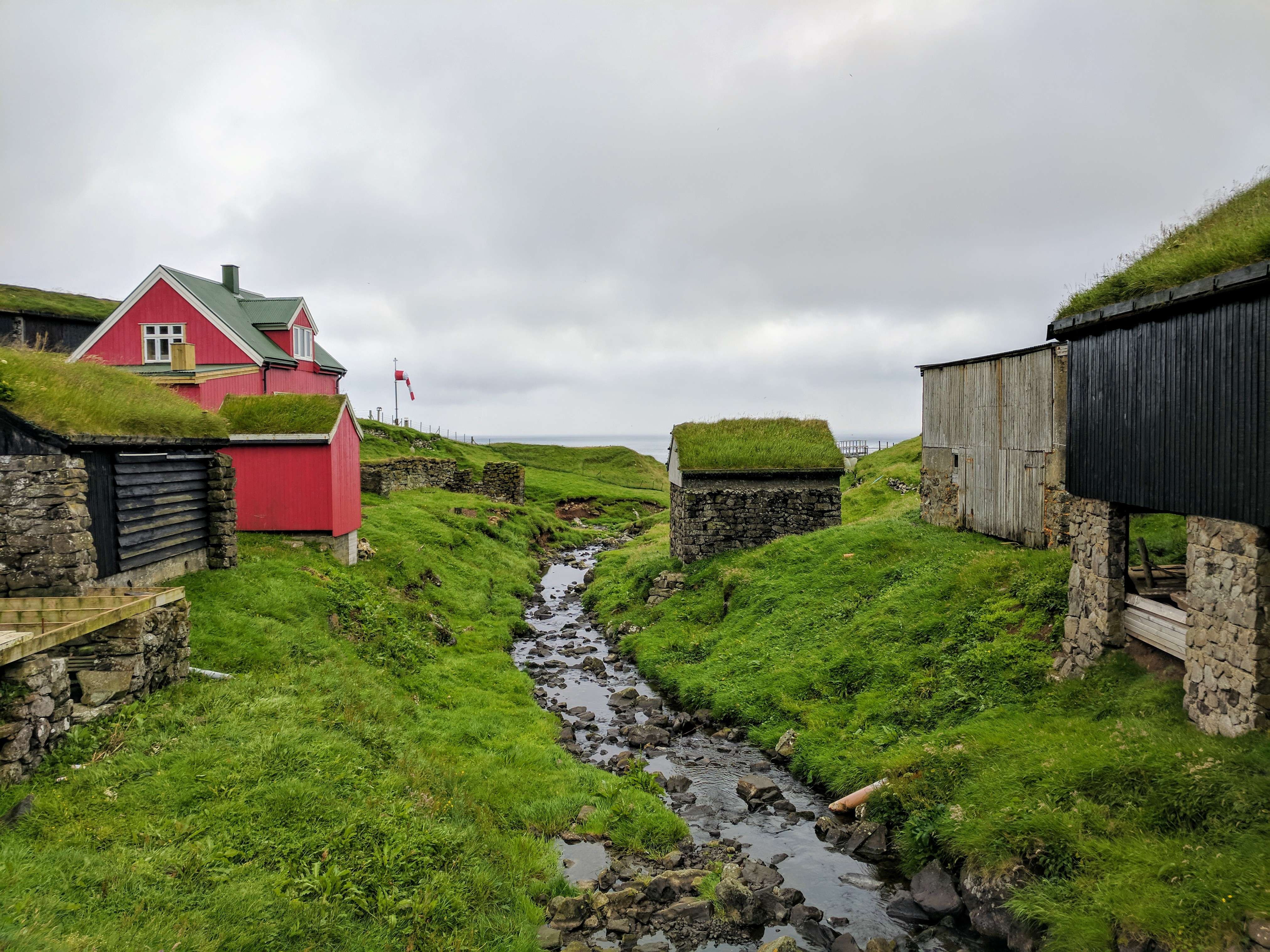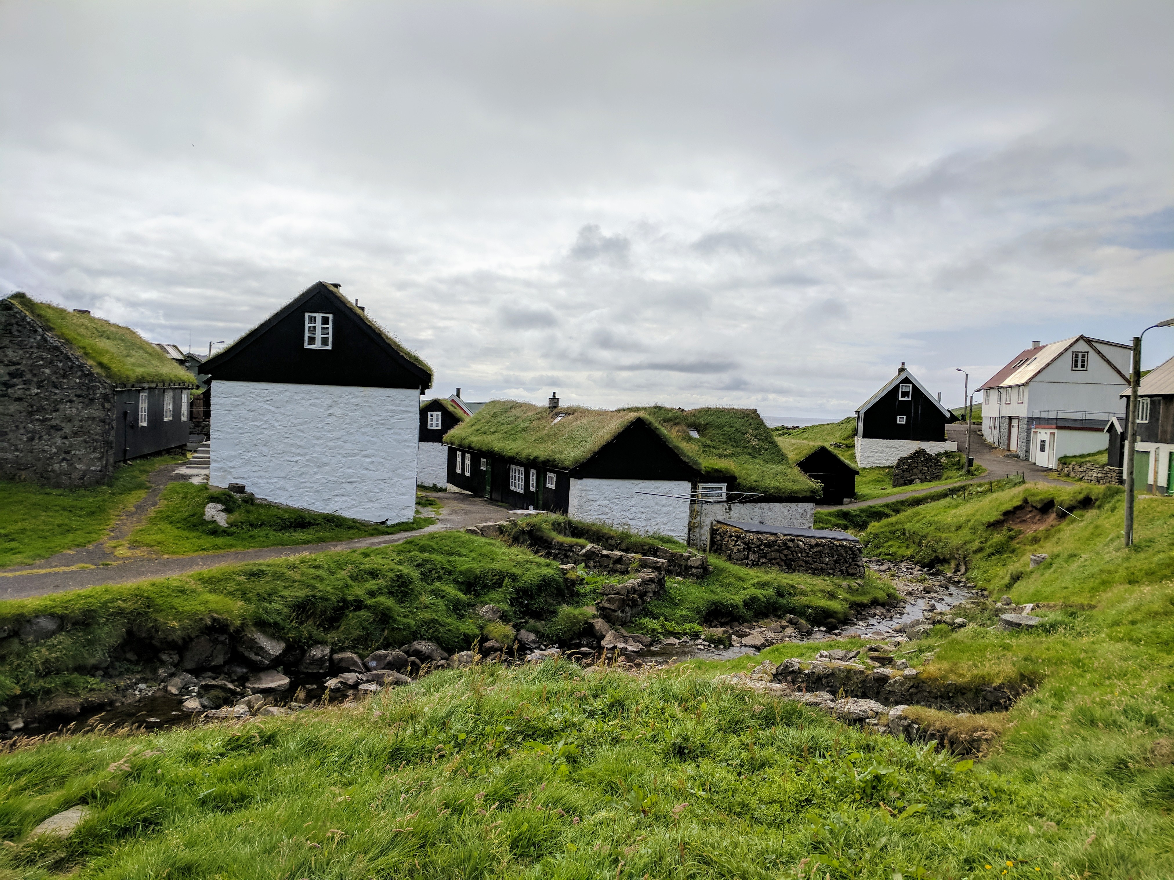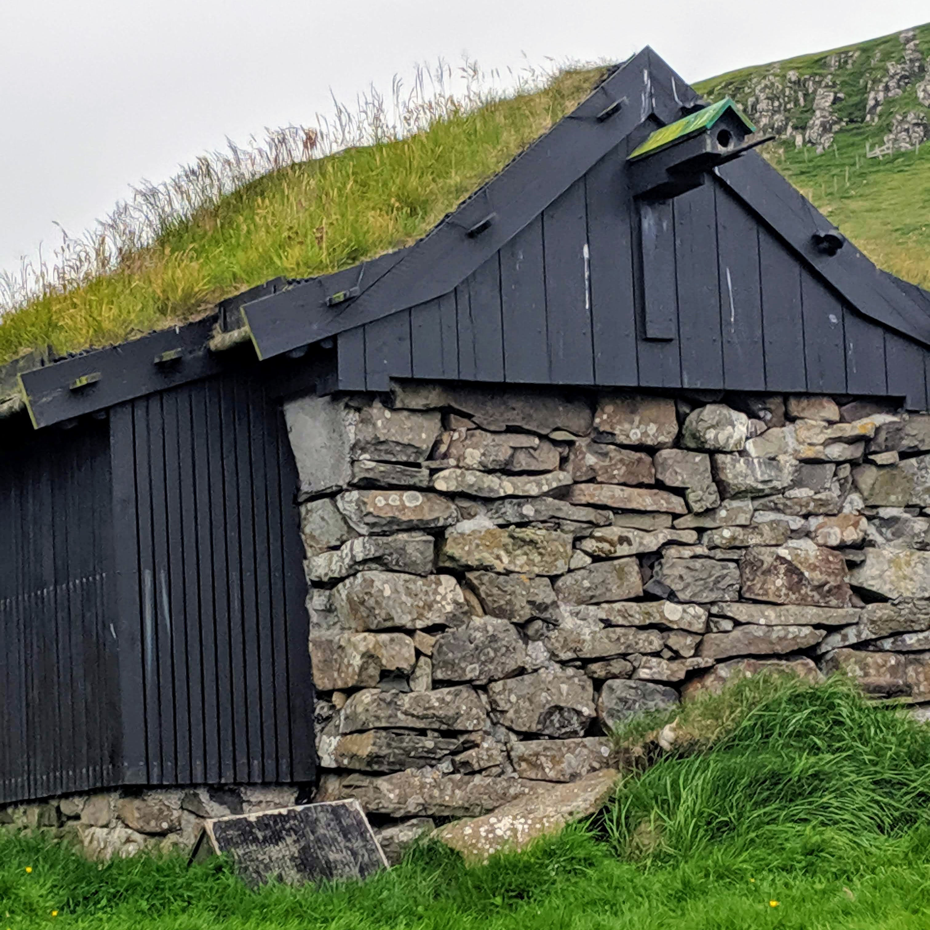 It began raining heavily just as we returned to the village, forcing us to take shelter in a cafe. We were starving by that point because we’d forgotten our sandwiches at the AirBnB. Mykines was sparse — there are only 11 permanent residents — and there were only two tiny cafes, which were next door to each other. Both had very limited food options, but they were cozy and dry. We had a hotdog, cake, and beer at The Locals (which had more seating) then moved on and had hot chocolate at Mykinesstova (which was much nicer but had limited seating). We listened to fellow tourists speaking French, German, Danish, Spanish, and Russian. There were signs at Stova saying “No WiFi here. Talk to each other” and that is exactly what people were doing. They also played cards, which we noticed was a common practice at every Faroese cafe. The village itself was beautiful, with its grass roofs and a stream running through it. So despite the weather, we felt truly blessed to be there.