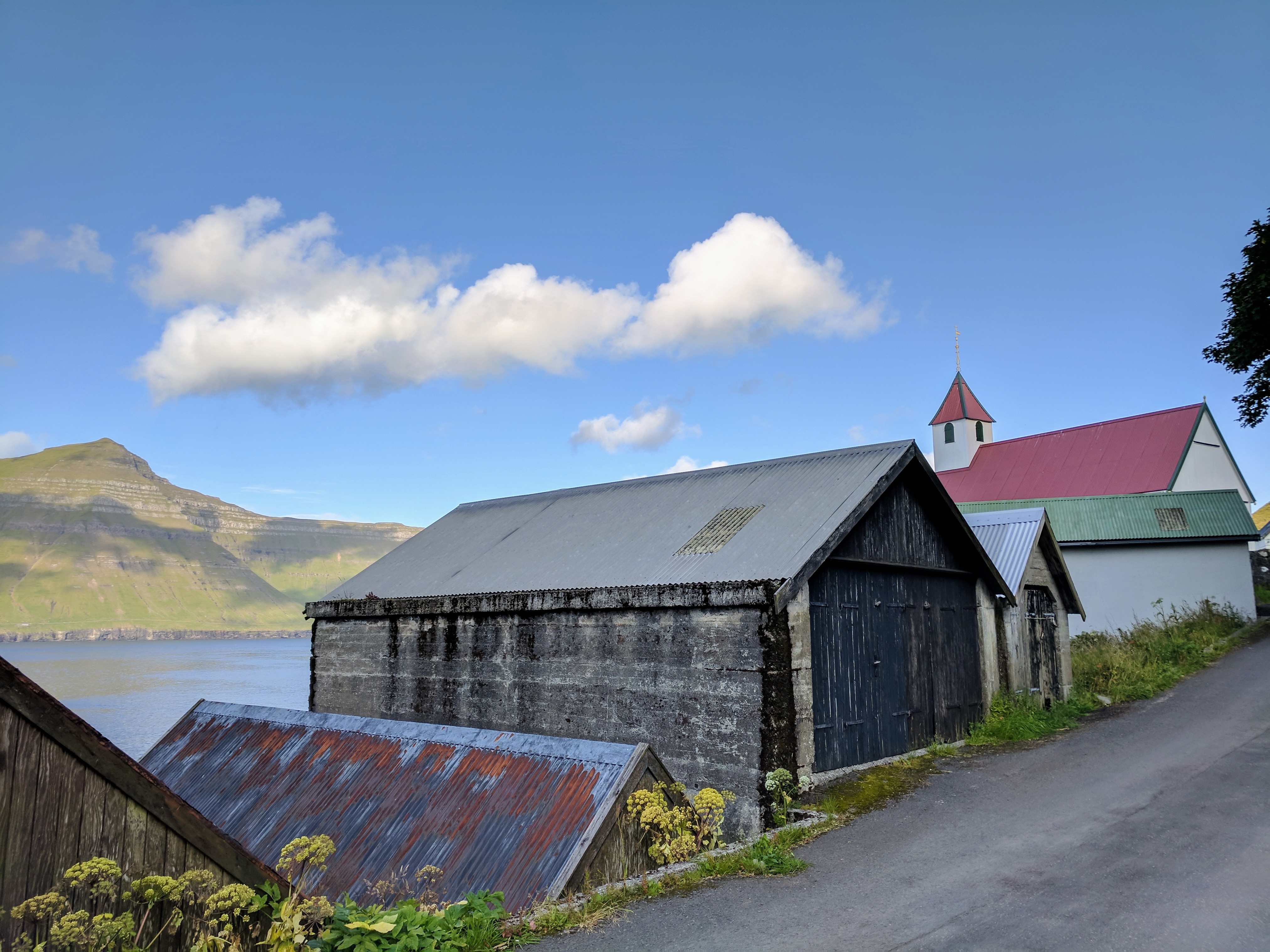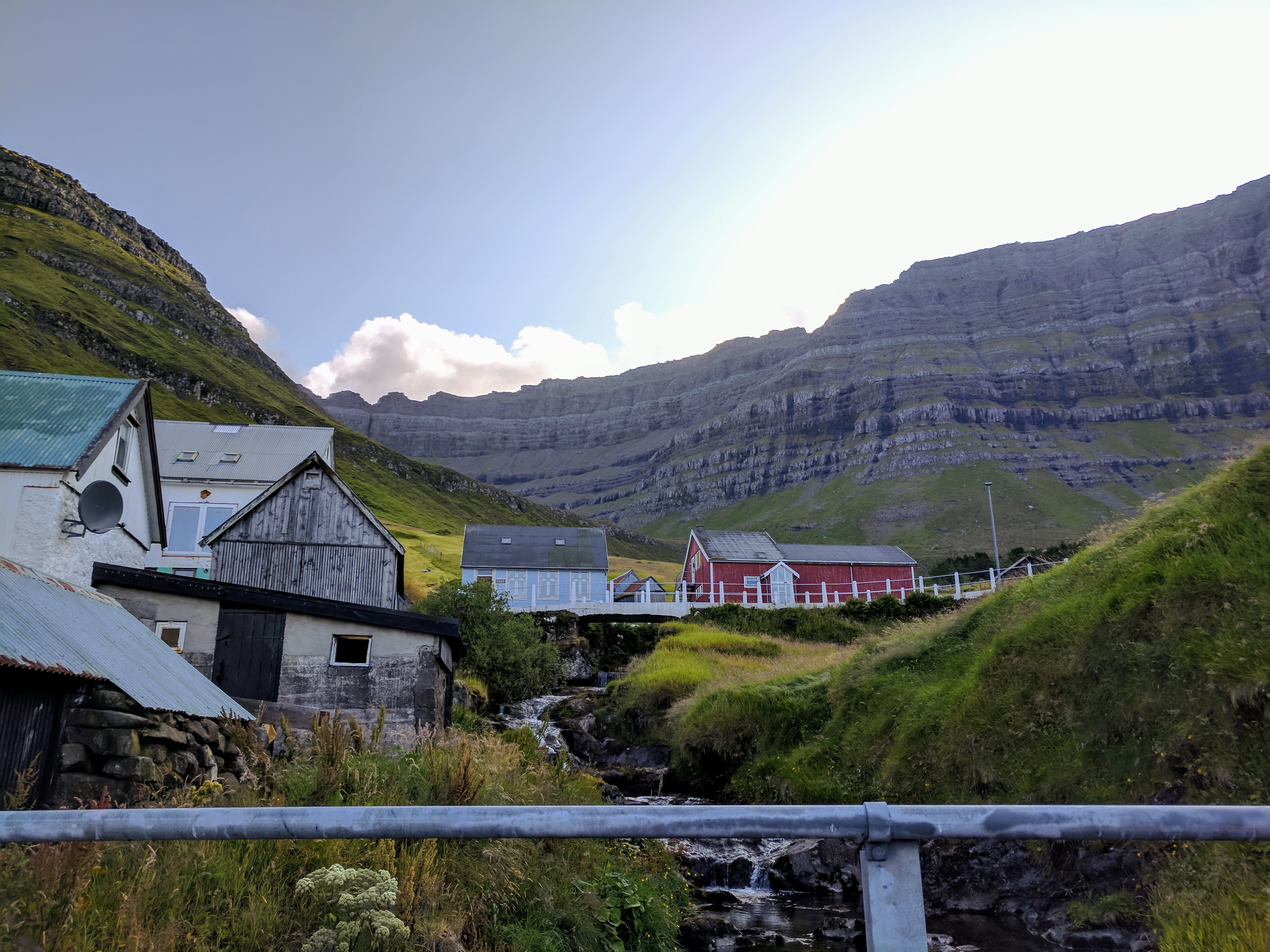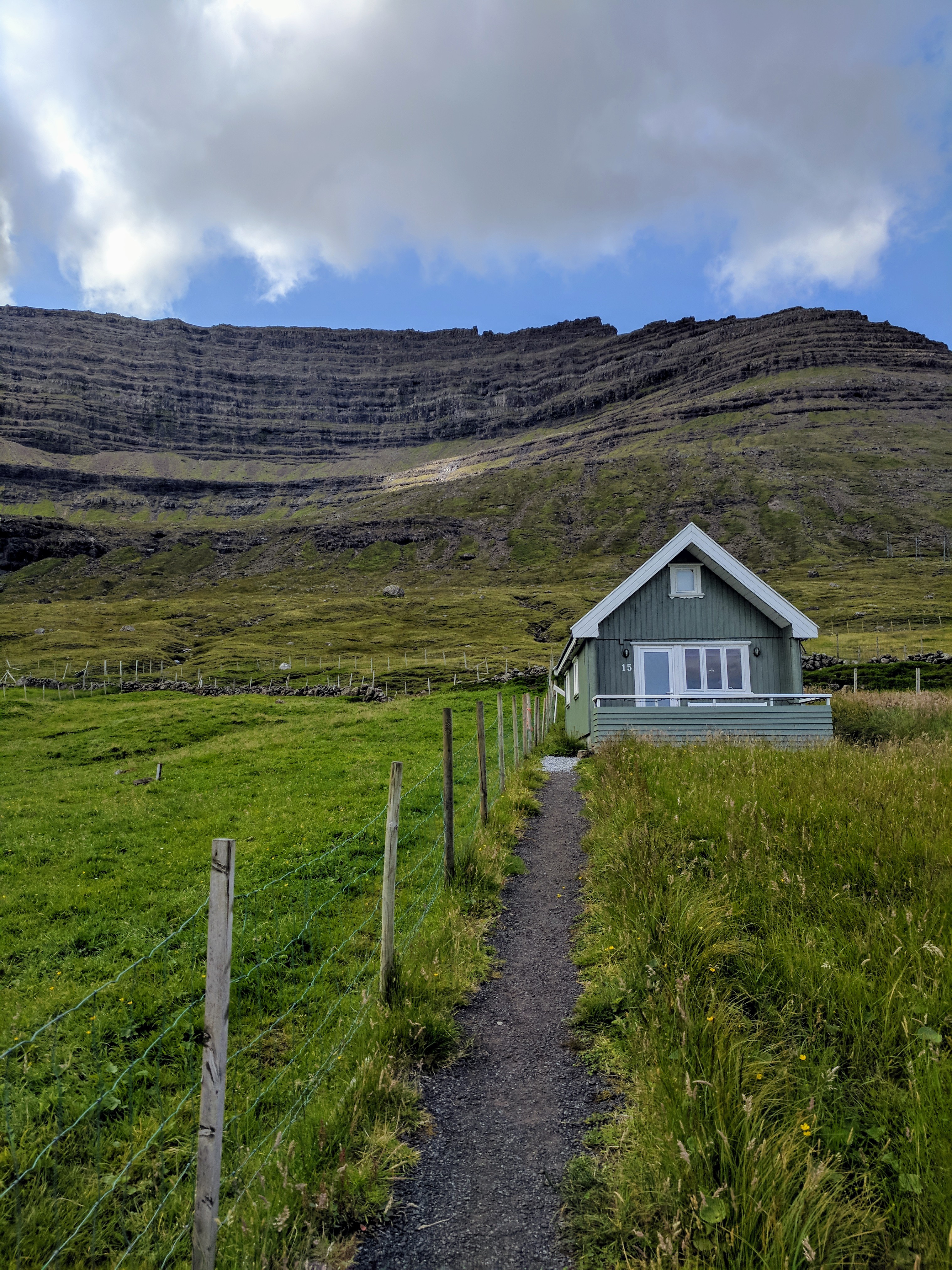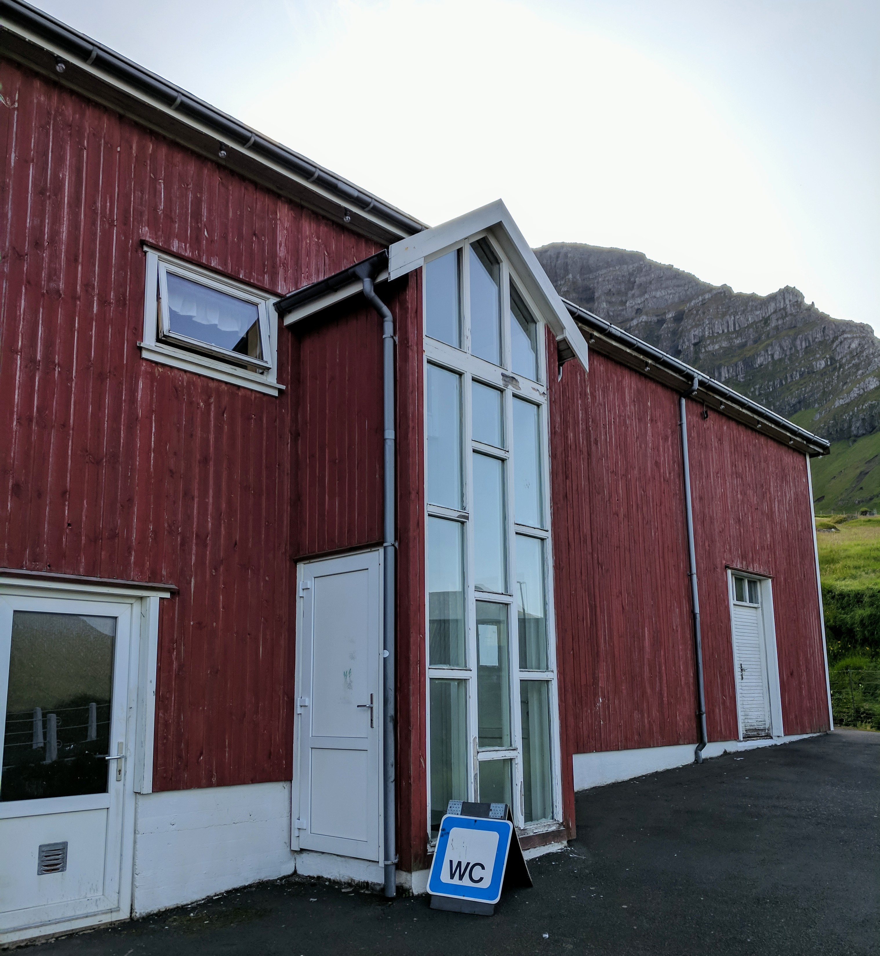 The tunnels were worth it, however, to reach the remote villages of Norðdepil and Viðareiði. We spent two nights in an AirBnB cottage with our own personal waterfall in the backyard. There were no restaurants on that side of the tunnels, so we made do with canned mackerel, cheese, bread & potatoes. The second night we had seafood cocktail and vegetable medley, compliments of a Klaksvik grocery. We had comfortably embraced Faroese cuisine at this point. Across the water in the neighboring village of Hvannasund, we were delighted to find an old one room school turned into a cozy cafe. In such a remote area, Cafe Old School’s rhubarb cake and hot chocolate was enough to send me into rapture! Hvannasund appeared to be in the early stages of development, with a new walkway being built along the shore and old boat cabins being converted into rental cottages.