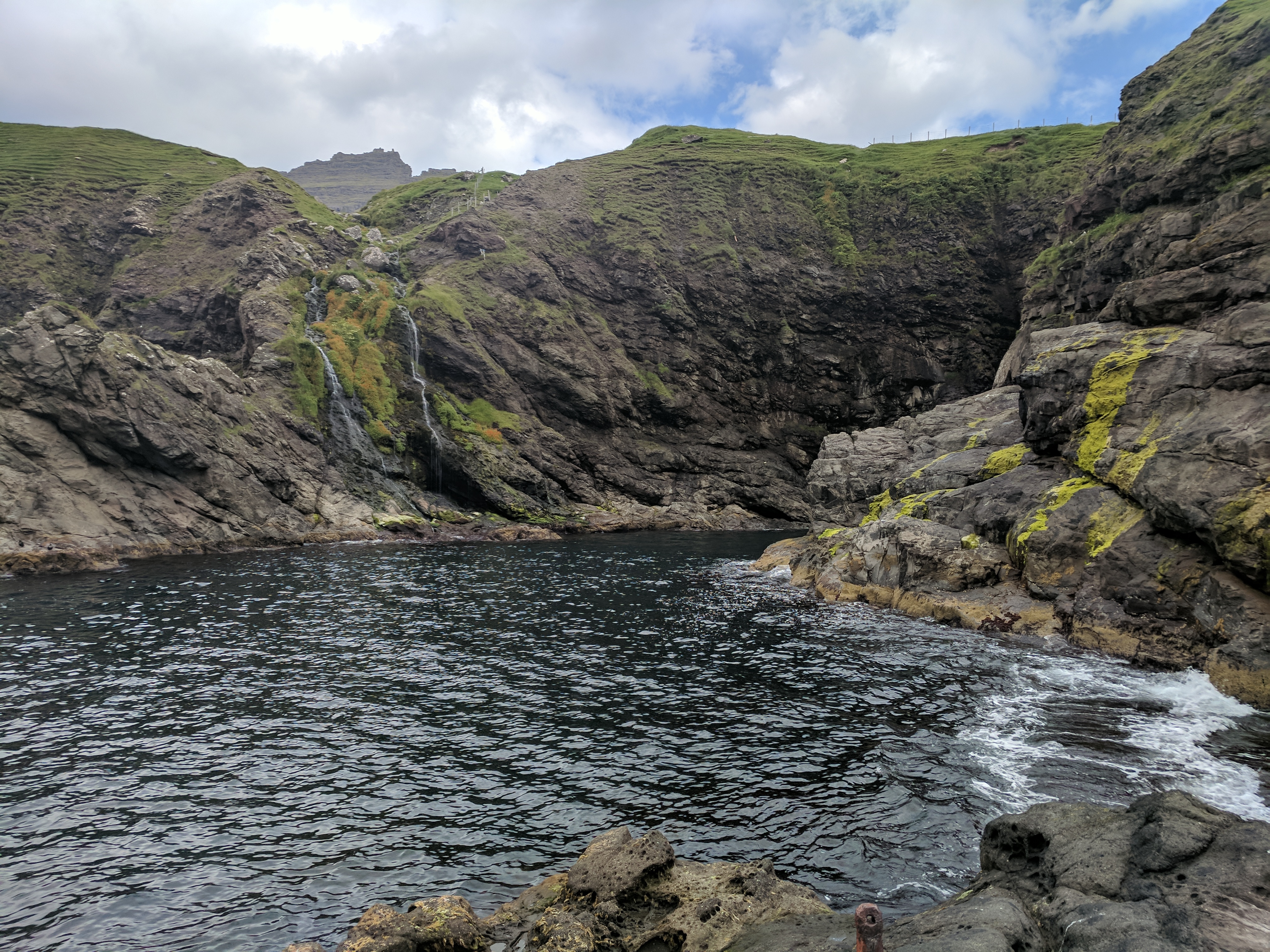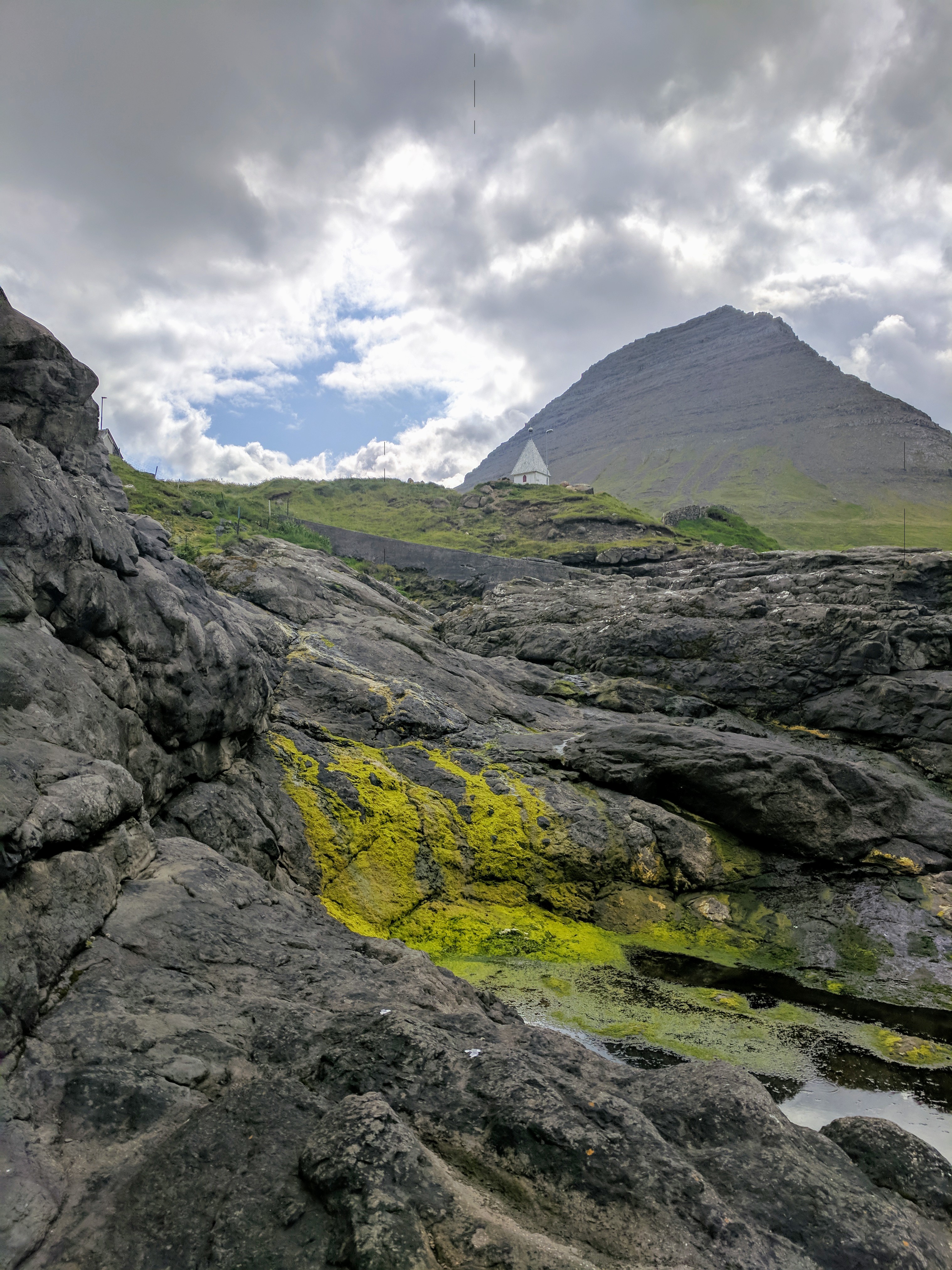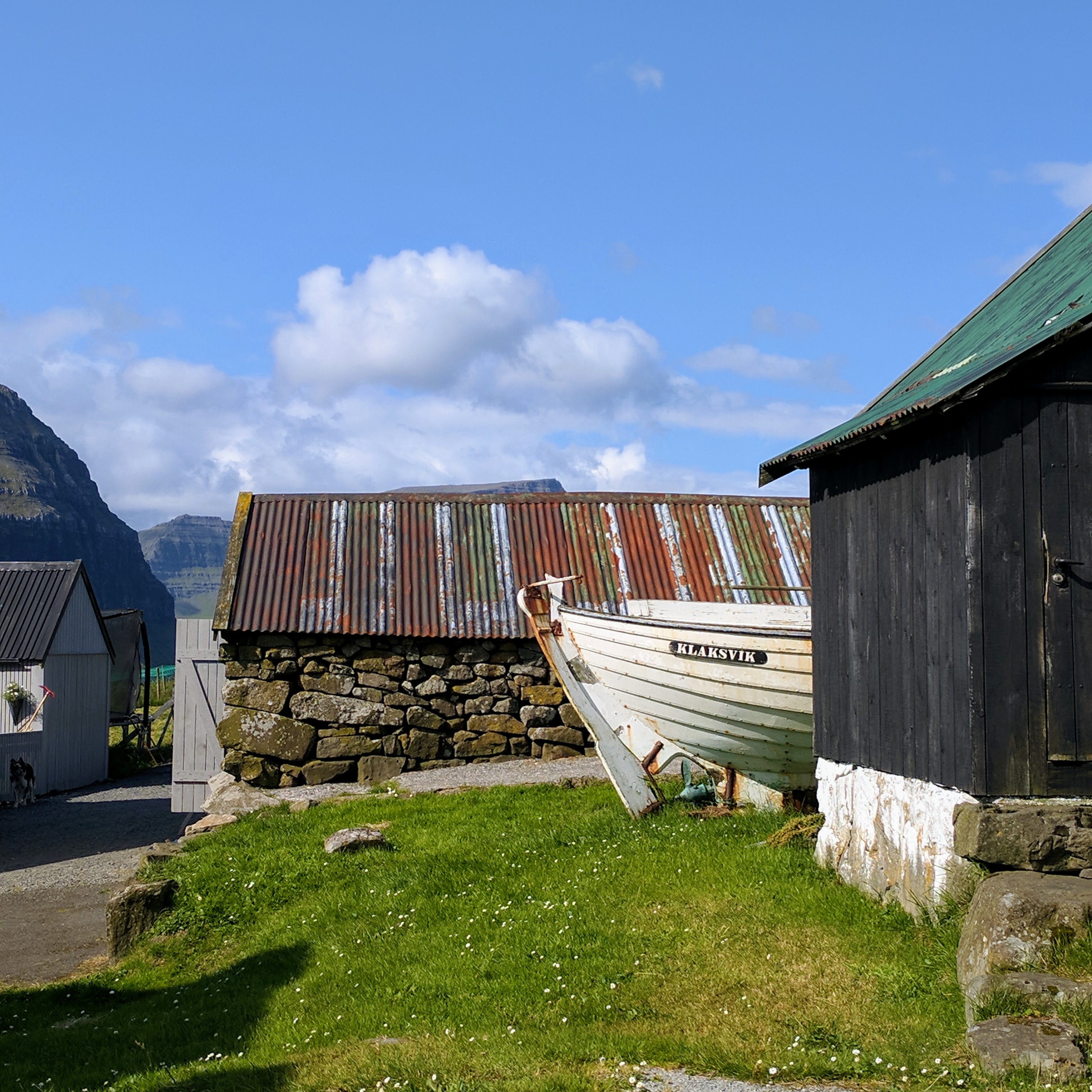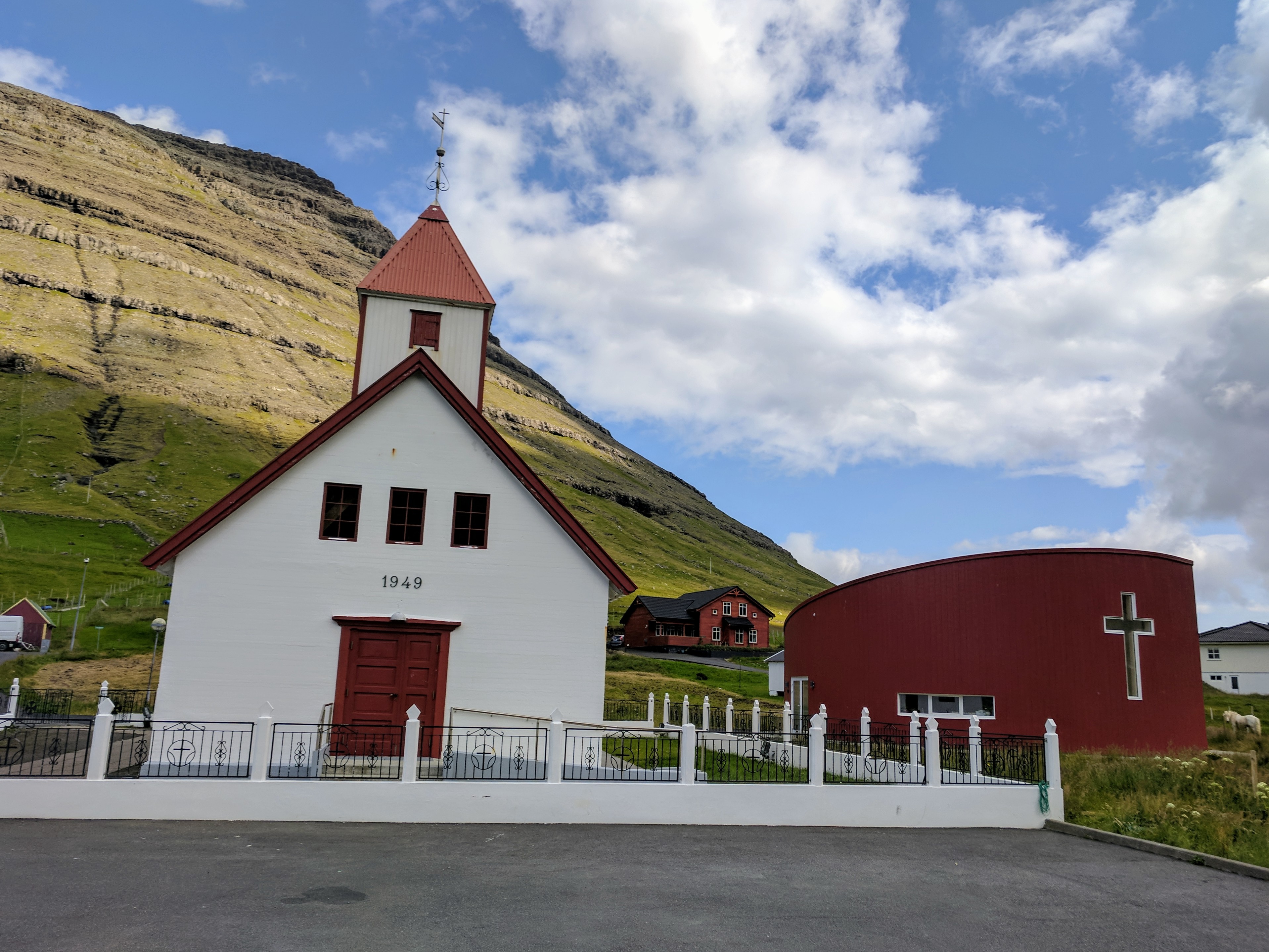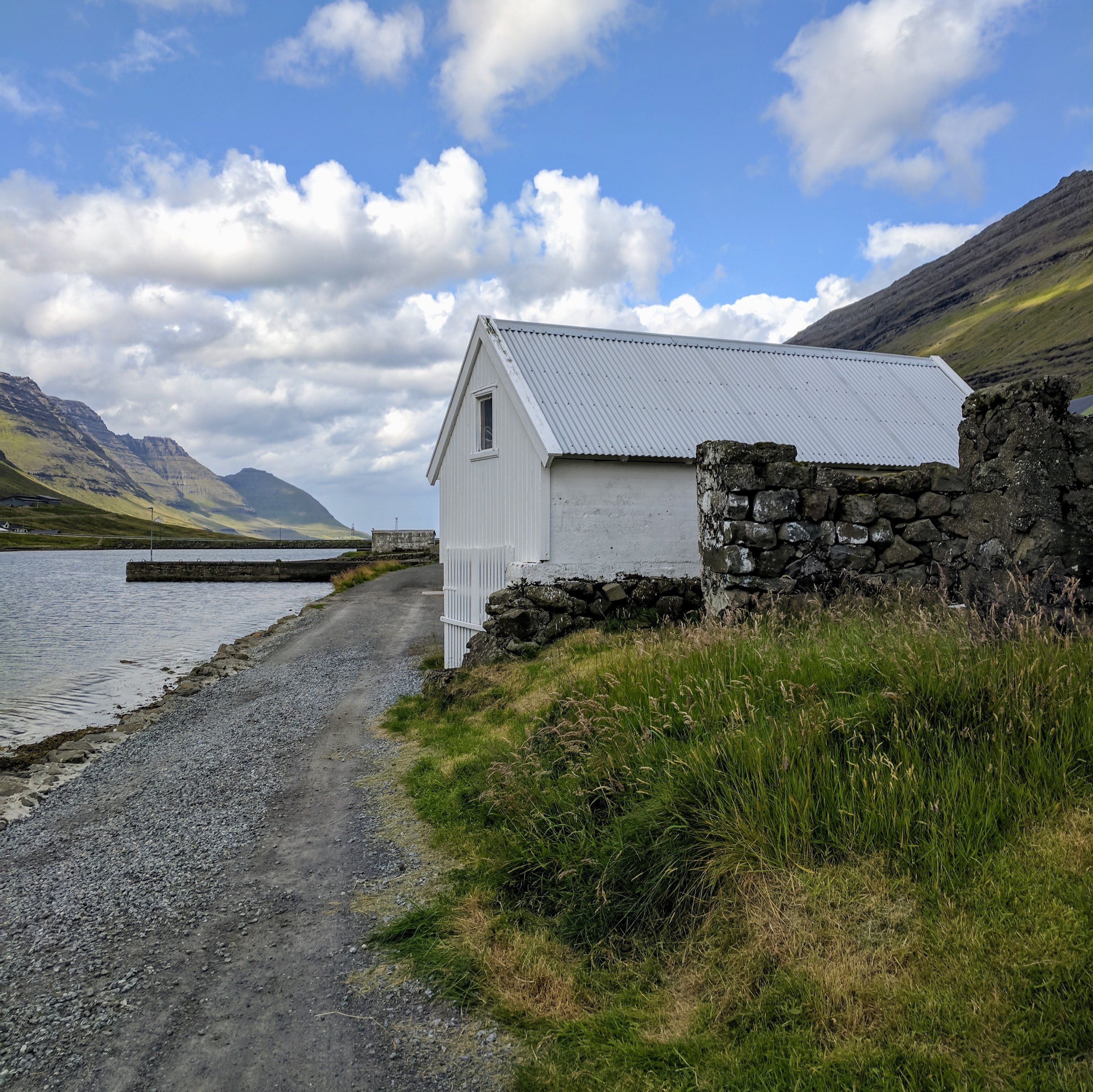 The tunnels were worth it, however, to reach the remote villages of Norðdepil and Viðareiði. We spent two nights in an AirBnB cottage with our own personal waterfall in the backyard. There were no restaurants on that side of the tunnels, so we made do with canned mackerel, cheese, bread & potatoes. The second night we had seafood cocktail and vegetable medley, compliments of a Klaksvik grocery. We had comfortably embraced Faroese cuisine at this point. Across the water in the neighboring village of Hvannasund, we were delighted to find an old one room school turned into a cozy cafe. In such a remote area, Cafe Old School’s rhubarb cake and hot chocolate was enough to send me into rapture! Hvannasund appeared to be in the early stages of development, with a new walkway being built along the shore and old boat cabins being converted into rental cottages.