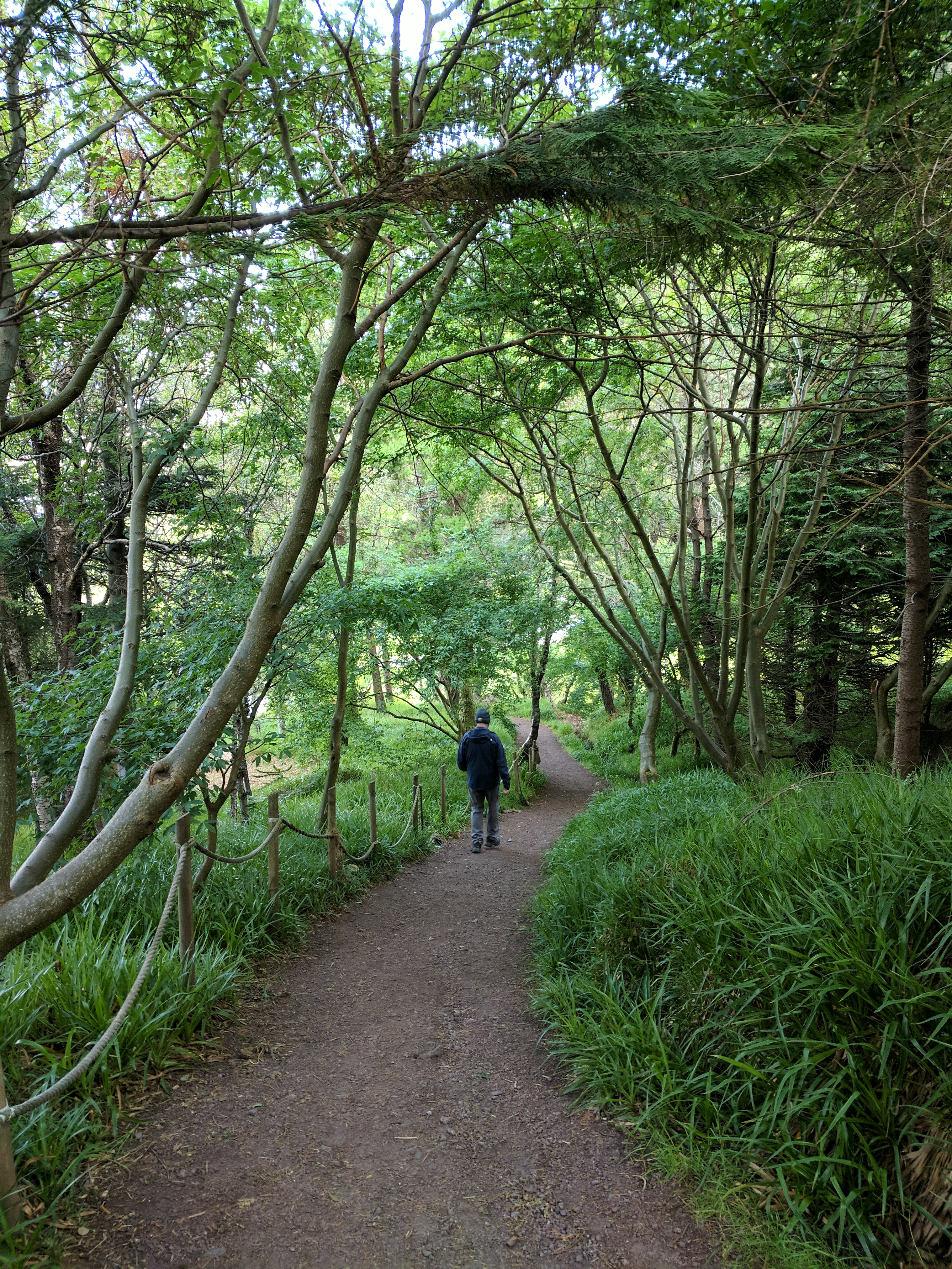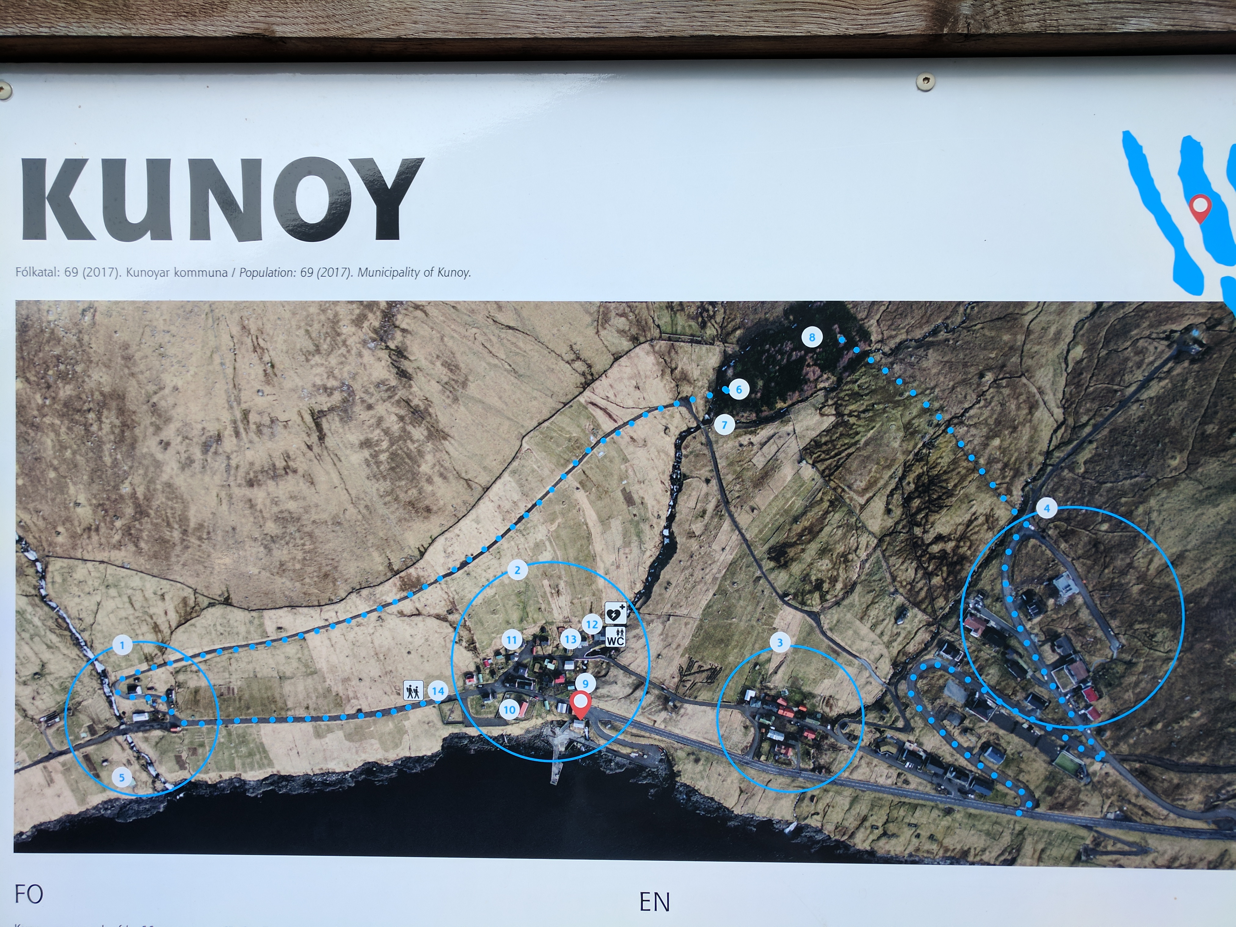 To reach Kunoy Park, find the Kunoy sign in town and park there. Walk up the path that leads to a red 2-story building. There are public restrooms in this building. Look up behind the town and you’ll see the forest. You can drive up the road and park at its entrance, but the road is in terrible shape so be careful.
