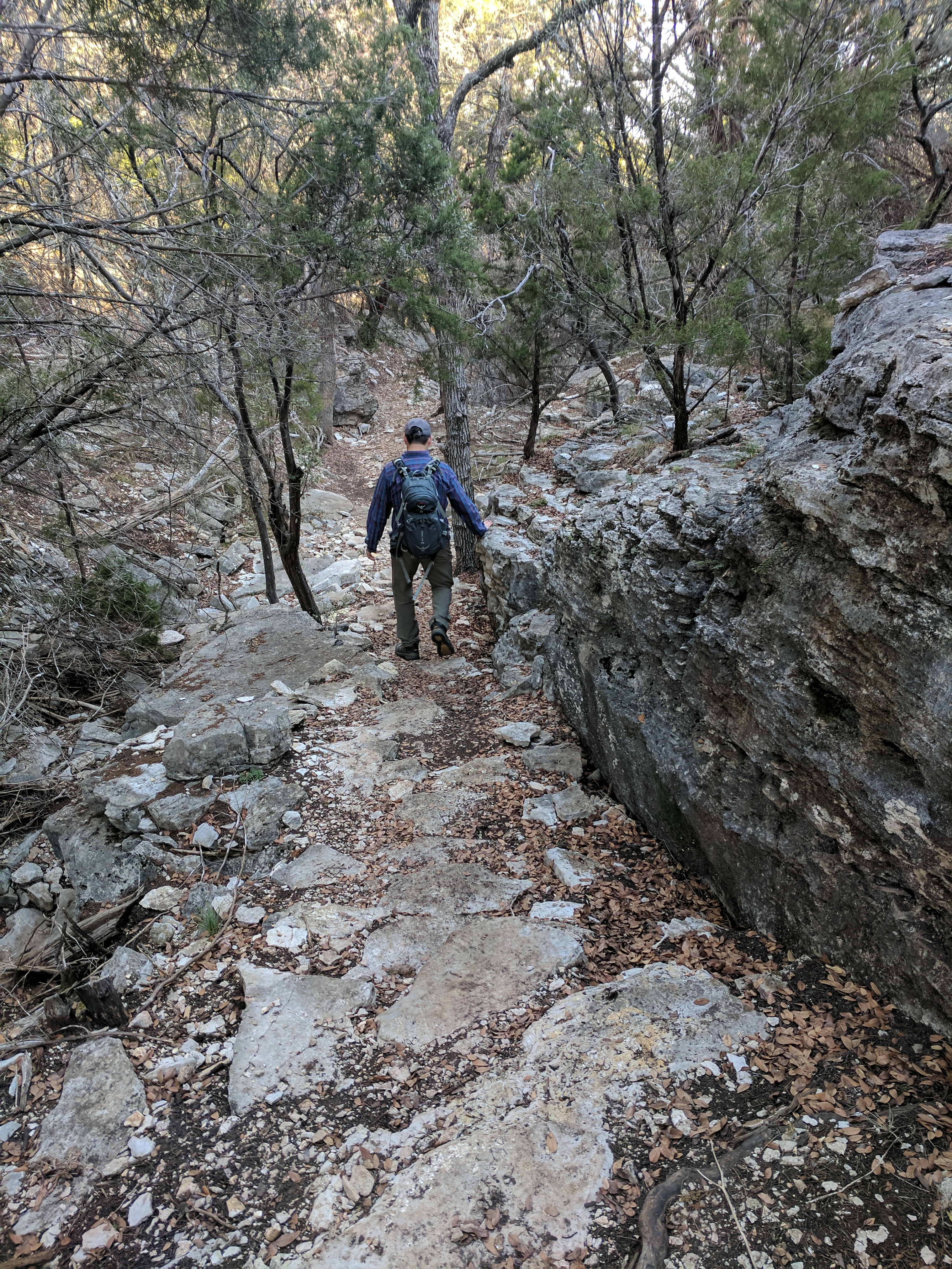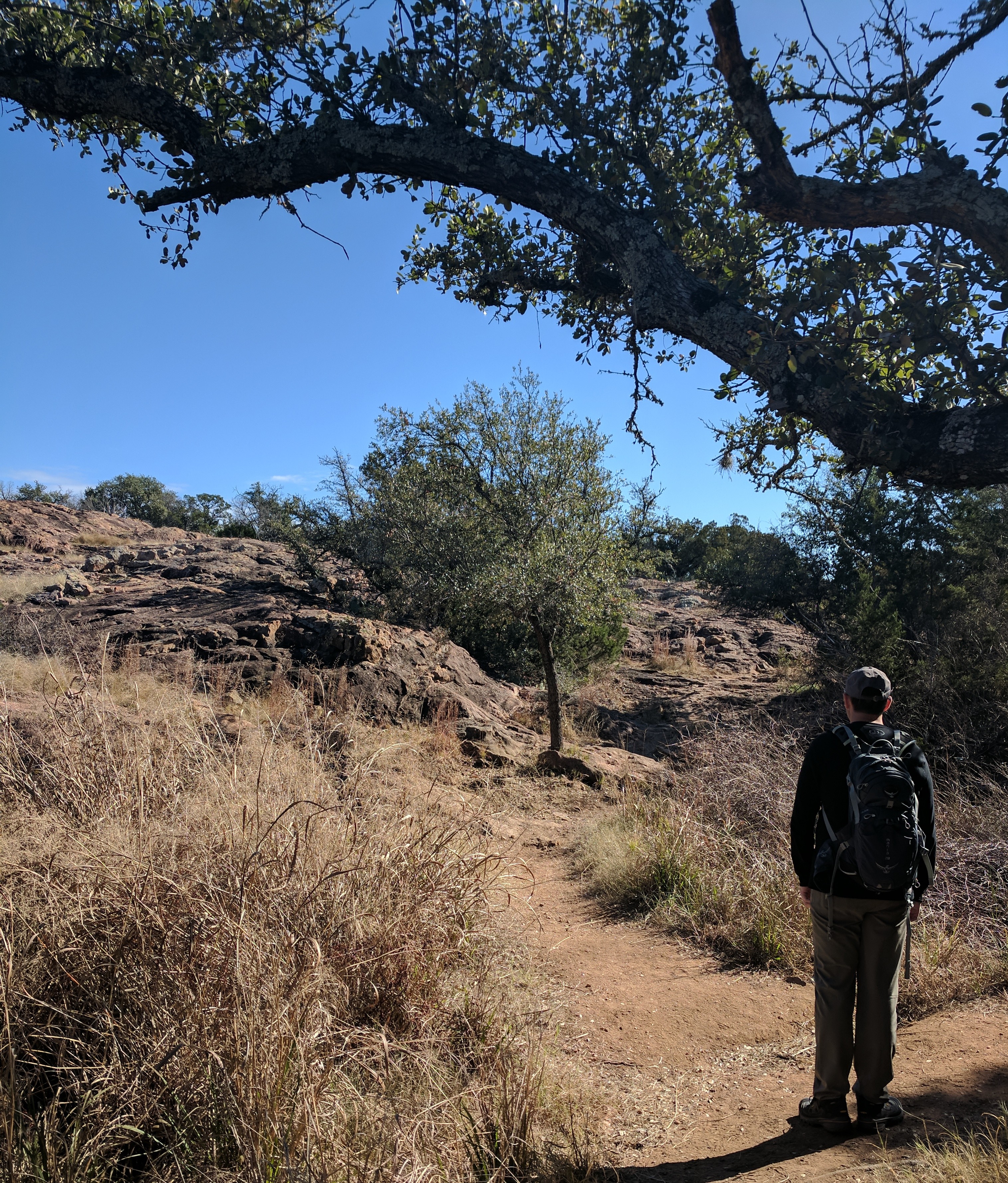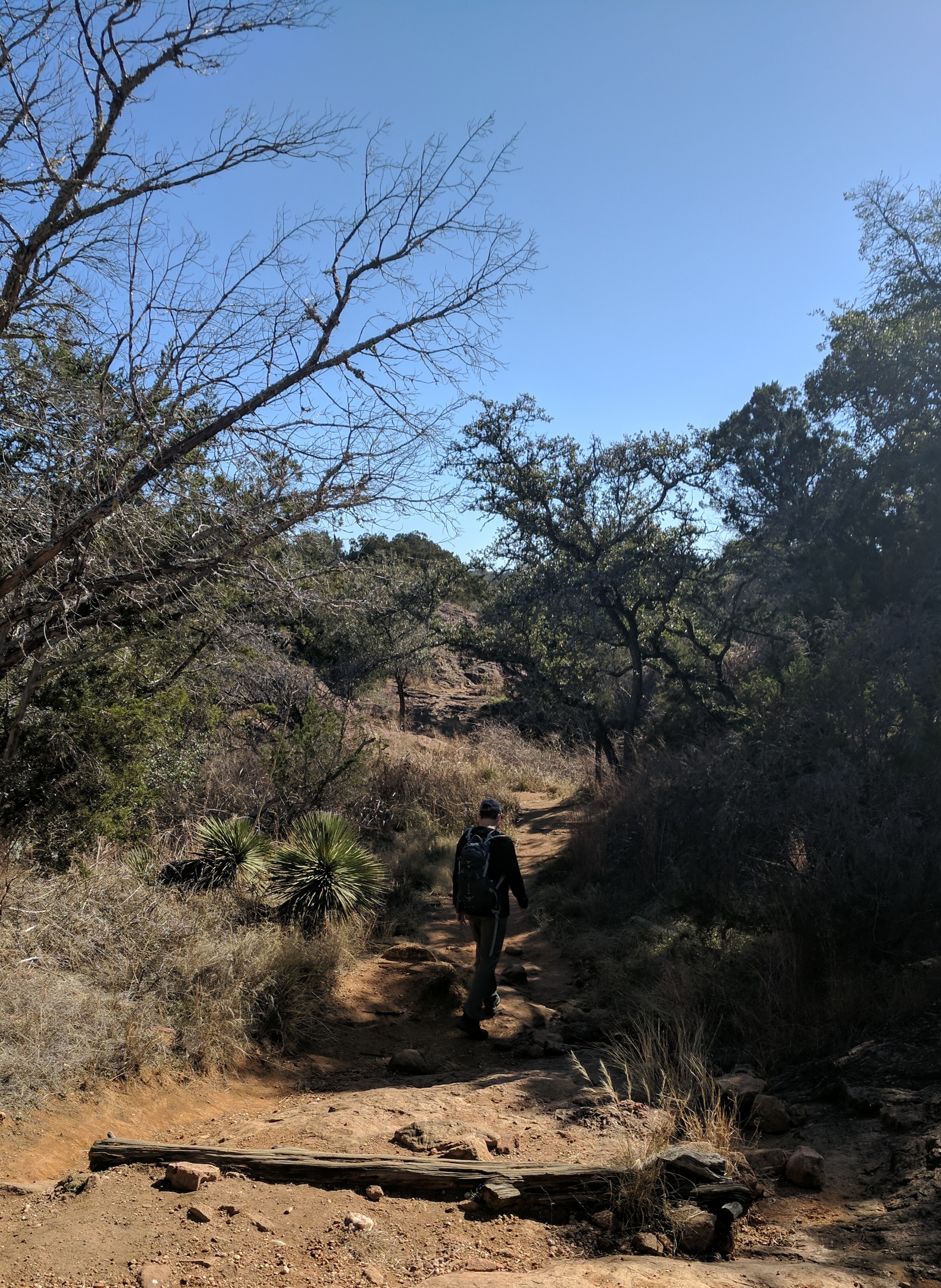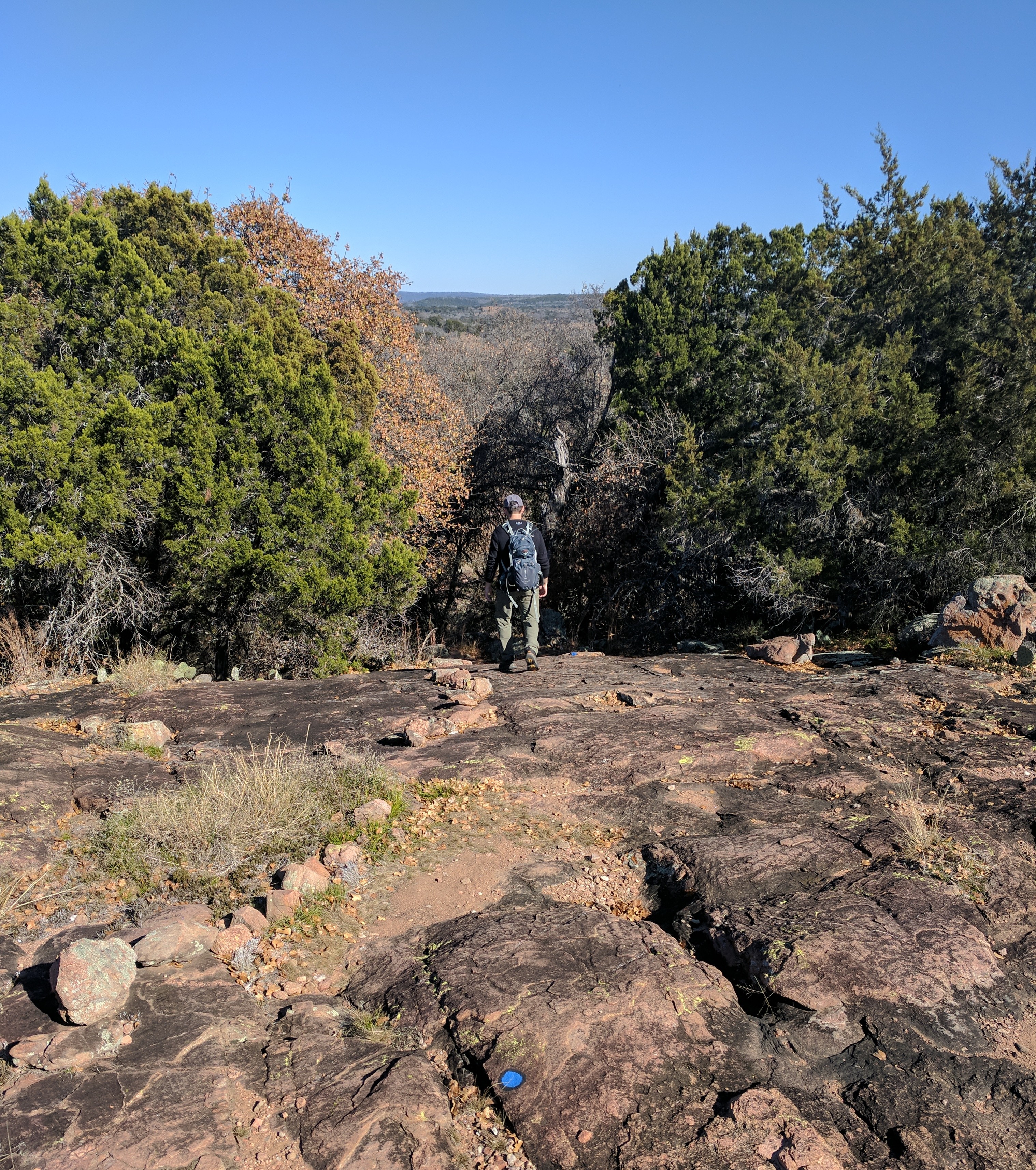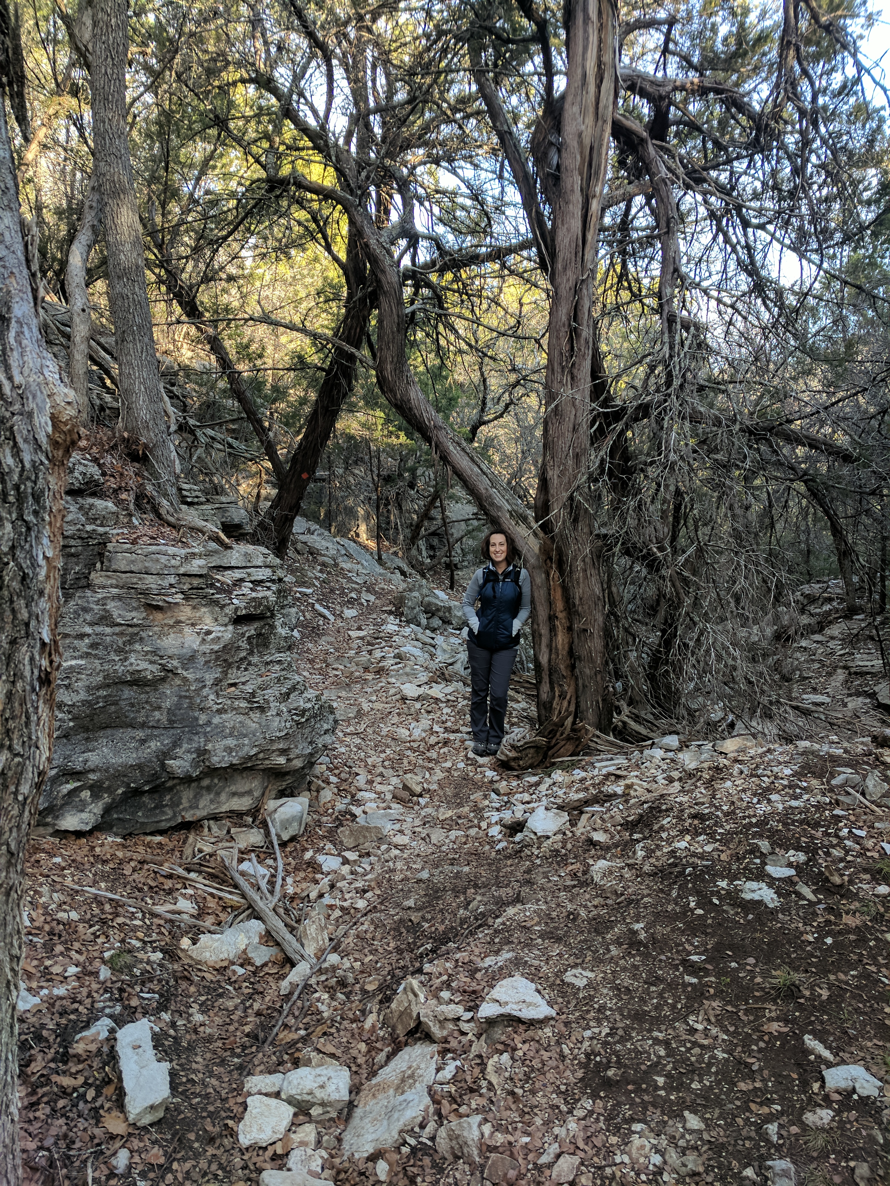 We left Thursday afternoon so we could begin hiking first thing Friday at Inks Lake State Park. [I confess to stopping for a little outlet shopping in Cypress on the way up…a girl’s gotta wear something besides hiking boots, after all.] Inks Lake was an unexpected gem! We lived in Texas for 4 years & never heard of it. Eric discovered it because he was trying to find hiking areas that DON’T allow hunting on weekends in the winter. Hunting IS allowed at this park but only on limited dates. We parked just past the entrance & walked a total of 8 miles, starting on Pecan Flats, then Woodlands, then Lake & finishing with Fisherman’s Trail. While there are really only enough trails to keep you busy for 1 day, we loved these trails because they were so diverse & never boring. [Inks Lake Trail Map]