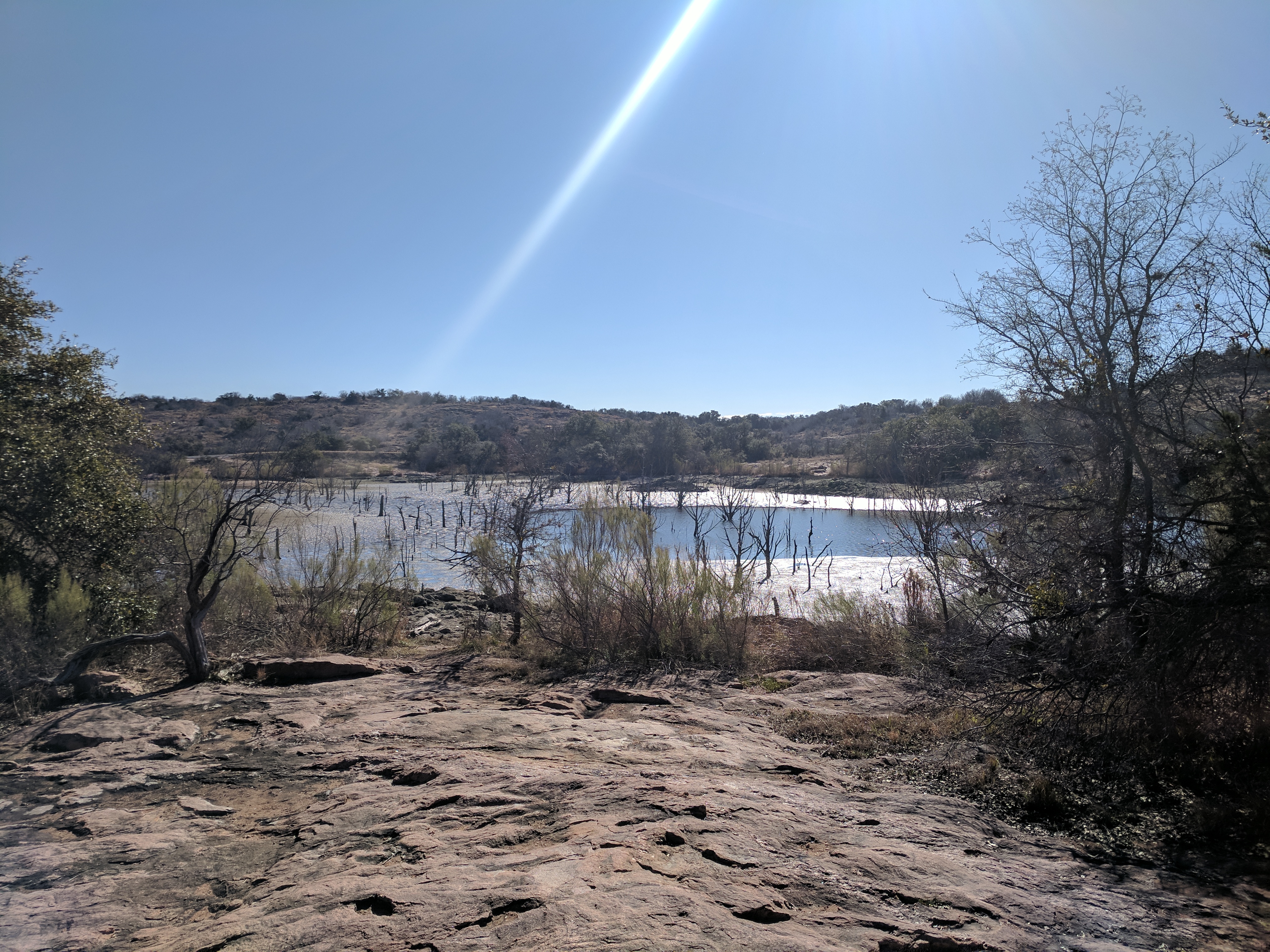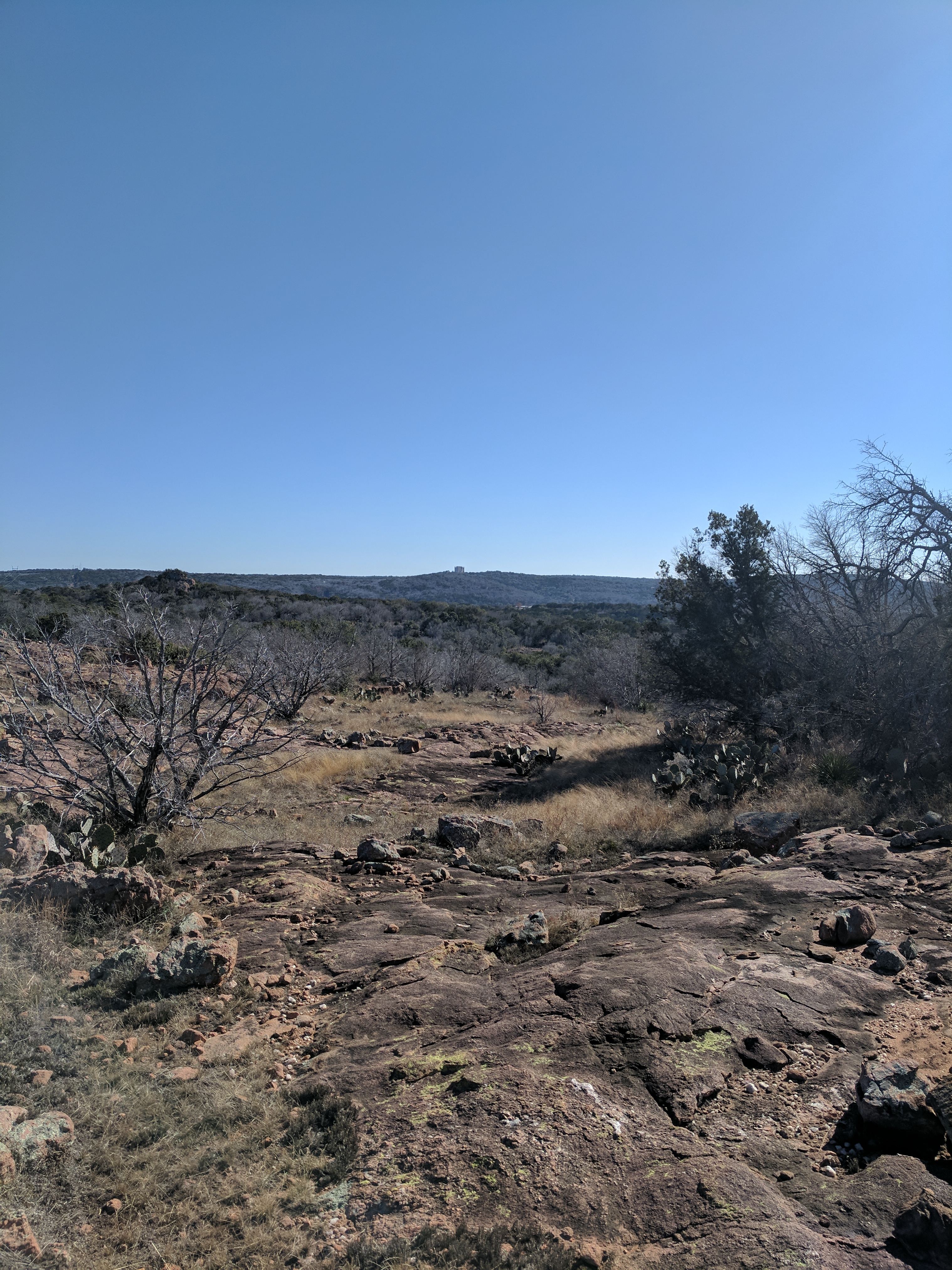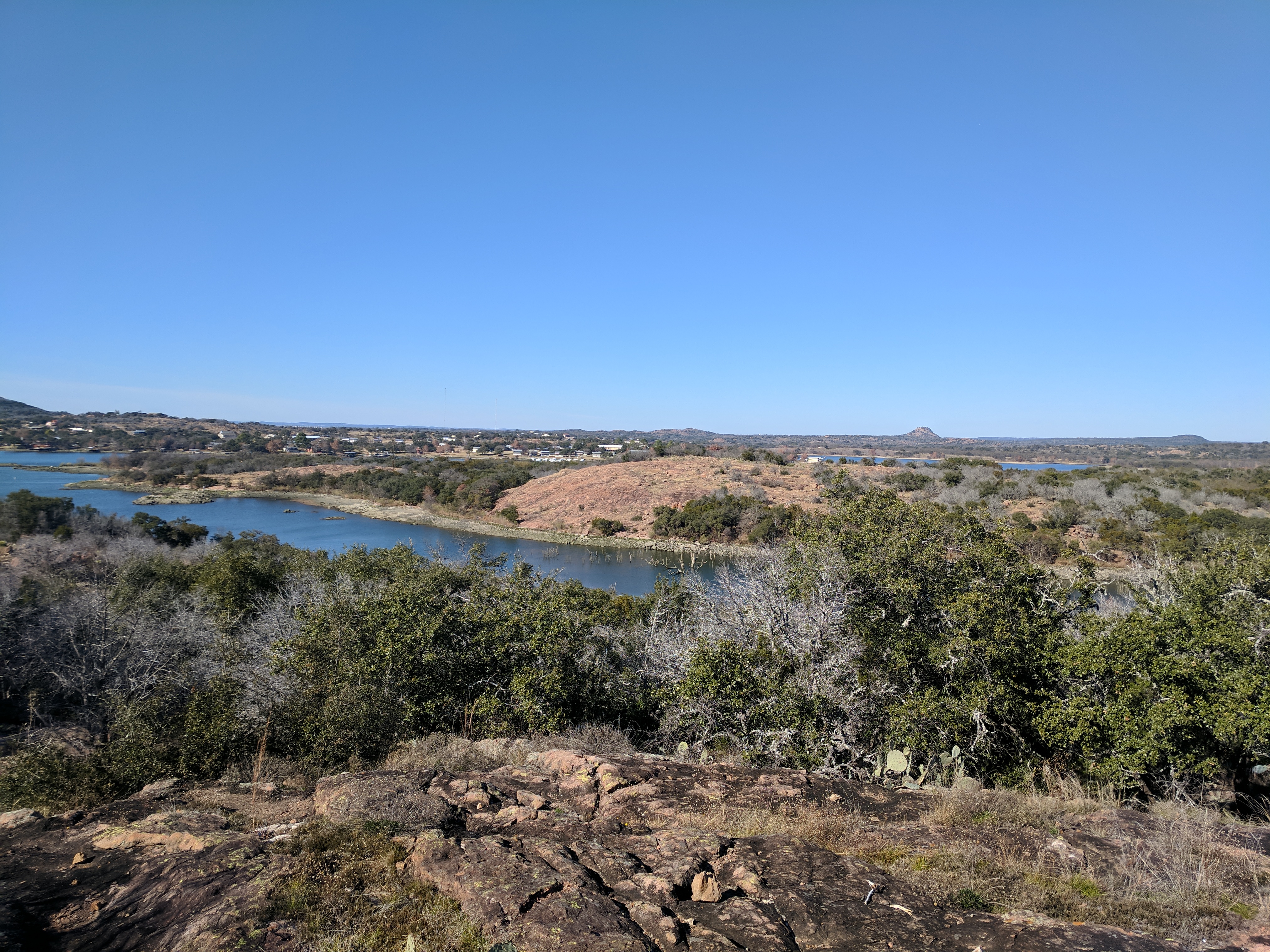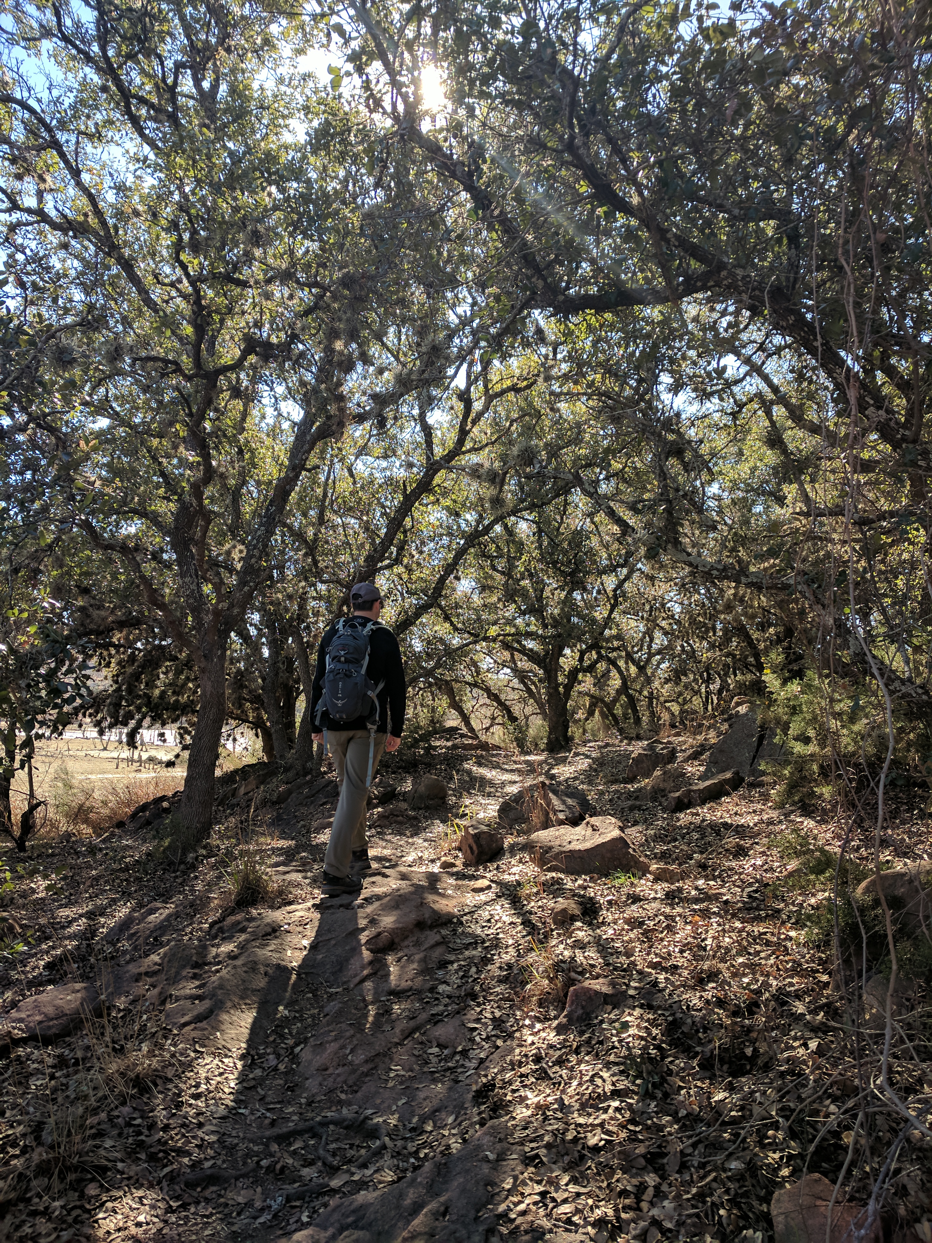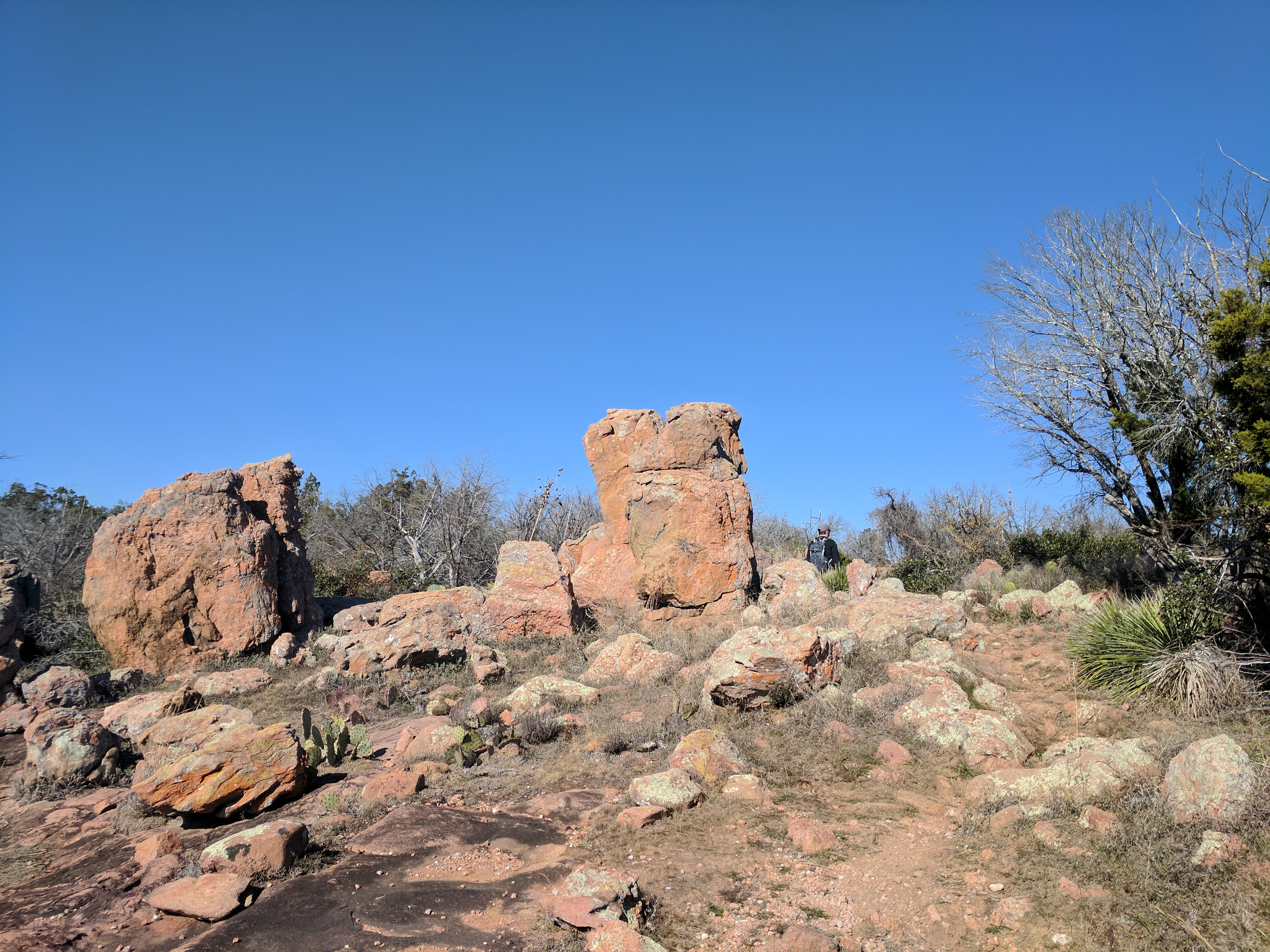We left Thursday afternoon so we could begin hiking first thing Friday at Inks Lake State Park. [I confess to stopping for a little outlet shopping in Cypress on the way up…a girl’s gotta wear something besides hiking boots, after all.] Inks Lake was an unexpected gem! We lived in Texas for 4 years & never heard of it. Eric discovered it because he was trying to find hiking areas that DON’T allow hunting on weekends in the winter. Hunting IS allowed at this park but only on limited dates. We parked just past the entrance & walked a total of 8 miles, starting on Pecan Flats, then Woodlands, then Lake & finishing with Fisherman’s Trail. While there are really only enough trails to keep you busy for 1 day, we loved these trails because they were so diverse & never boring. [Inks Lake Trail Map]