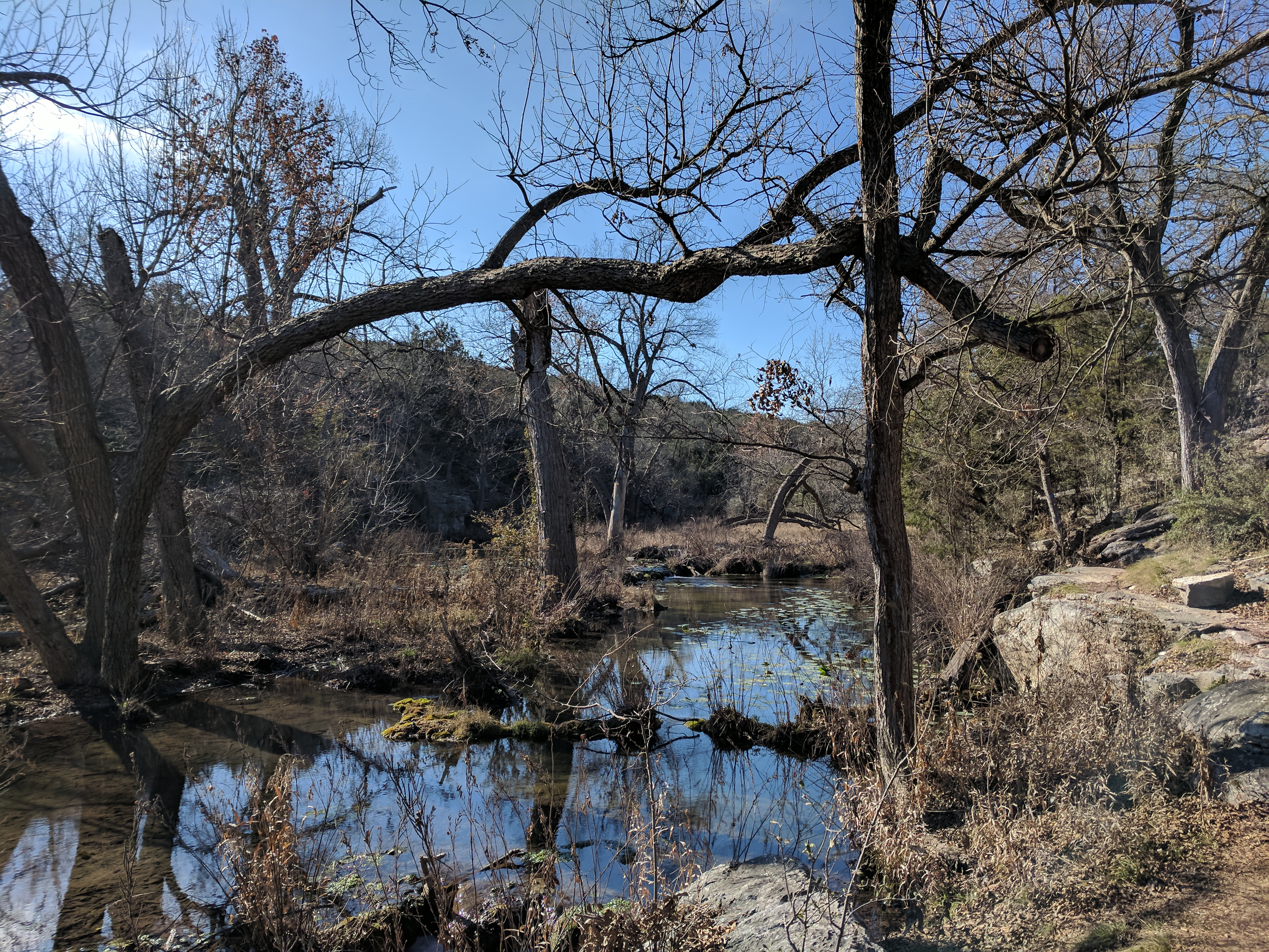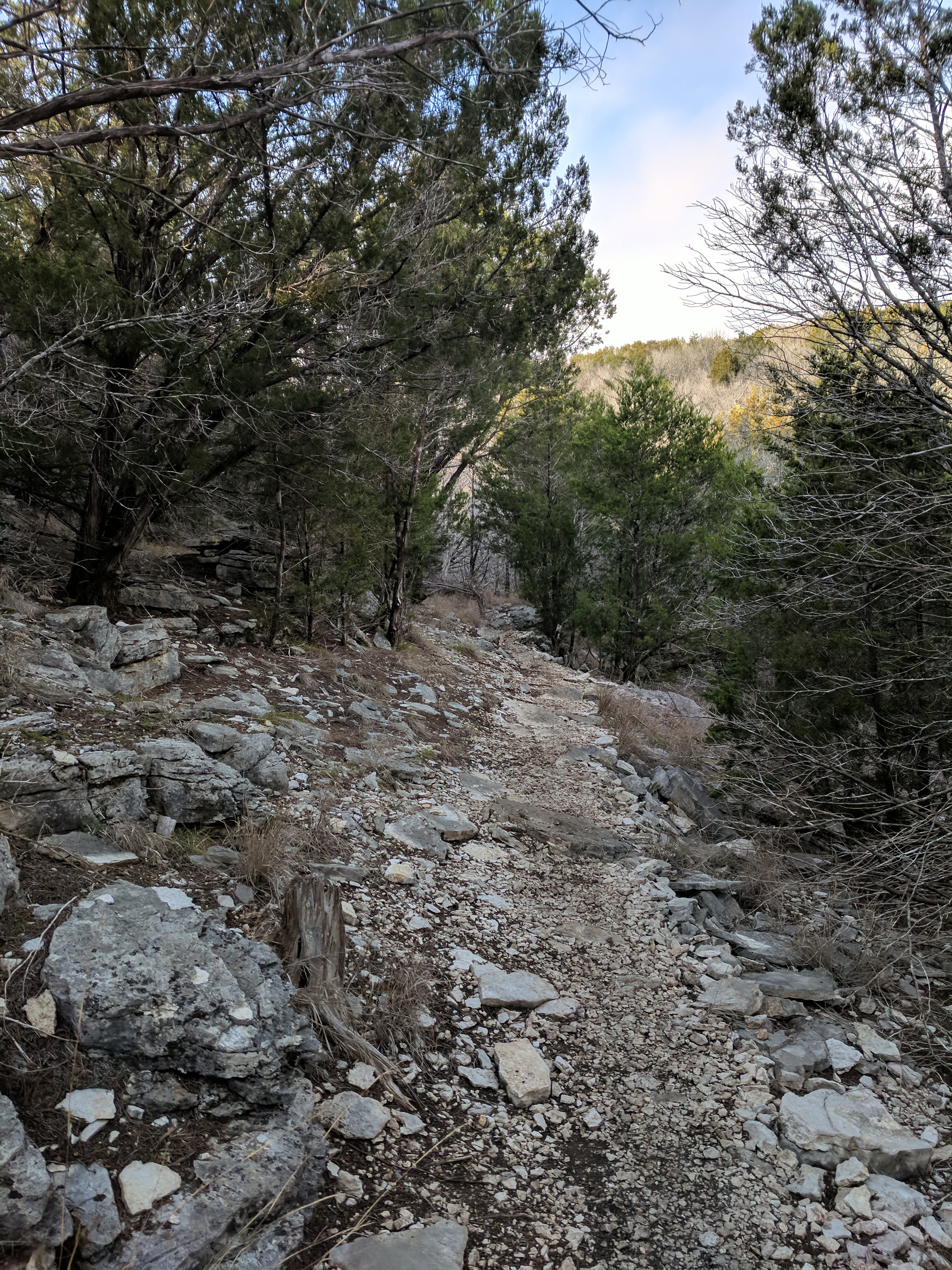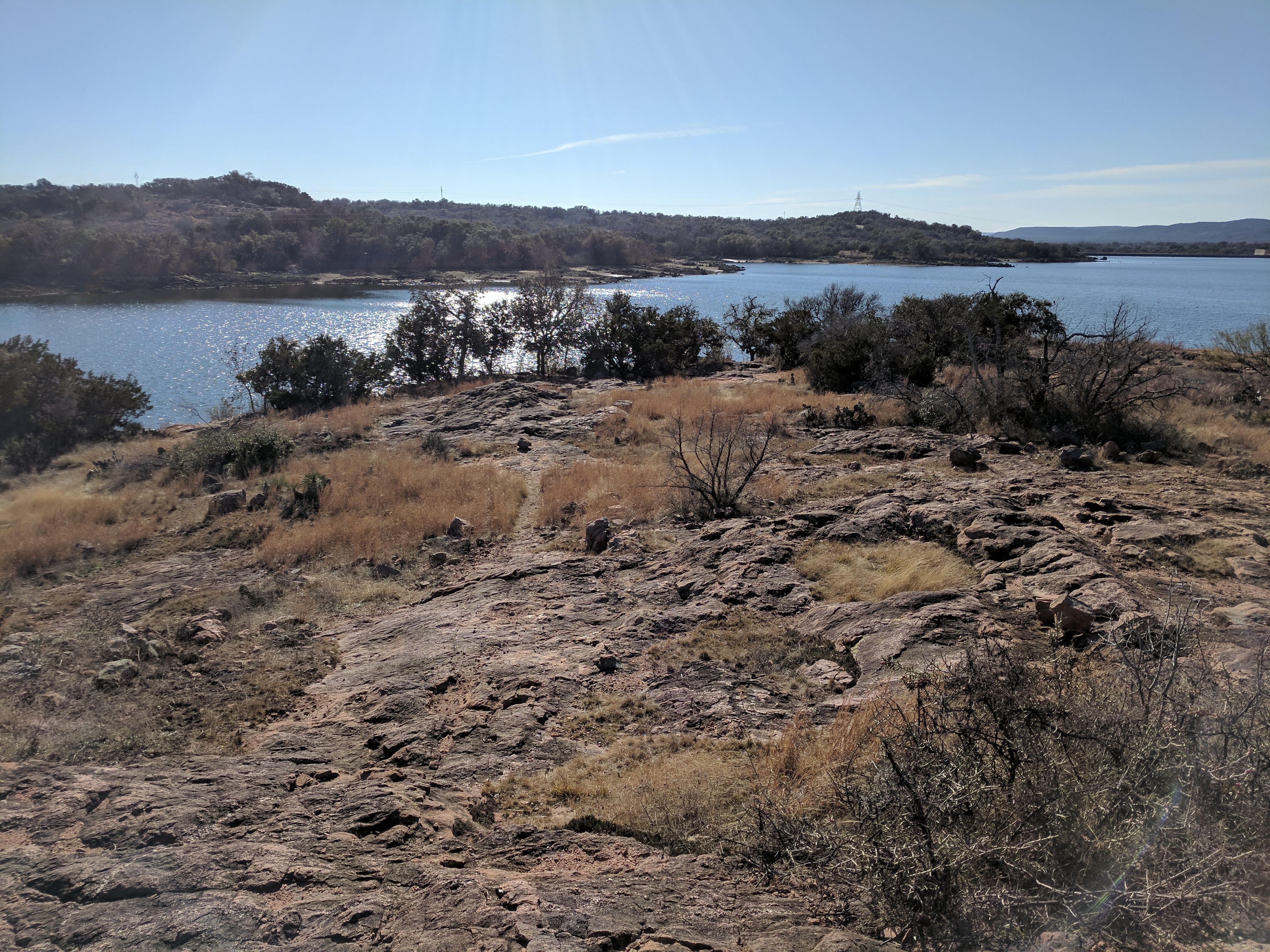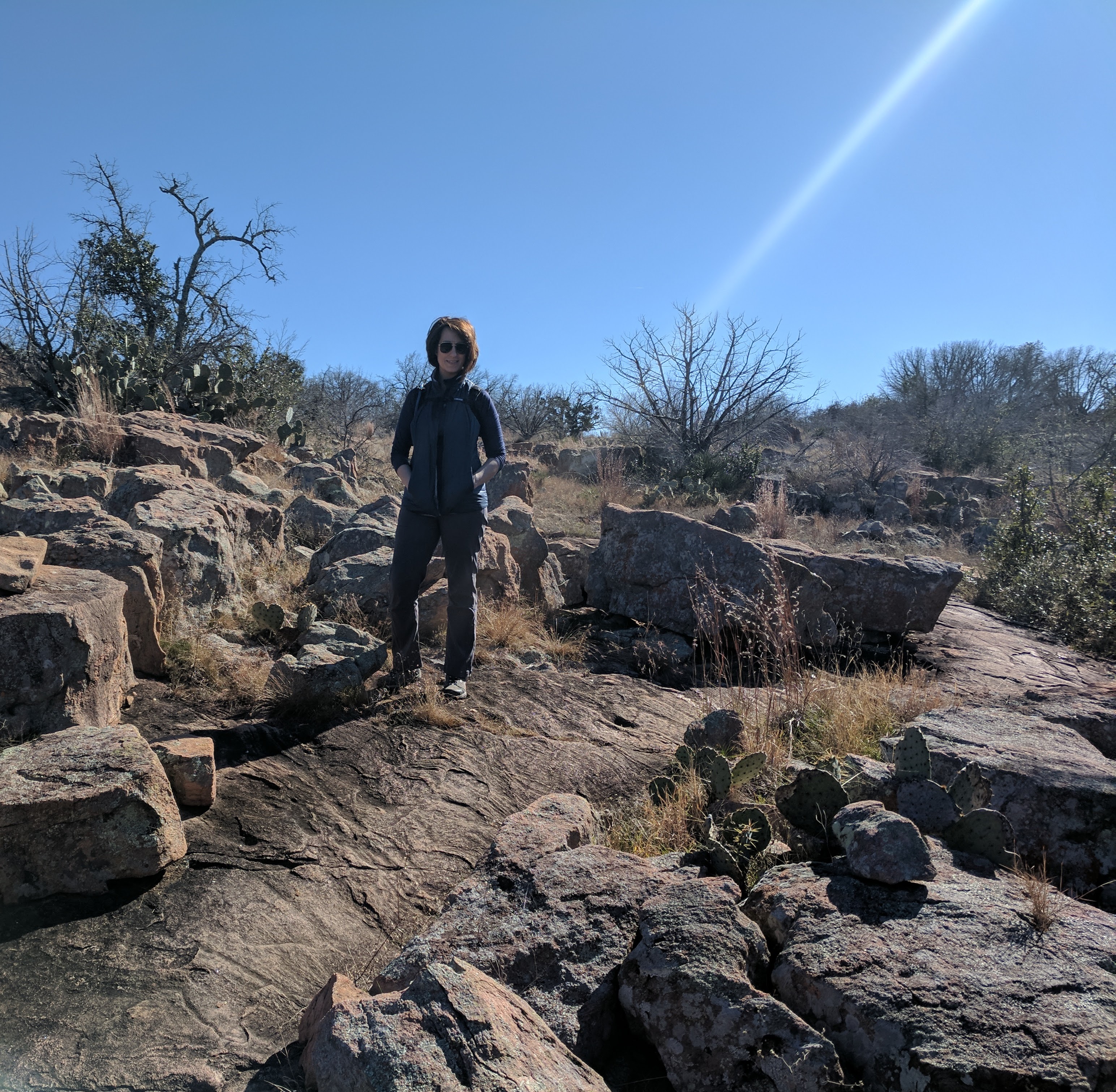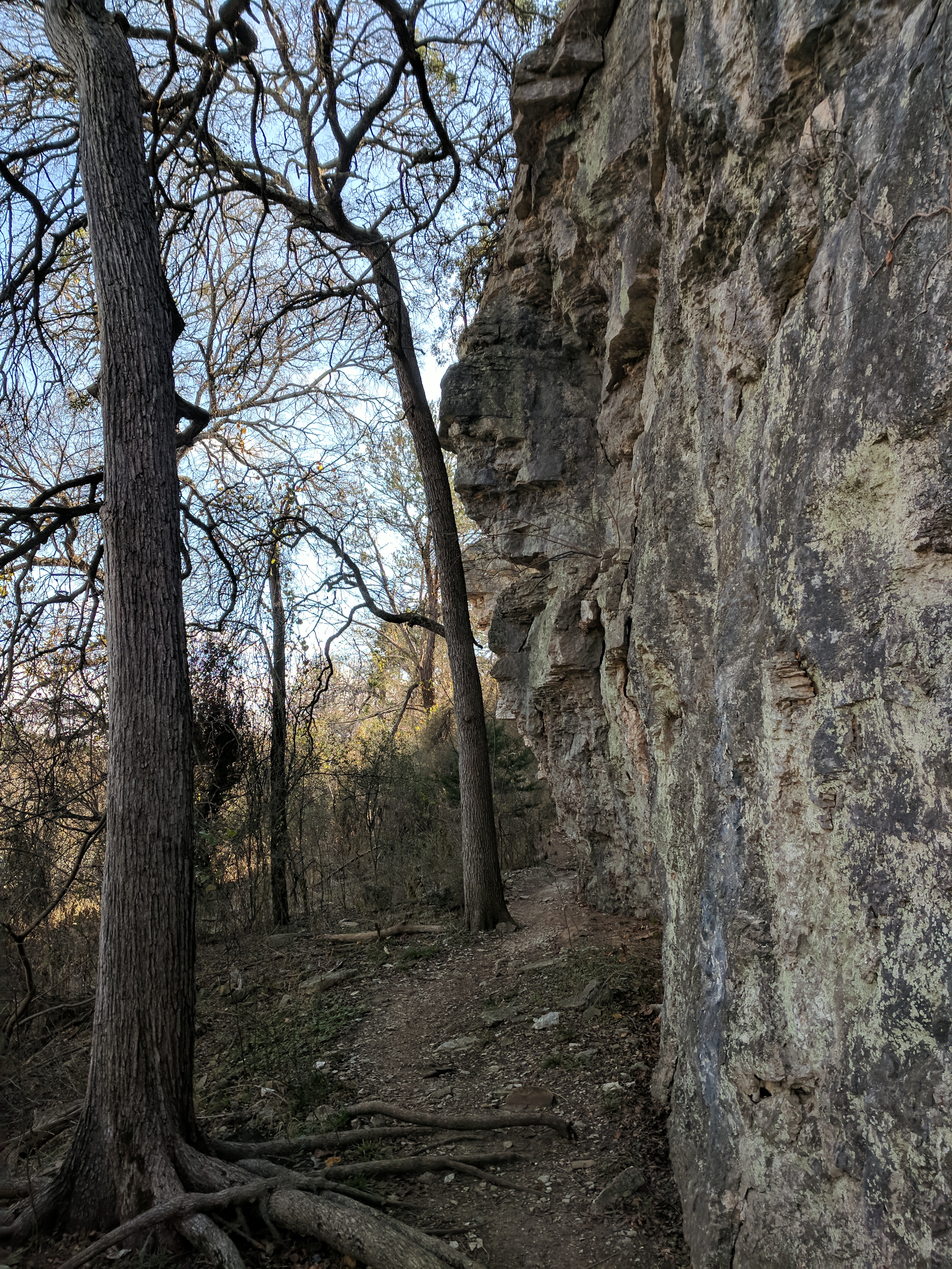 We left Thursday afternoon so we could begin hiking first thing Friday at Inks Lake State Park. [I confess to stopping for a little outlet shopping in Cypress on the way up…a girl’s gotta wear something besides hiking boots, after all.] Inks Lake was an unexpected gem! We lived in Texas for 4 years & never heard of it. Eric discovered it because he was trying to find hiking areas that DON’T allow hunting on weekends in the winter. Hunting IS allowed at this park but only on limited dates. We parked just past the entrance & walked a total of 8 miles, starting on Pecan Flats, then Woodlands, then Lake & finishing with Fisherman’s Trail. While there are really only enough trails to keep you busy for 1 day, we loved these trails because they were so diverse & never boring. [Inks Lake Trail Map]