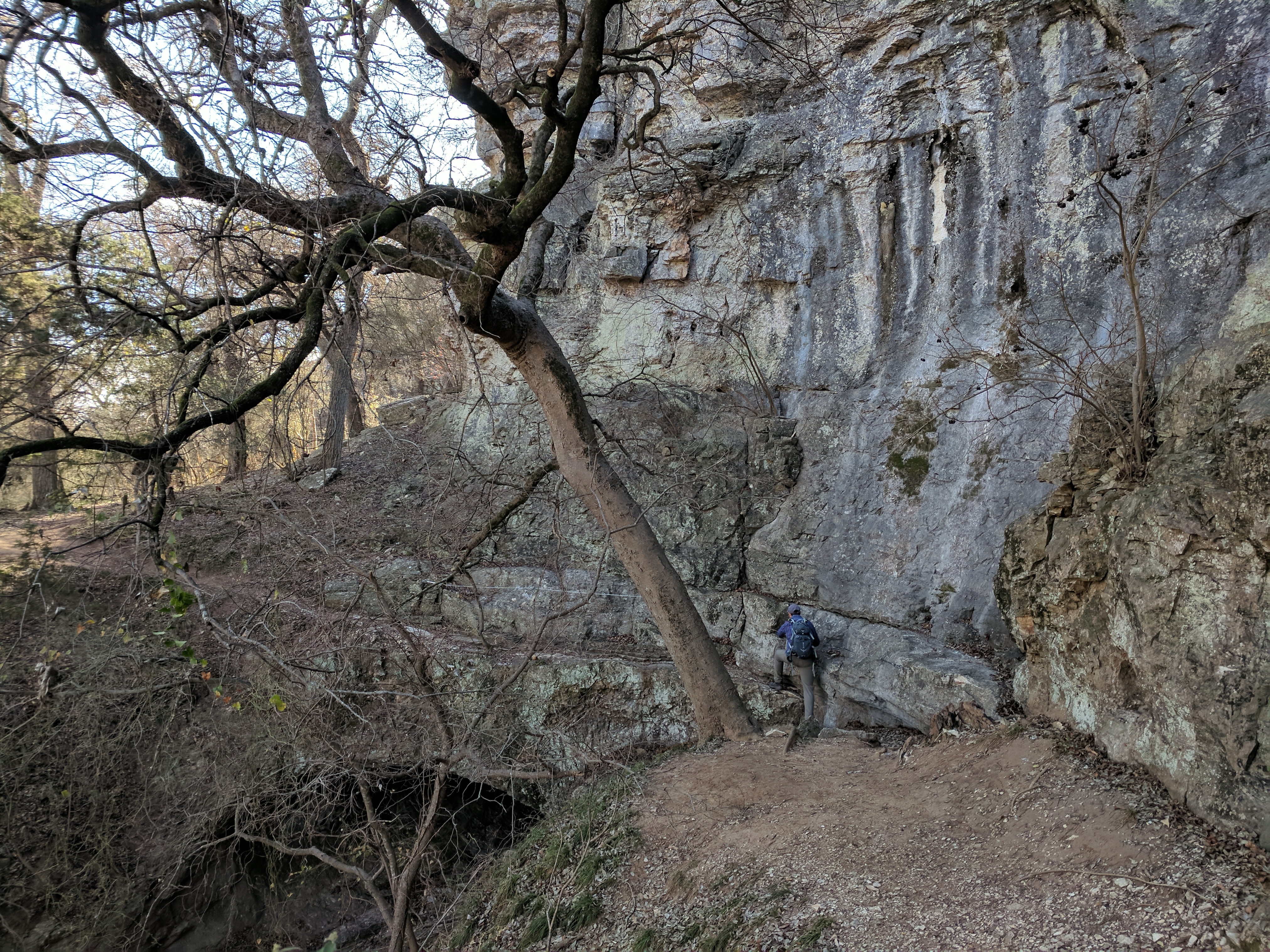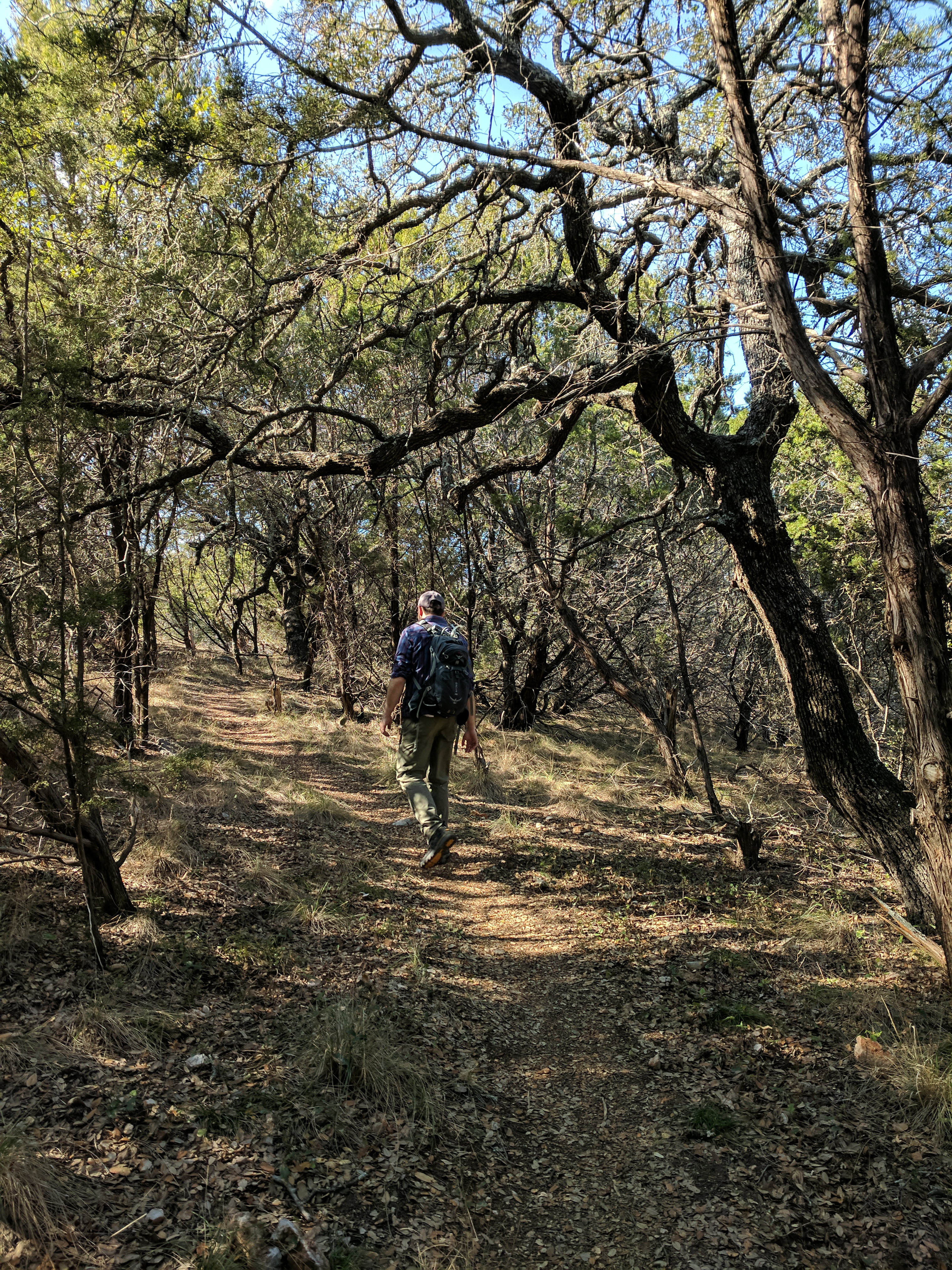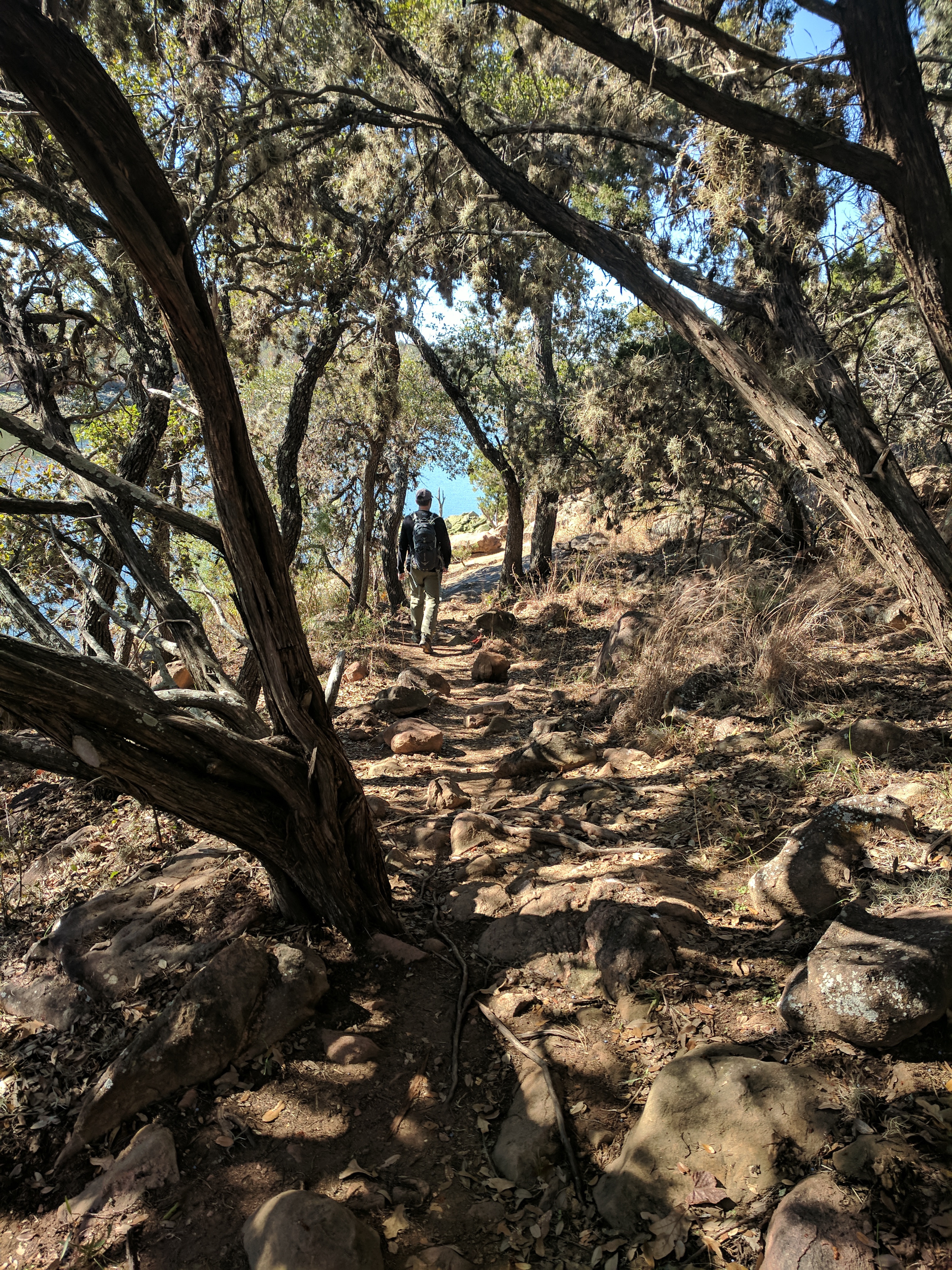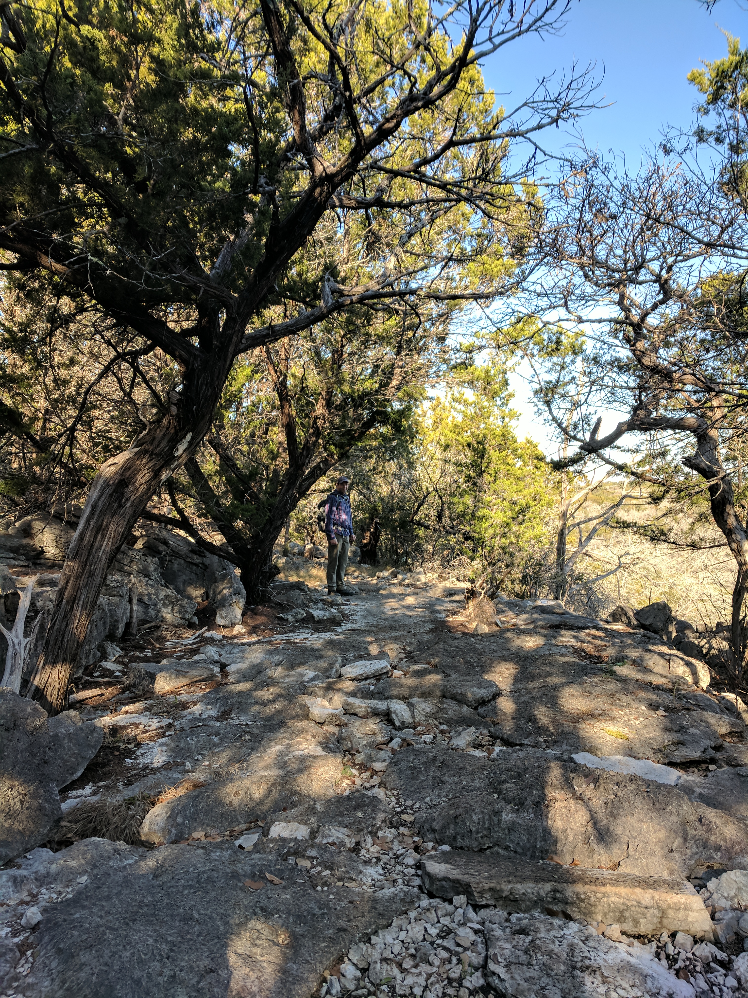 We saved our big hiking for Saturday, since Colorado Bend State Park has over 30 miles worth of trails. You could easily spend 3 days hiking just this park! The trails range from easy to difficult & we found that we preferred the difficult ones because they were MUCH more interesting & some of the “easy” trails actually weren’t that easy. The drive to Colorado Bend doesn’t offer much scenery & the entrance to the park is very unimpressive, but WOW! Once you get on the trail & head deeper into the park, you’ll be amazed at the diverse landscape! We parked at the Cedar Chopper Loop trail entrance & hiked a total of 9 miles that day. The Cedar Chopper Loop had recently undergone a controlled burn, so it wasn’t very pretty, but we were only on it for a short time until we connected to the Tinaja Trail which was AWESOME! The first portion of Tinaja was our favorite, offering crisp white rocky terrain with moderately challenging ups & downs. It really wasn’t a difficult trail unless you have issues with footing — it was a VERY rocky trail. Once you get to the Tinaja bend (to the north rim), it’s less shady (so keep that in mind when you’re planning what time to start your hike & what direction to begin).