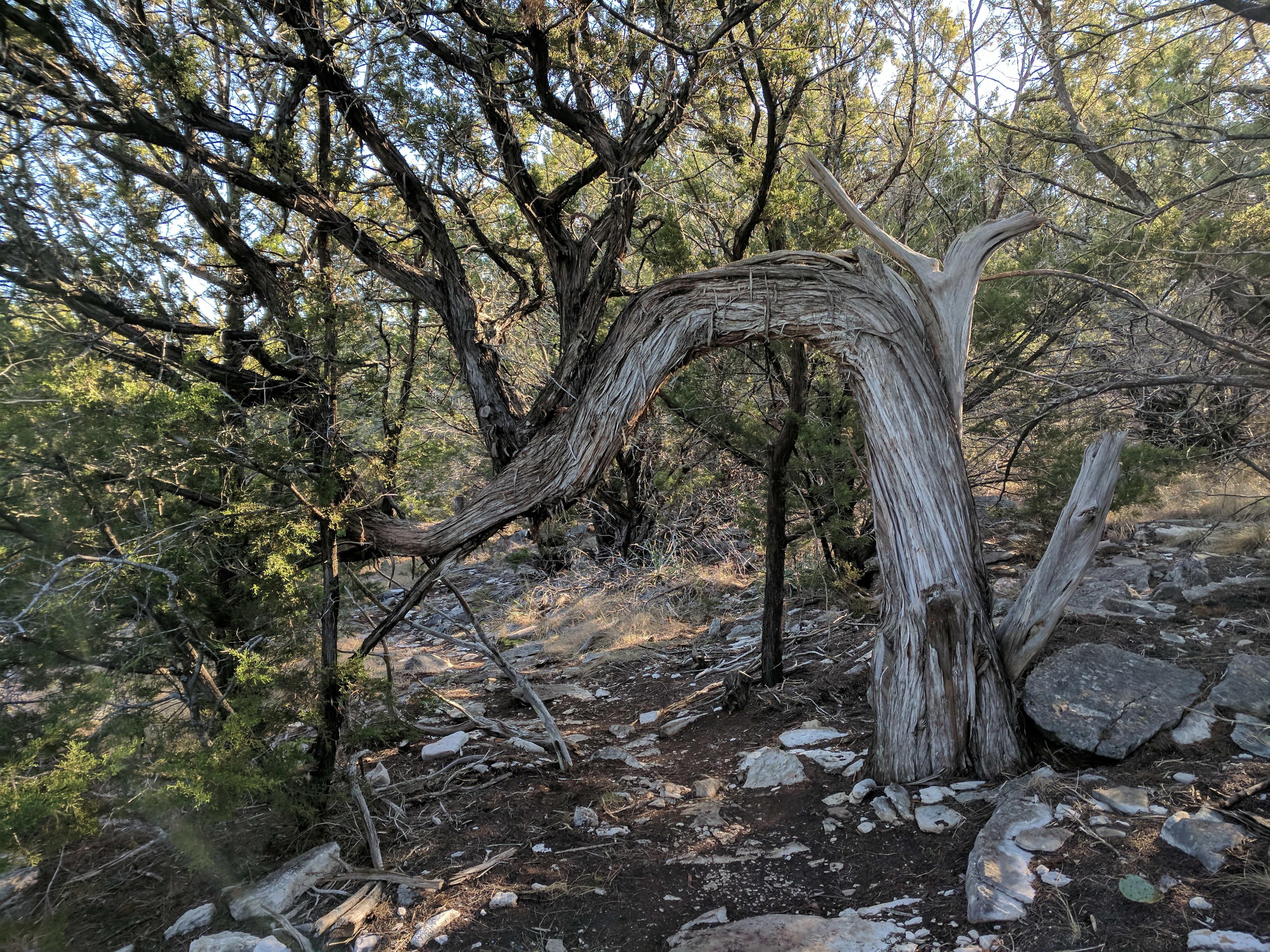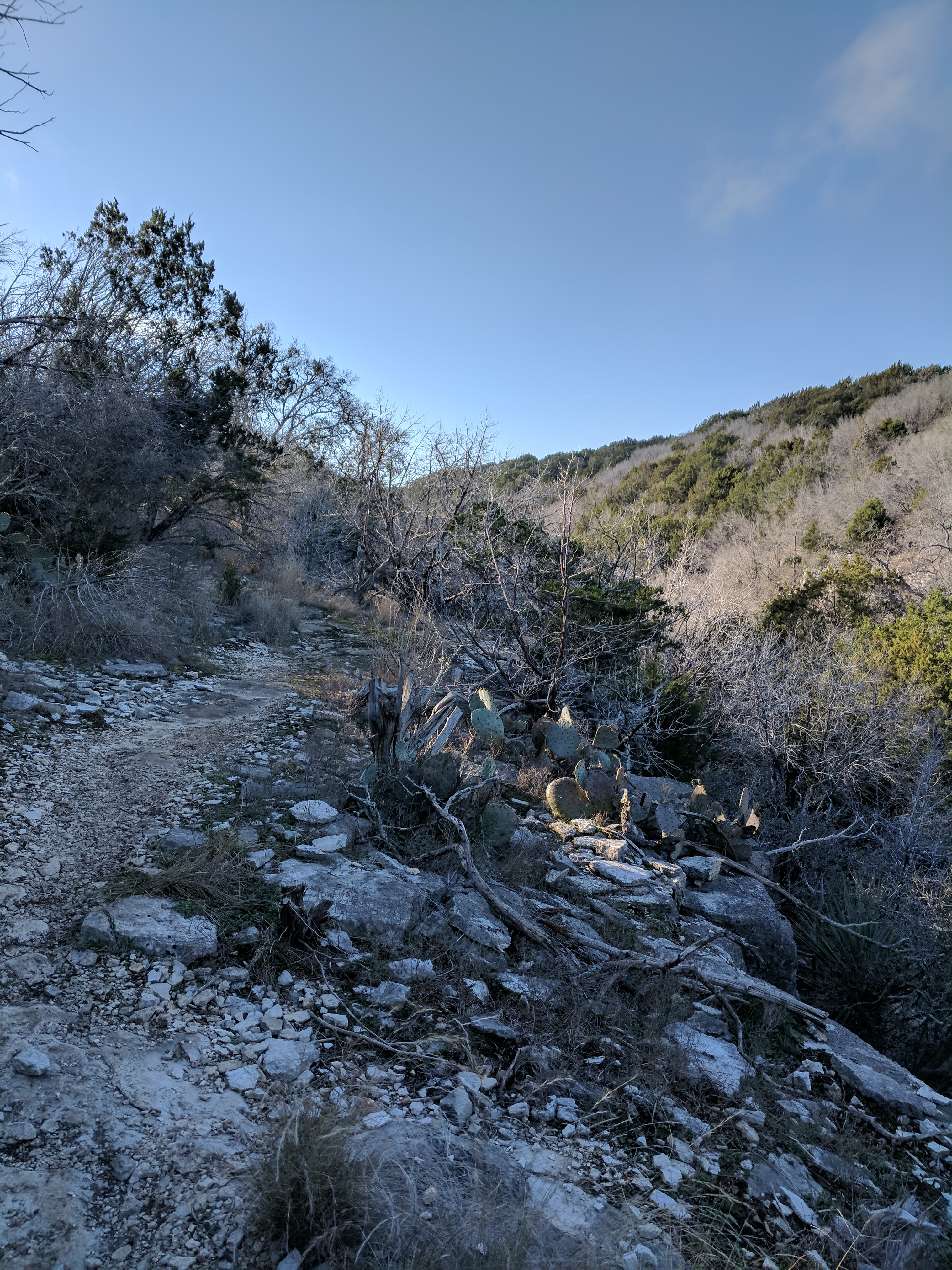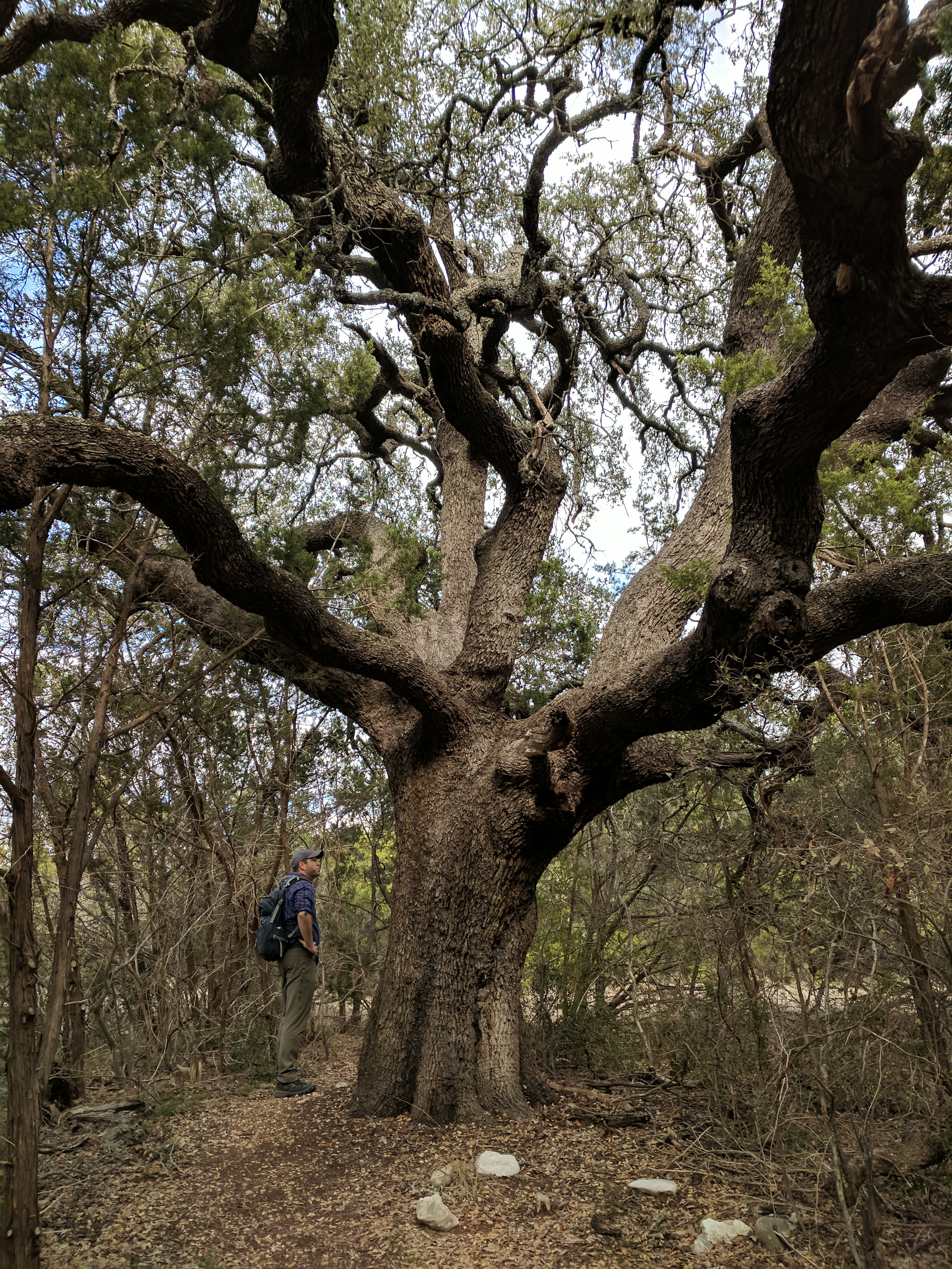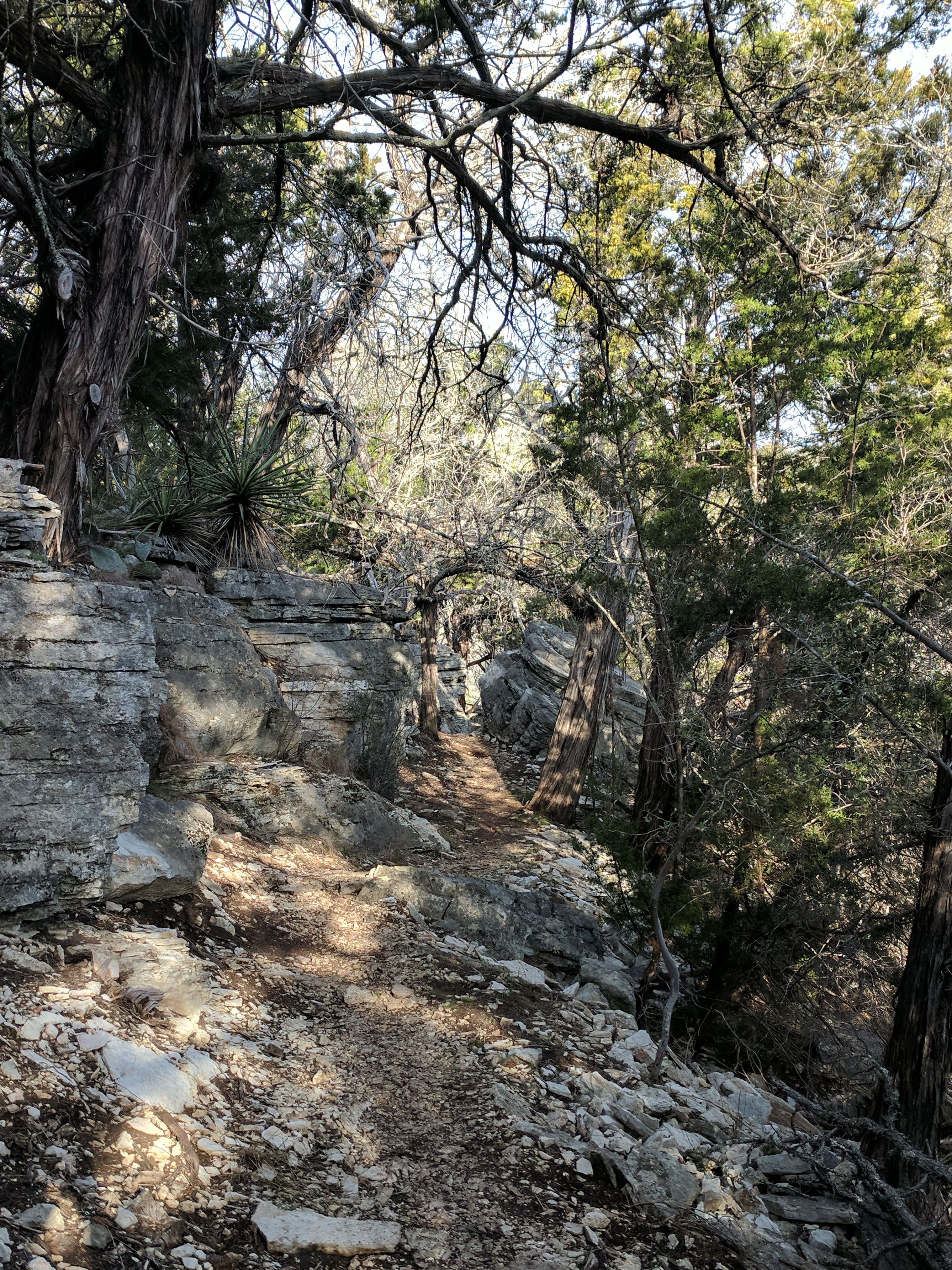 We saved our big hiking for Saturday, since Colorado Bend State Park has over 30 miles worth of trails. You could easily spend 3 days hiking just this park! The trails range from easy to difficult & we found that we preferred the difficult ones because they were MUCH more interesting & some of the “easy” trails actually weren’t that easy. The drive to Colorado Bend doesn’t offer much scenery & the entrance to the park is very unimpressive, but WOW! Once you get on the trail & head deeper into the park, you’ll be amazed at the diverse landscape! We parked at the Cedar Chopper Loop trail entrance & hiked a total of 9 miles that day. The Cedar Chopper Loop had recently undergone a controlled burn, so it wasn’t very pretty, but we were only on it for a short time until we connected to the Tinaja Trail which was AWESOME! The first portion of Tinaja was our favorite, offering crisp white rocky terrain with moderately challenging ups & downs. It really wasn’t a difficult trail unless you have issues with footing — it was a VERY rocky trail. Once you get to the Tinaja bend (to the north rim), it’s less shady (so keep that in mind when you’re planning what time to start your hike & what direction to begin).