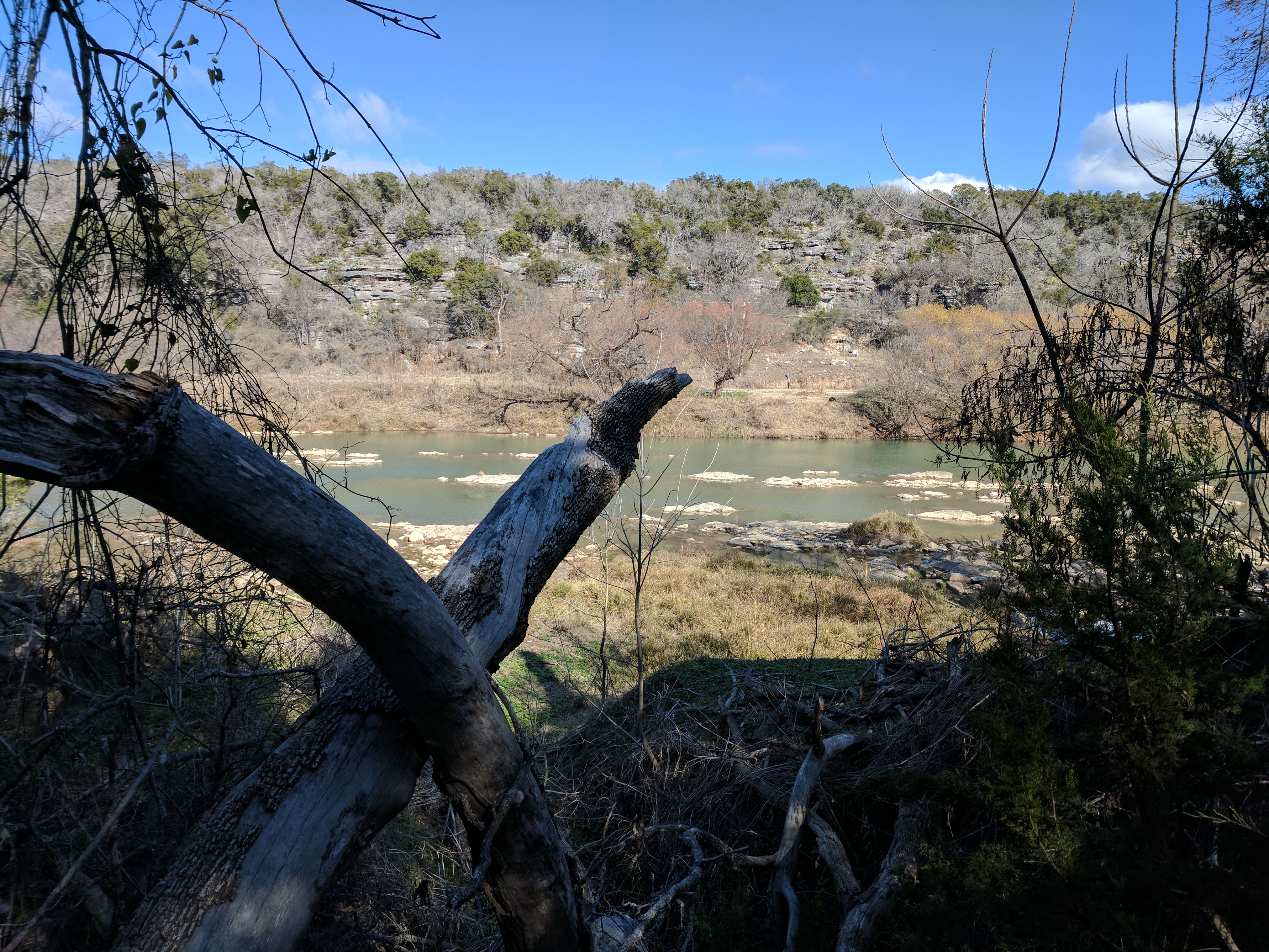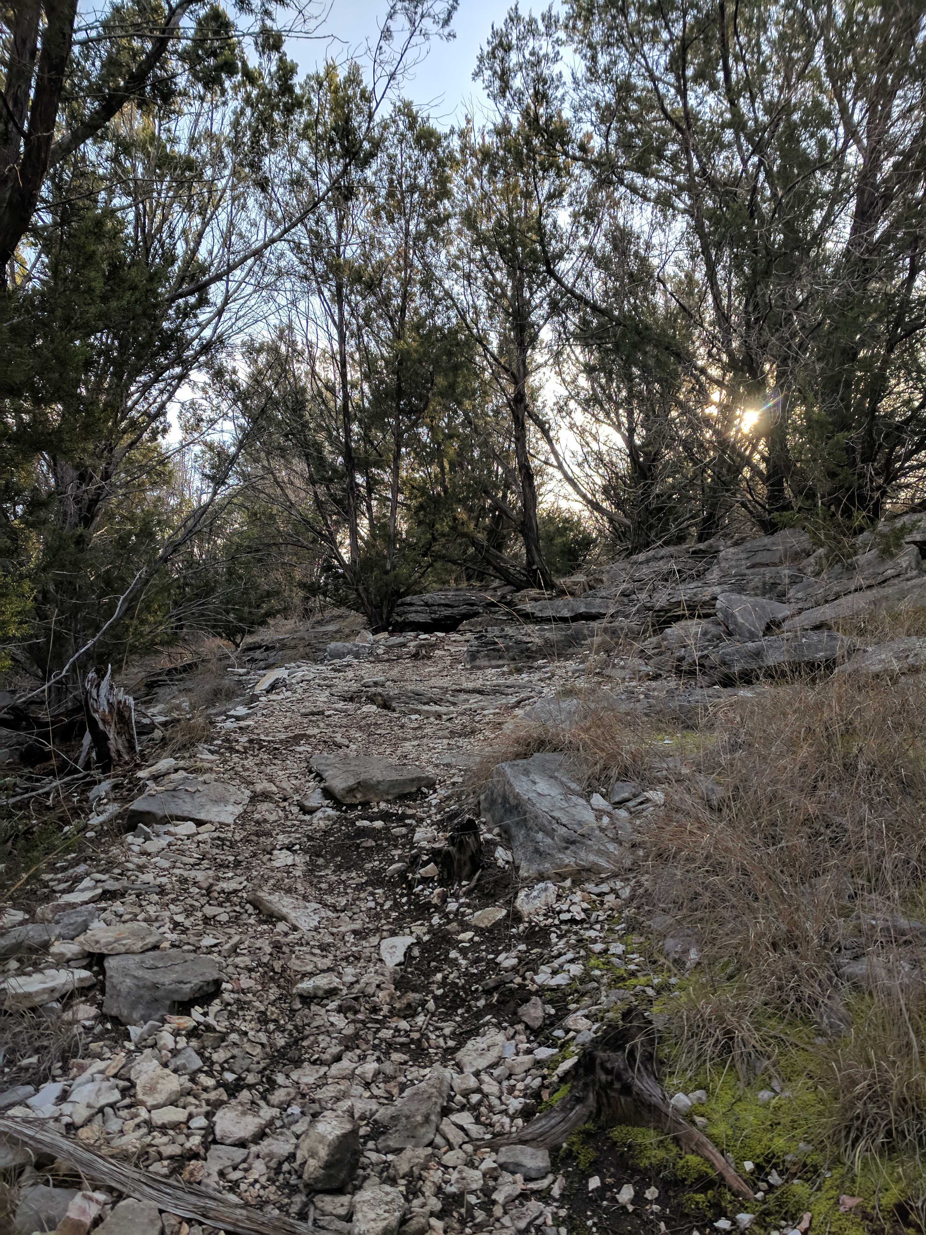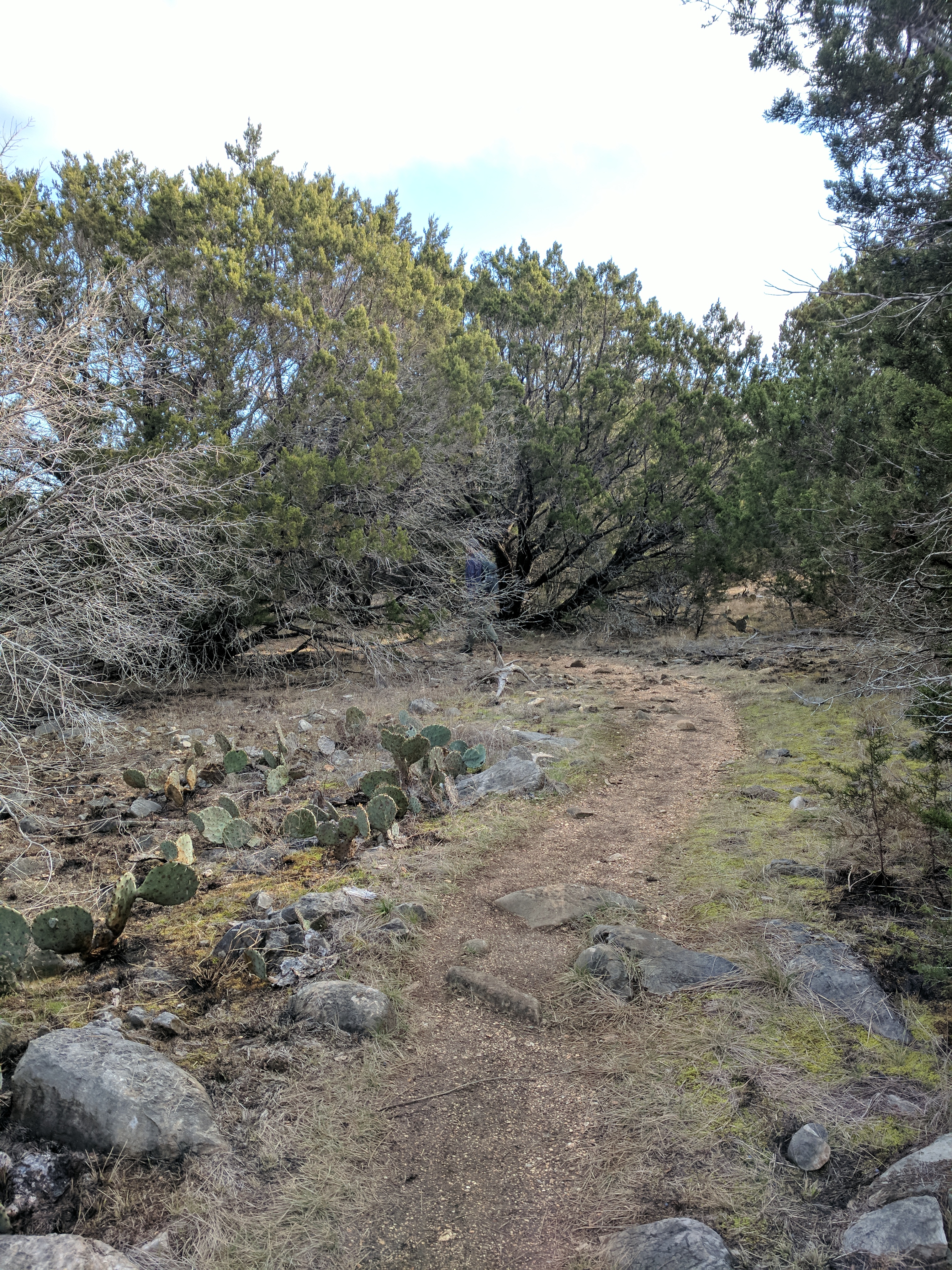 Once on the River Trail, we were happy to see how pretty the Colorado River was — a clear green, much lighter than what I was used to with the Guadalupe River. This trail was flat & easy, with one exception which involved a rope on the side of a rock wall. After that, the path meandered away from the river & into a grassy savanna with lots of armadillos & sun. We connected to Lemons Ridge Pass at that point & began trekking back uphill into rockier terrain. My right knee had graciously spared me any issues so far, but I guess it got lonely those last 2 miles because it flared up & I was SOOO grateful that the last mile on Lemons Ridge was relatively flat. We didn’t hike the entire Lemons Ridge trail, just to the portion that connects to Cedar Chopper where we had parked. [Colorado Bend Trail Map]