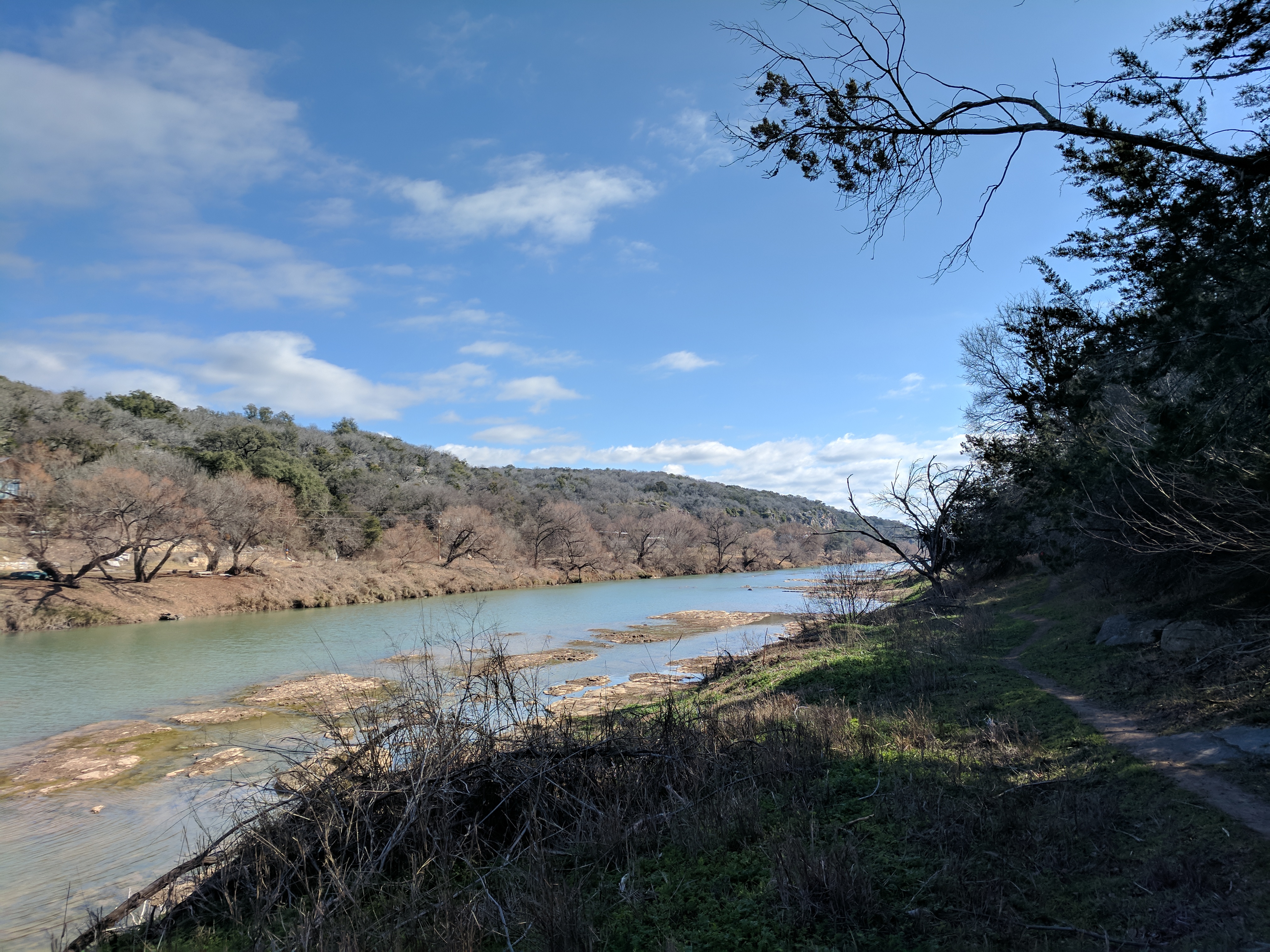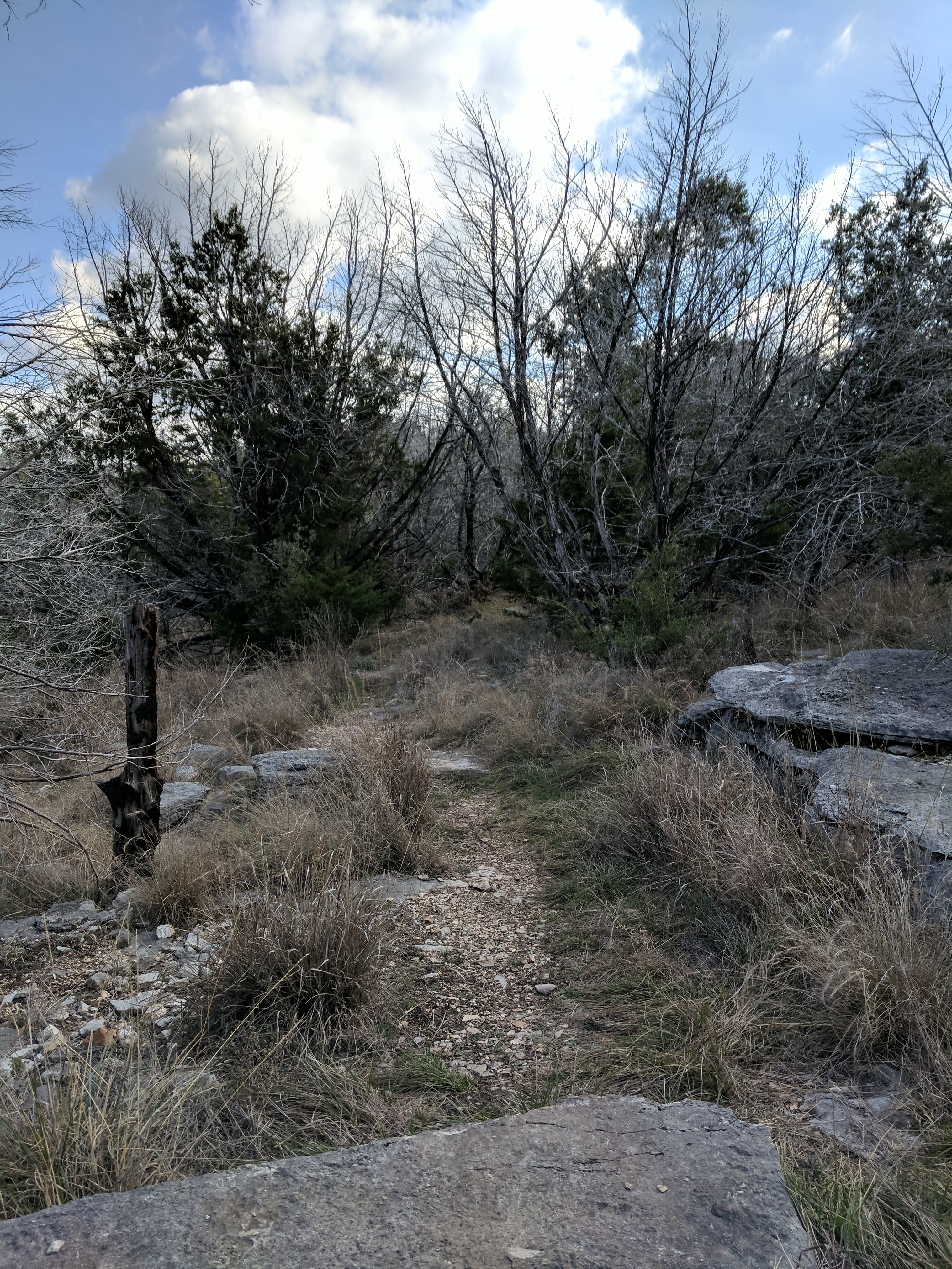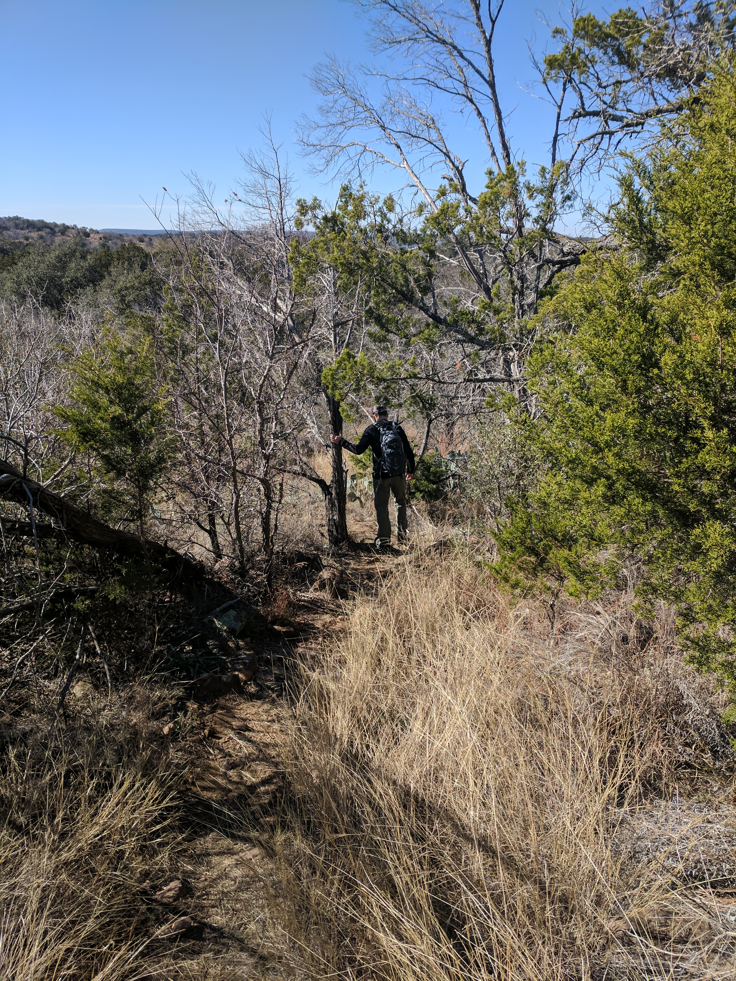 Once on the River Trail, we were happy to see how pretty the Colorado River was — a clear green, much lighter than what I was used to with the Guadalupe River. This trail was flat & easy, with one exception which involved a rope on the side of a rock wall. After that, the path meandered away from the river & into a grassy savanna with lots of armadillos & sun. We connected to Lemons Ridge Pass at that point & began trekking back uphill into rockier terrain. My right knee had graciously spared me any issues so far, but I guess it got lonely those last 2 miles because it flared up & I was SOOO grateful that the last mile on Lemons Ridge was relatively flat. We didn’t hike the entire Lemons Ridge trail, just to the portion that connects to Cedar Chopper where we had parked. [Colorado Bend Trail Map]