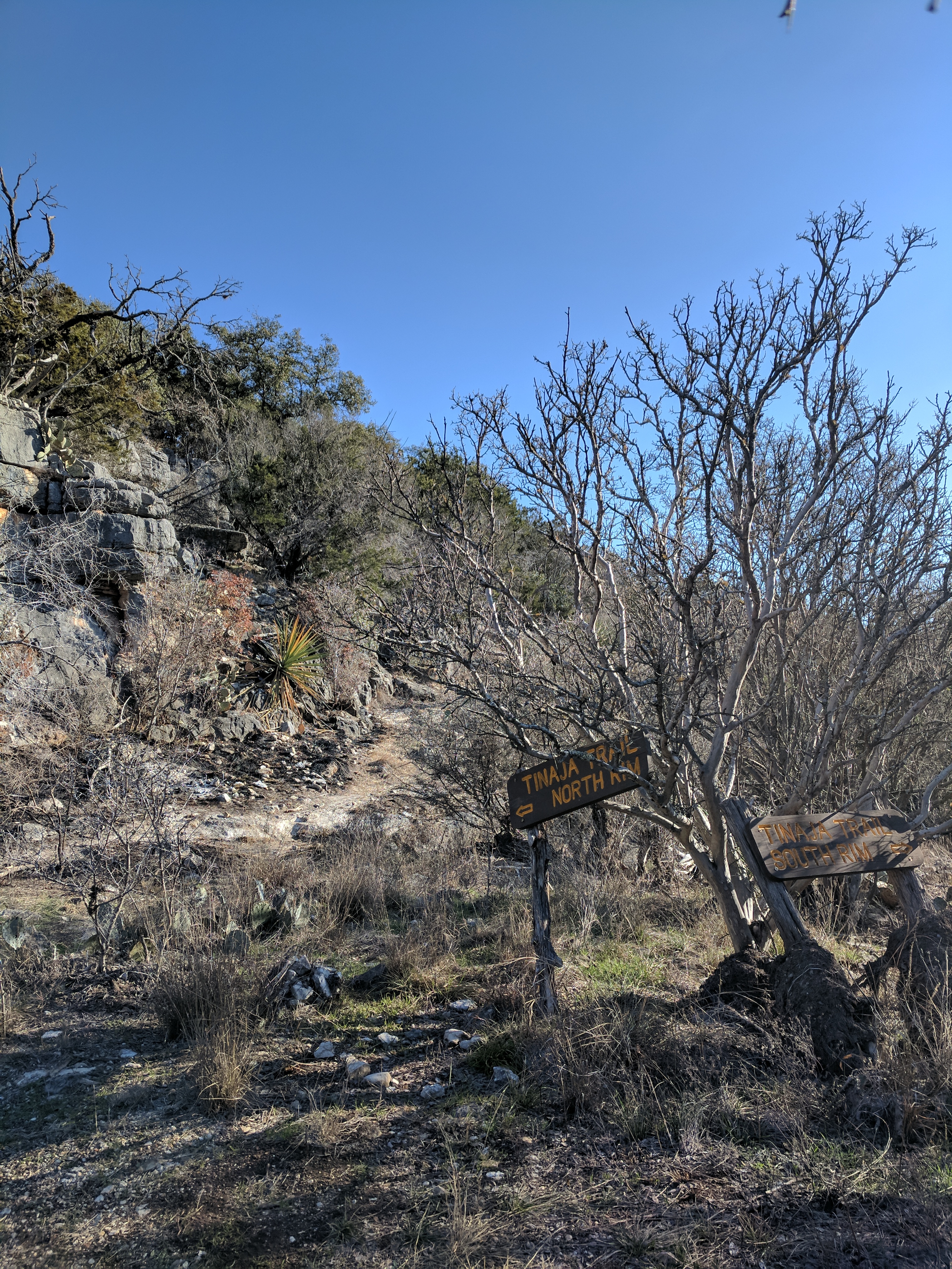 If you connect Tinaja to River Trail, head down a gravel road to a parking area. You must walk BEHIND the house to find the River Trail entrance. Signage was terrible at this junction & 5 other hikers (besides us) also got lost trying to find it!