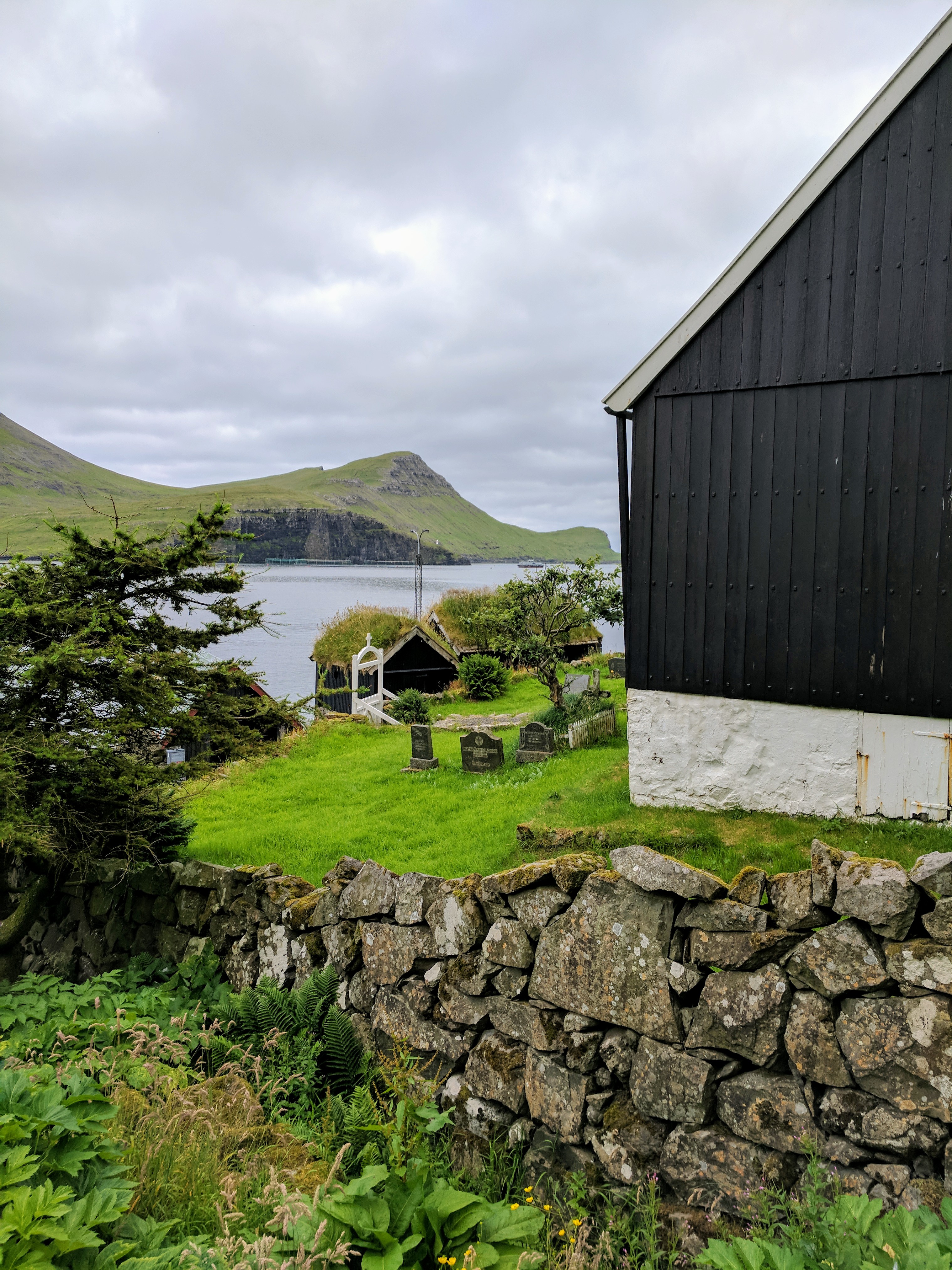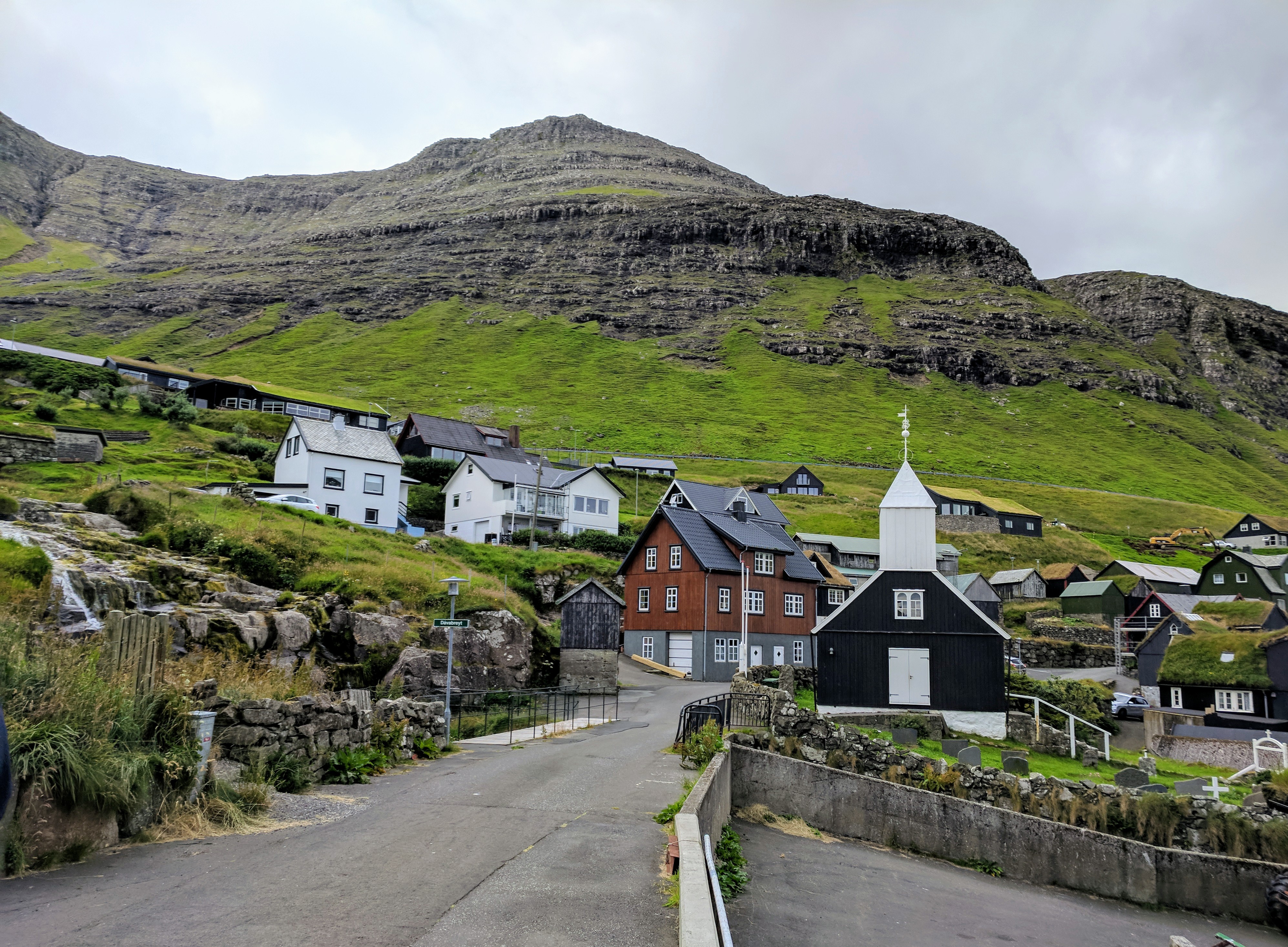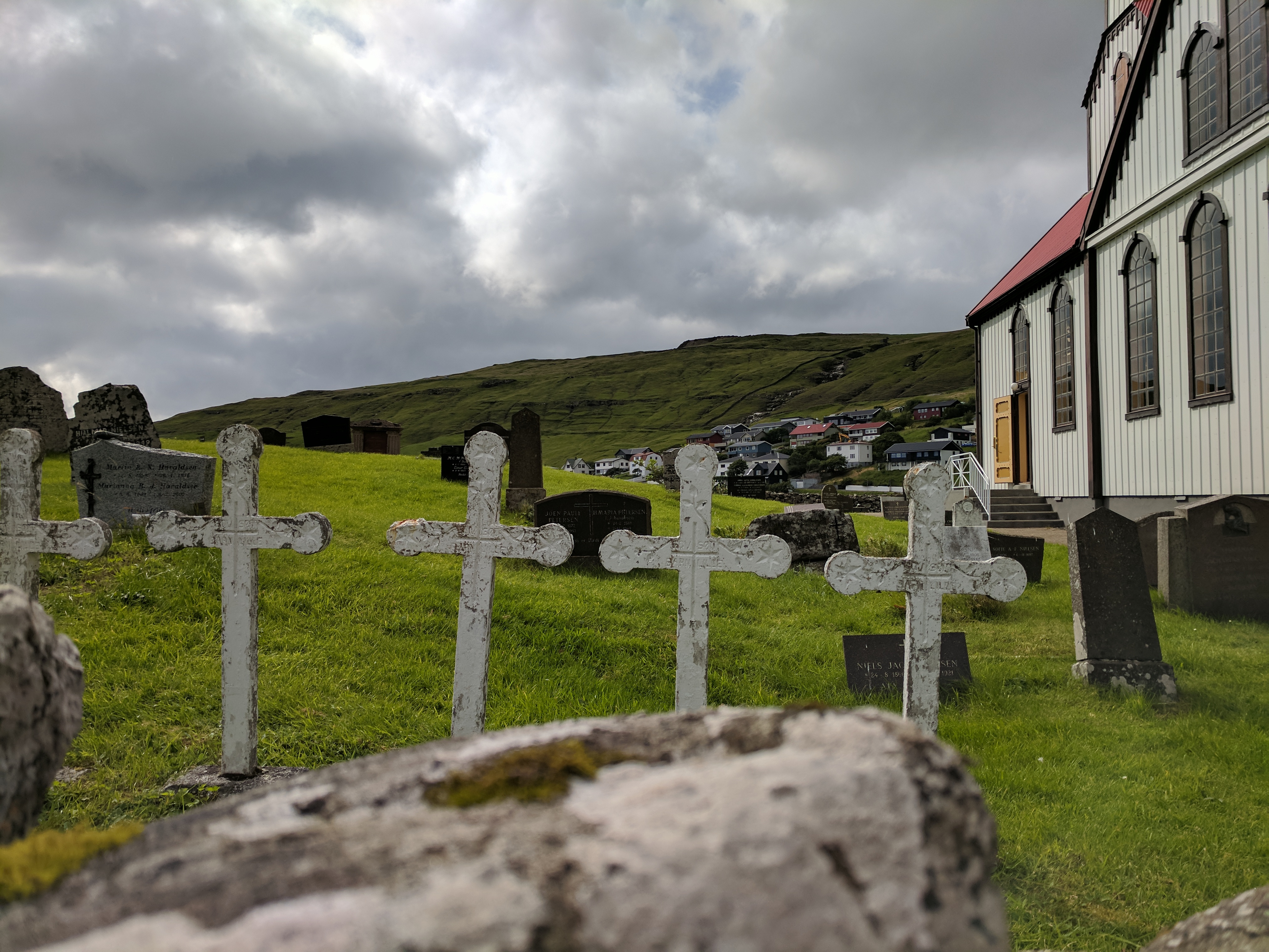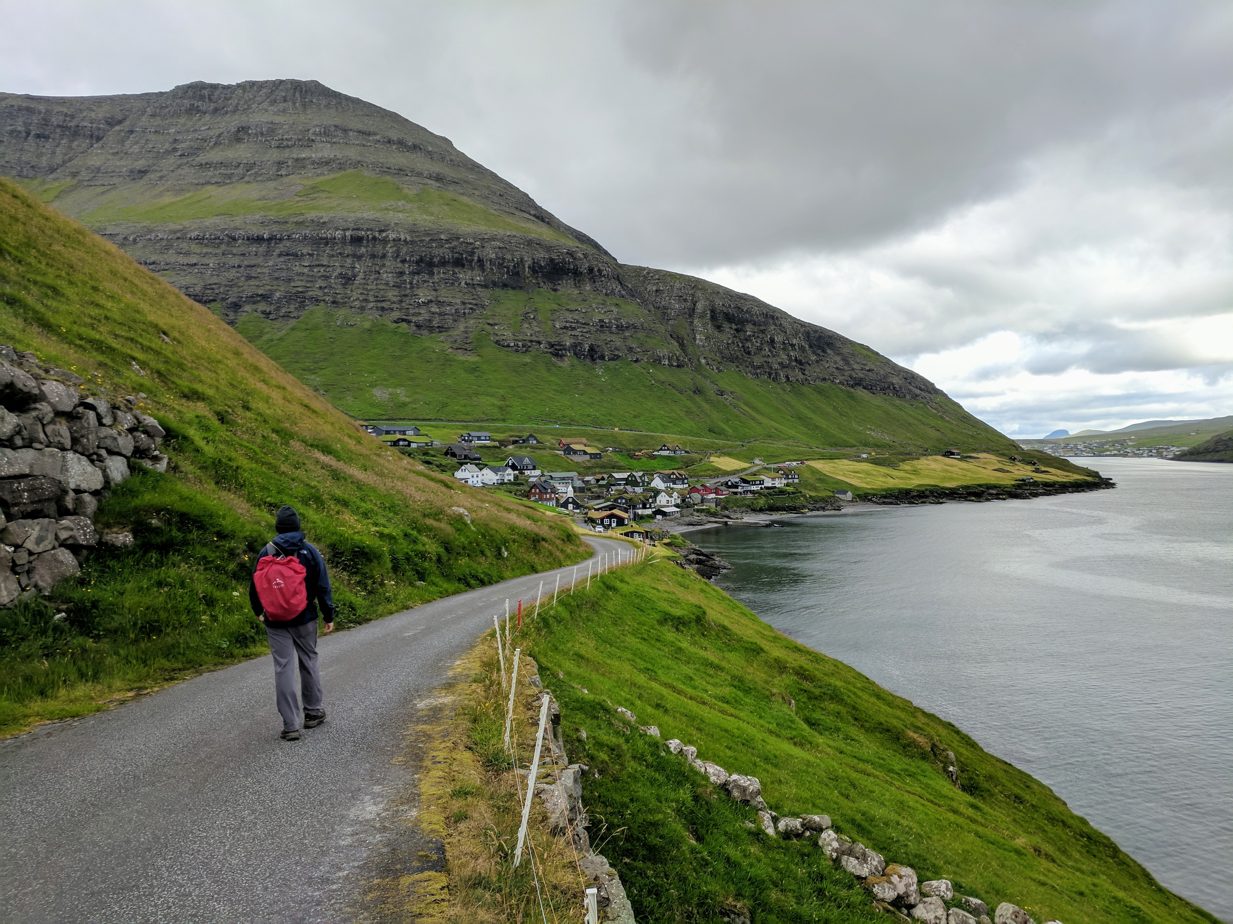 There is literally one main road that connects the six villages on Vágar. You can’t get lost, unless you don’t know your East from your West. So despite this being our first time driving outside the US, we had no issues getting where we needed to be. We spent our first two nights at an AirBnB in Sandavágur, which had a gregarious hostess named Tom. She had a scrapbook of suggested restaurants and things to do on the island, a Spotify playlist of Faroese music, first-aid kits and reflectors (for hiking in fog), movies, books, a fully stocked kitchen, and WASHCLOTHS! We had a beautiful view of the water and village, which had one of the prettiest churches in the Faroes. The church was fairly new (built in 1917) but it had a large rune stone from the year 1200 that translated to “Torkil son of Onundar, man of the East from Rogaland, lived in this place first.” If I ever get to write a Viking romance novel, I think Torkil might just make an appearance.