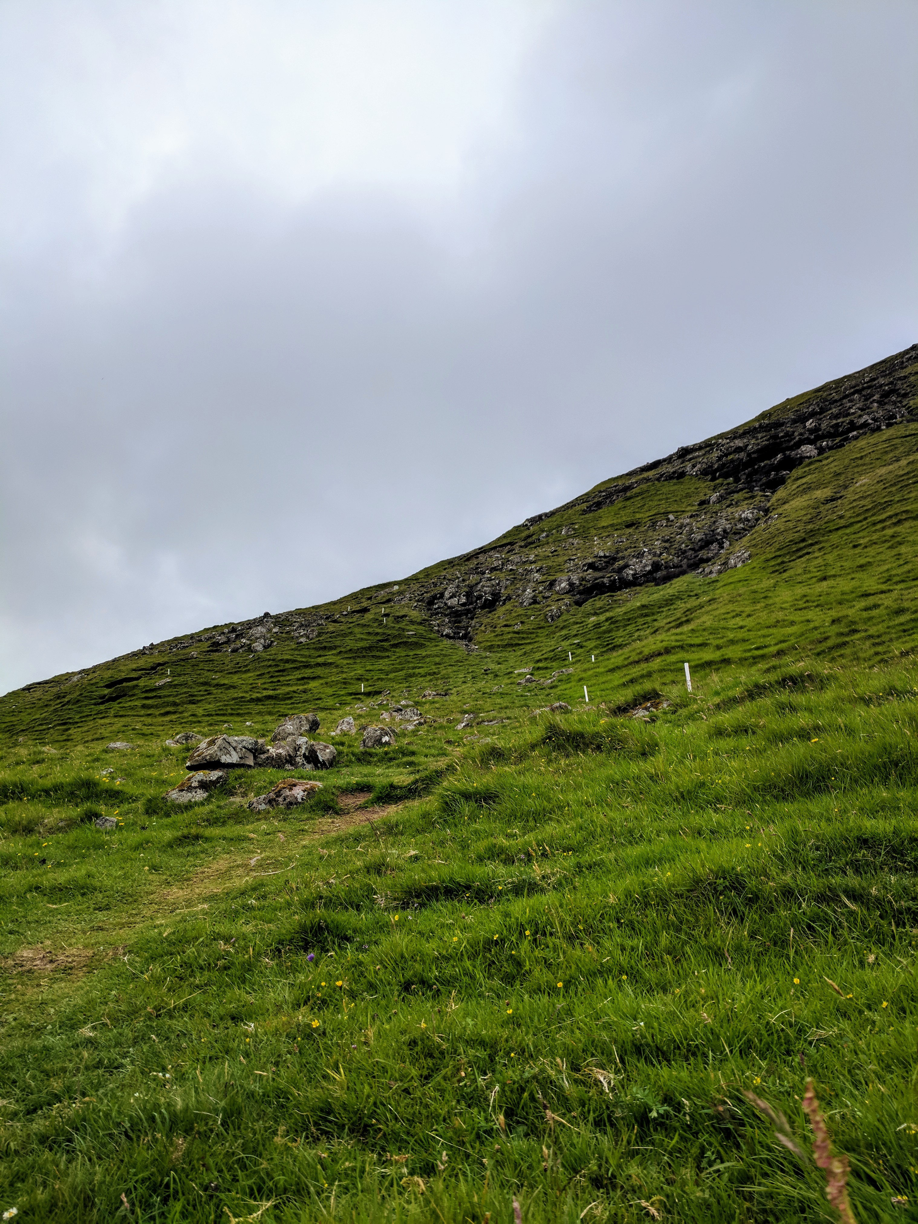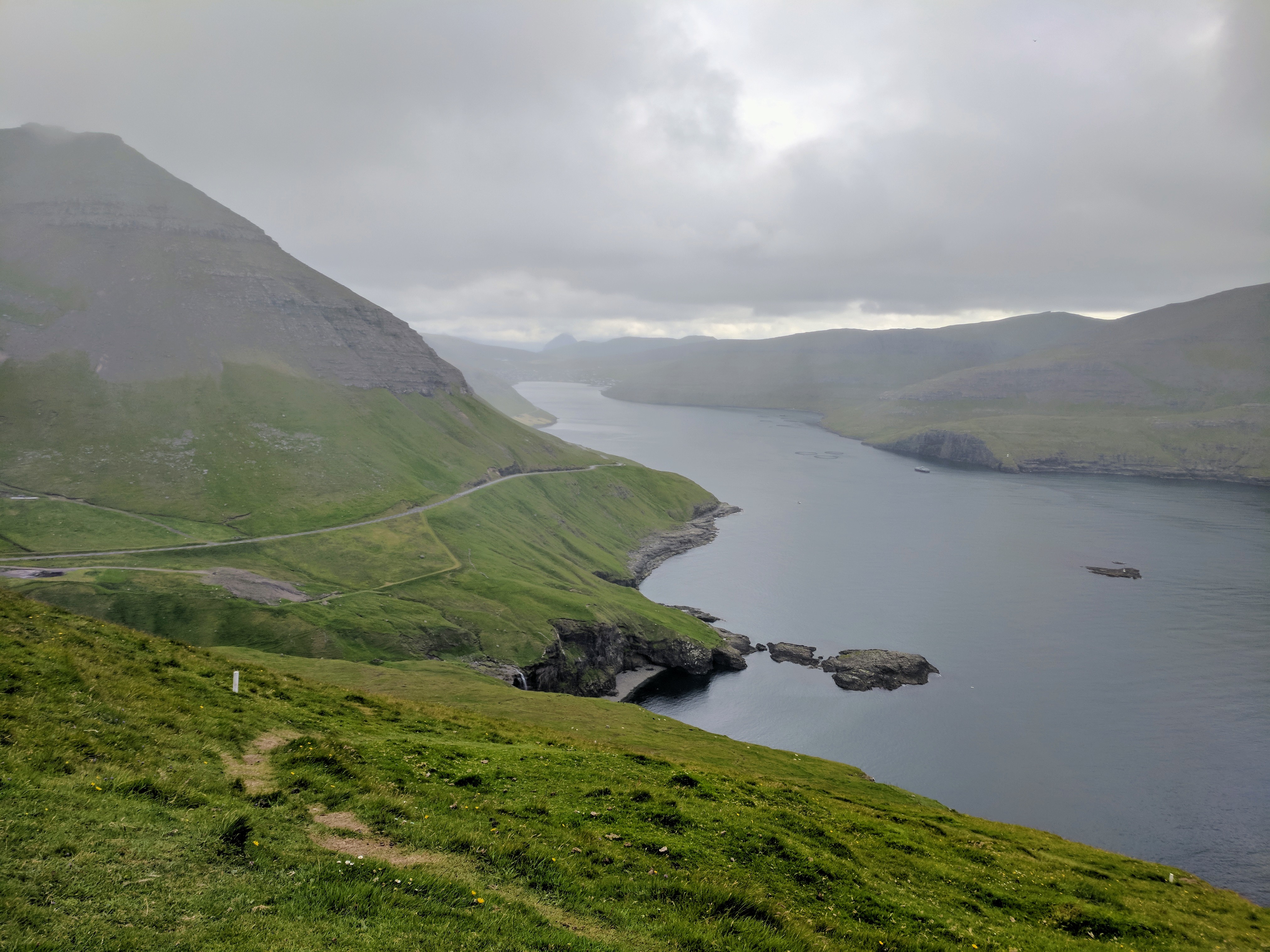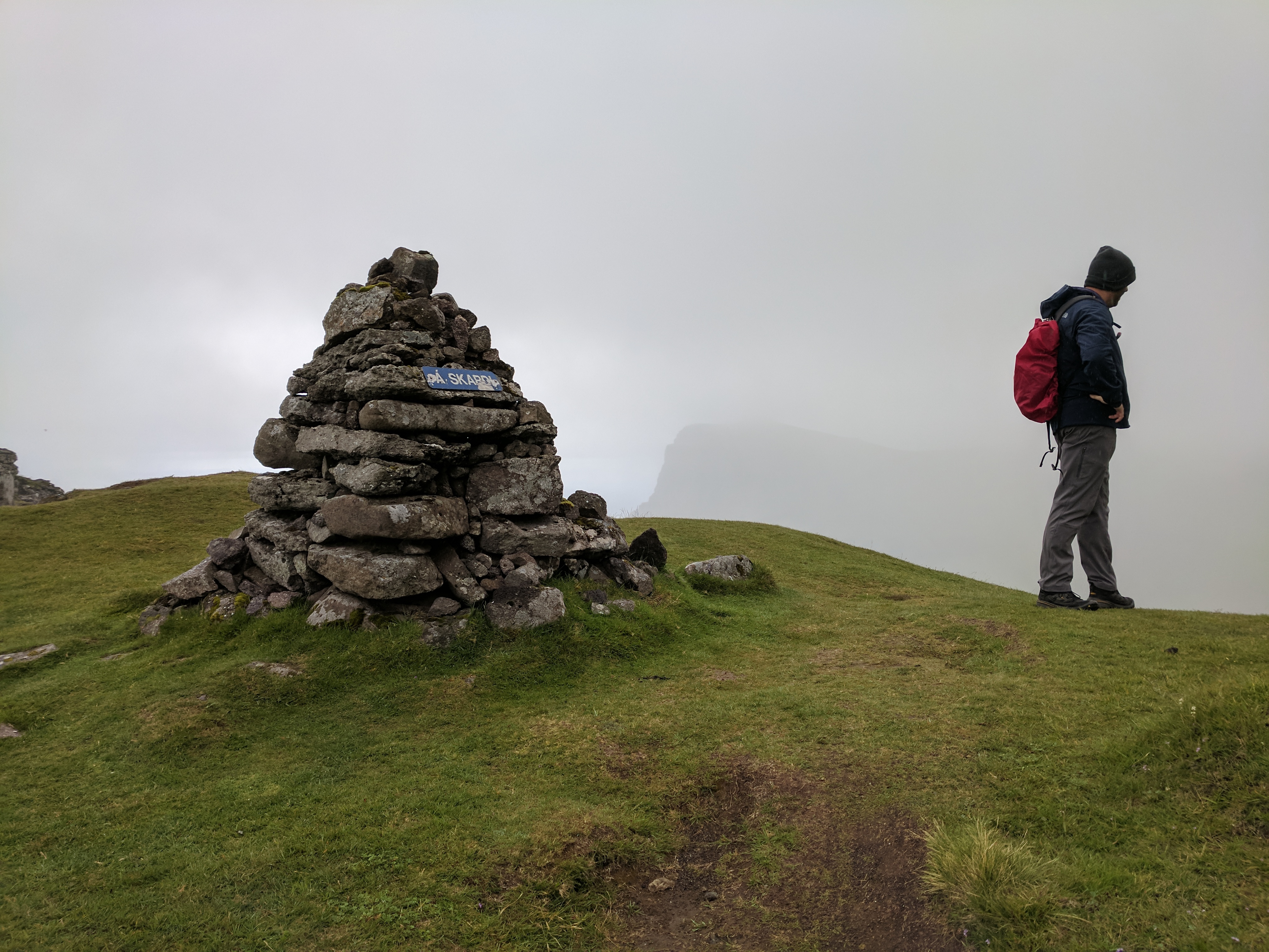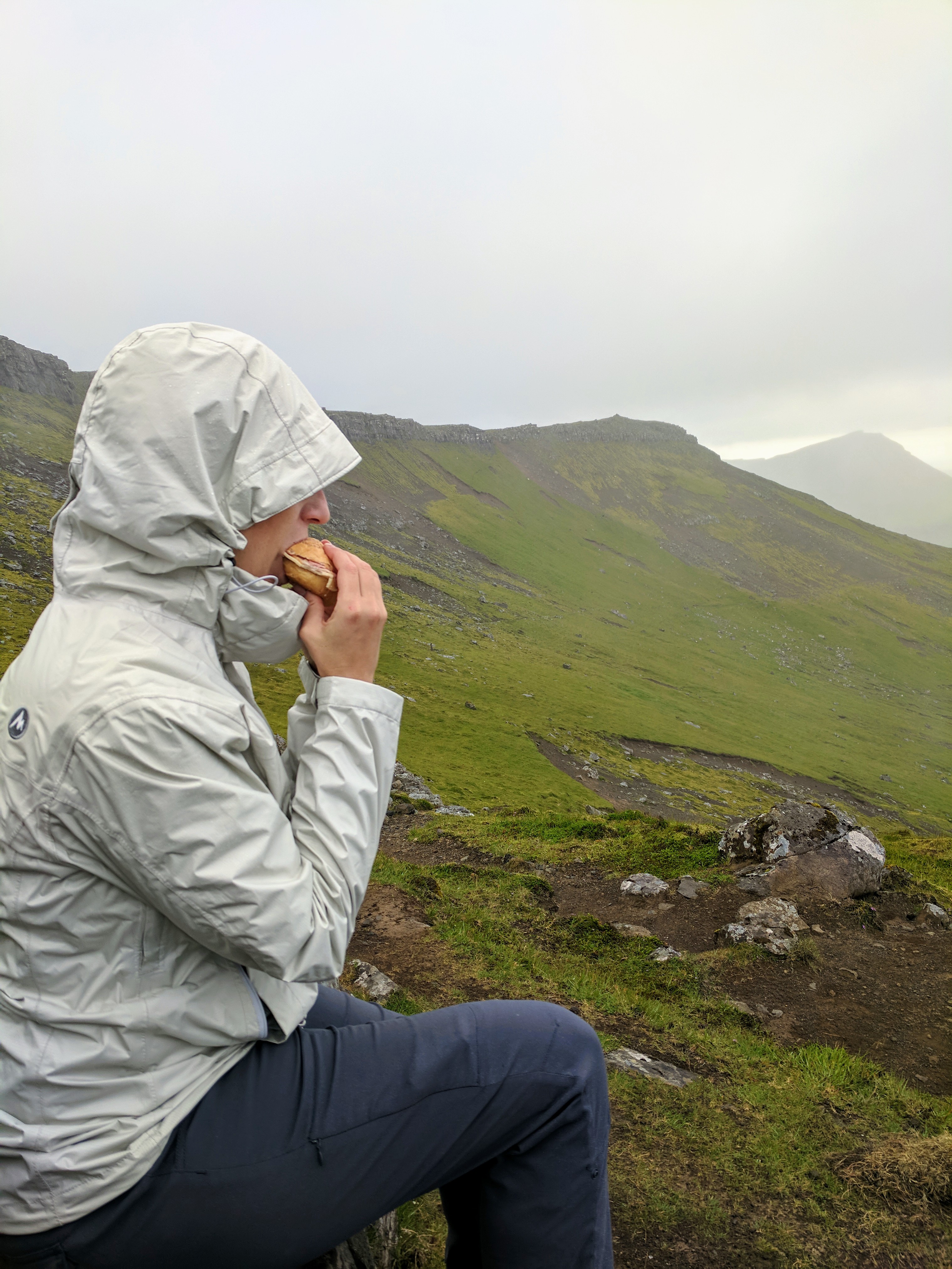 Something important to note about hiking in the Faroe Islands — there are no road signs designating where to pull off for a trail. Some trails don’t even have a sign at all! At least not when we went. The trail notes said it began about 1km south of the tunnel entrance, but even with that knowledge we would never have seen the trail if cars hadn’t been parked in the lot. There was an unmarked road leading left, just before the entrance to the tunnel. Following that road, we found a bench and trailhead sign…and that was when we realized the trail began by going directly up the mountain. No switchbacks, no gradual ascents…just straight up at about a 45 degree angle. Add to that rain and dense fog, and you’ll understand why we didn’t complete the hike. We DID make it to the summit, however. We ate sandwiches in the rain and didn’t mind because it was just so astoundingly beautiful.