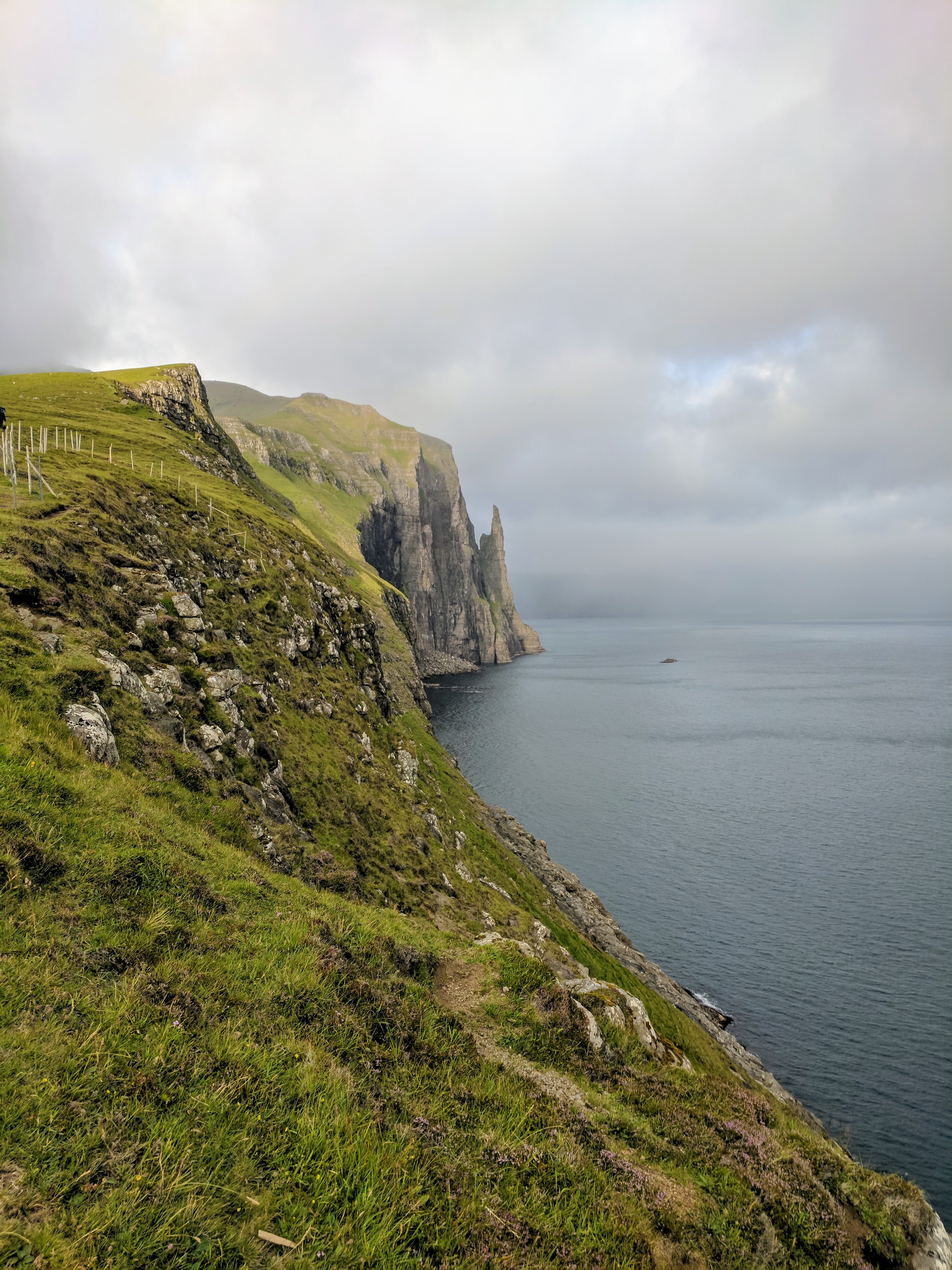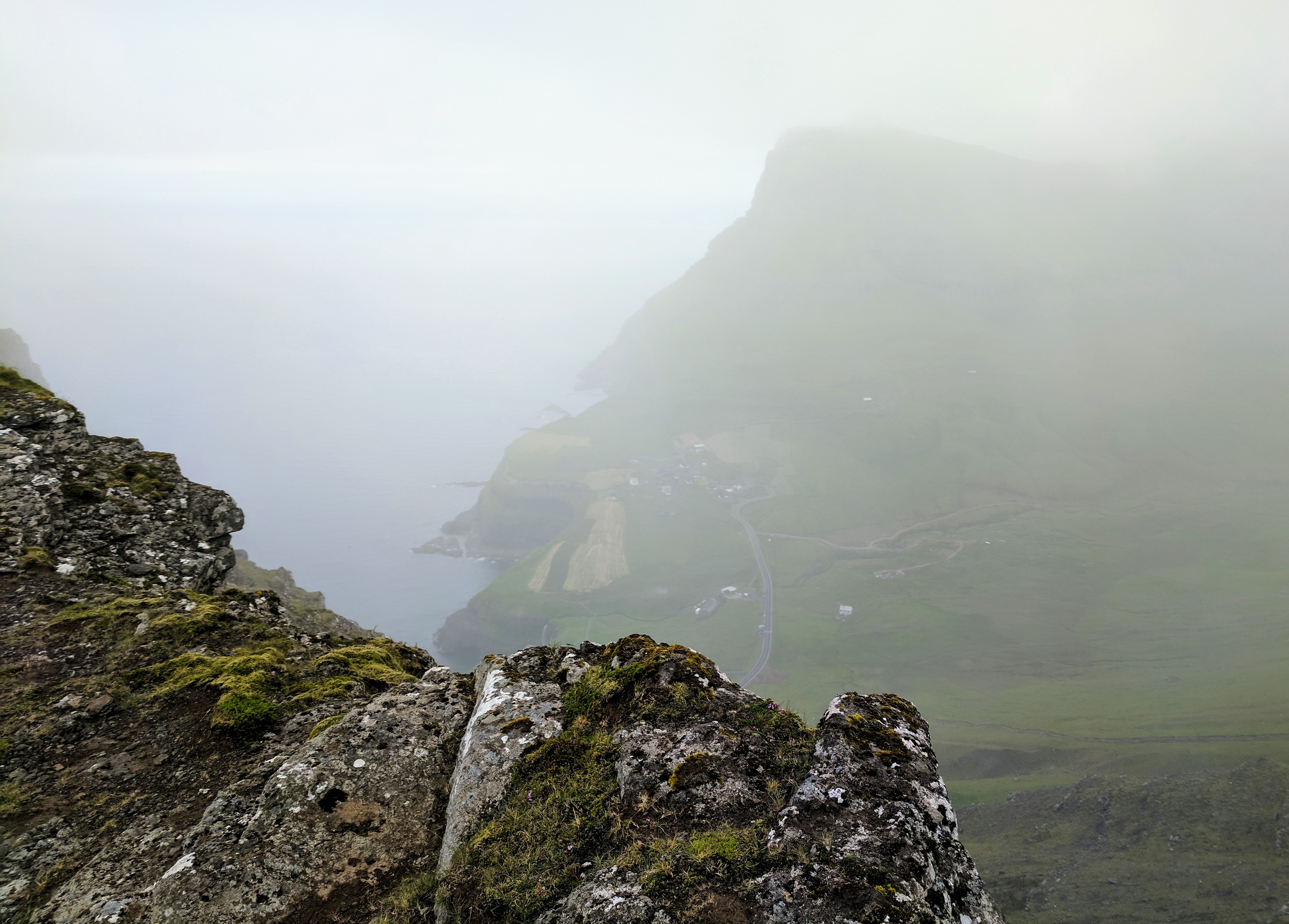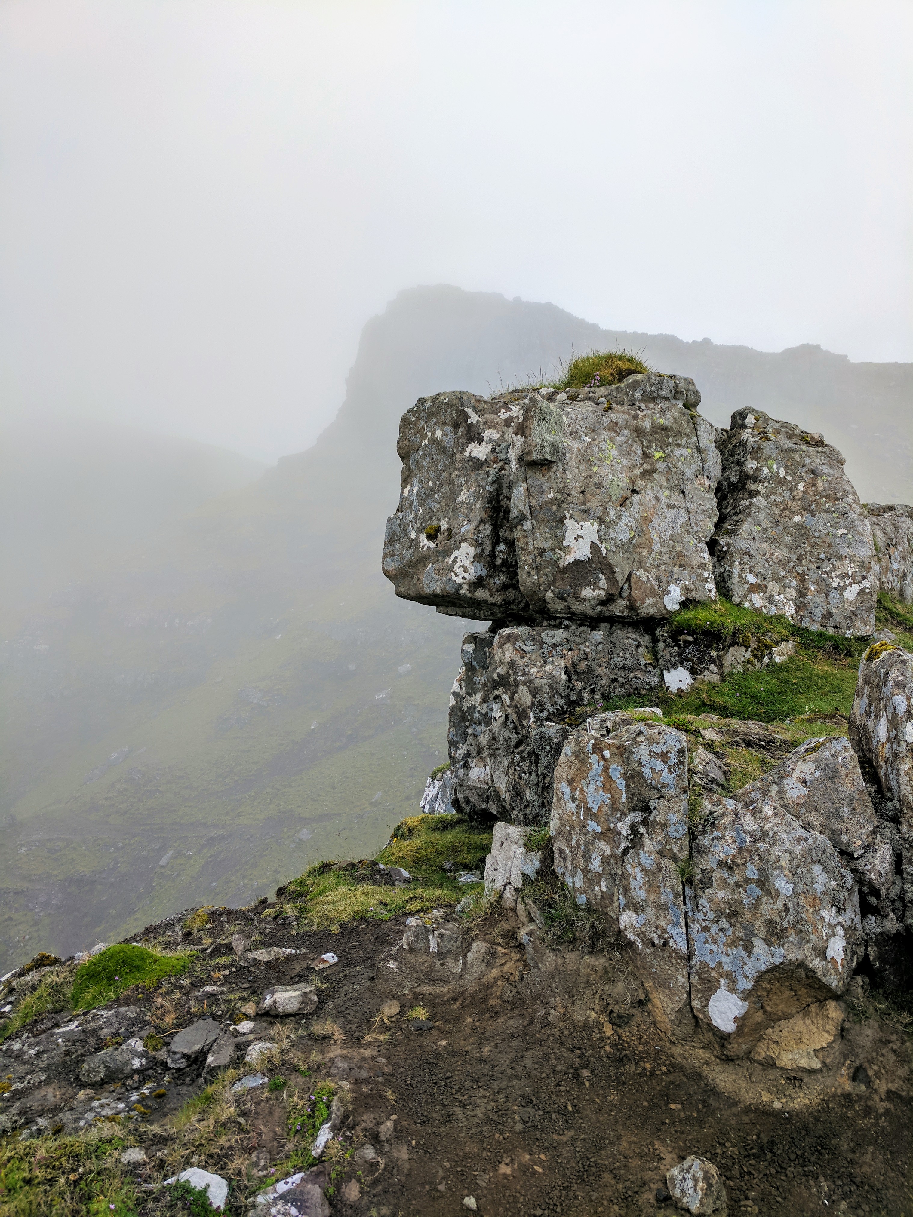 Something important to note about hiking in the Faroe Islands — there are no road signs designating where to pull off for a trail. Some trails don’t even have a sign at all! At least not when we went. The trail notes said it began about 1km south of the tunnel entrance, but even with that knowledge we would never have seen the trail if cars hadn’t been parked in the lot. There was an unmarked road leading left, just before the entrance to the tunnel. Following that road, we found a bench and trailhead sign…and that was when we realized the trail began by going directly up the mountain. No switchbacks, no gradual ascents…just straight up at about a 45 degree angle. Add to that rain and dense fog, and you’ll understand why we didn’t complete the hike. We DID make it to the summit, however. We ate sandwiches in the rain and didn’t mind because it was just so astoundingly beautiful.