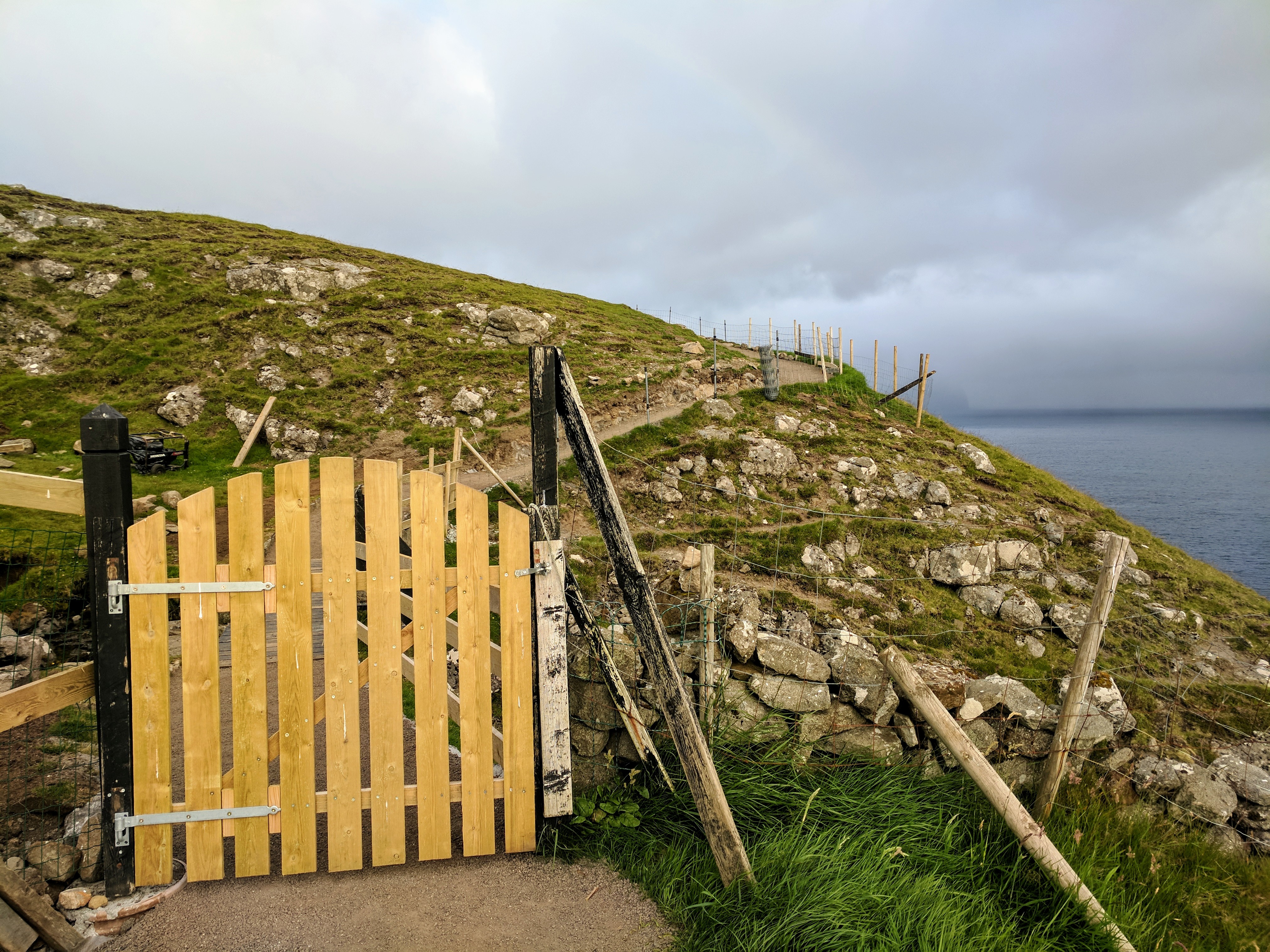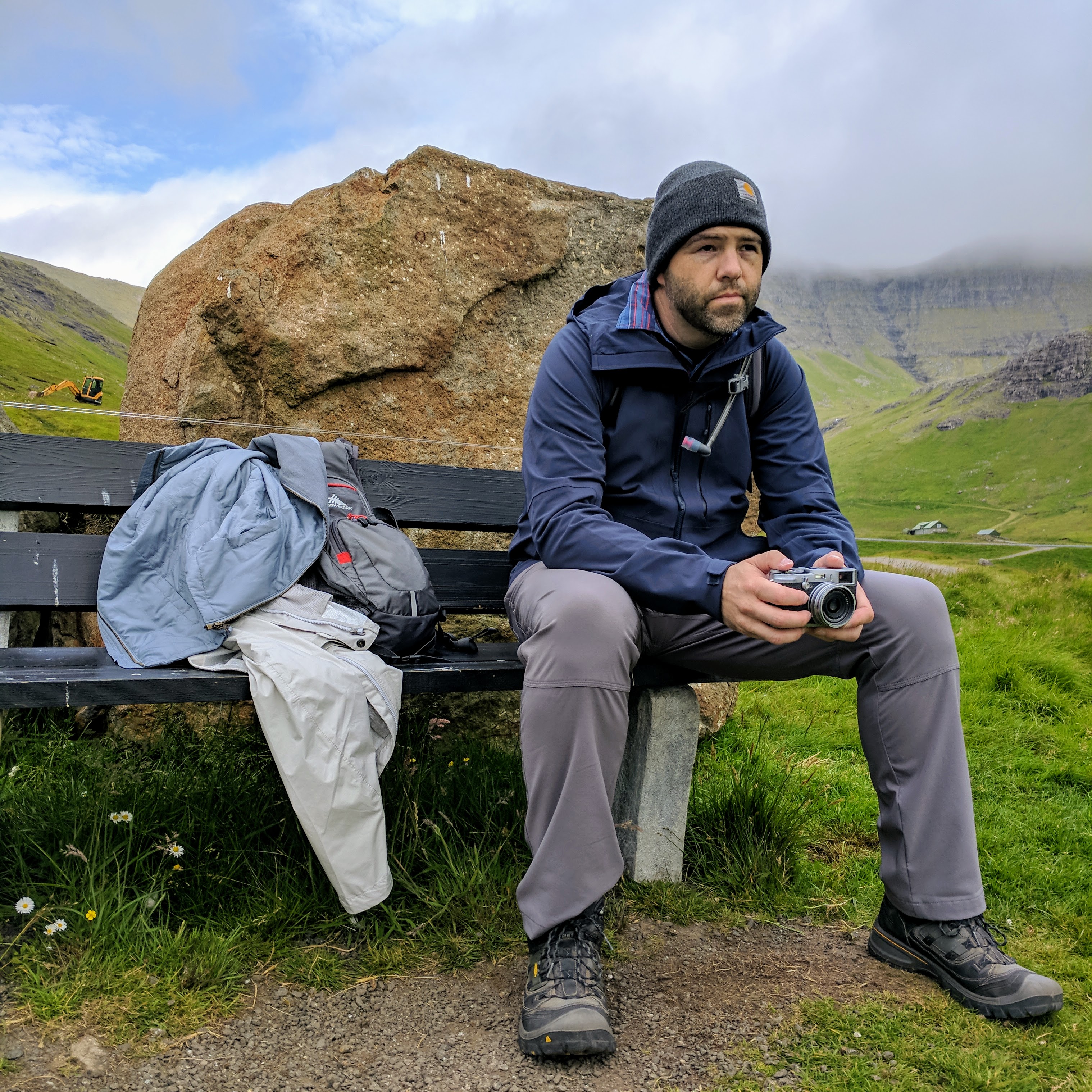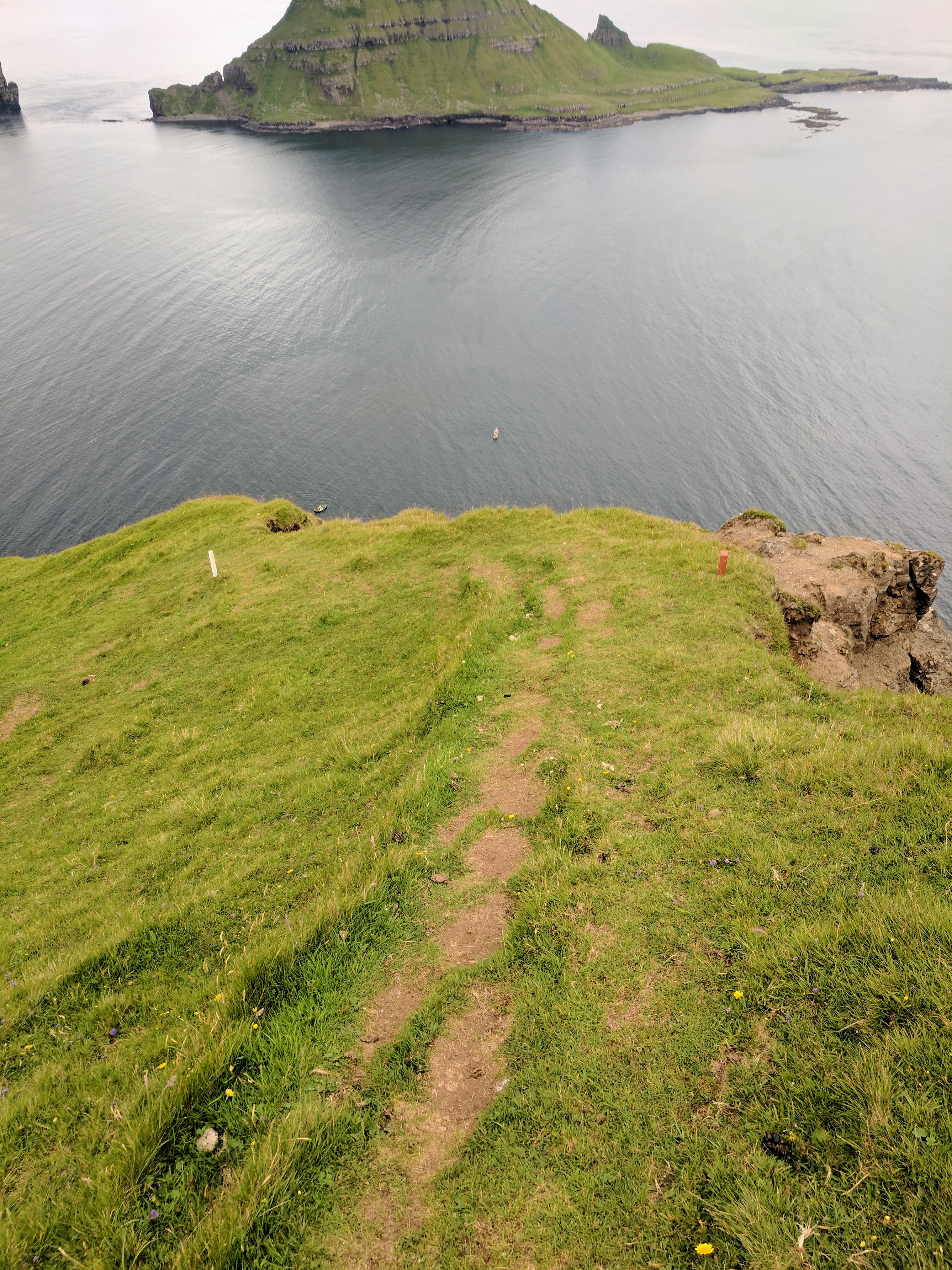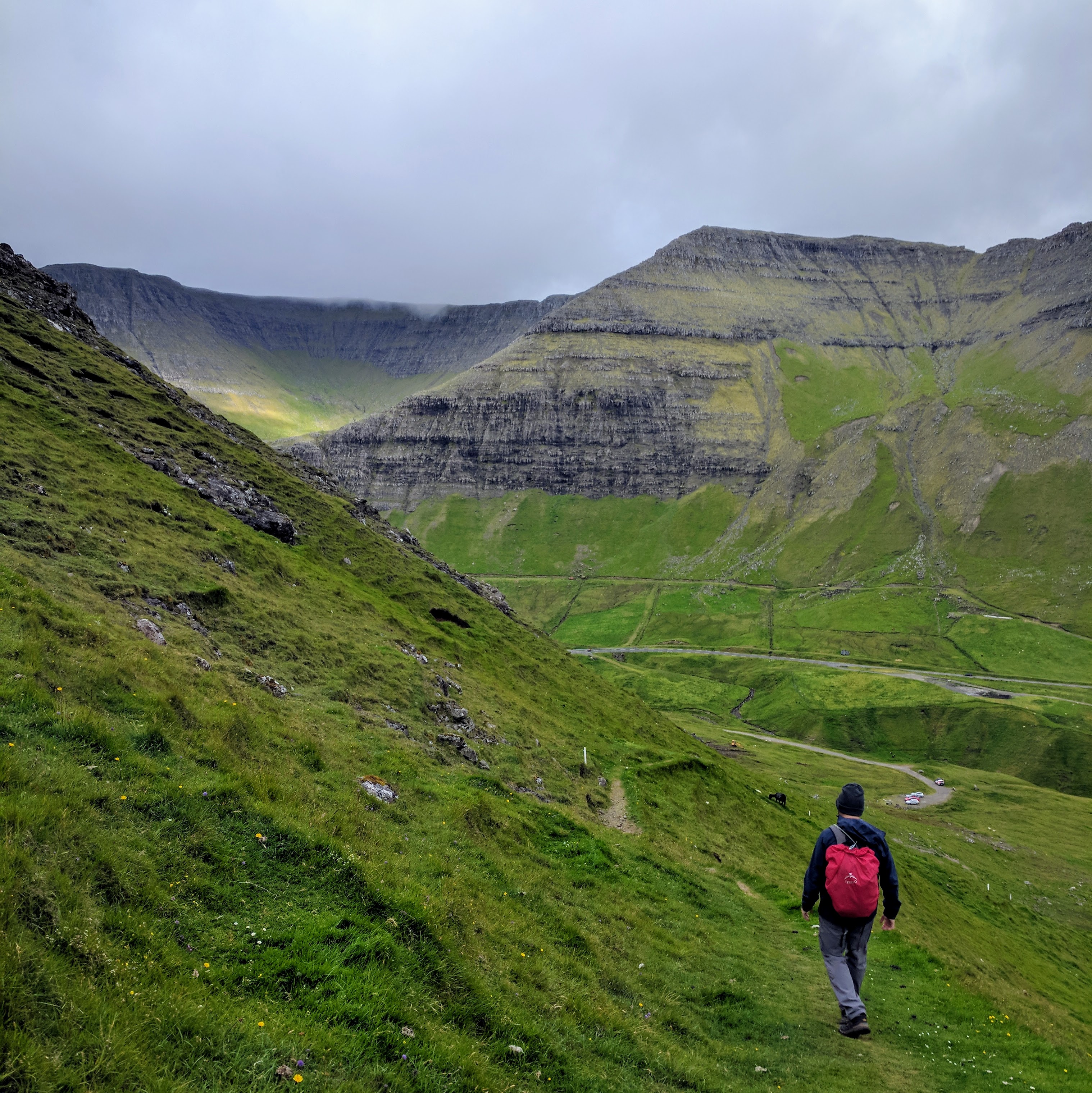Something important to note about hiking in the Faroe Islands — there are no road signs designating where to pull off for a trail. Some trails don’t even have a sign at all! At least not when we went. The trail notes said it began about 1km south of the tunnel entrance, but even with that knowledge we would never have seen the trail if cars hadn’t been parked in the lot. There was an unmarked road leading left, just before the entrance to the tunnel. Following that road, we found a bench and trailhead sign…and that was when we realized the trail began by going directly up the mountain. No switchbacks, no gradual ascents…just straight up at about a 45 degree angle. Add to that rain and dense fog, and you’ll understand why we didn’t complete the hike. We DID make it to the summit, however. We ate sandwiches in the rain and didn’t mind because it was just so astoundingly beautiful.