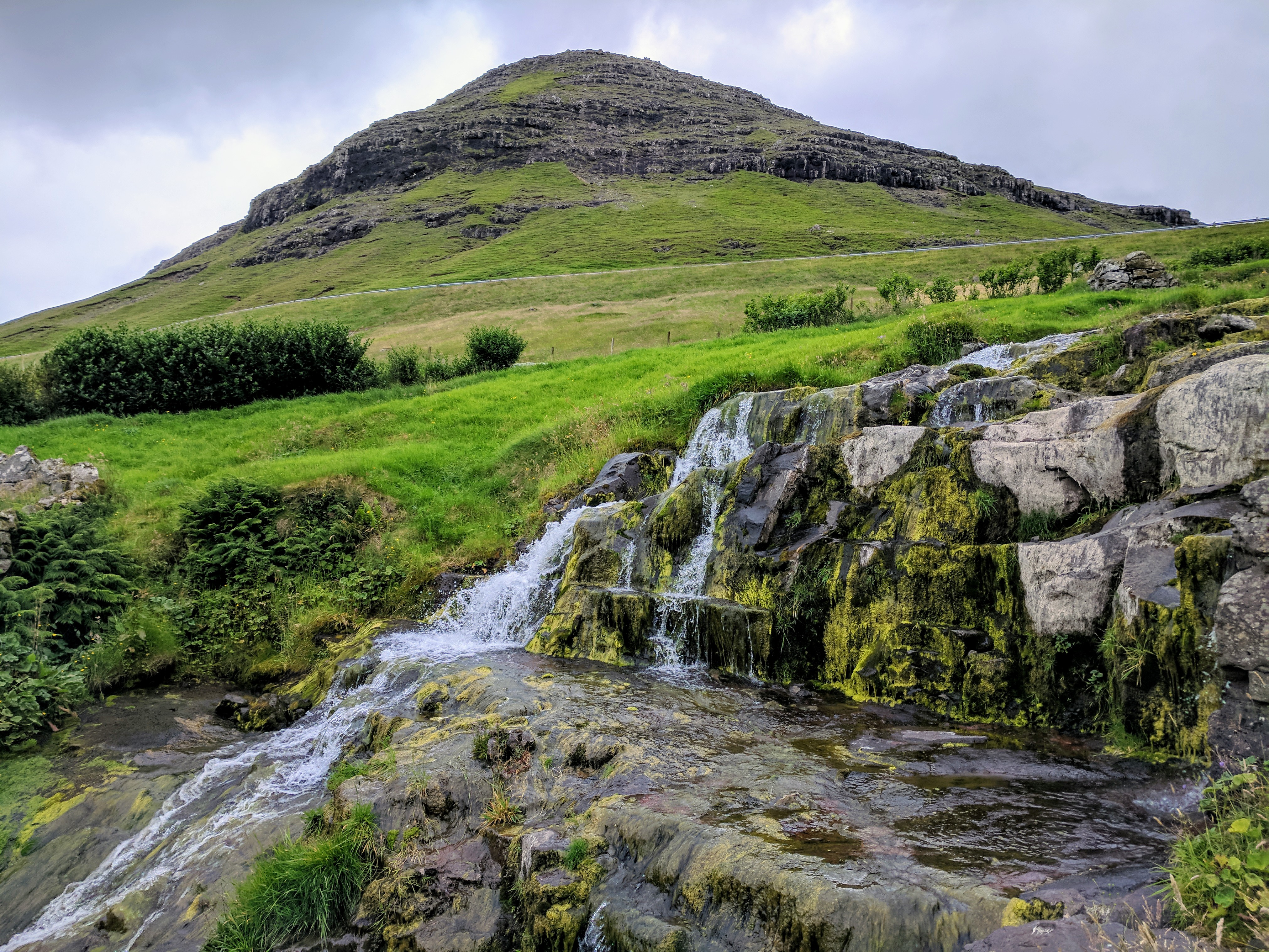 We saved our knees by avoiding the most difficult part of the hike, the descent to Gásadalur. We turned around and drove to the town instead. This was our first experience with one of MANY tunnels which connect islands and mountain towns throughout the Faroe Islands. Before that tunnel was built, the ONLY way to get to the town was via the trail — and the tunnel was only completed in 2006! One of the reasons the town probably survived such a remote location was because of its amazing waterfall — Múlafossur.