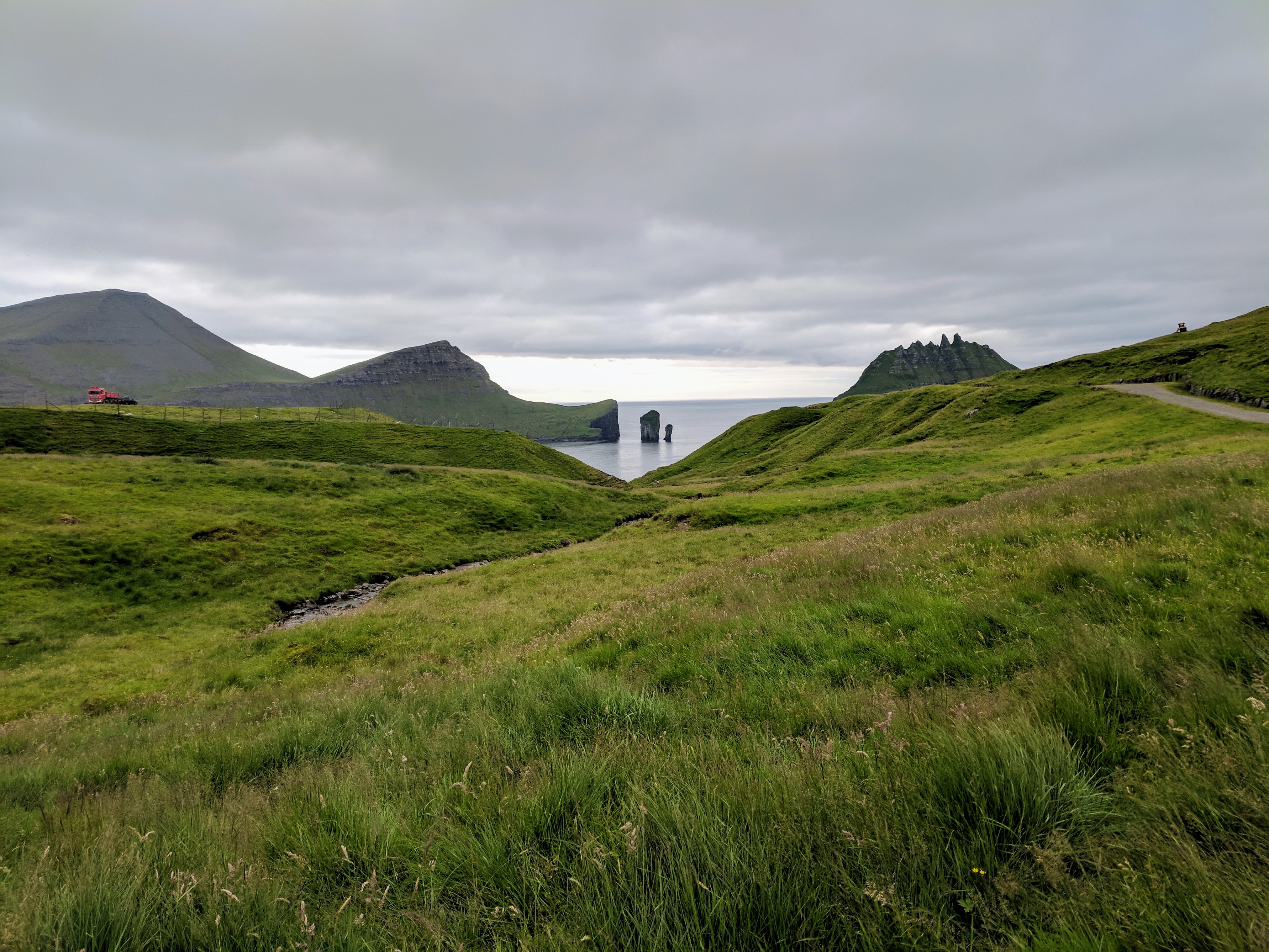 We picked up food provisions at a tiny market in town, ate pizza at Smiðjan in the neighboring town of Miðvágur, then finished off the evening with a walk up to Trøllkonufingur. The path to Trøllkonufingur (which means “troll woman’s finger”) began in Sandavágur. There was a sign for it and we simply drove up that road until we saw parked cars. We could have driven a little further, but the walk was so pretty and we were happy for a chance to stretch our travel legs.