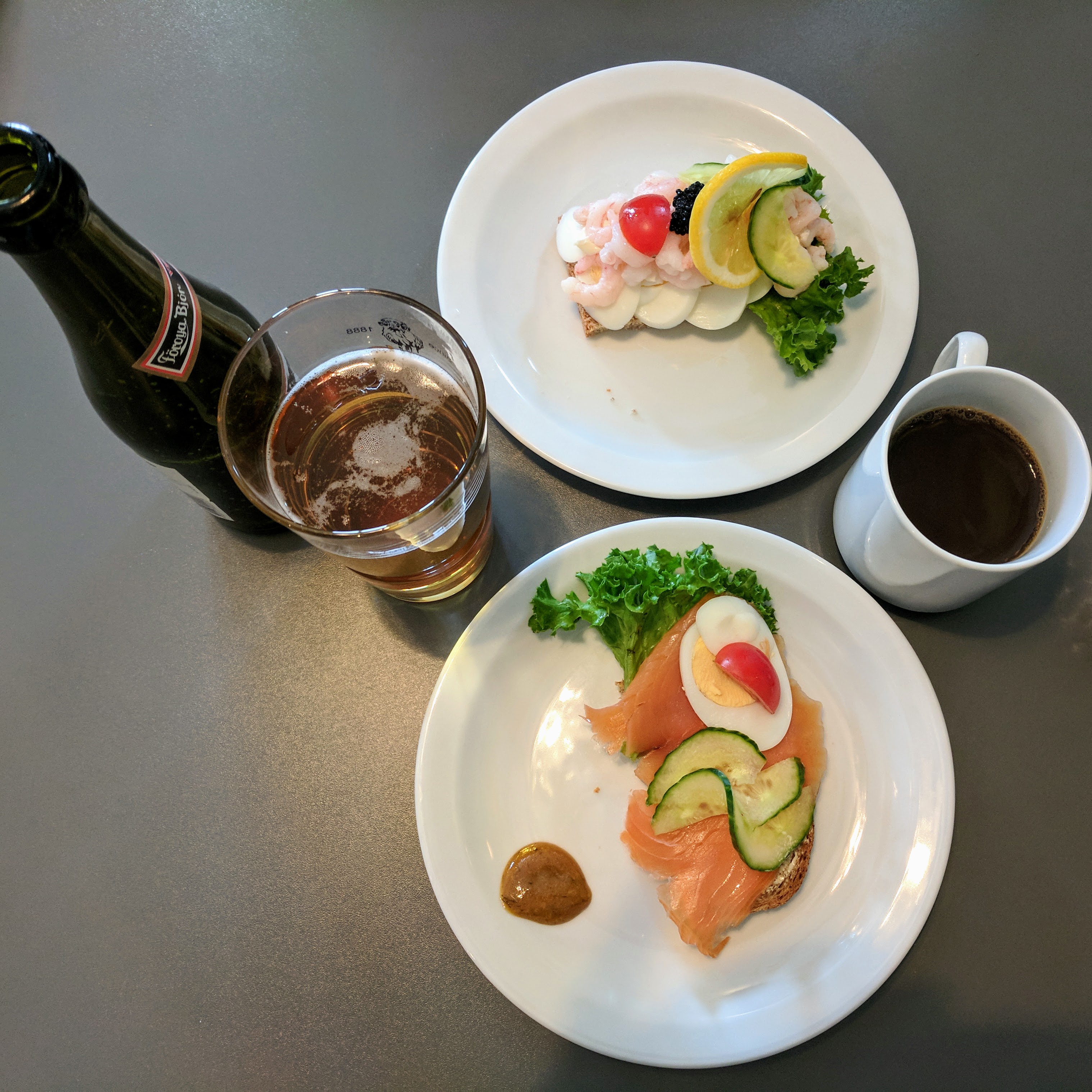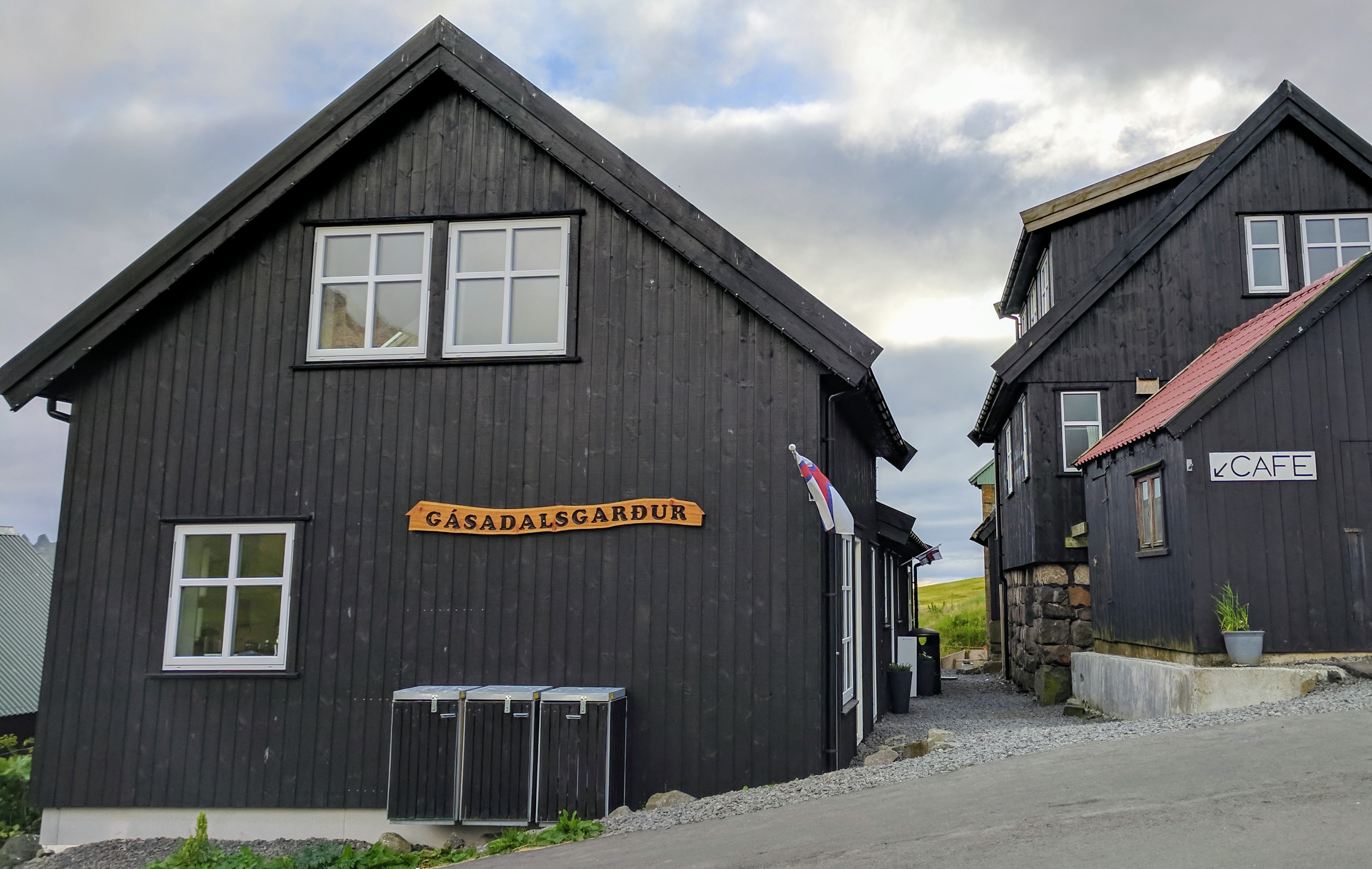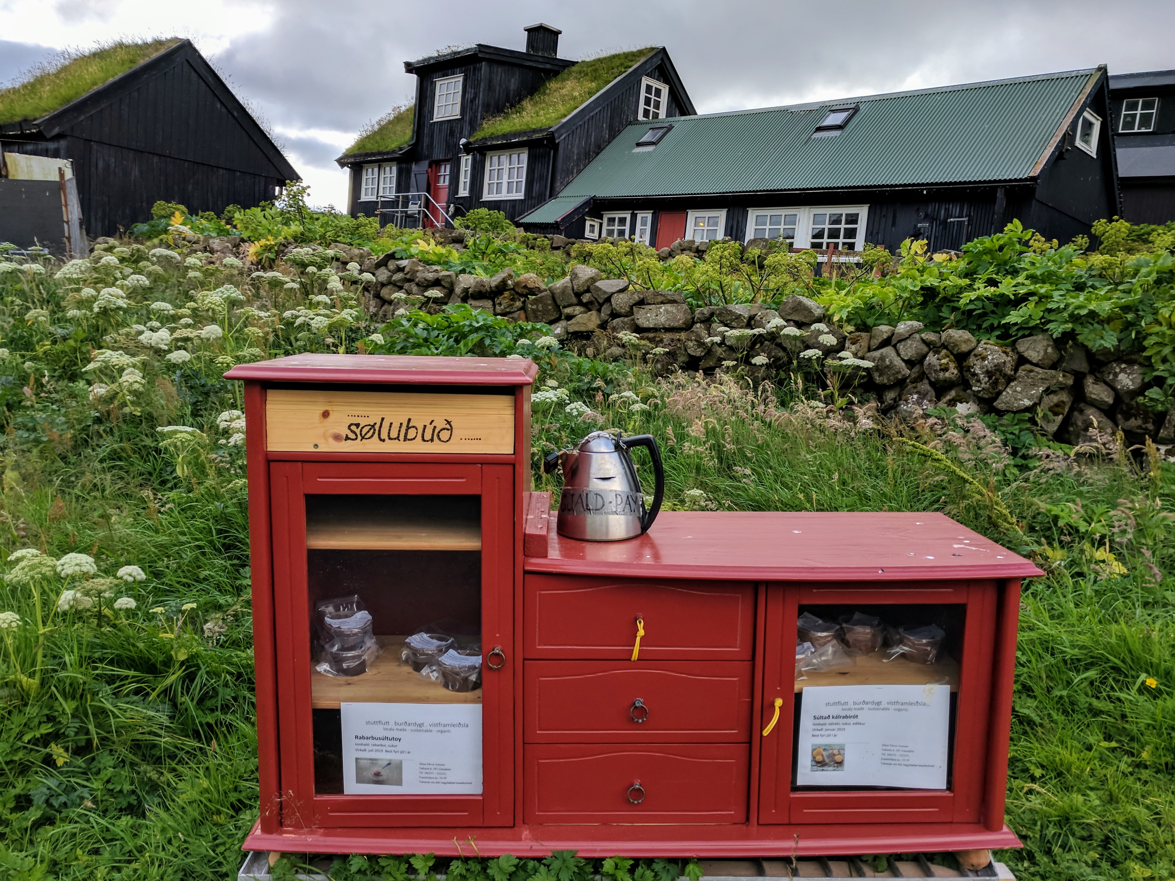 Had we completed the hike, this would have been the conclusion to that trail. Driving to this outlook was SOOOOO much easier. The village may be small, but it had a very chic cafe where we had our first nordic sandwiches. Otherwise known as Smørrebrød, these open-faced sandwiches typically had a dense multi-grain or rye bread with some type of protein and greens artfully arranged on top. We tried a few on our trip, and all were equally delicious and fun. Eric’s favorite part of Gasadalur was a little red cabinet which housed homemade rhubarb jam and baked goods. You just put your money in a tin coffee pot, self-serve and on the honor system.