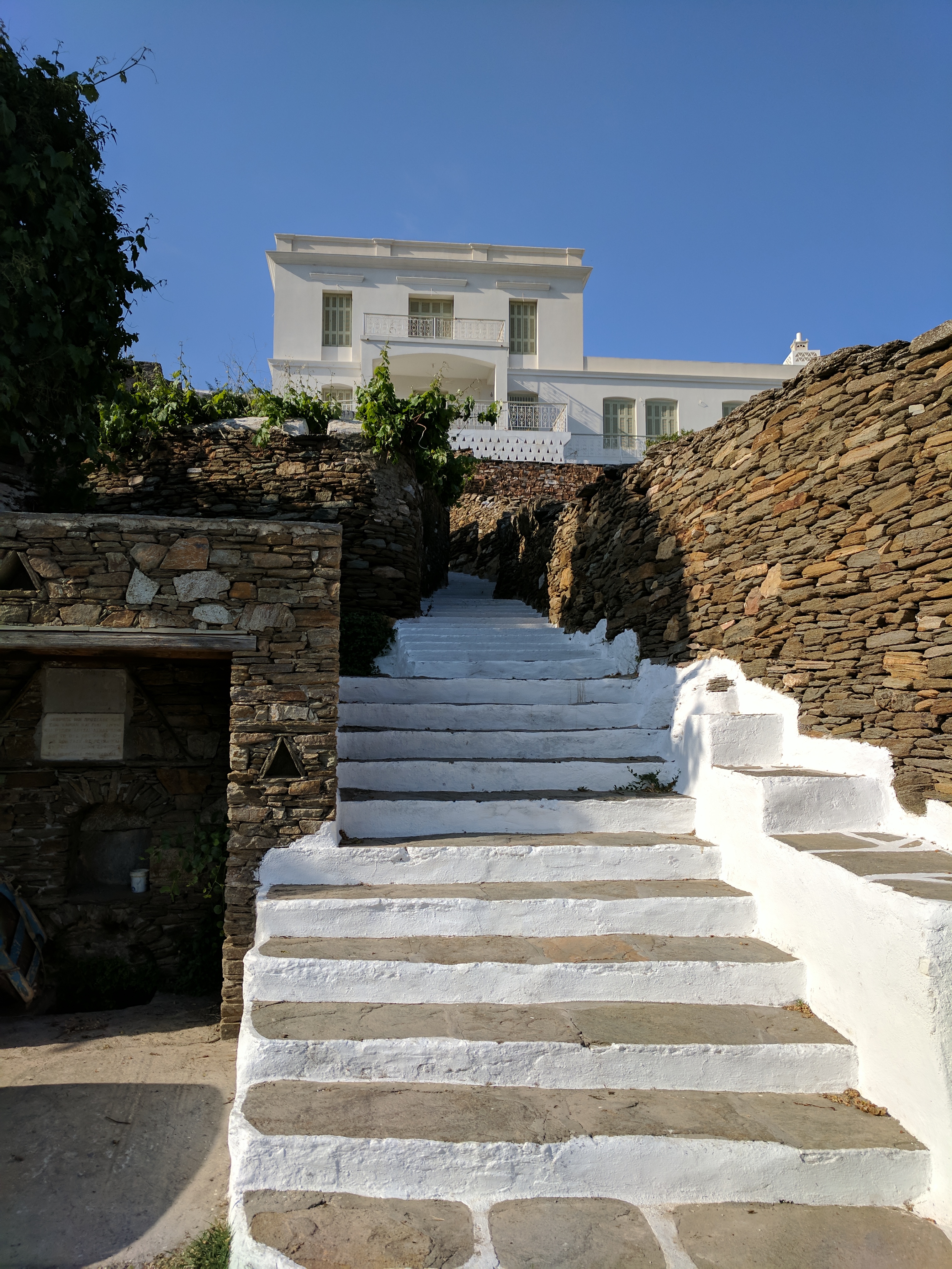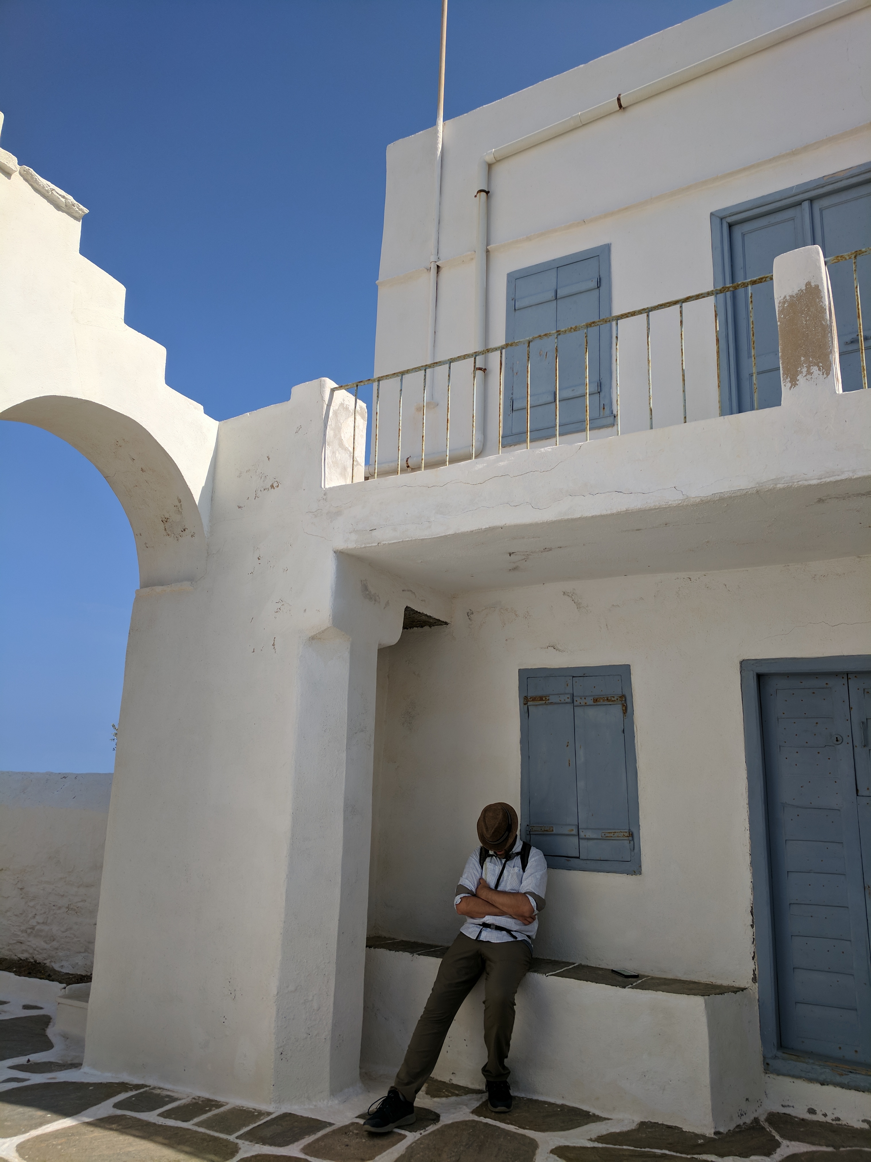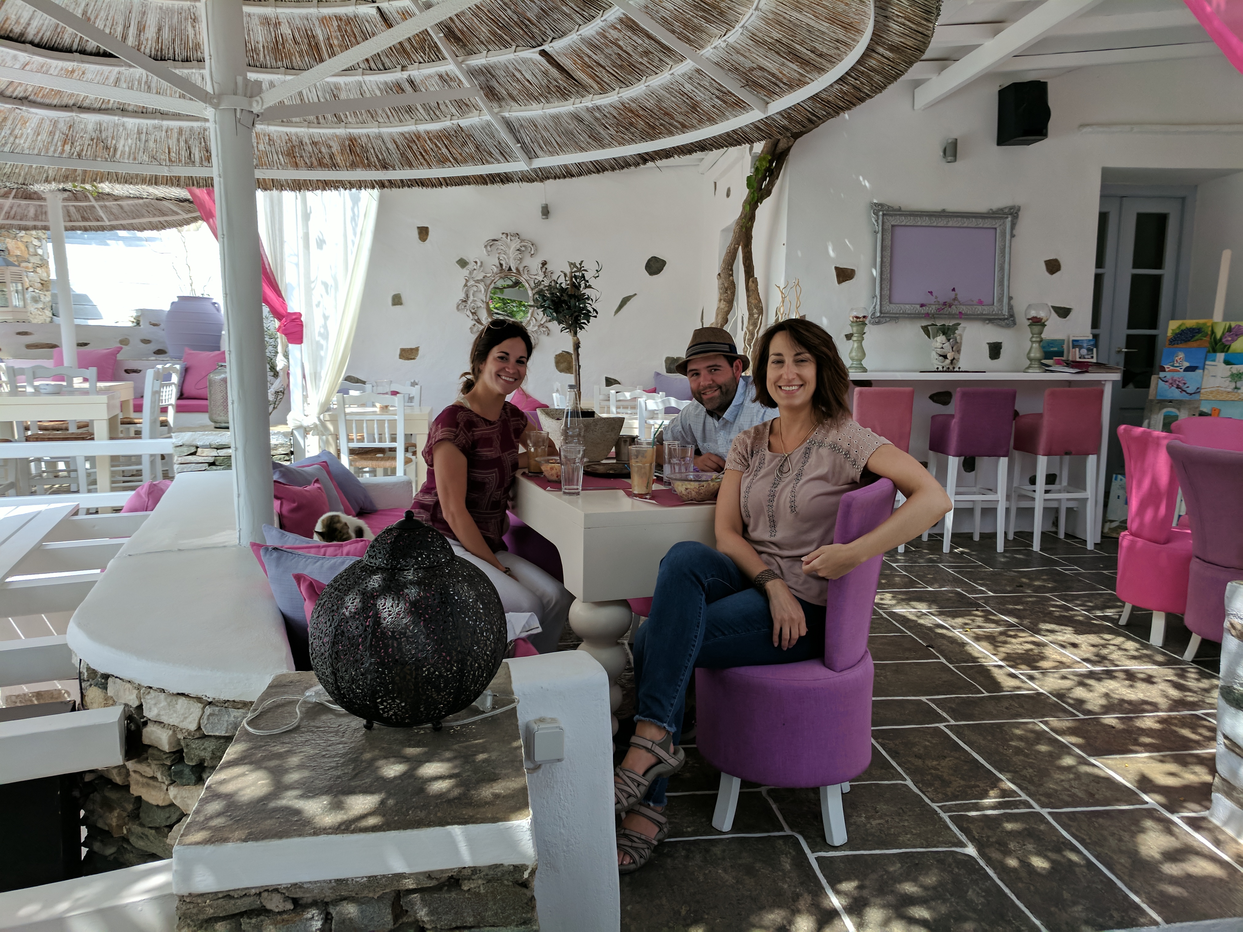 Of all the villages we visited (& we visited all except Cherronisos), Kastro was our favorite. The architecture alone was enough to make me drool, but the views from the Church of the Seven Martyrs (Eftamartyres) was what really stole our hearts. We didn’t walk down to the church that first day, but we did the next. Instead, we stopped for a leisurely lunch at Konaki, the “pink cafe” with the friendliest owner & best pastries in Kastro! If you go, make sure to go inside so you can see all the pastries she has & their pet snake. We had our first drinks of ouzo & frappes there & loved the place so much that we returned later in the trip.