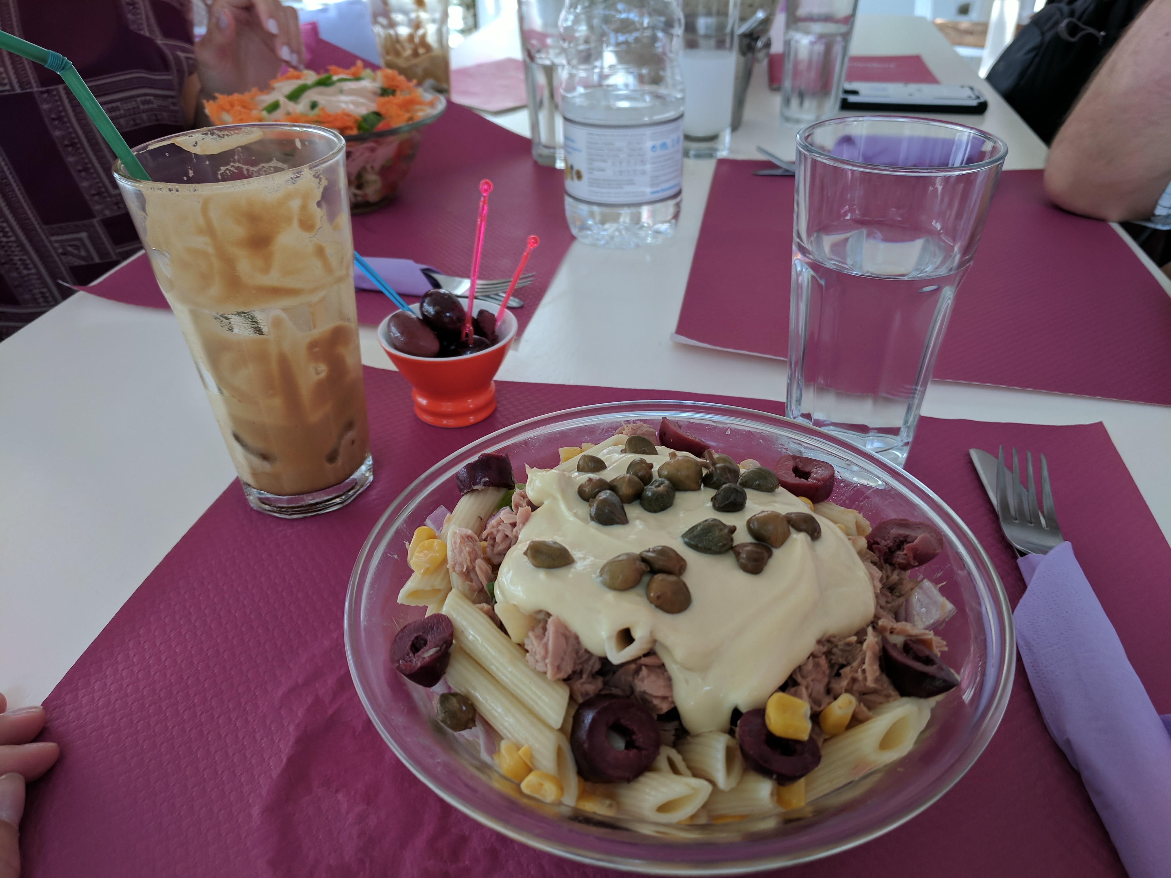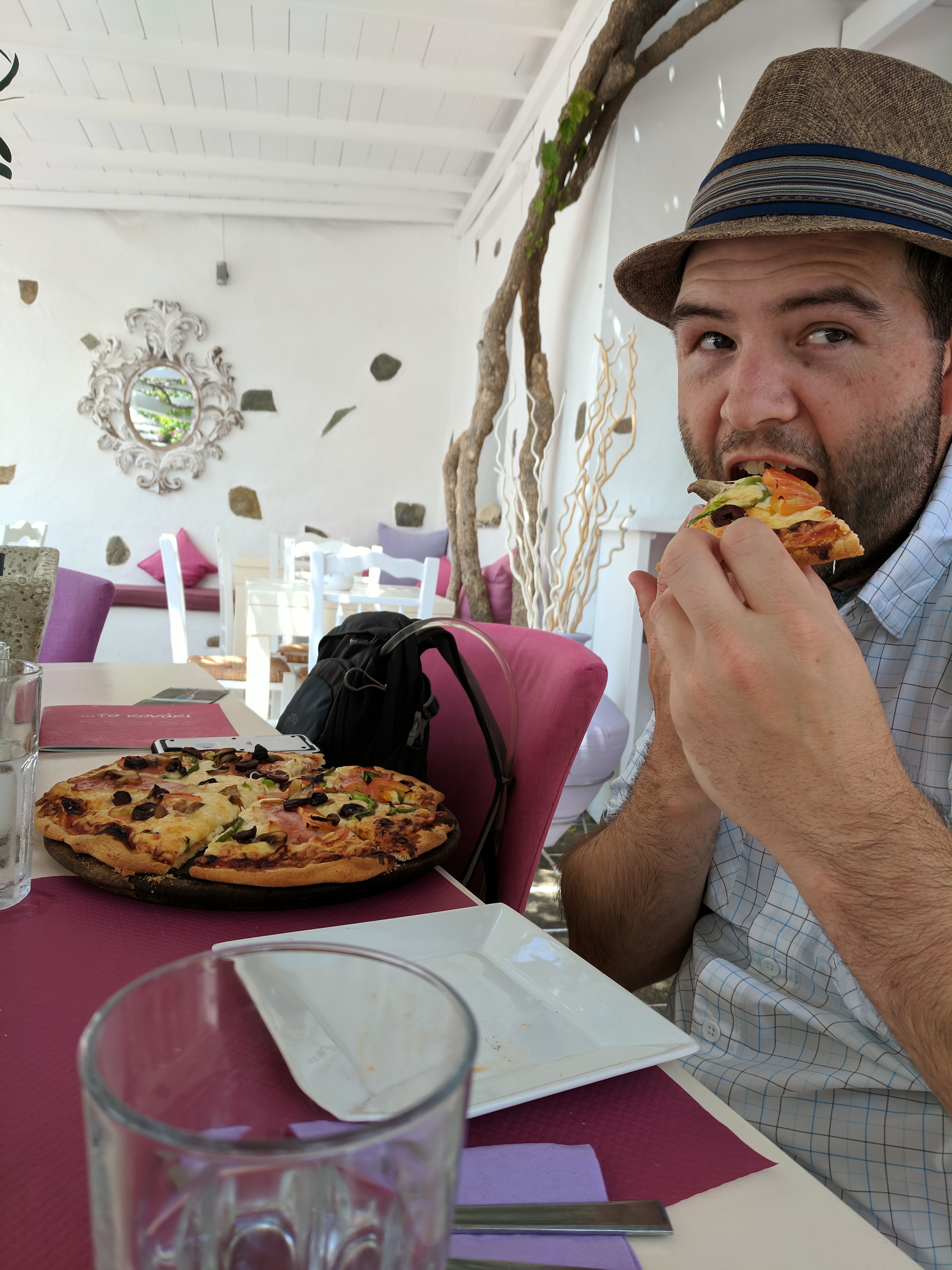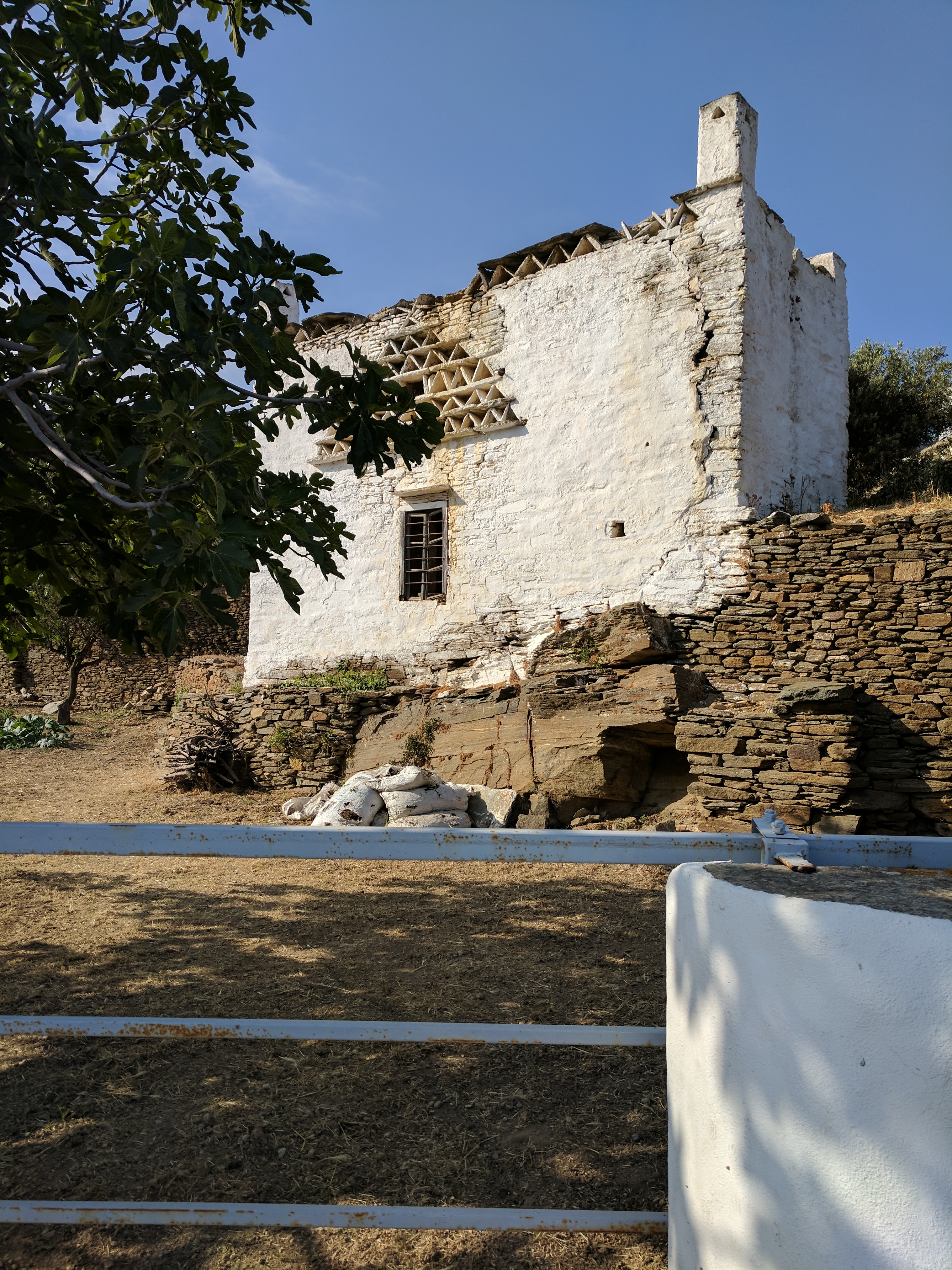 Of all the villages we visited (& we visited all except Cherronisos), Kastro was our favorite. The architecture alone was enough to make me drool, but the views from the Church of the Seven Martyrs (Eftamartyres) was what really stole our hearts. We didn’t walk down to the church that first day, but we did the next. Instead, we stopped for a leisurely lunch at Konaki, the “pink cafe” with the friendliest owner & best pastries in Kastro! If you go, make sure to go inside so you can see all the pastries she has & their pet snake. We had our first drinks of ouzo & frappes there & loved the place so much that we returned later in the trip.