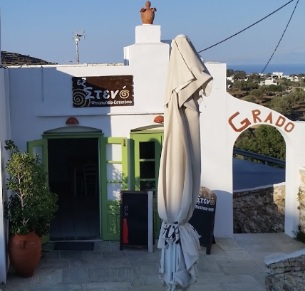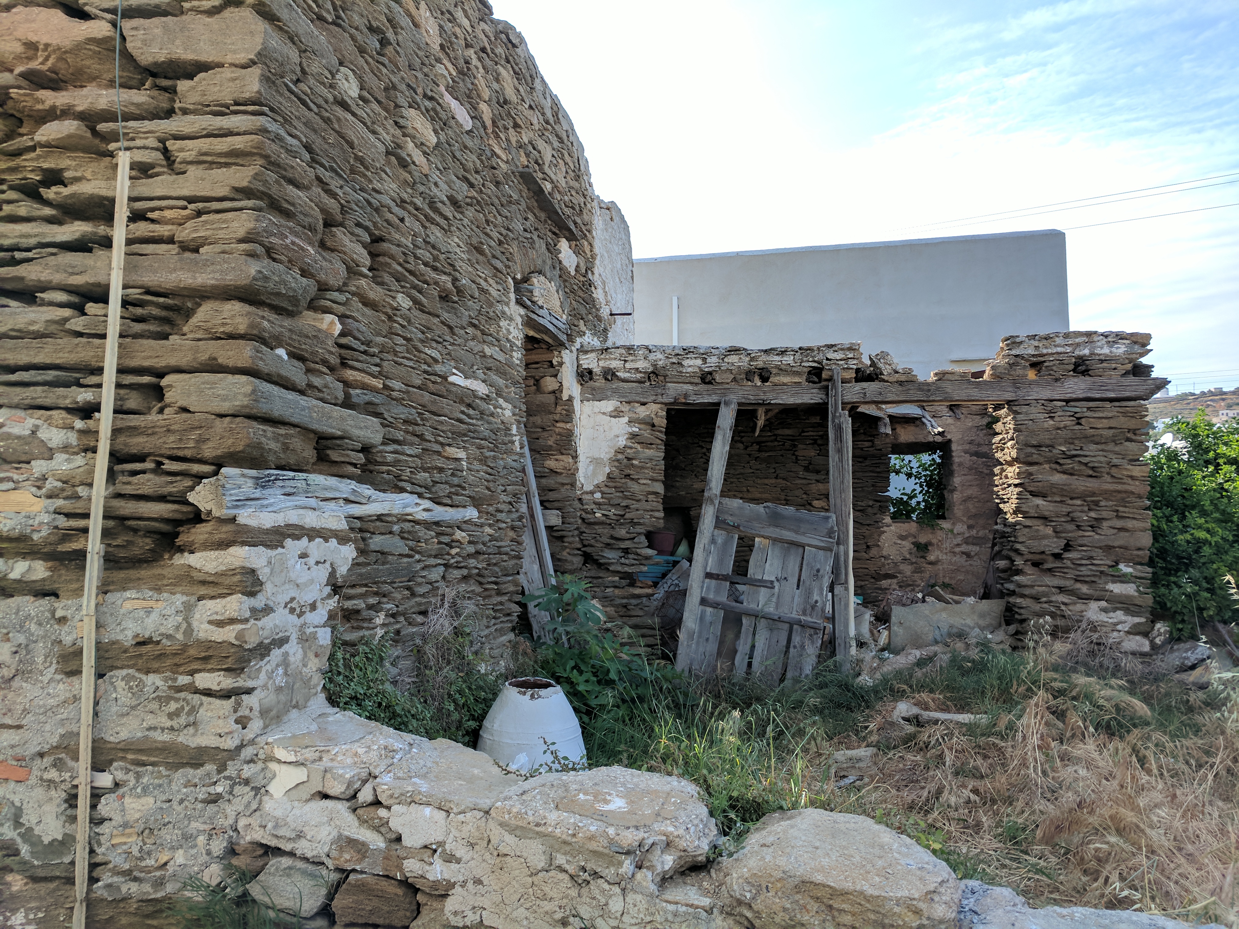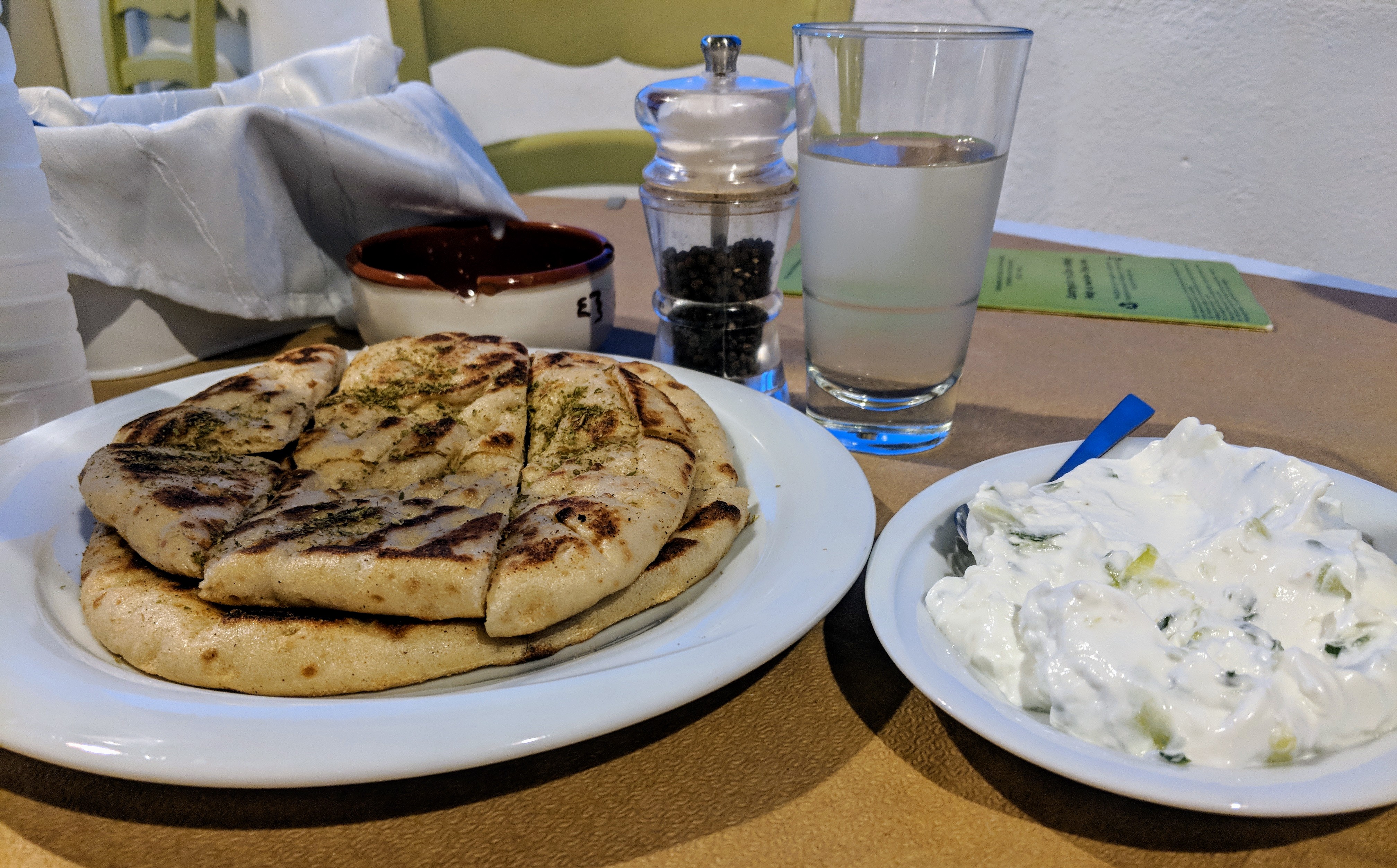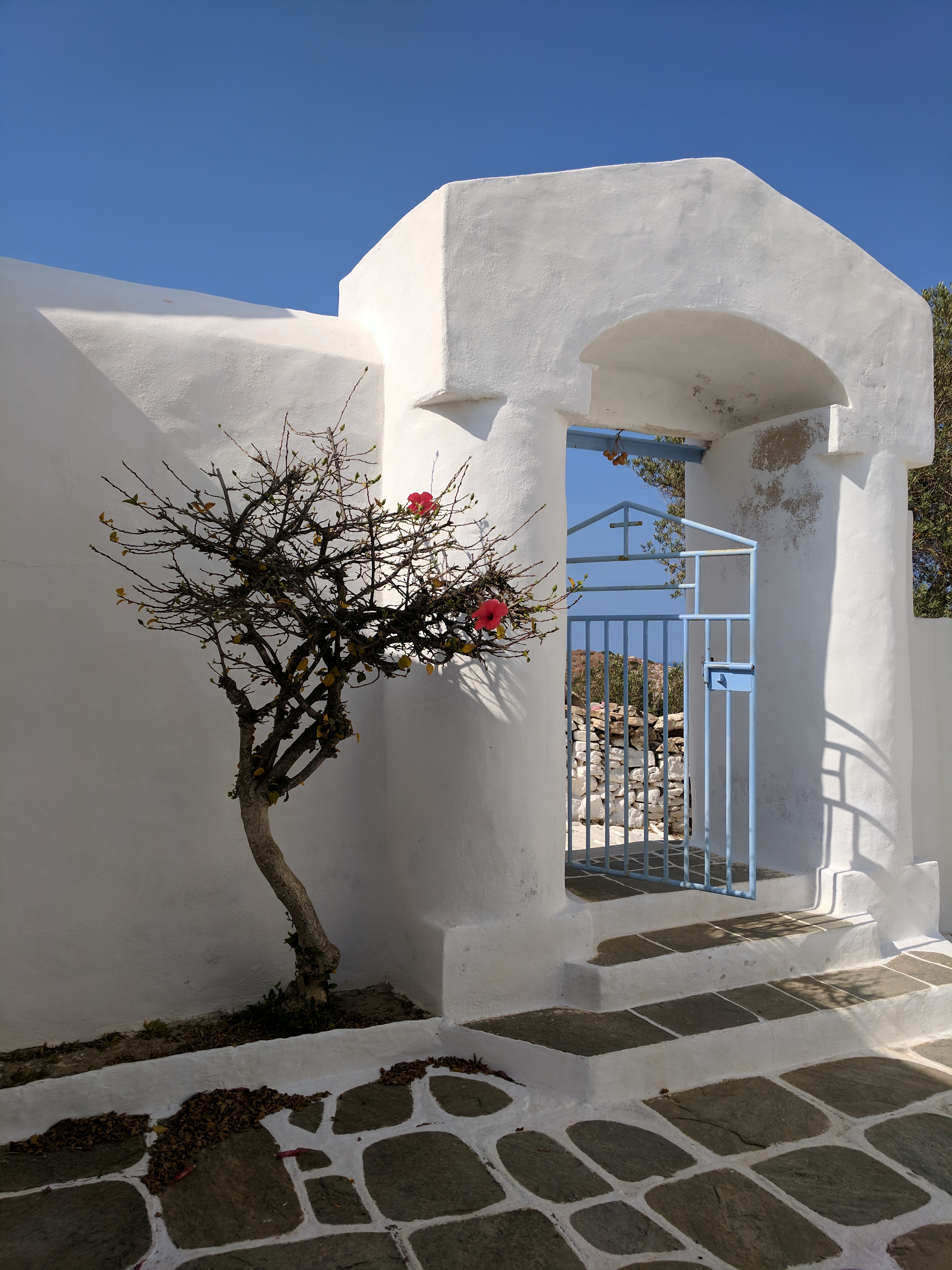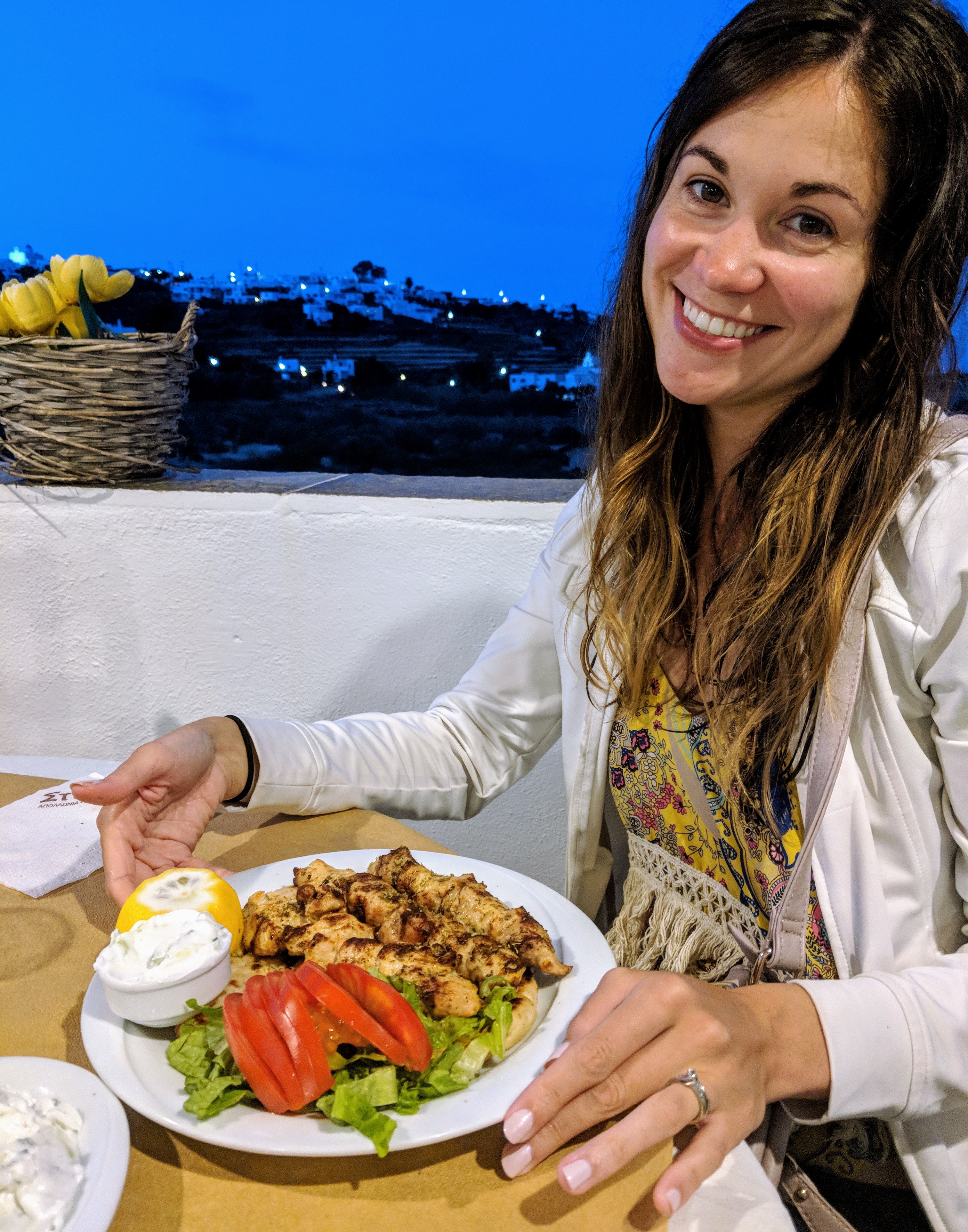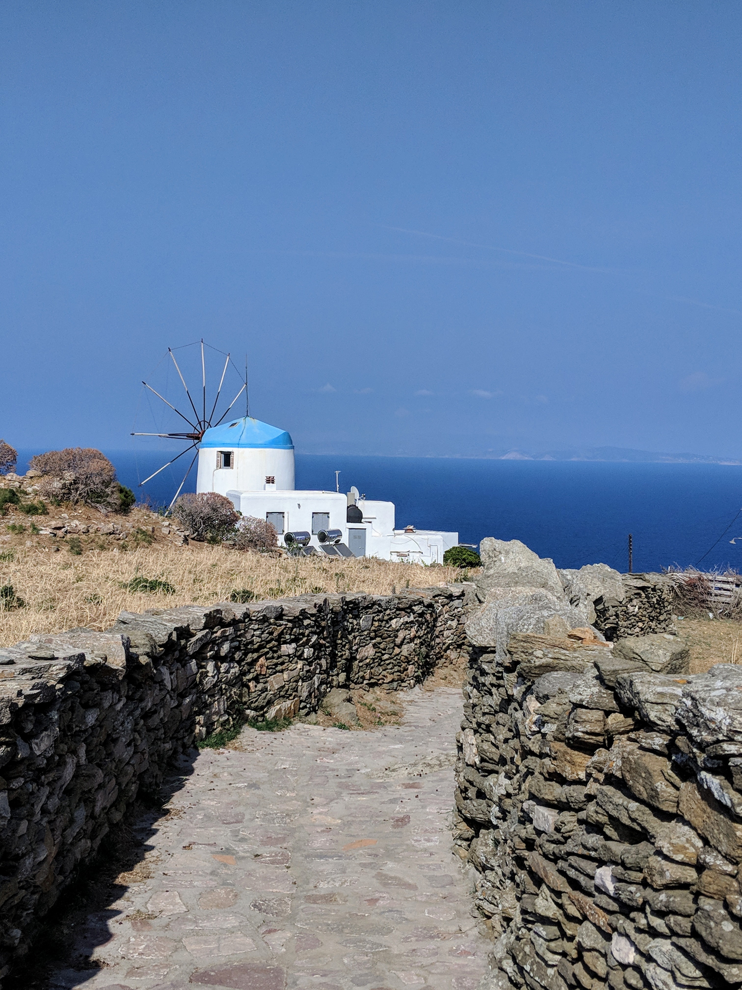 We continued to follow Trail 1 west back towards Apollonia, which brought us into the outskirts of Artemenos (the village just north of Apollonia). Trail 1 continued north into Artemenos, but we were exhausted & out of water. There was a supermarket where the trail met the main road, so we bought some water & headed back “home.” We ended our first night in Sifnos eating souvlaki & tzatziki at Ex Steno (next door to Peristeronas House). Agiliki had recommended it and the outside tables had gorgeous evening views of Artemenos lit up like hundreds of tiny stars. The waitress (might have been owner) was abrupt in a comedic way — when we’d try to order something she didn’t like (or didn’t have) she’d say “you don’t want that.” I liked her, she had character.