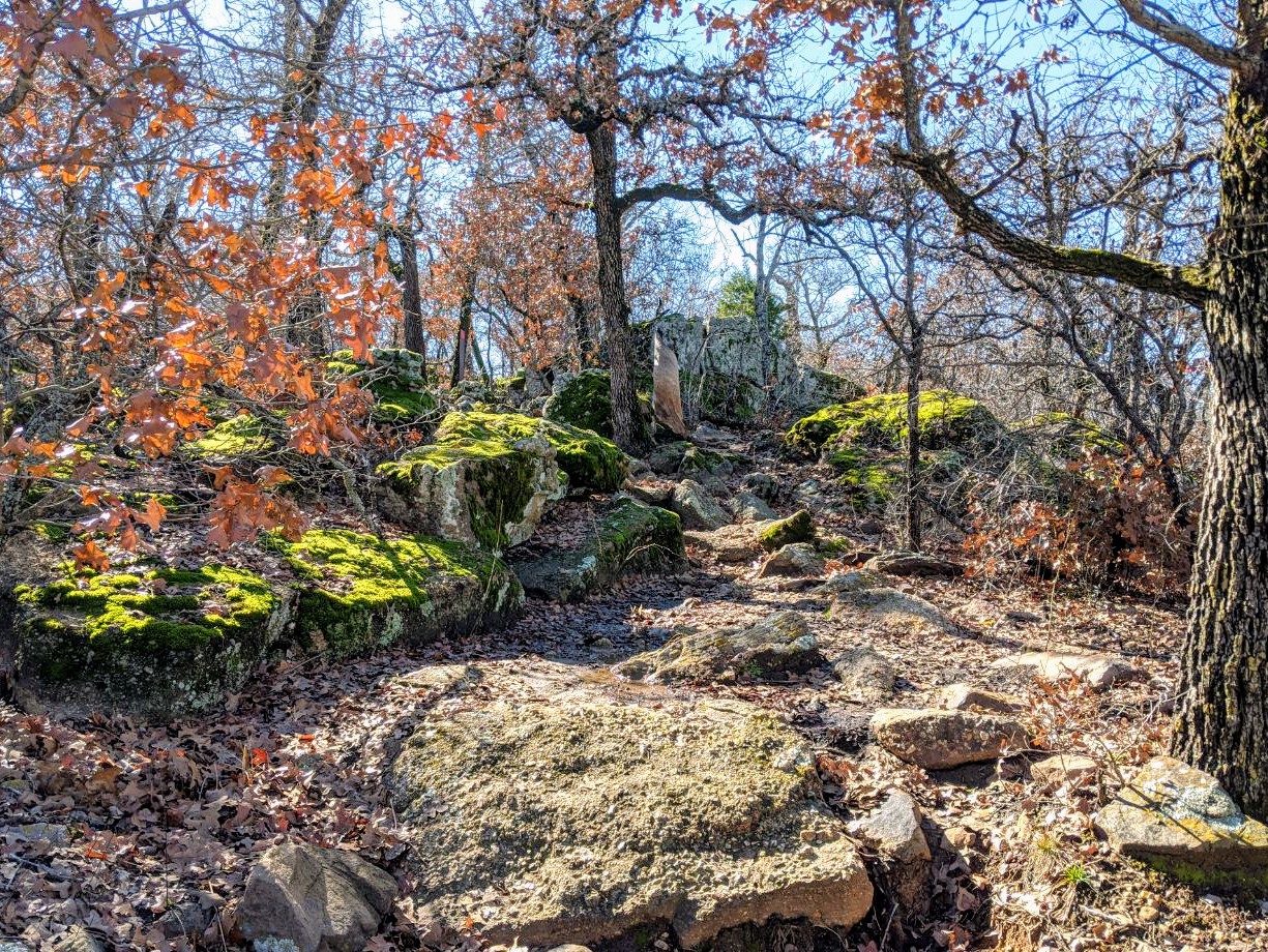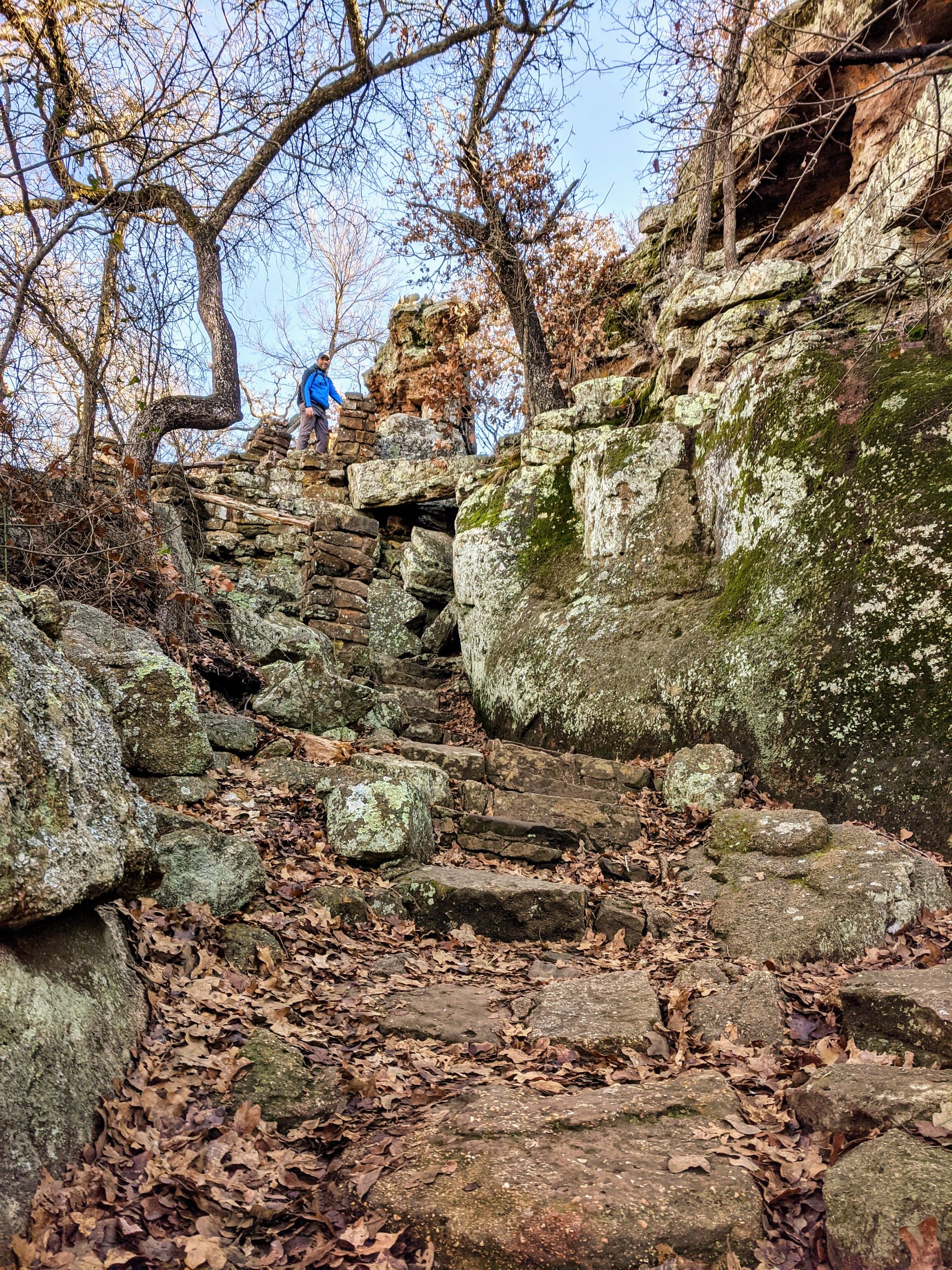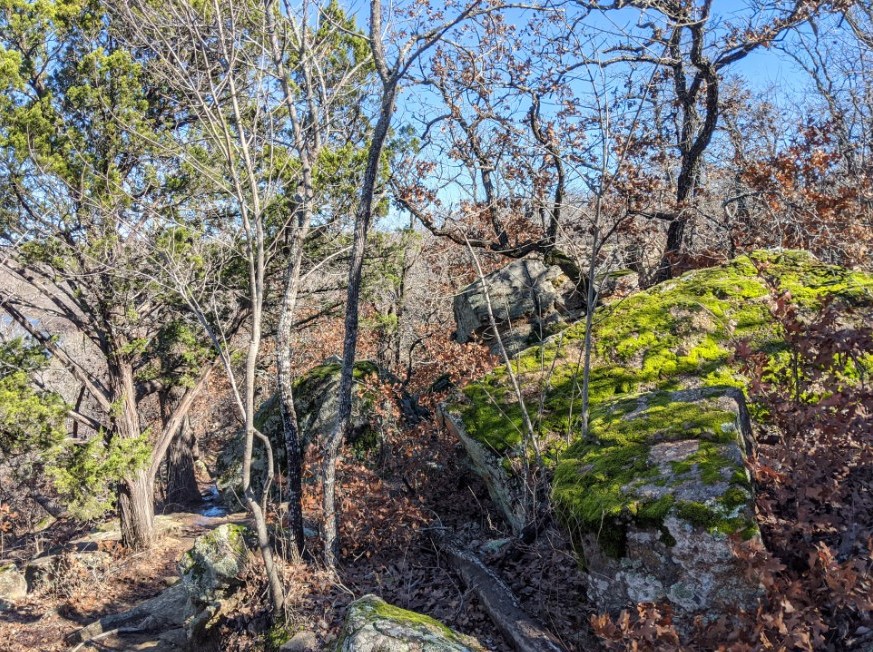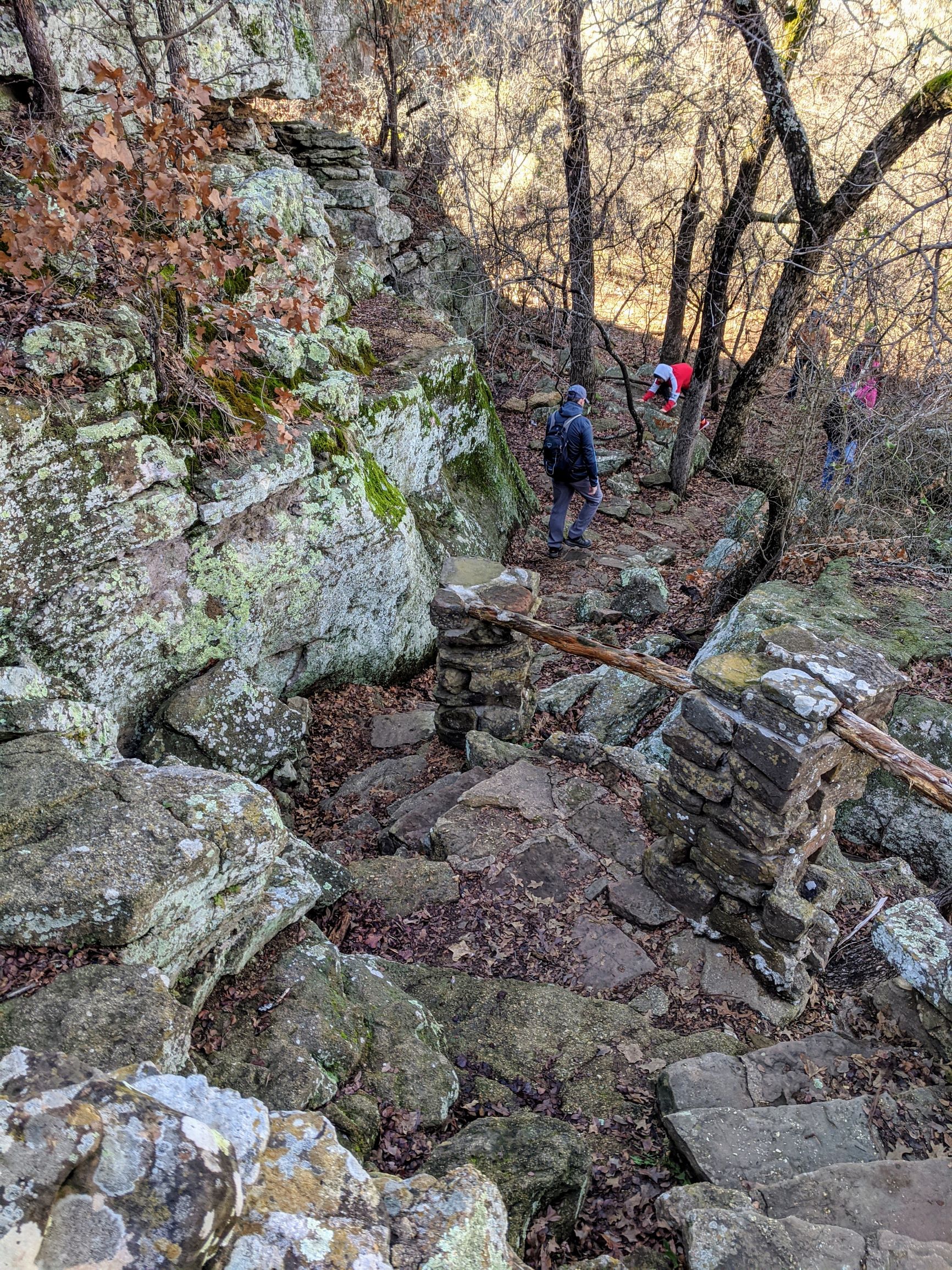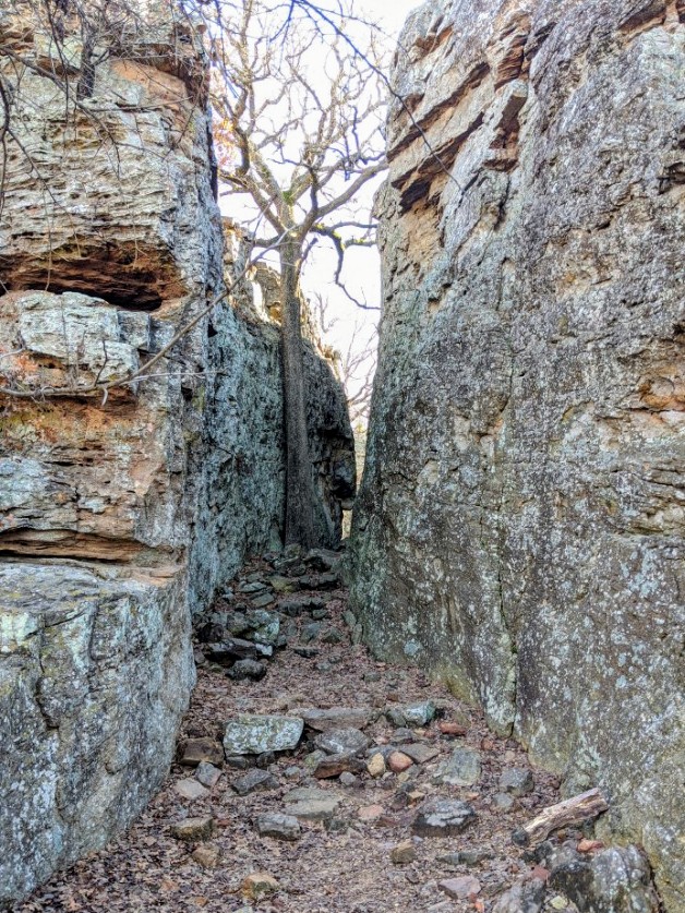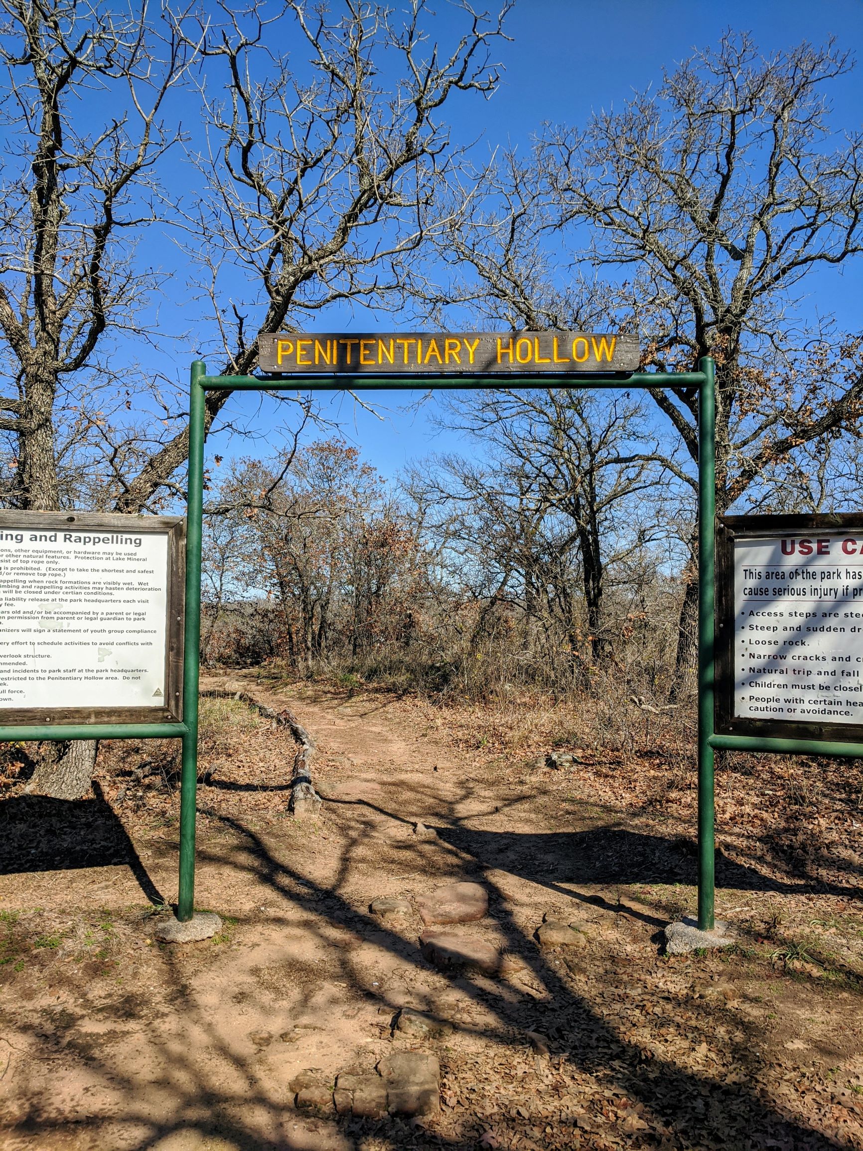 The trails at Lake Mineral Wells can be very challenging in terms of footwork, which is why we liked it so much. We walked the Red Waterfront Trail which is just under 2 miles round trip but feels like a much longer hike. The terrain is very rocky and includes a walk through a small rock canyon called Penitentiary Hollow, which gets its name from the fact that cattle thieves were rumored to hide their stolen cattle in these rocks. Anyone found in the area was likely to end up in the local prison.