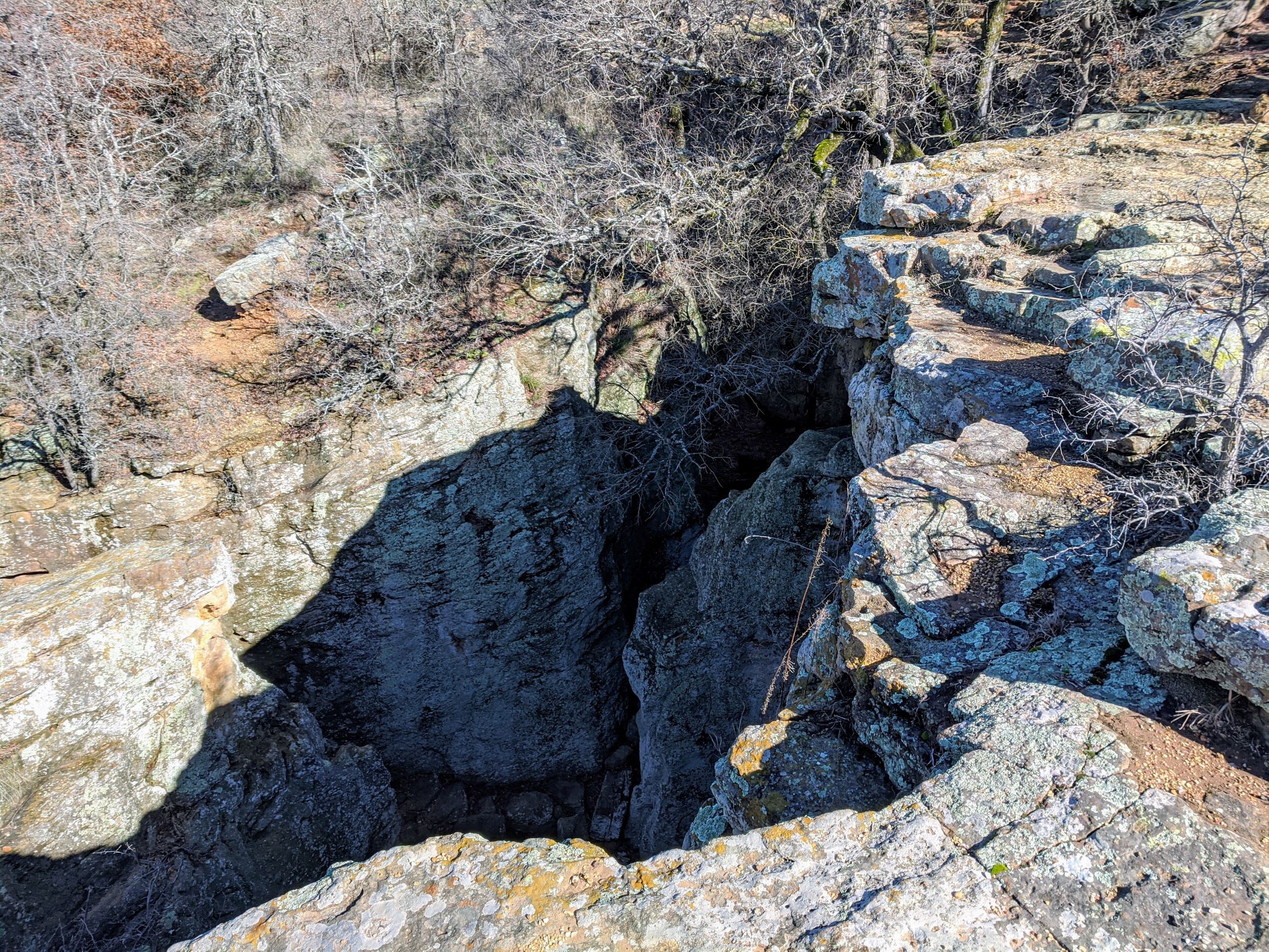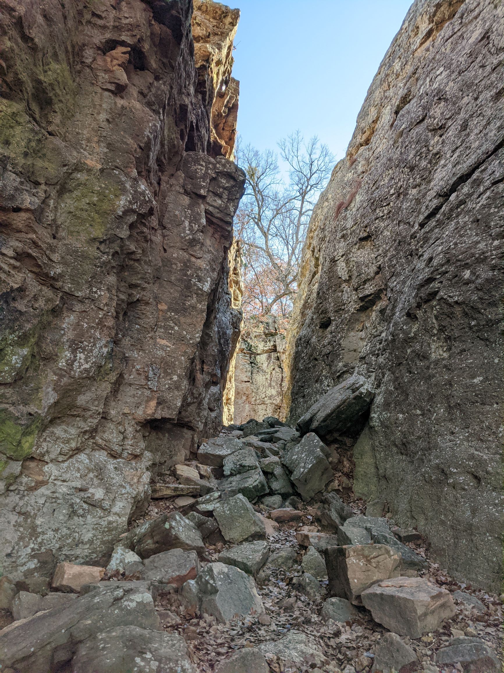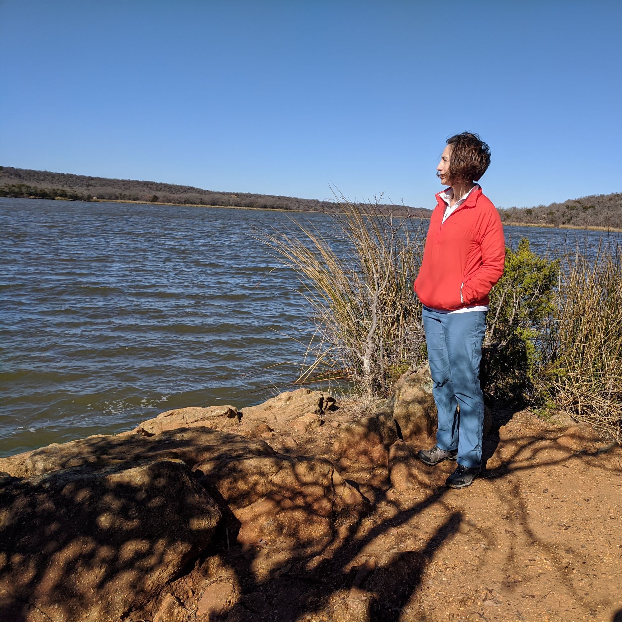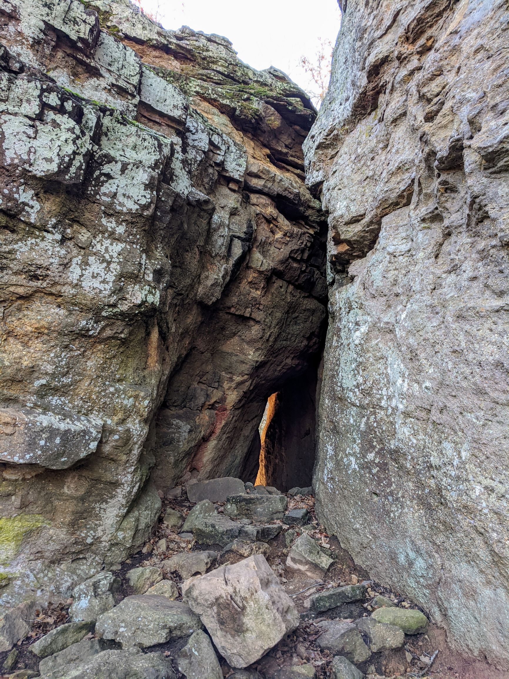 The trails at Lake Mineral Wells can be very challenging in terms of footwork, which is why we liked it so much. We walked the Red Waterfront Trail which is just under 2 miles round trip but feels like a much longer hike. The terrain is very rocky and includes a walk through a small rock canyon called Penitentiary Hollow, which gets its name from the fact that cattle thieves were rumored to hide their stolen cattle in these rocks. Anyone found in the area was likely to end up in the local prison.