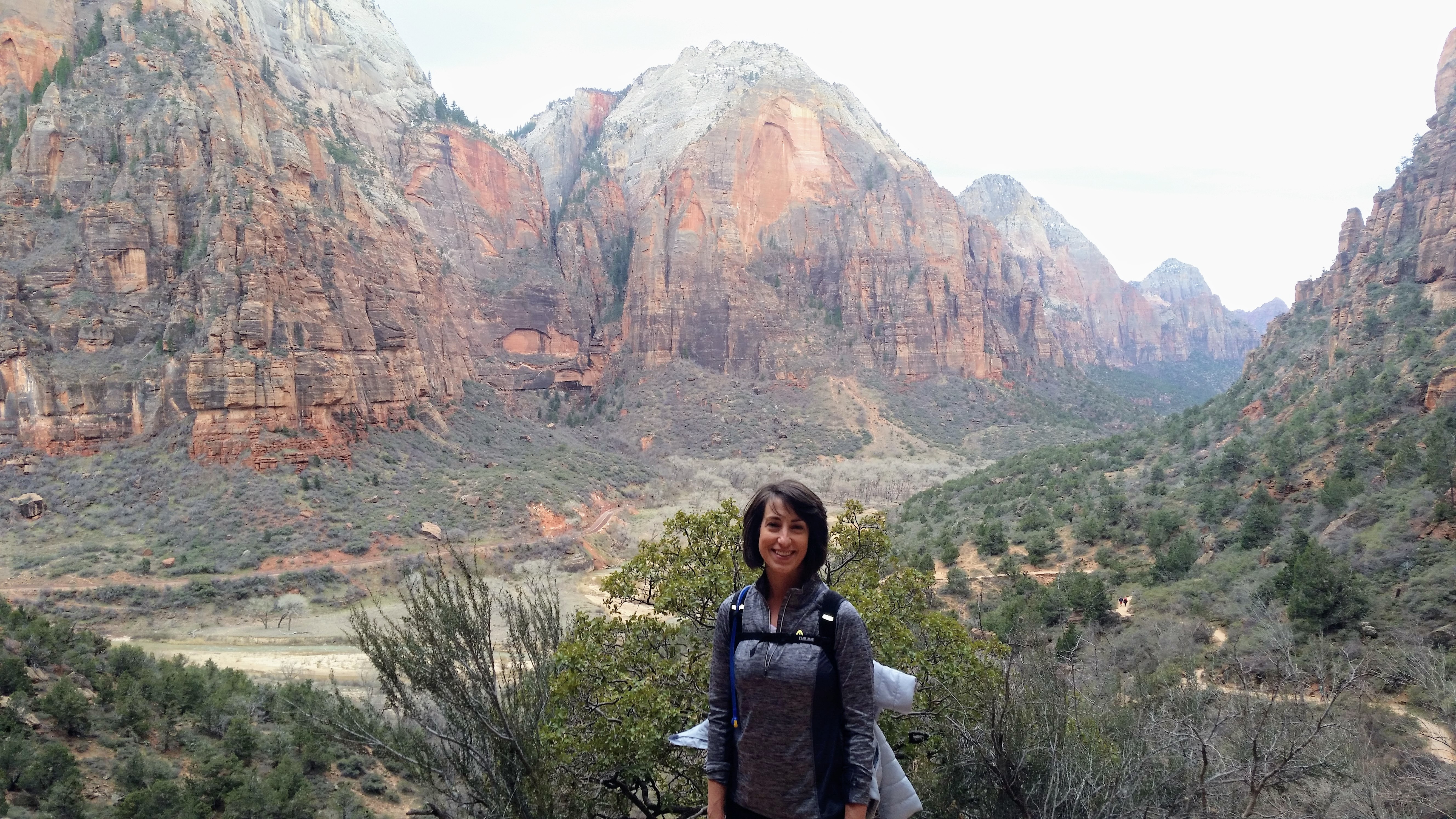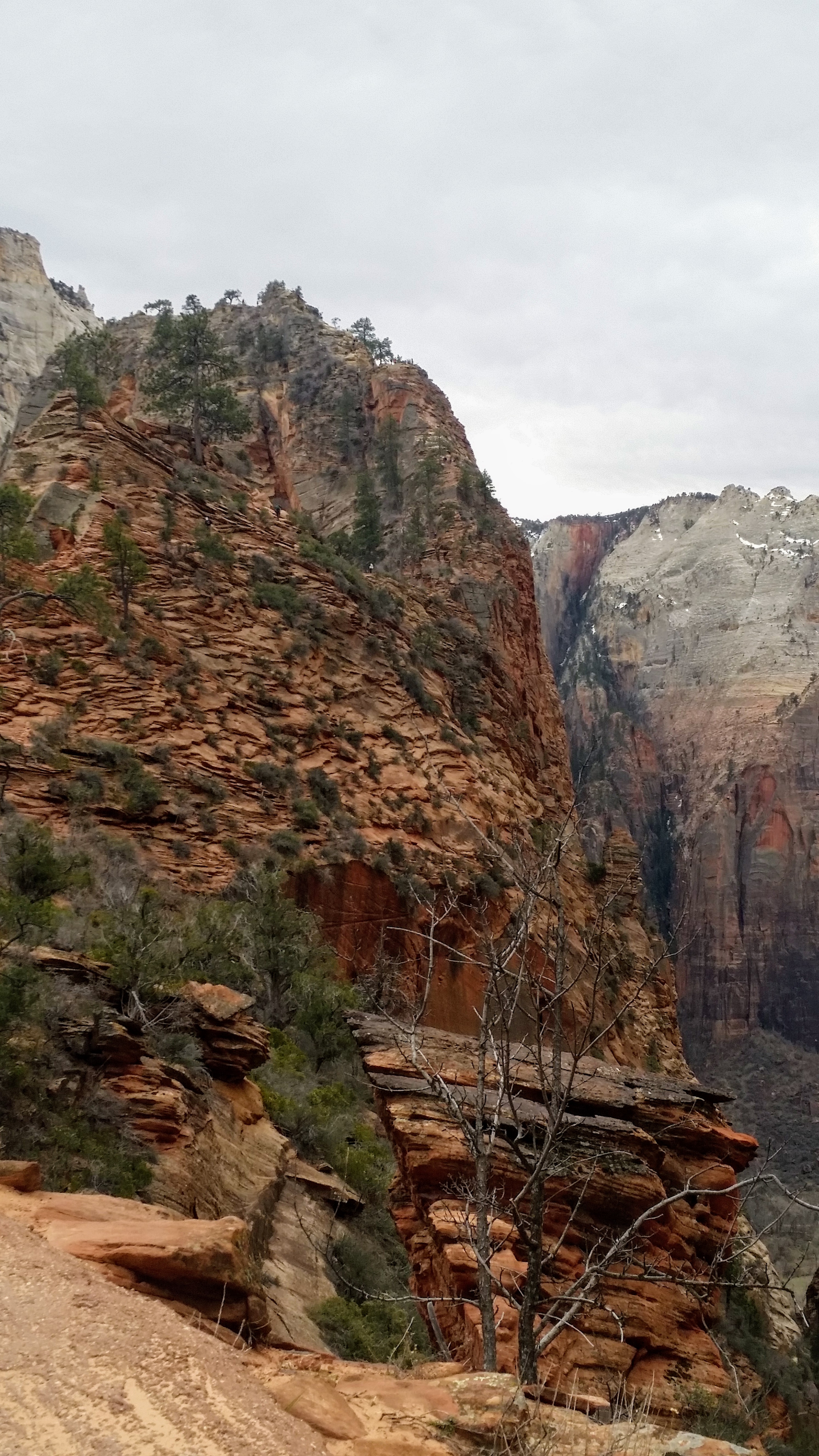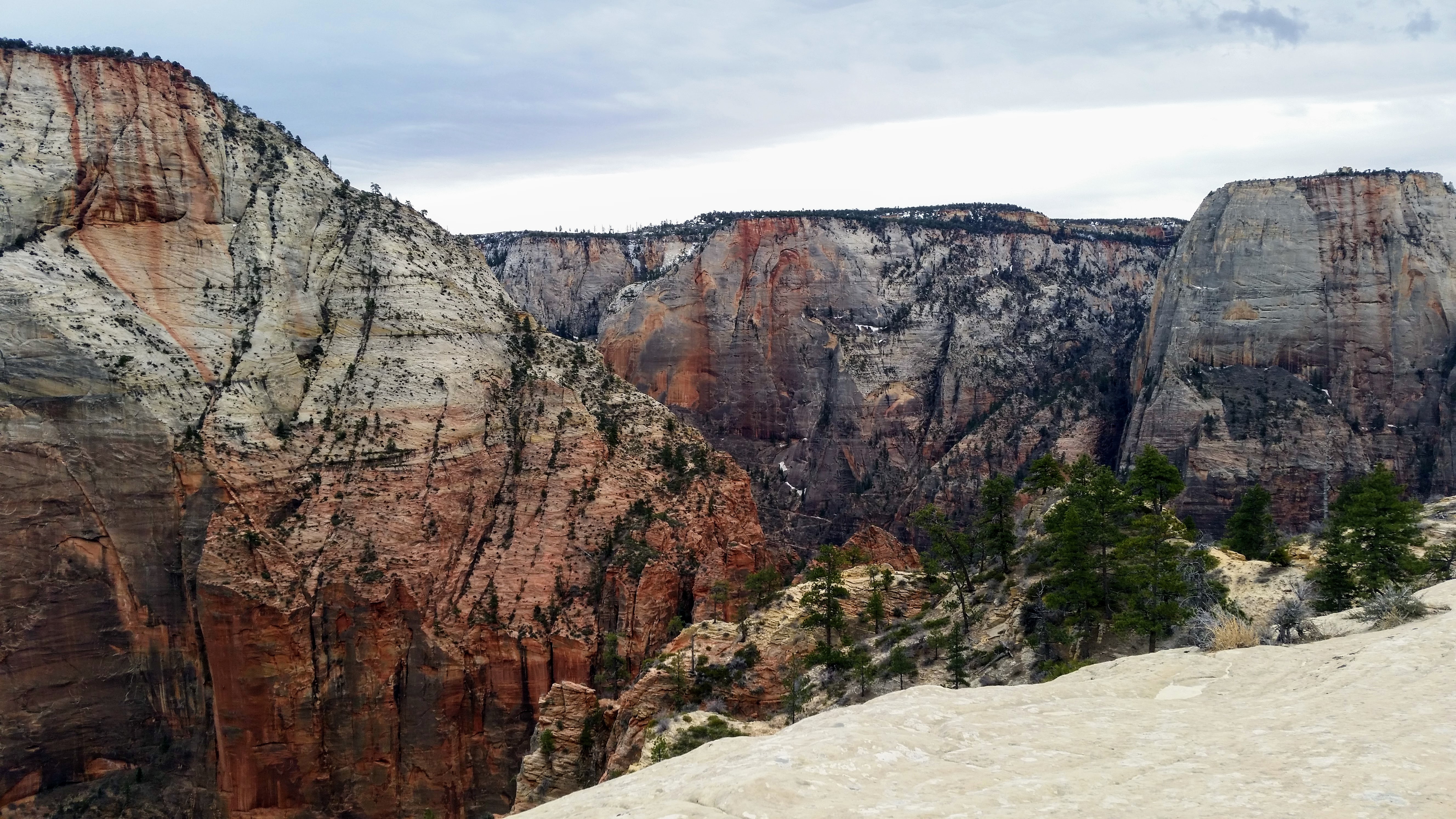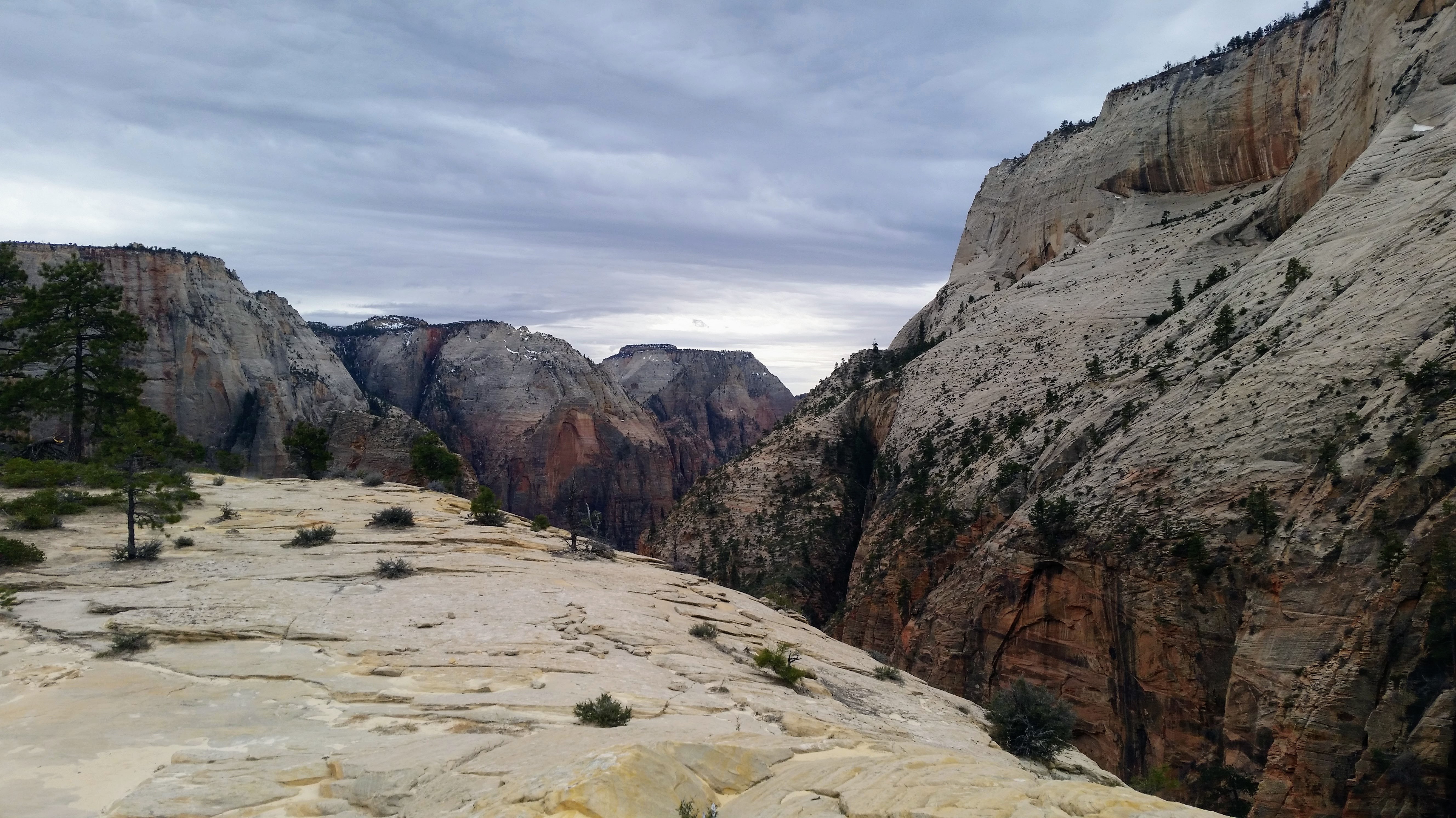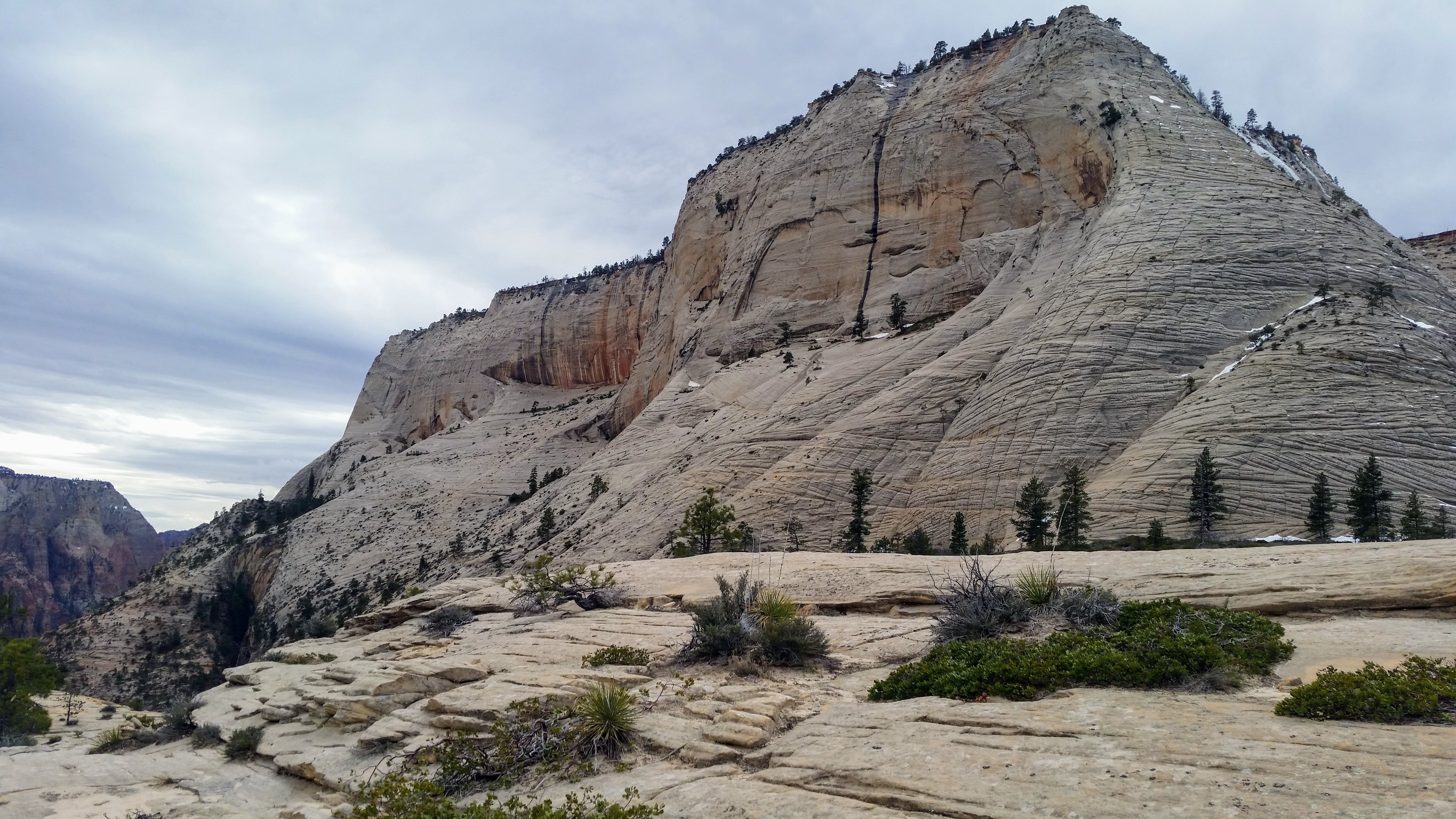 After our dizzying climb up the wiggles, we arrived at Scout Lookout which is where most people stopped, either giving up and returning the 2.1 miles back to Grotto OR risking their lives for a selfie up Angel’s Landing. We decided to take a potty break (there’s a portable potty here…quite nasty but the trail is too popular for a quick pee) and then kept going up the West Rim Trail. Past that point we saw very few hikers and the temperature dropped dramatically. The rock colors changed as well, going from brown to yellow to white. When we reached the upper plateau, there was snow on the ground and we had to put our coats on and cover our faces to protect from the wind. That was the best viewpoint we’ve had yet — we could see most of the park and I truly felt like a speck of sand in the vast universe. The West Rim Trail totals 14.2 miles one-way, which we didn’t have time to complete, so we turned around at the plateau and headed back down to the Grotto Picnic Area.
