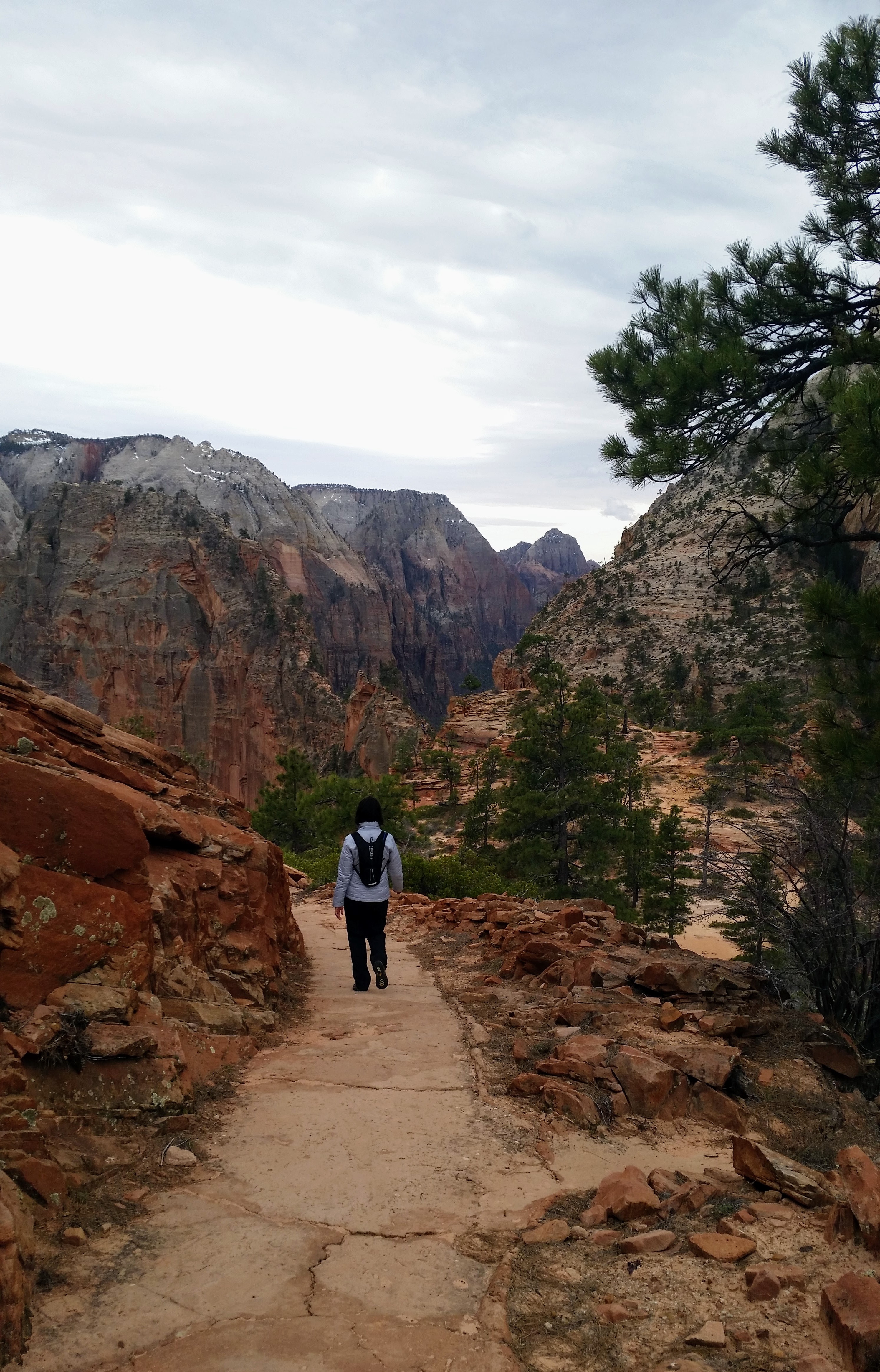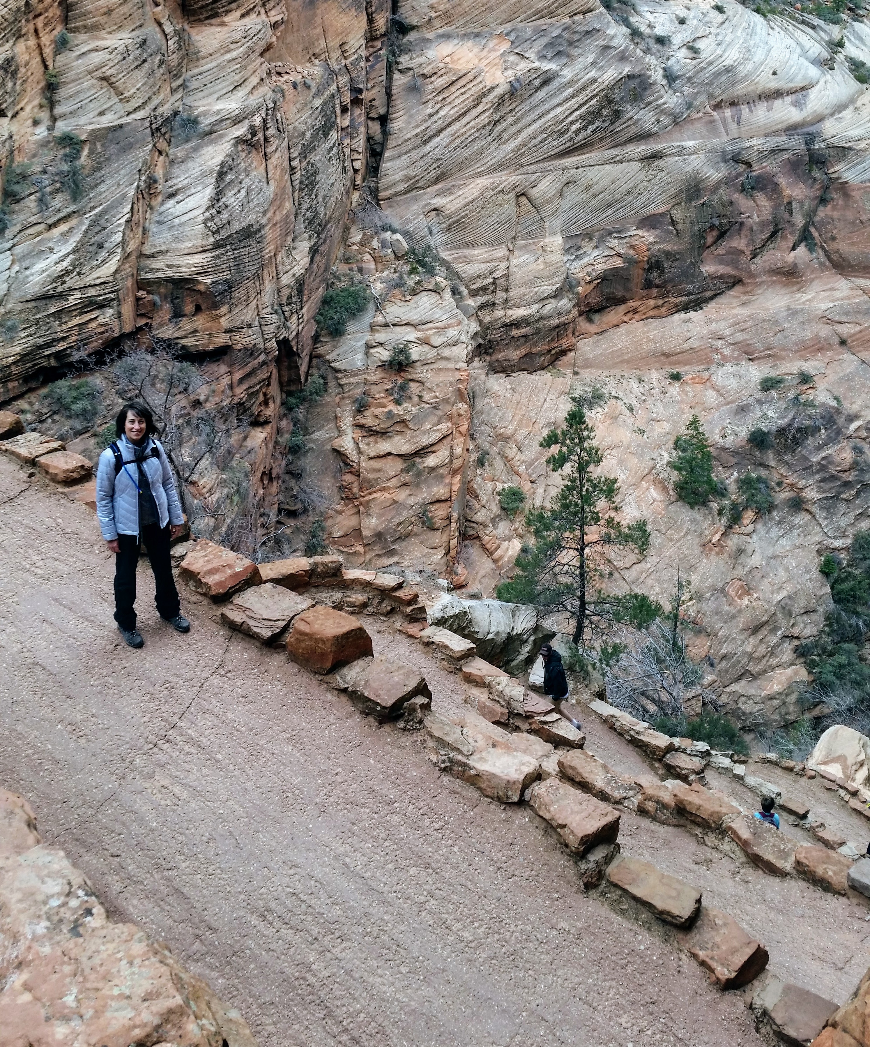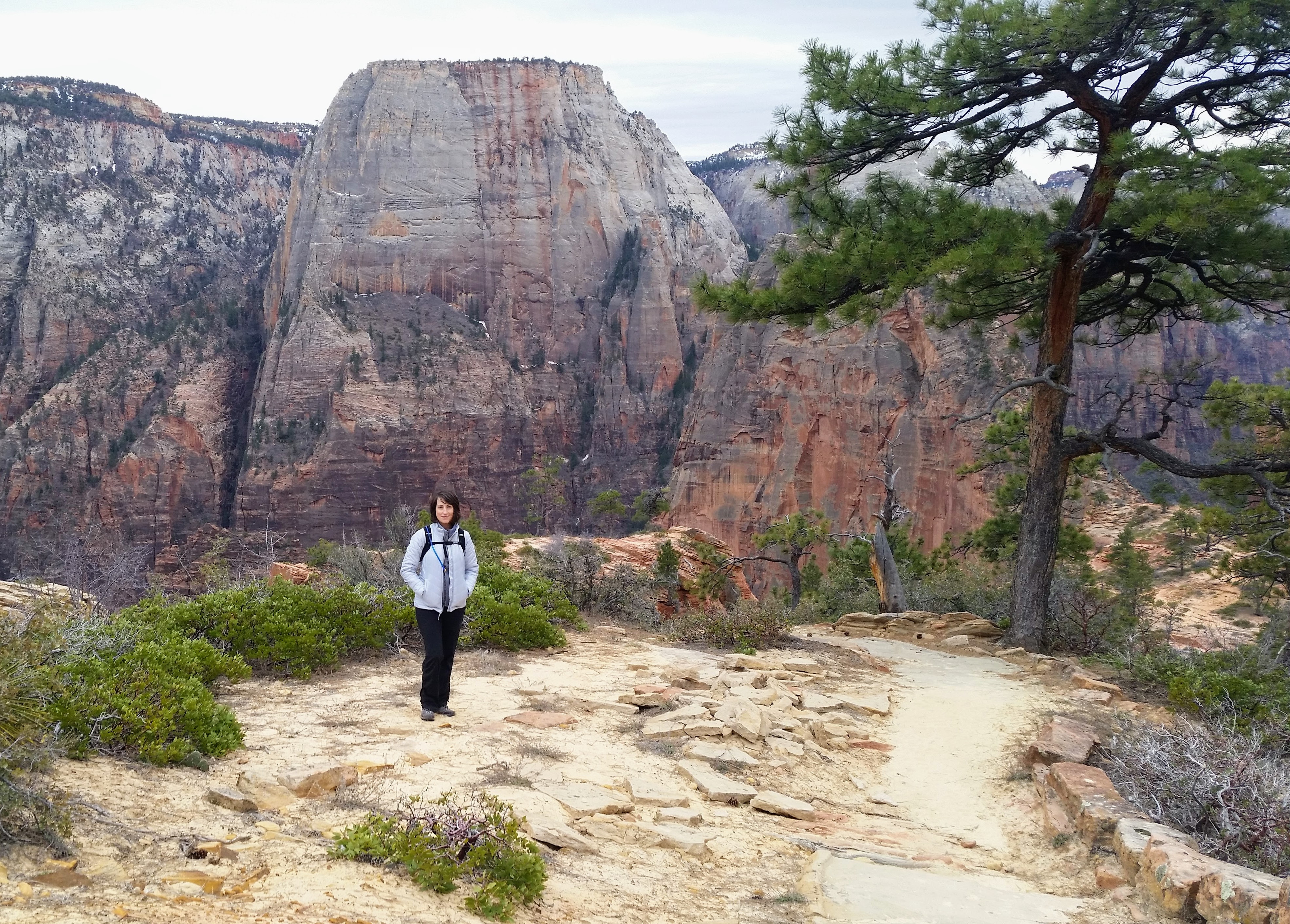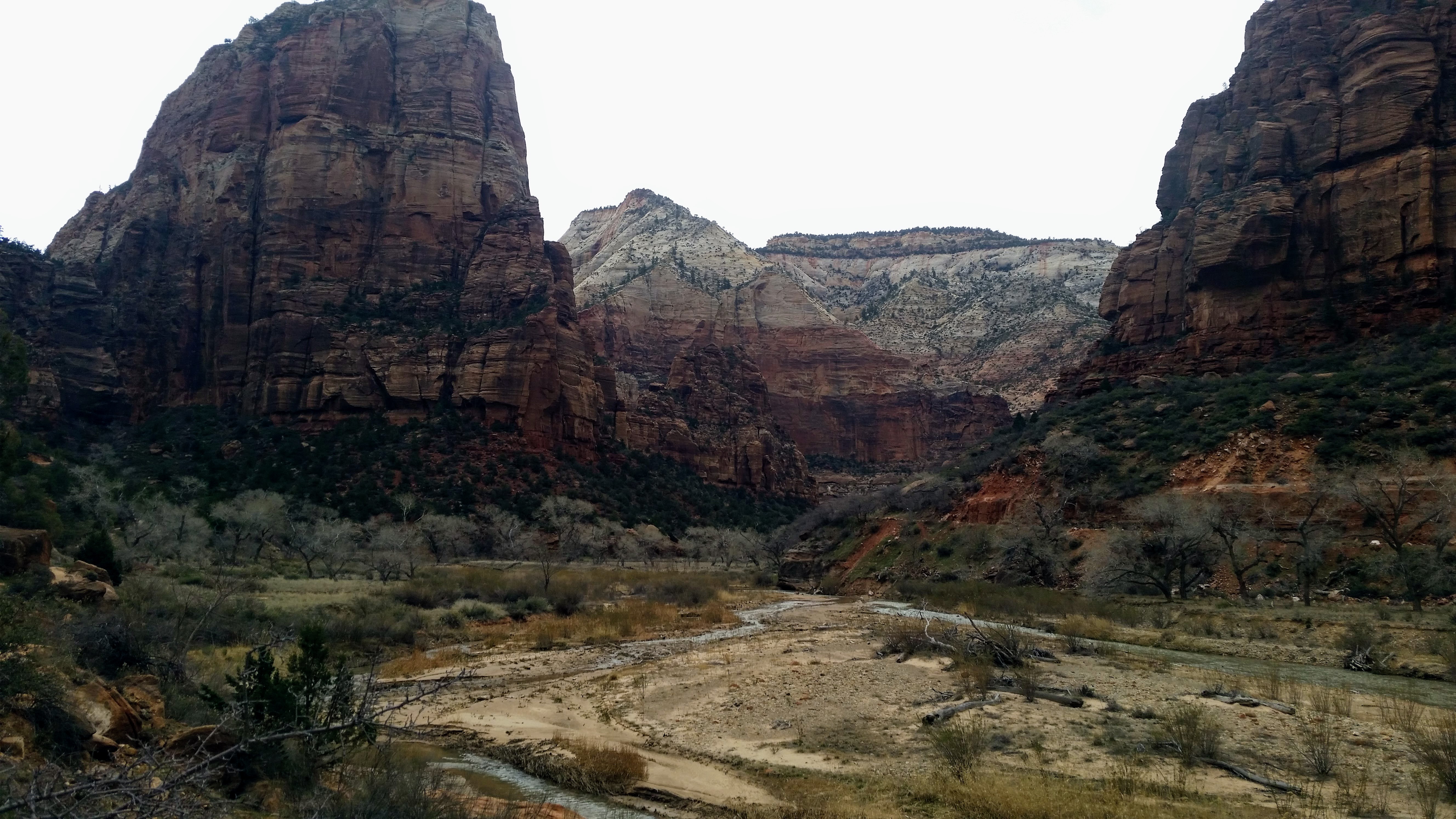 After our dizzying climb up the wiggles, we arrived at Scout Lookout which is where most people stopped, either giving up and returning the 2.1 miles back to Grotto OR risking their lives for a selfie up Angel’s Landing. We decided to take a potty break (there’s a portable potty here…quite nasty but the trail is too popular for a quick pee) and then kept going up the West Rim Trail. Past that point we saw very few hikers and the temperature dropped dramatically. The rock colors changed as well, going from brown to yellow to white. When we reached the upper plateau, there was snow on the ground and we had to put our coats on and cover our faces to protect from the wind. That was the best viewpoint we’ve had yet — we could see most of the park and I truly felt like a speck of sand in the vast universe. The West Rim Trail totals 14.2 miles one-way, which we didn’t have time to complete, so we turned around at the plateau and headed back down to the Grotto Picnic Area.