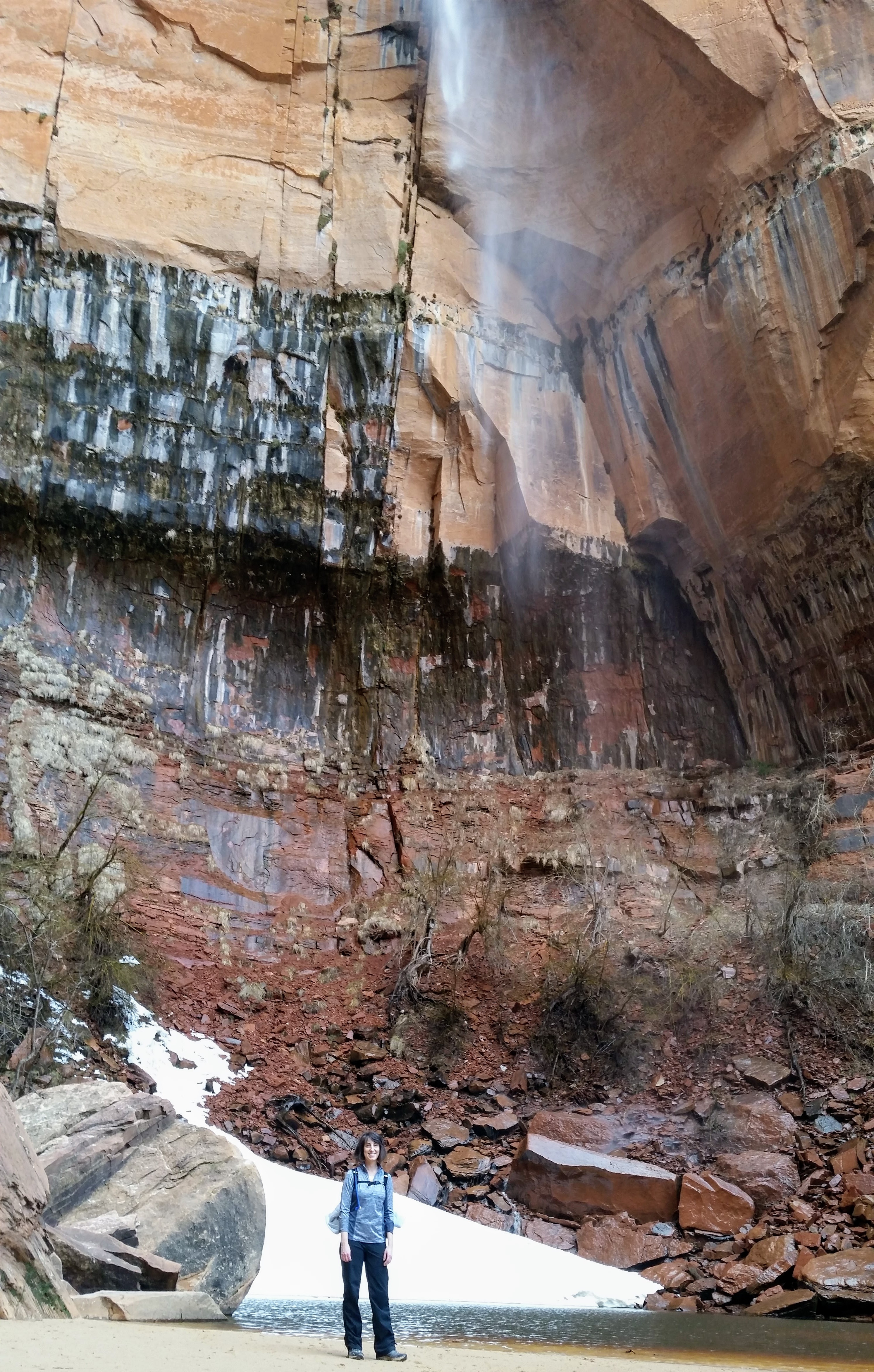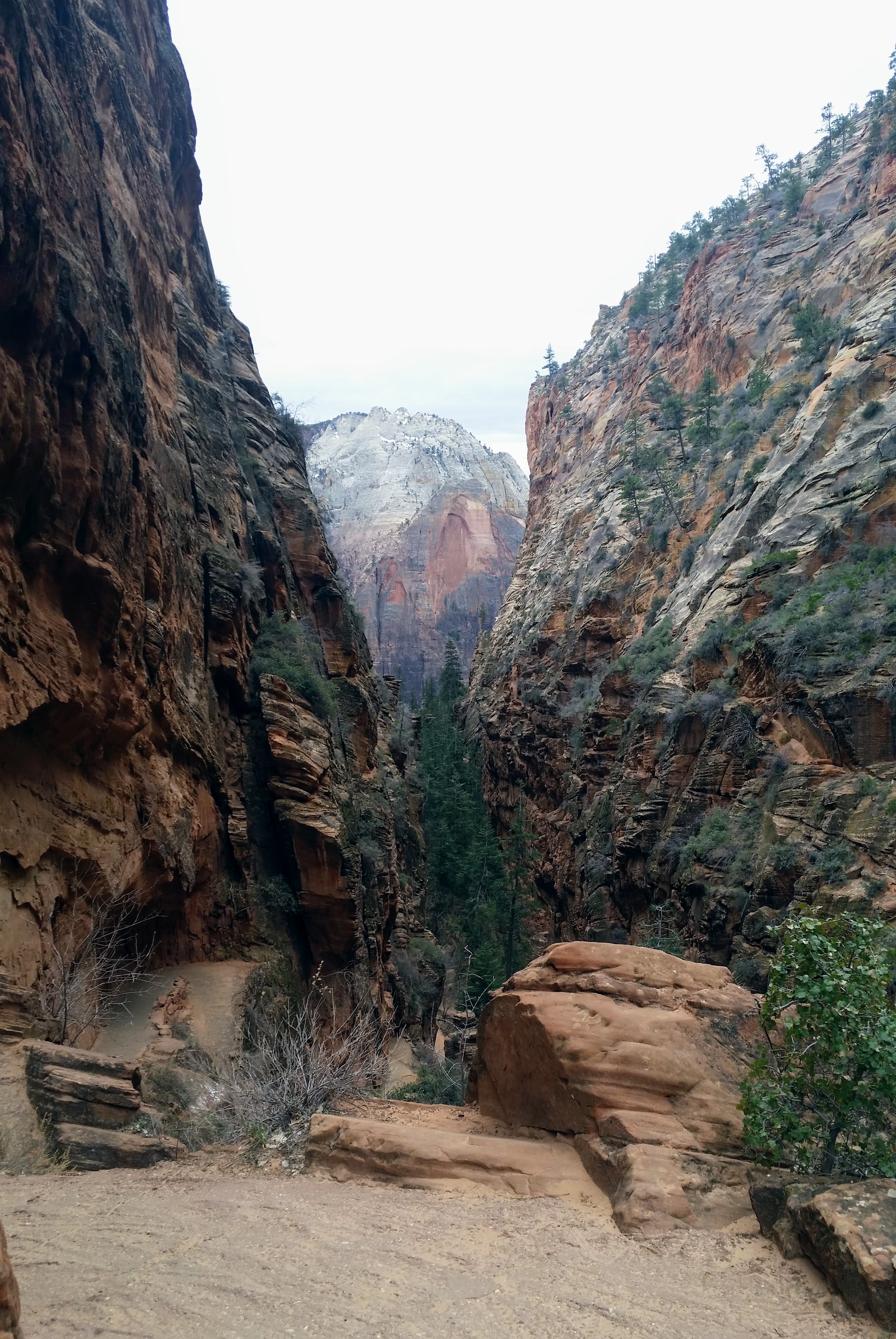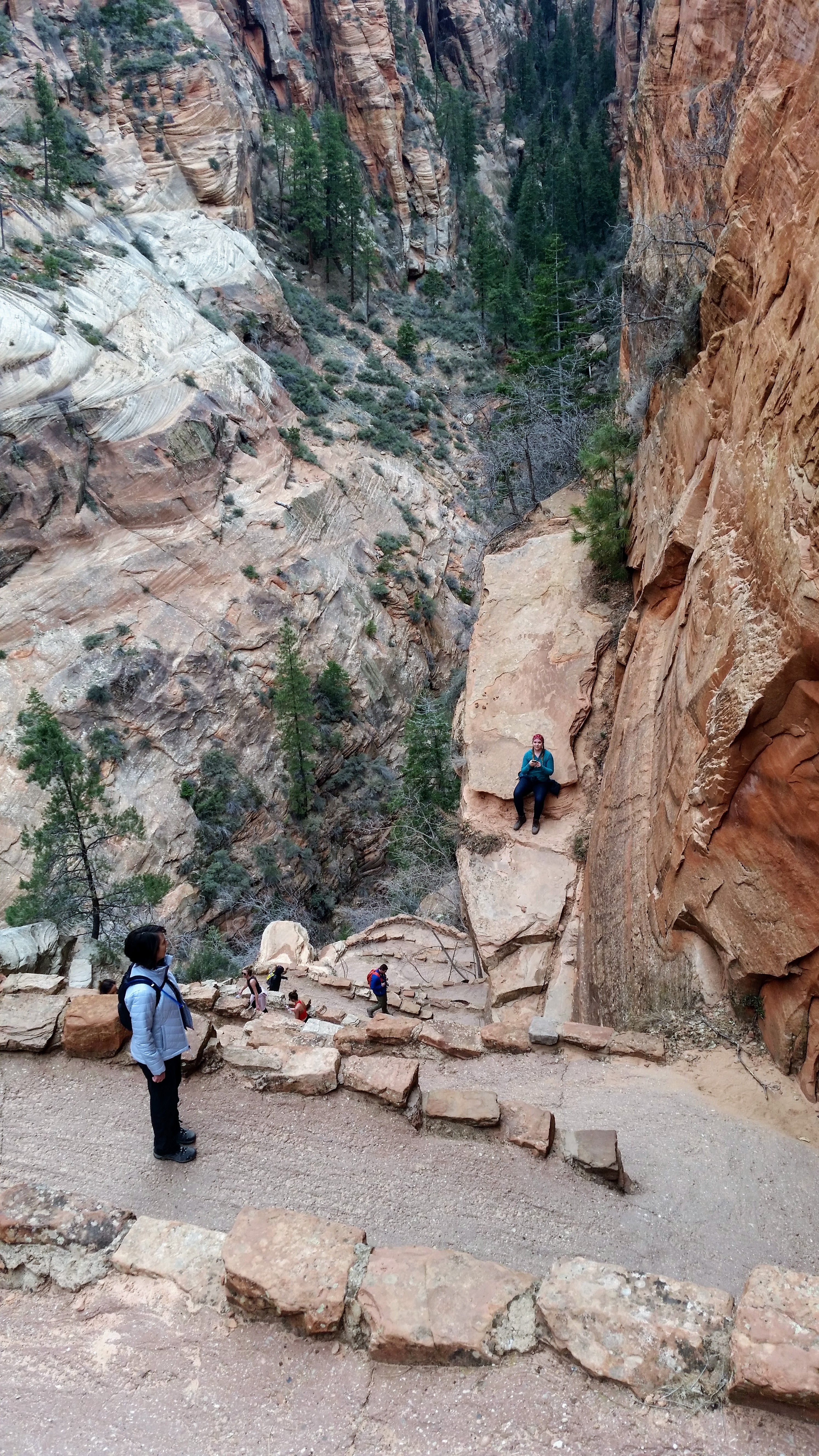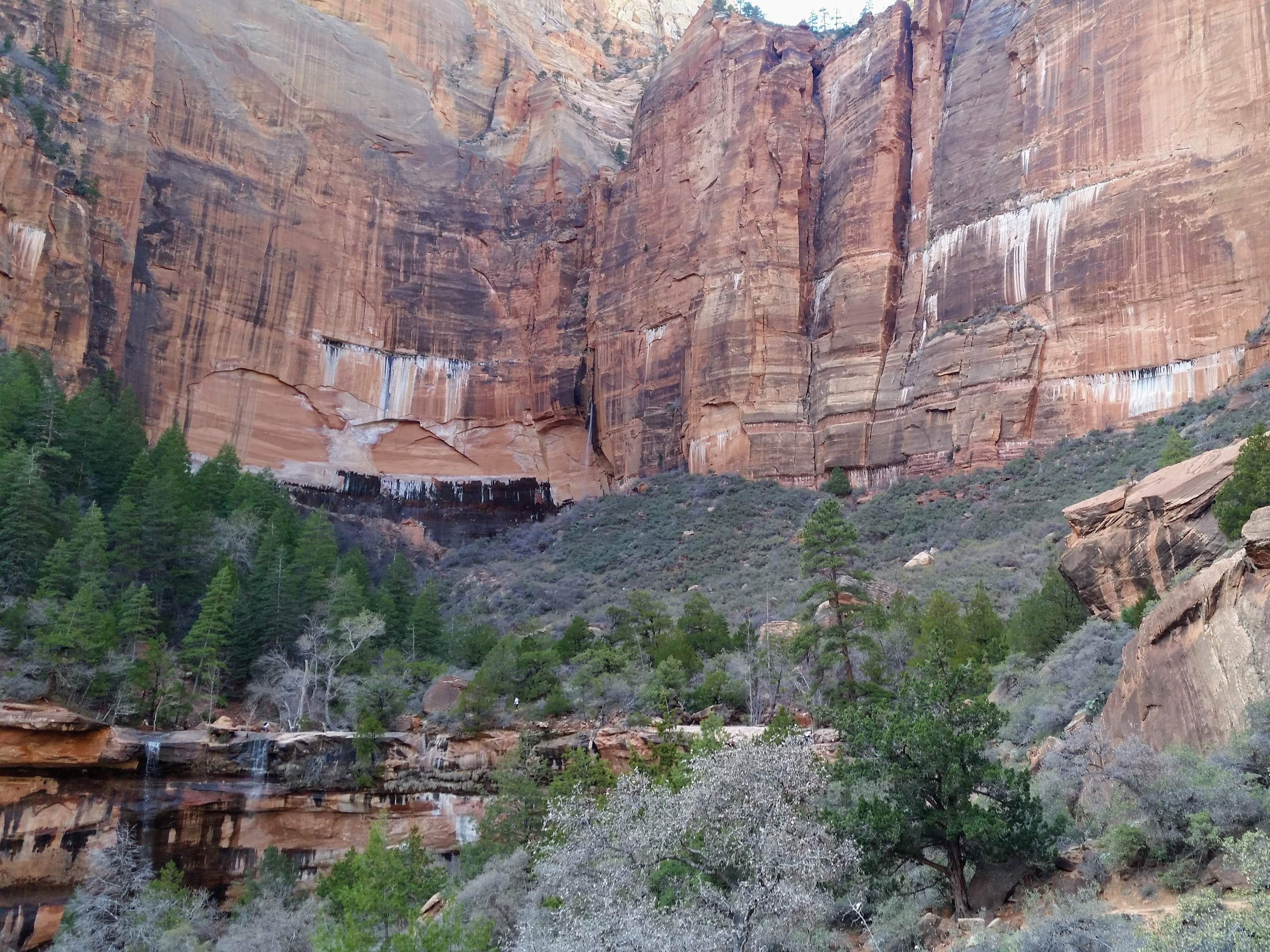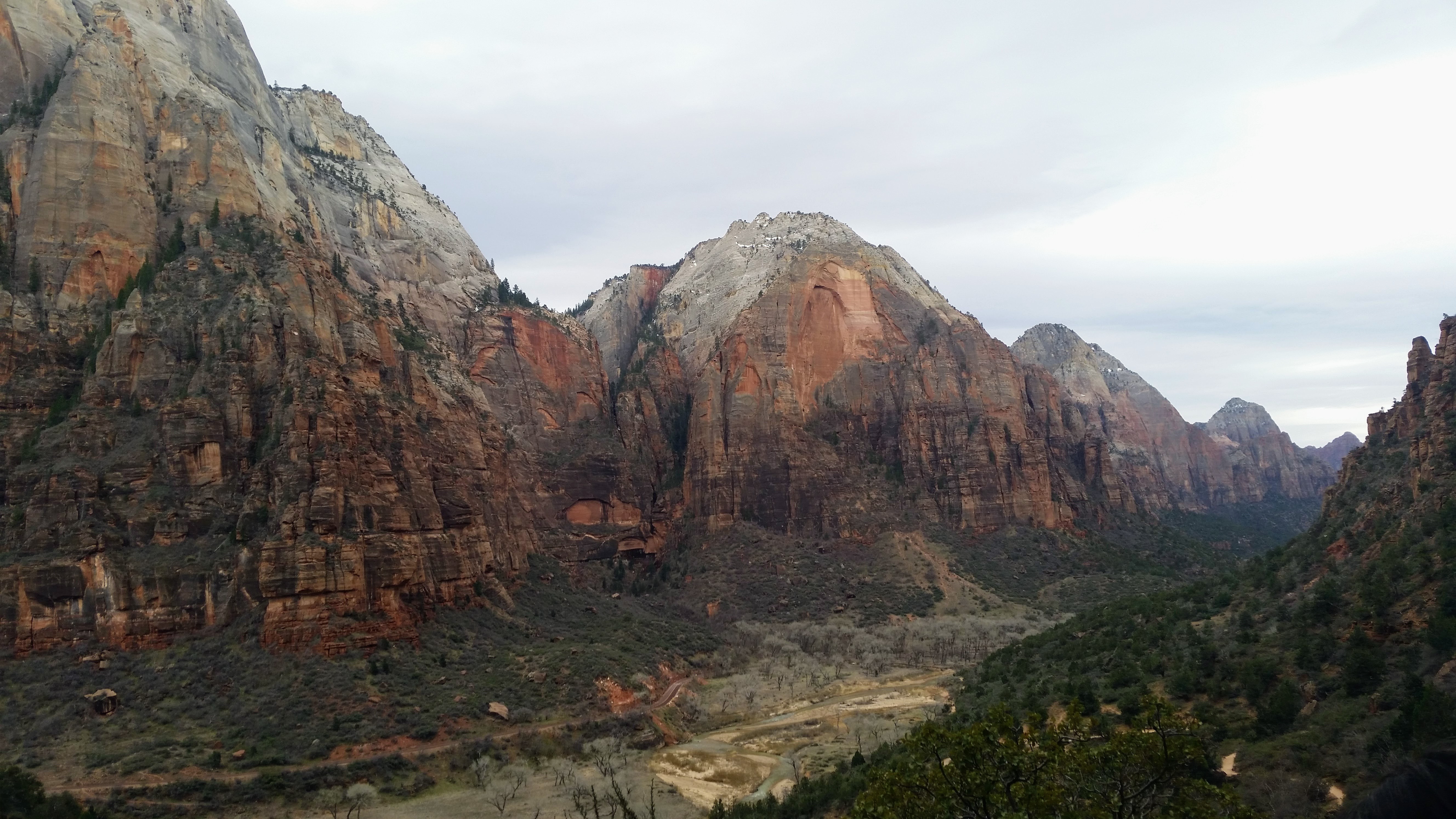 After our dizzying climb up the wiggles, we arrived at Scout Lookout which is where most people stopped, either giving up and returning the 2.1 miles back to Grotto OR risking their lives for a selfie up Angel’s Landing. We decided to take a potty break (there’s a portable potty here…quite nasty but the trail is too popular for a quick pee) and then kept going up the West Rim Trail. Past that point we saw very few hikers and the temperature dropped dramatically. The rock colors changed as well, going from brown to yellow to white. When we reached the upper plateau, there was snow on the ground and we had to put our coats on and cover our faces to protect from the wind. That was the best viewpoint we’ve had yet — we could see most of the park and I truly felt like a speck of sand in the vast universe. The West Rim Trail totals 14.2 miles one-way, which we didn’t have time to complete, so we turned around at the plateau and headed back down to the Grotto Picnic Area.