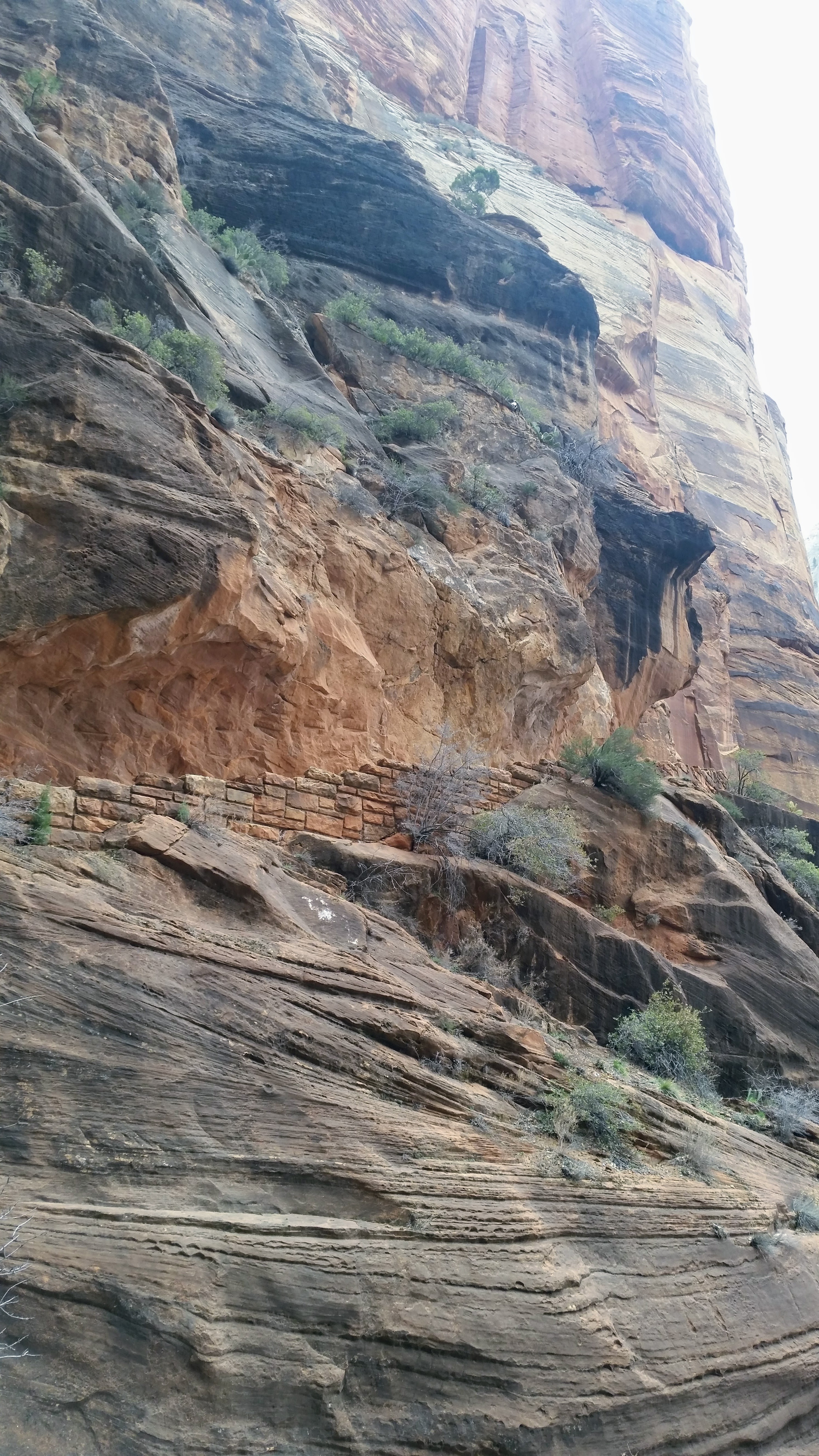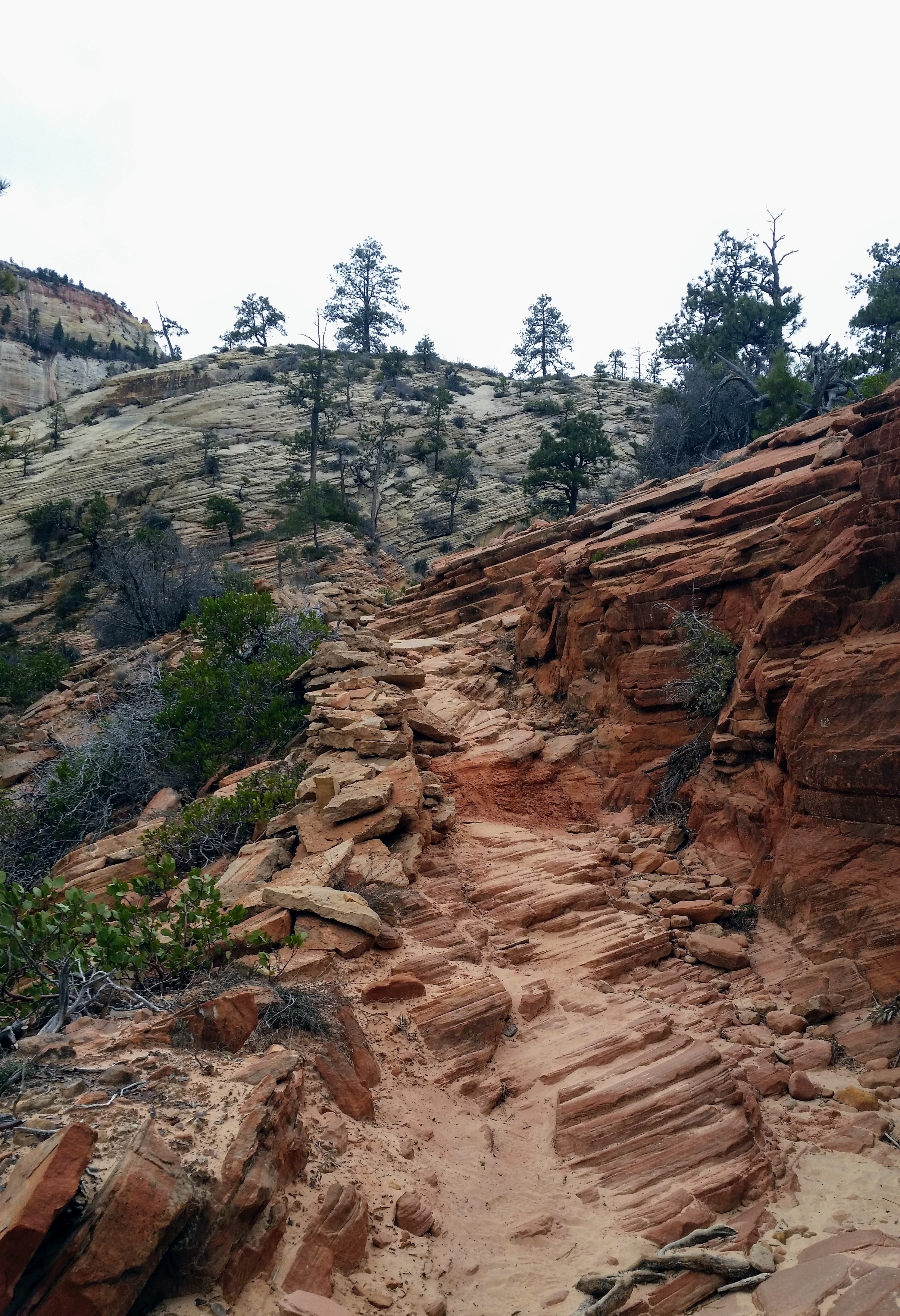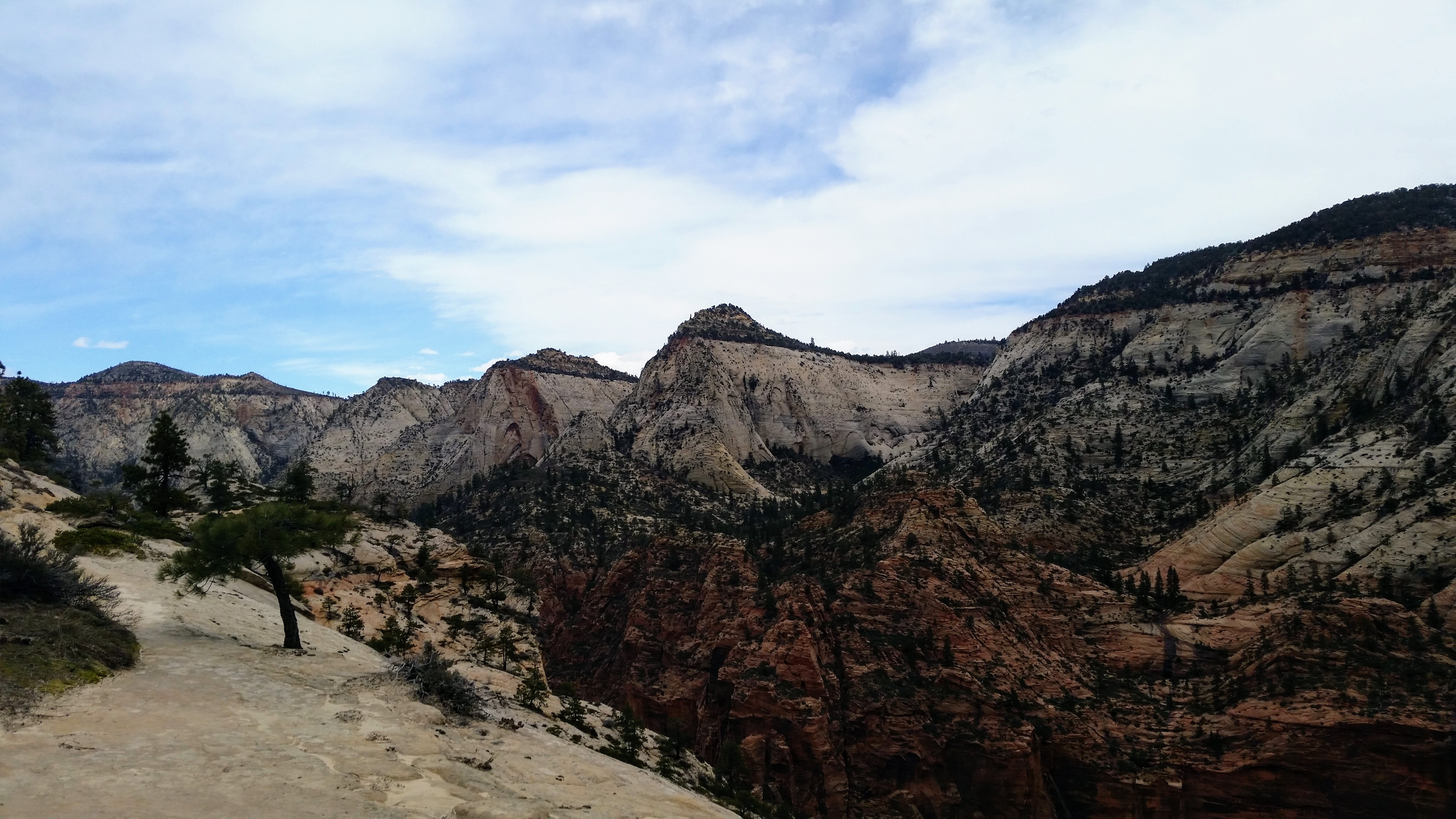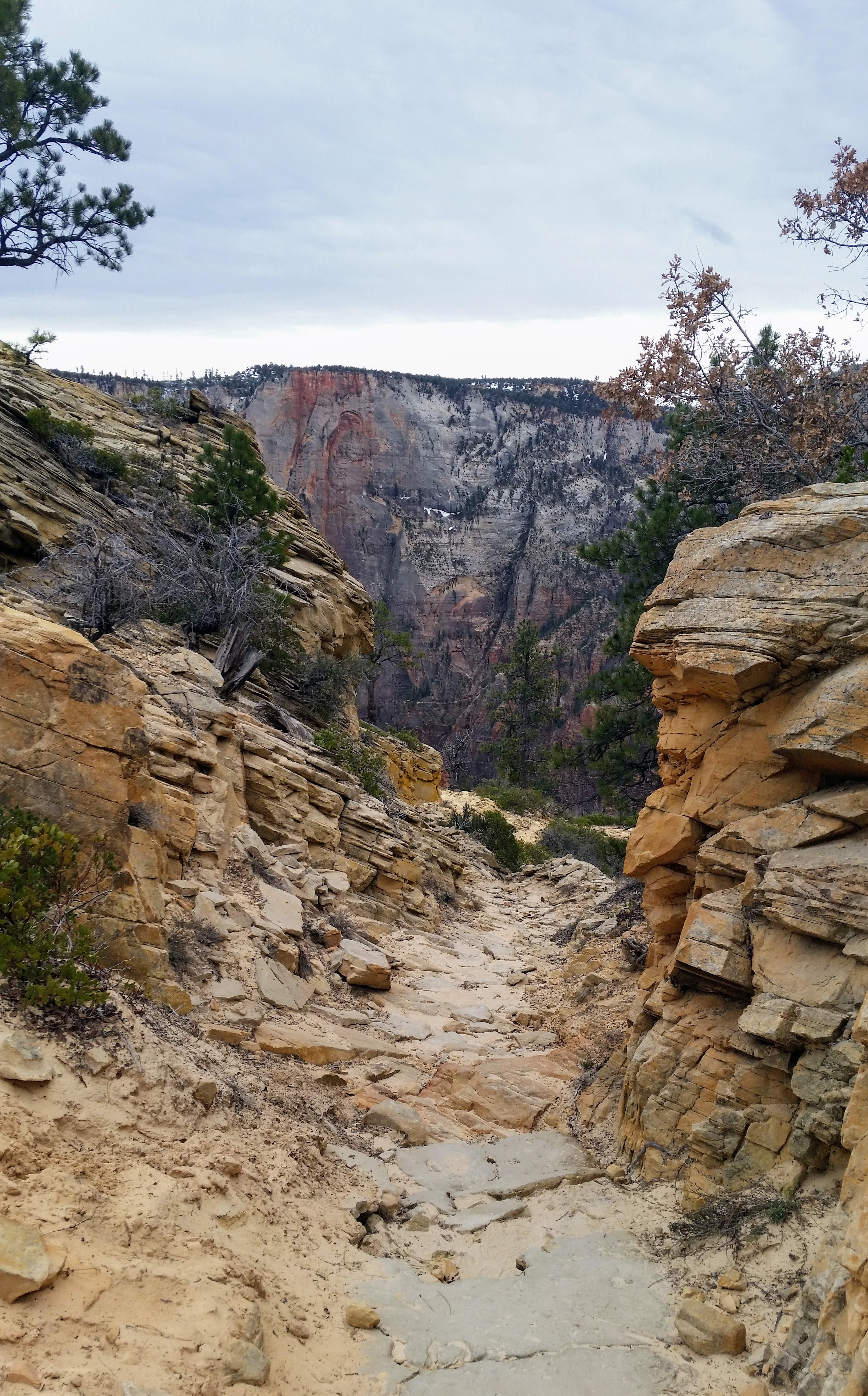 After our dizzying climb up the wiggles, we arrived at Scout Lookout which is where most people stopped, either giving up and returning the 2.1 miles back to Grotto OR risking their lives for a selfie up Angel’s Landing. We decided to take a potty break (there’s a portable potty here…quite nasty but the trail is too popular for a quick pee) and then kept going up the West Rim Trail. Past that point we saw very few hikers and the temperature dropped dramatically. The rock colors changed as well, going from brown to yellow to white. When we reached the upper plateau, there was snow on the ground and we had to put our coats on and cover our faces to protect from the wind. That was the best viewpoint we’ve had yet — we could see most of the park and I truly felt like a speck of sand in the vast universe. The West Rim Trail totals 14.2 miles one-way, which we didn’t have time to complete, so we turned around at the plateau and headed back down to the Grotto Picnic Area.