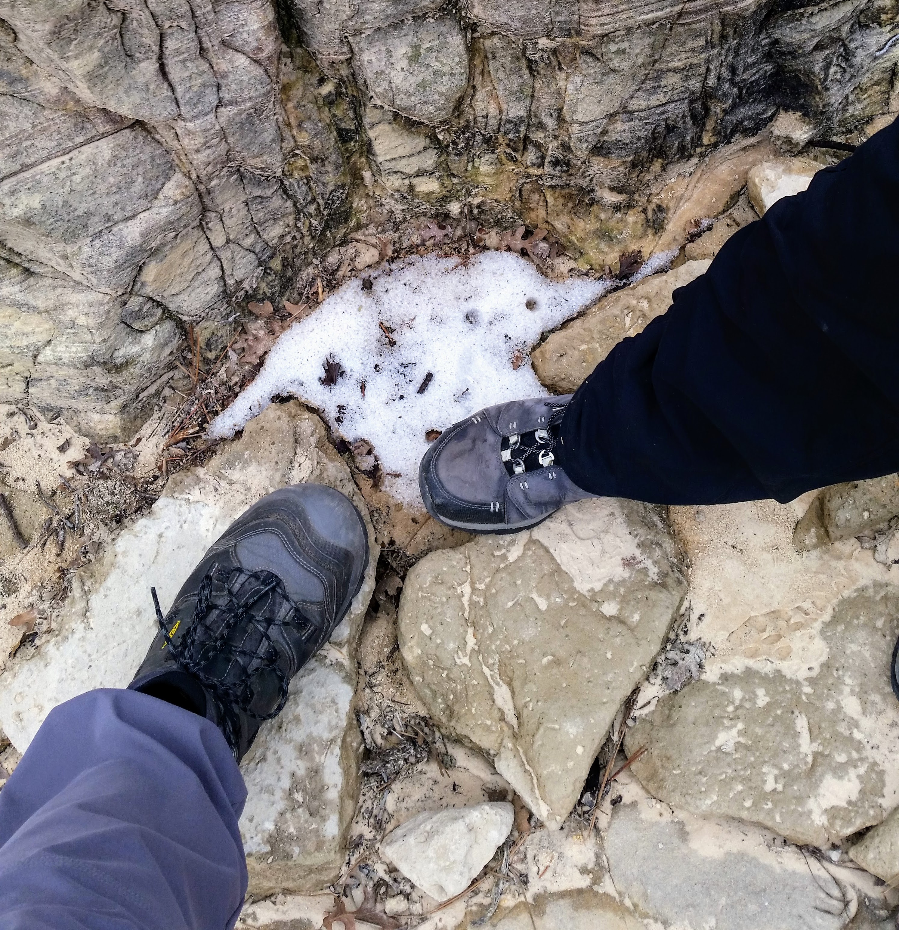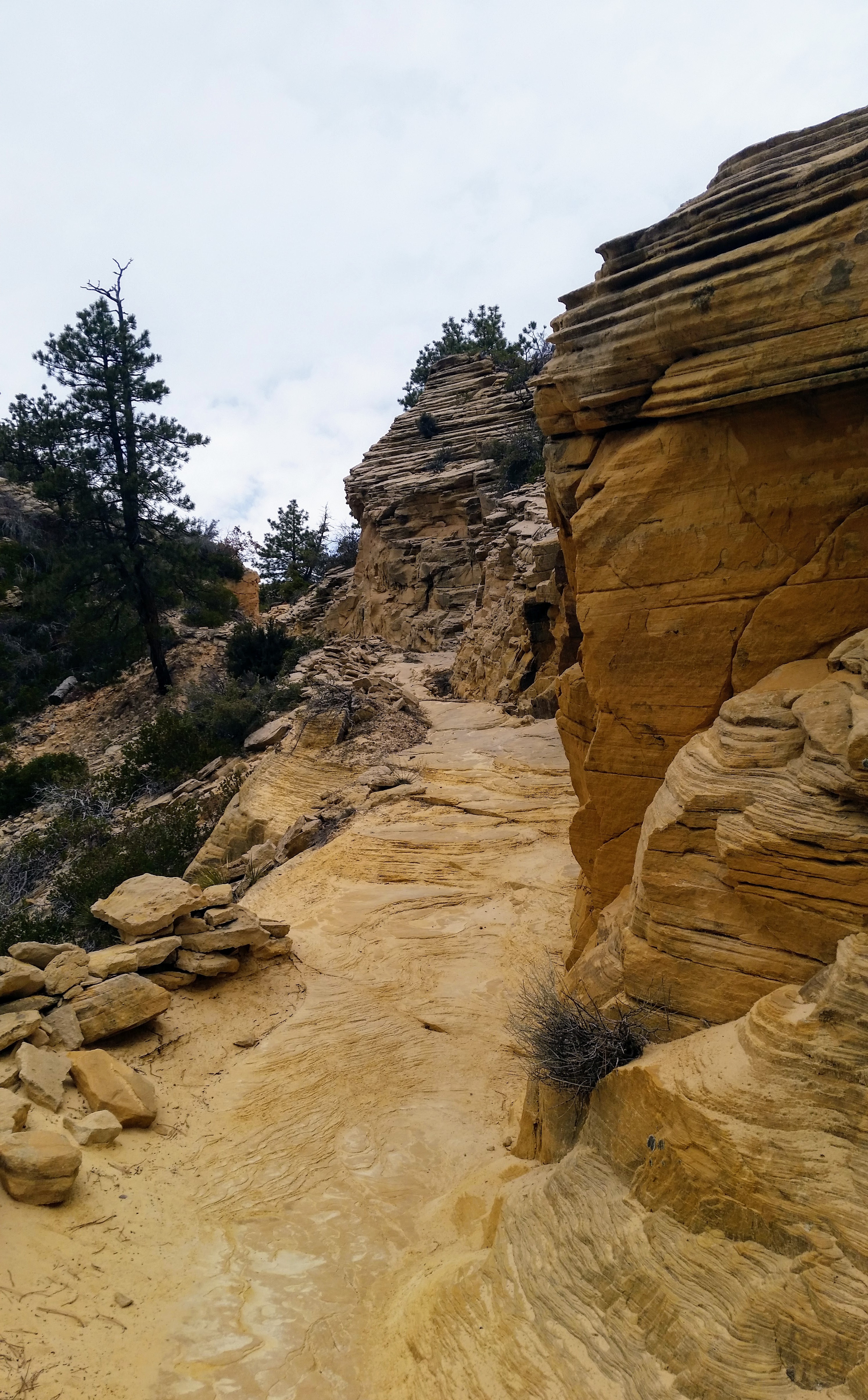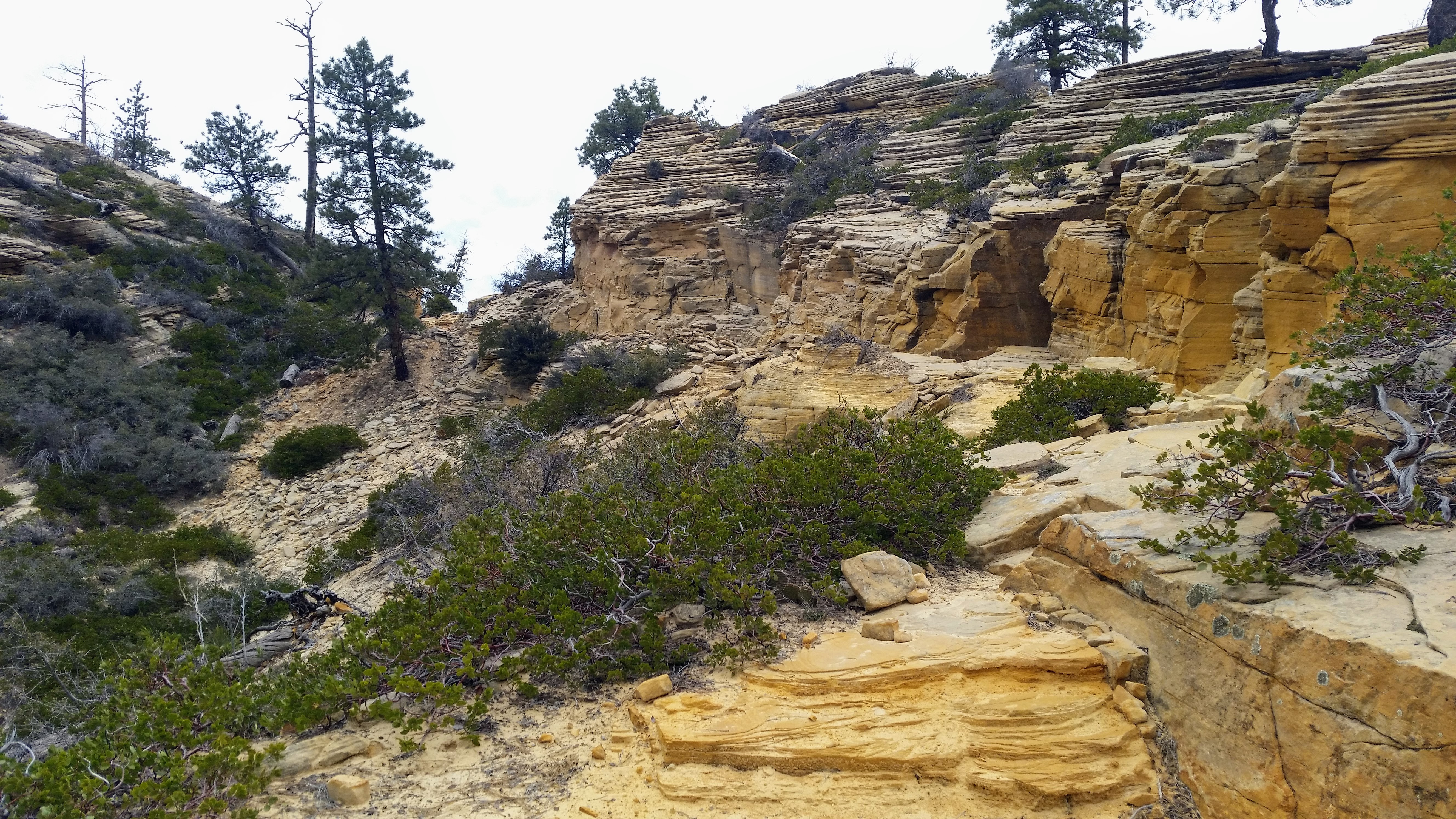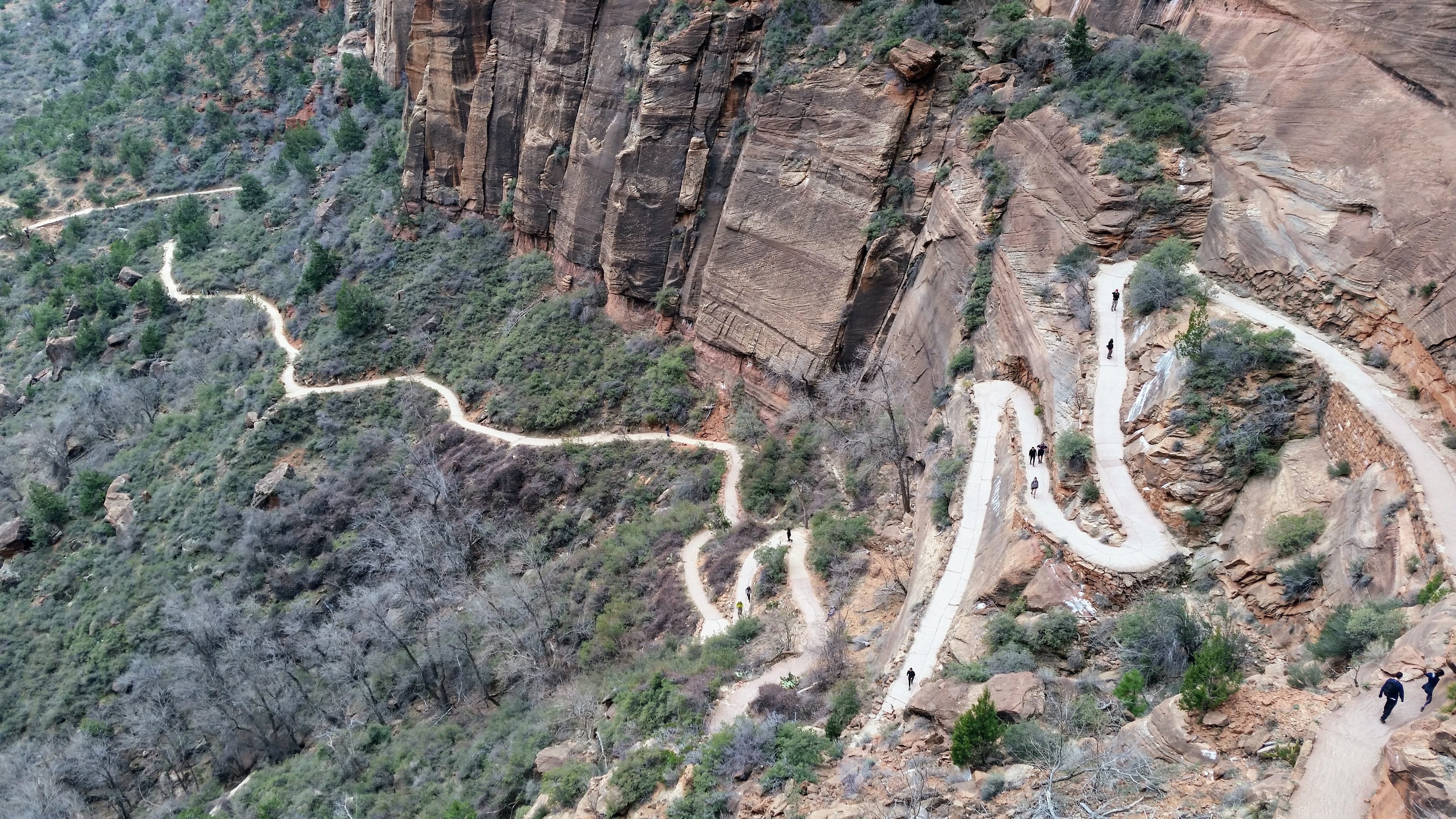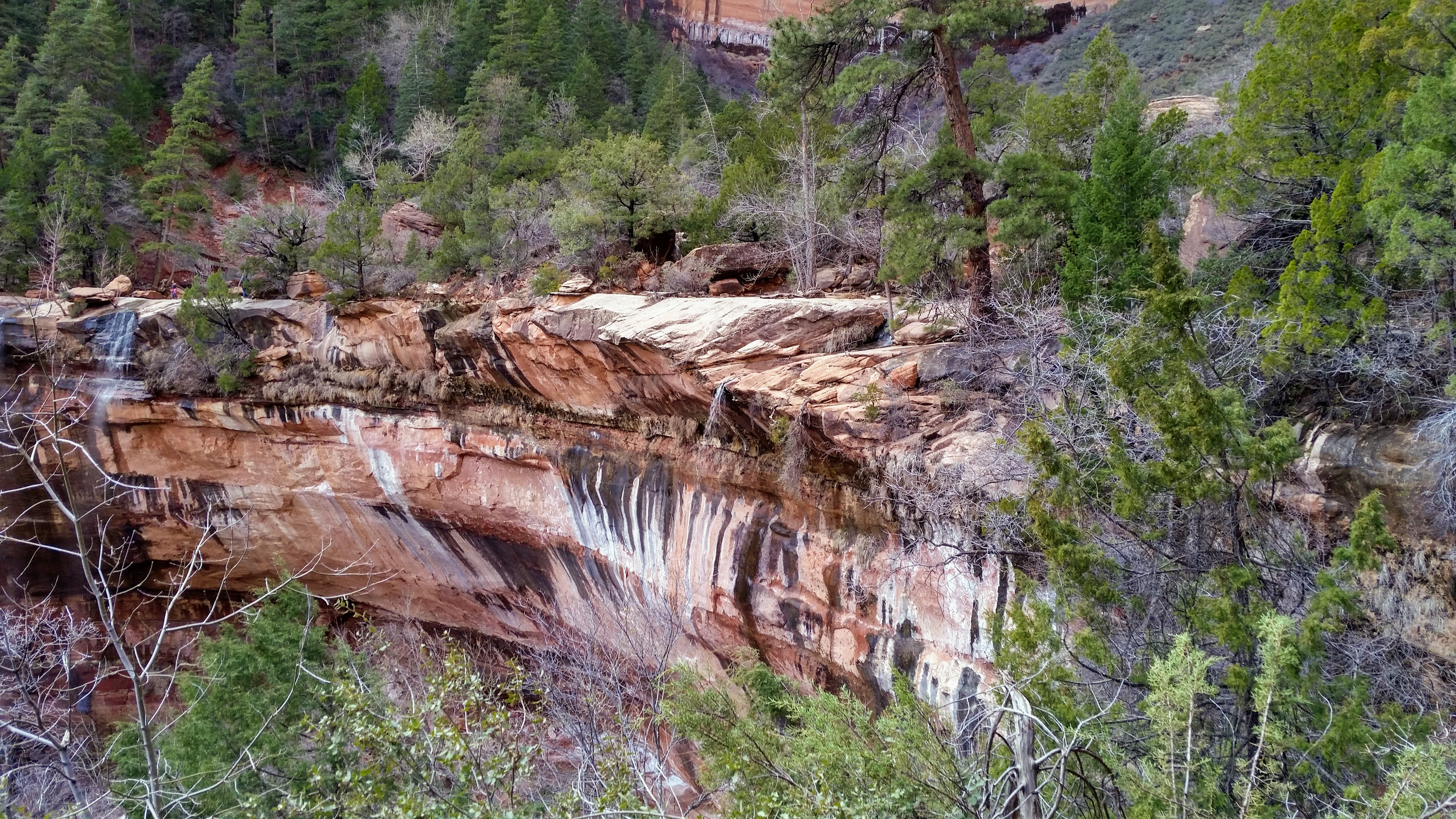 After our dizzying climb up the wiggles, we arrived at Scout Lookout which is where most people stopped, either giving up and returning the 2.1 miles back to Grotto OR risking their lives for a selfie up Angel’s Landing. We decided to take a potty break (there’s a portable potty here…quite nasty but the trail is too popular for a quick pee) and then kept going up the West Rim Trail. Past that point we saw very few hikers and the temperature dropped dramatically. The rock colors changed as well, going from brown to yellow to white. When we reached the upper plateau, there was snow on the ground and we had to put our coats on and cover our faces to protect from the wind. That was the best viewpoint we’ve had yet — we could see most of the park and I truly felt like a speck of sand in the vast universe. The West Rim Trail totals 14.2 miles one-way, which we didn’t have time to complete, so we turned around at the plateau and headed back down to the Grotto Picnic Area.