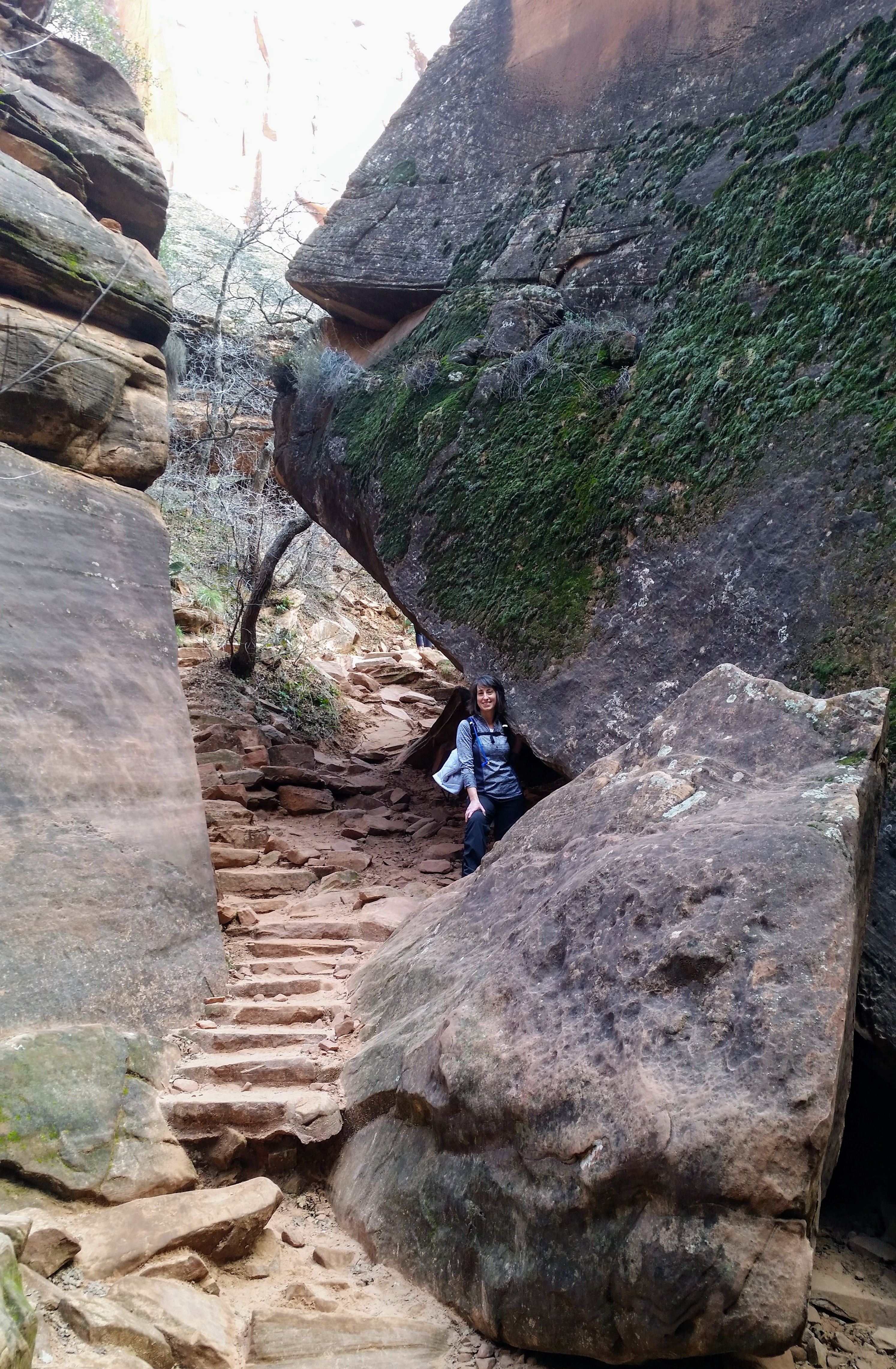 The hike began at the Grotto Picnic Area. We crossed over the river and turned right on the West Rim Trail — it was easy to navigate because we just followed the crowds. Pretty much right away we began questioning our choice, as the trek up was in full sun with significant elevation gains. I noticed everyone coming down the route had stripped down to sleeveless tanks and most were sweating profusely. I also noticed a few older people gasping and holding their chests (scary) and others sprinting up the trail (intimidating). But the heat didn’t last long as we headed into Refrigerator Canyon, a sheltered cool part of the trail that served as the perfect respite before the REAL climb began up Walter’s Wiggles.